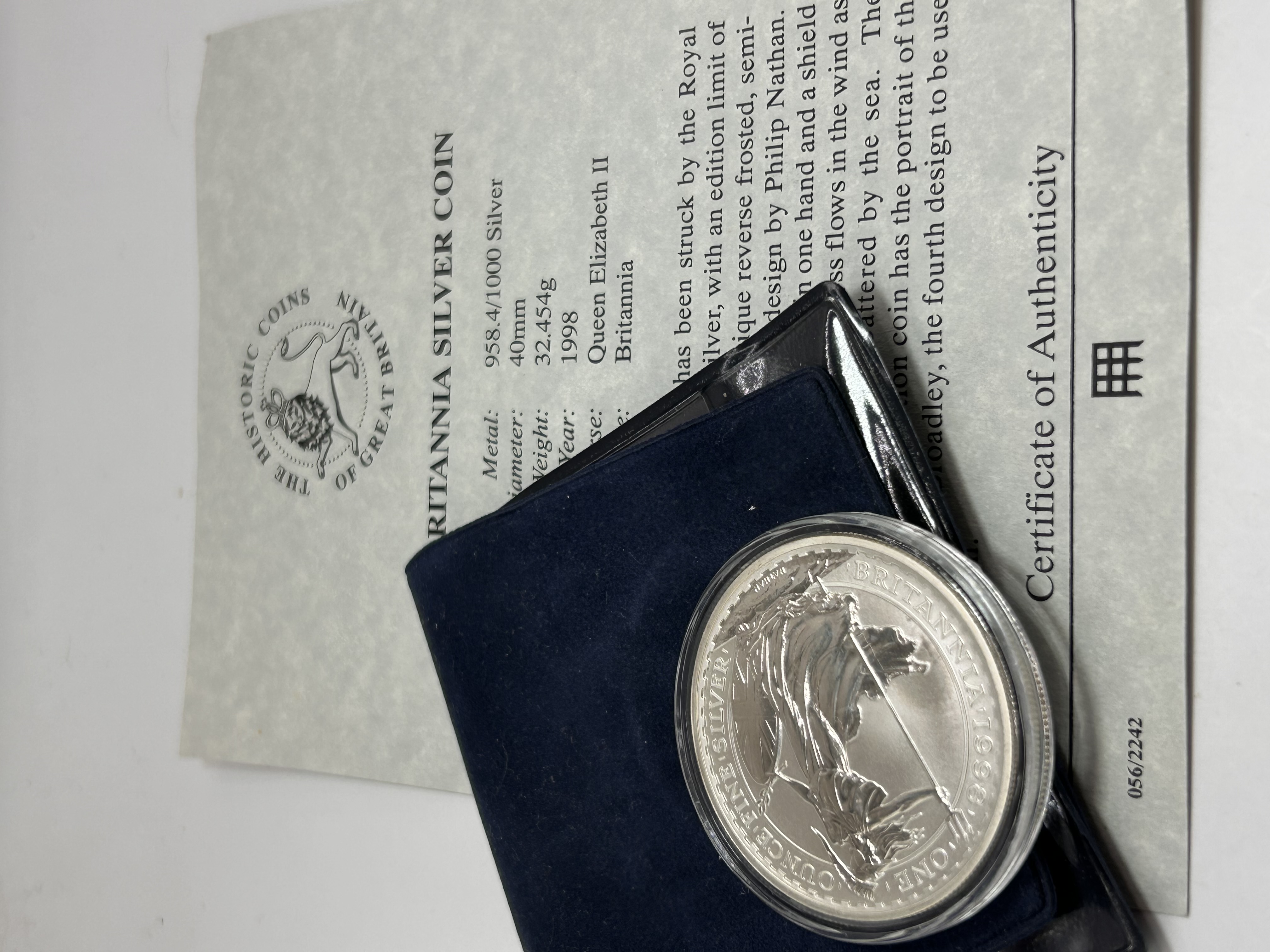 A 1998 British Britannia silver coin, struck by the Royal Mint with a frosted finish, depicting the allegorical figure of Britannia holding a trident and shield on the reverse, designed by Philip Nathan. The obverse features Queen Elizabeth II. The coin is composed of 958.4/1000 silver and is marked “ONE OUNCE FINE SILVER.” It is presented within a clear protective capsule and housed in a dark blue velvet-lined display case. Accompanying the coin is a “Certificate of Authenticity” from “THE HISTORIC COINS OF GREAT BRITAIN,” confirming its specifications and noting its limited edition status. The certificate bears the serial number “056/2242.”