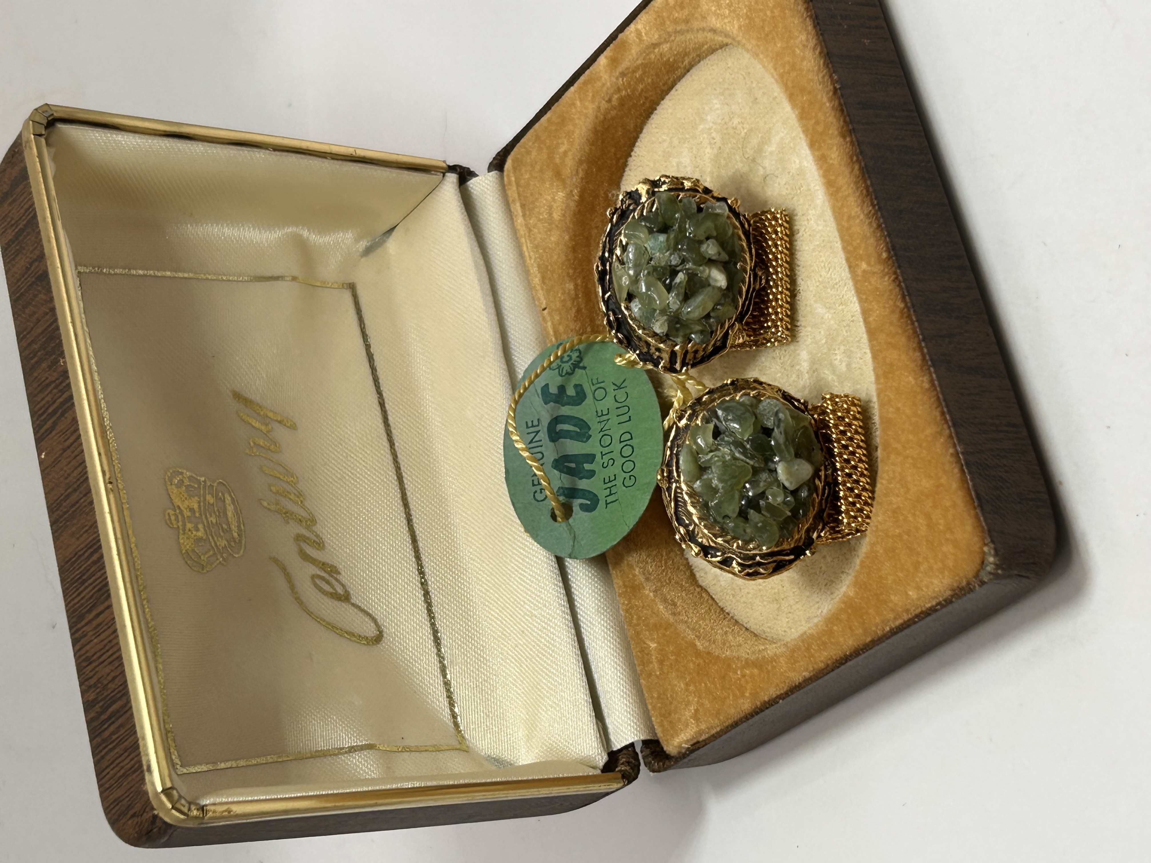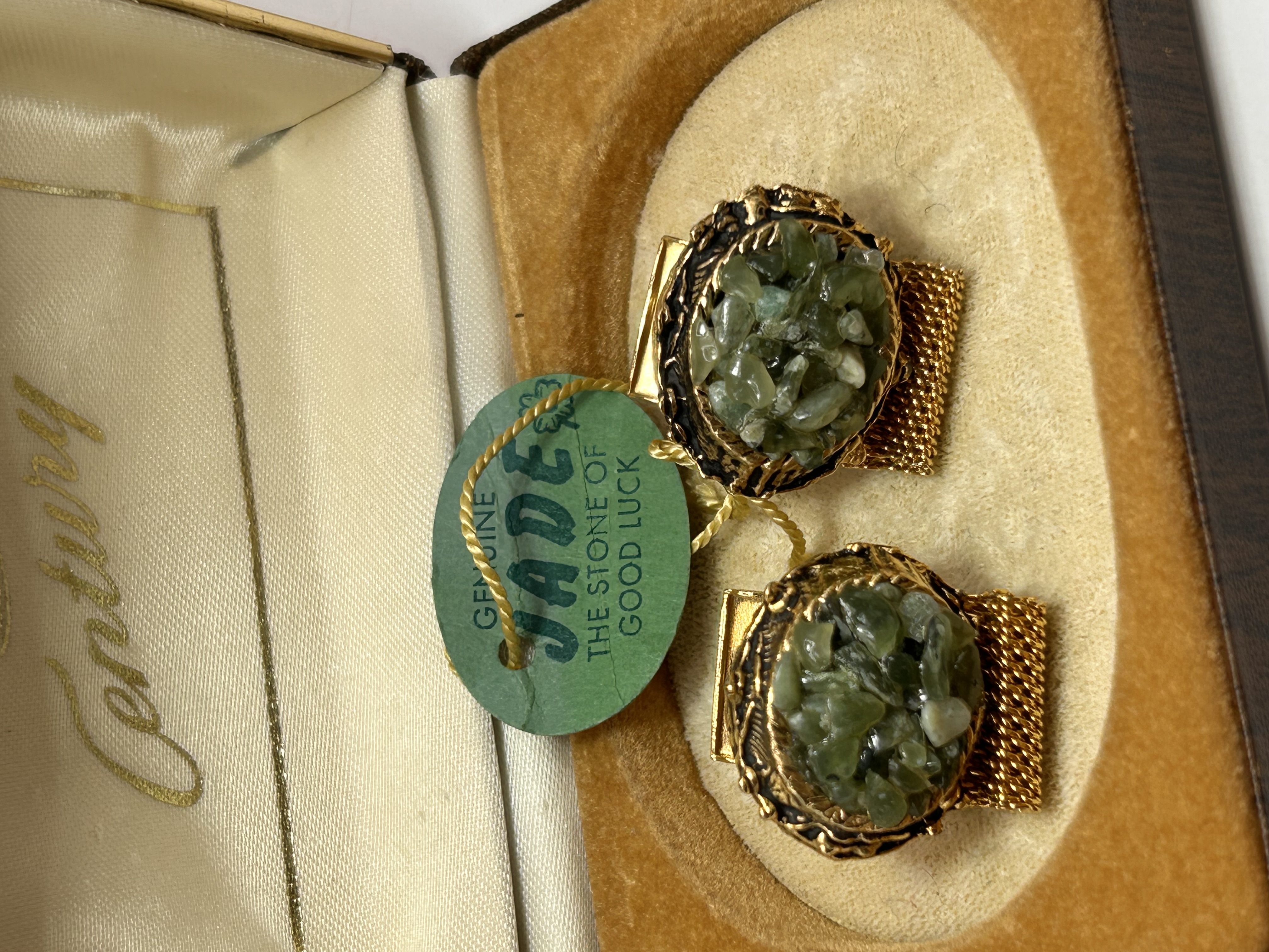 A pair of vintage cufflinks, each featuring an oval, ornate gold-toned metal setting encasing an inlay of crushed green stones. The set is presented in a hinged, rectangular box with a dark wood-grain exterior, a gold-toned velvet-like interior base, and a cream satin lid lining printed with “Century” and a crown logo. Attached to one cufflink is a green paper tag bearing the text “GENUINE JADE” and “THE STONE OF GOOD LUCK”.