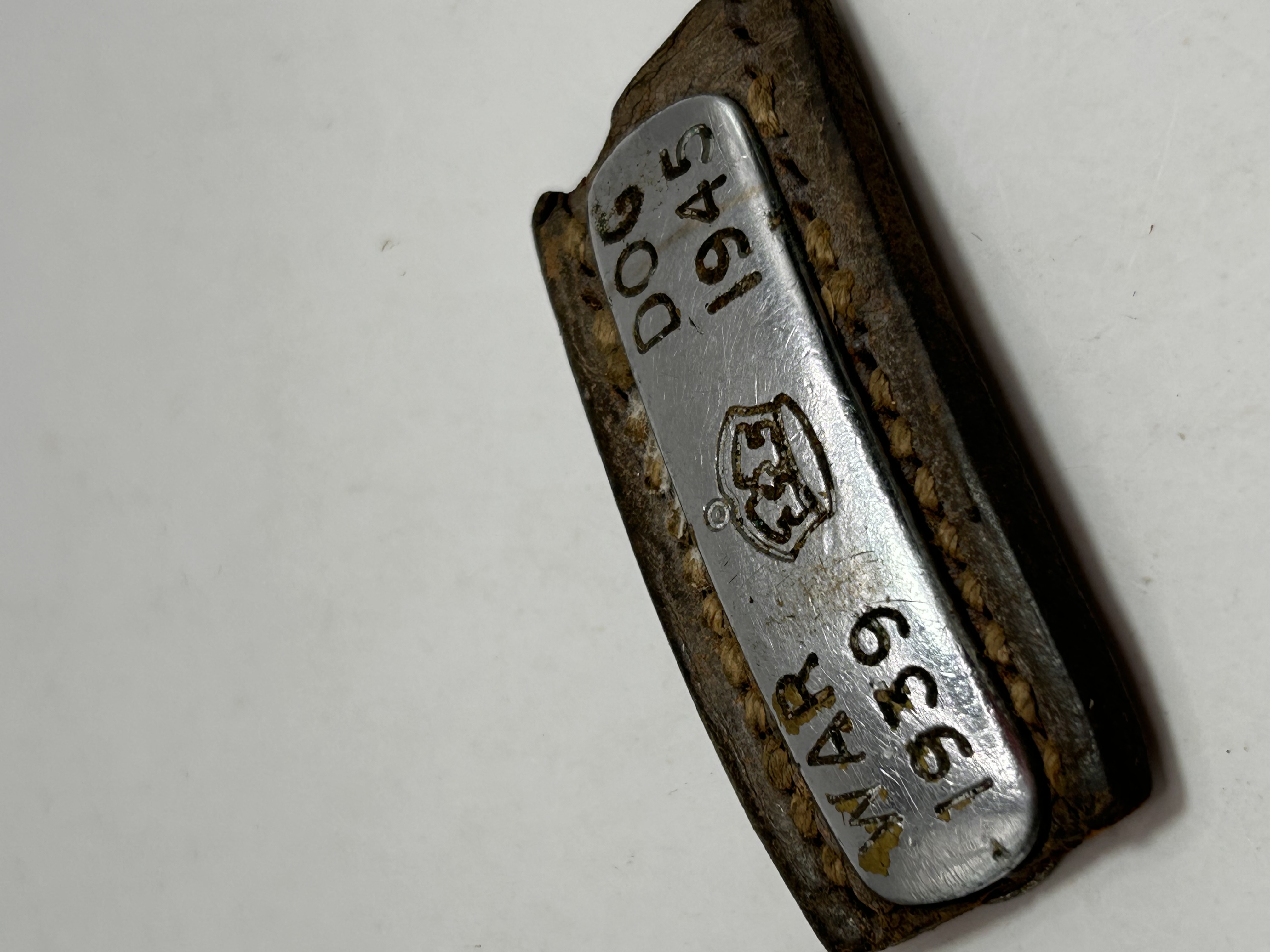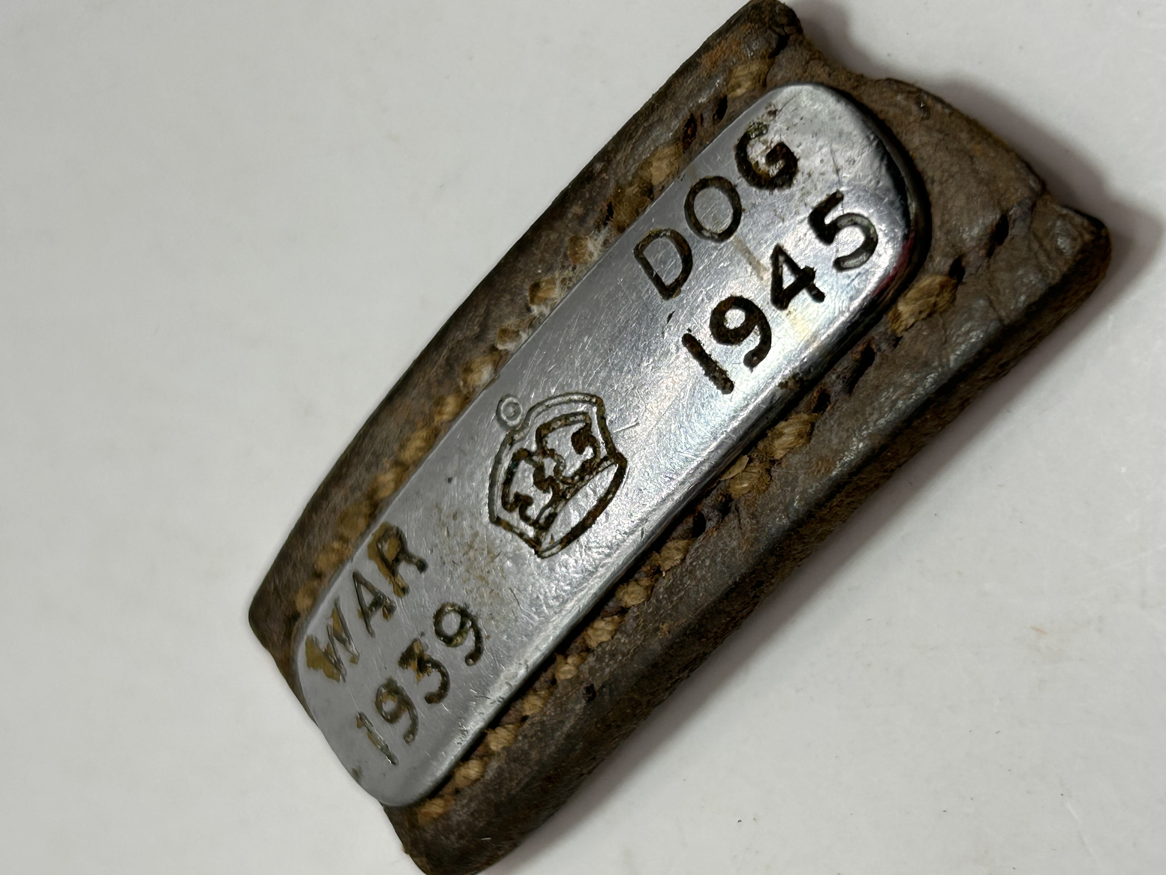 A British World War II era ‘War Dog’ identification tag, featuring an oblong, silvery-tone metal plate inserted into a dark brown, folded leather casing, secured along its edges by visible tan stitching. The metal plate is impressed with “WAR 1939” on the left and “DOG 1945” on the right, flanking a central debossed emblem of a crown over the “GR” royal cypher, indicating its British origin and period of use.