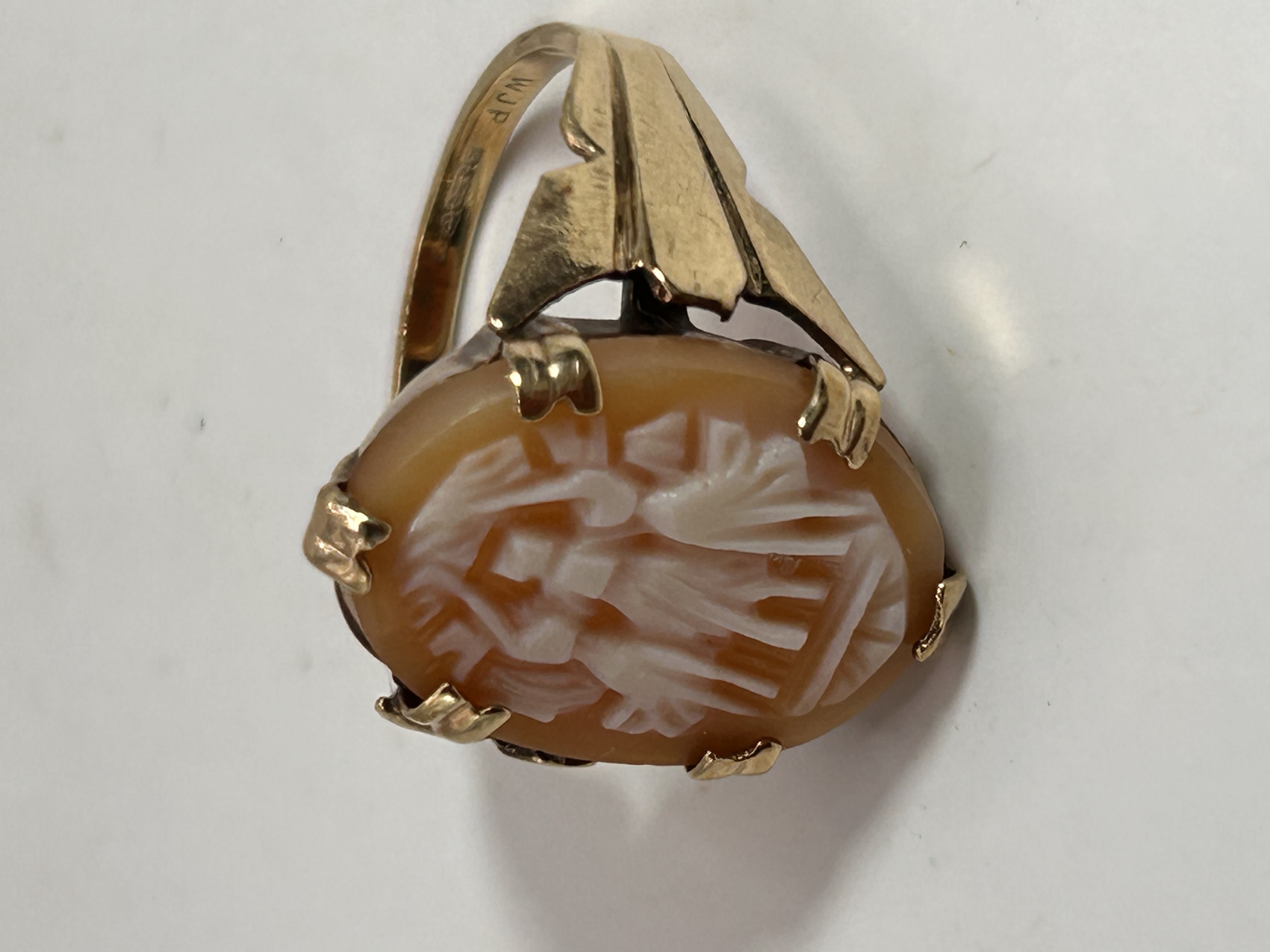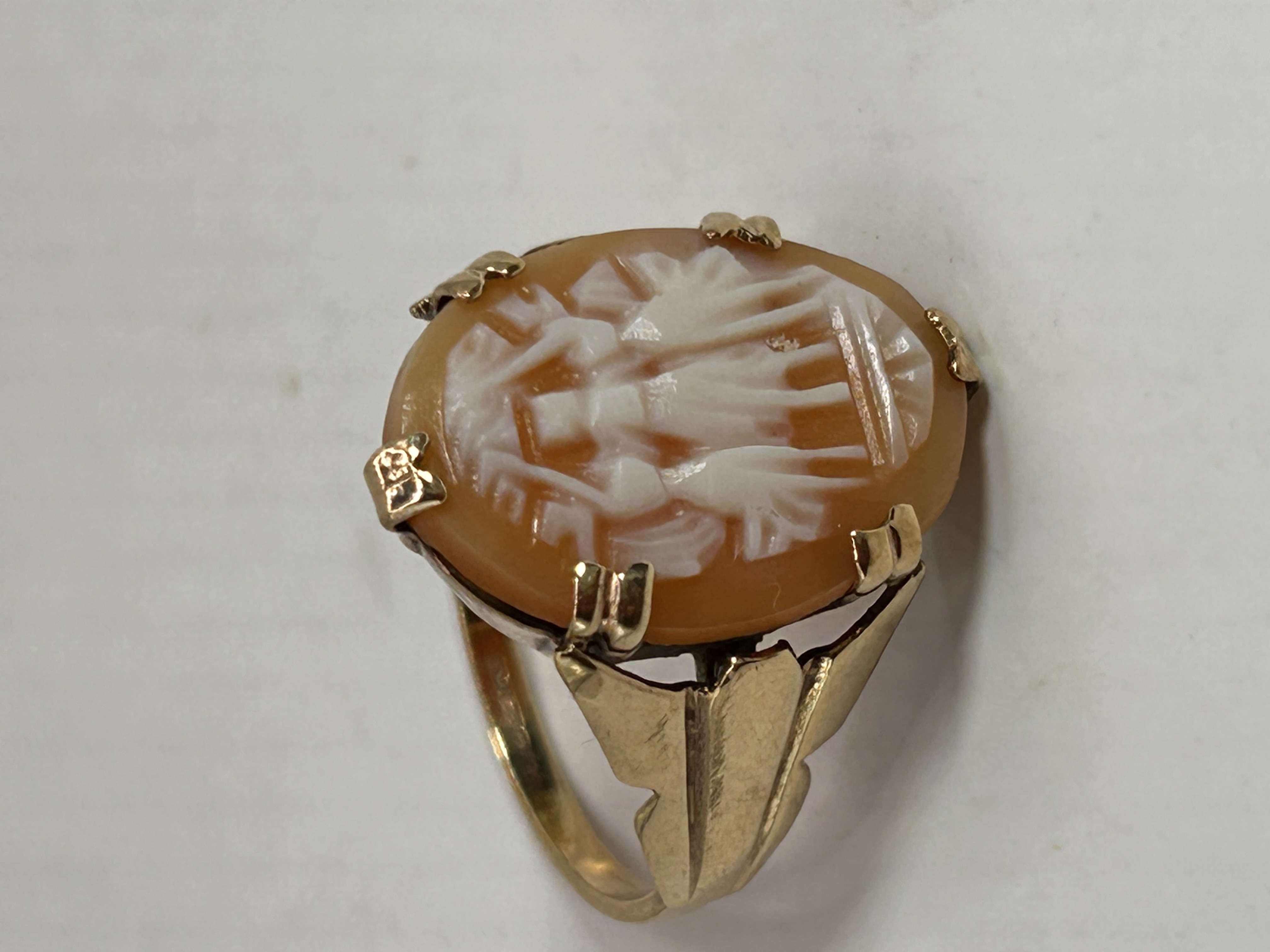 A 9ct gold finger ring, centring an oval-shaped shell cameo. The cameo is carved in high relief with three draped classical female figures against a translucent reddish-brown background, evoking a classical revival style. The cameo is secured by a multi-prong setting, and the ring’s shoulders are adorned with a stylized leaf motif, tapering into a plain band. The interior of the band is visibly stamped or engraved with the initials “WJP.”