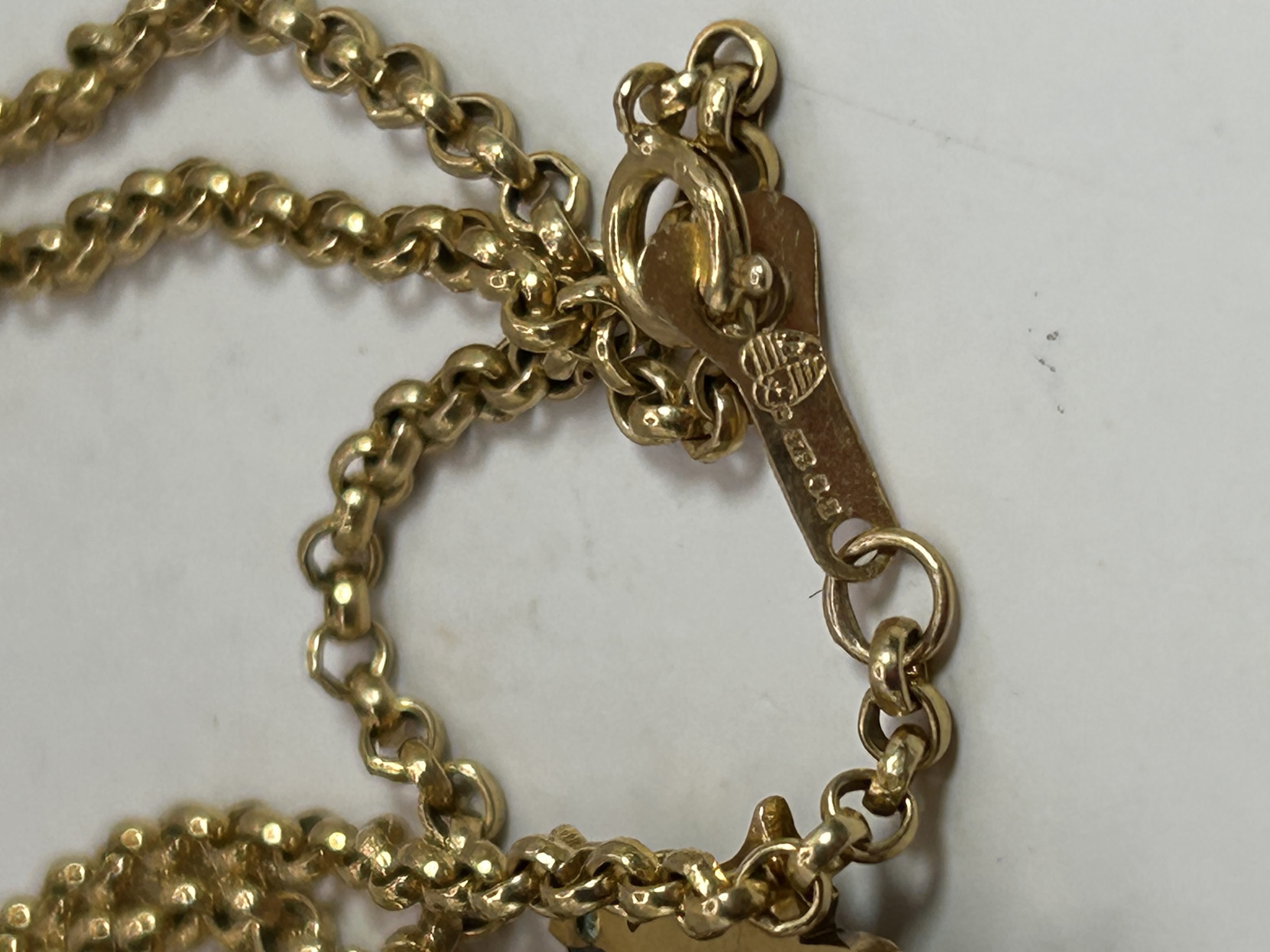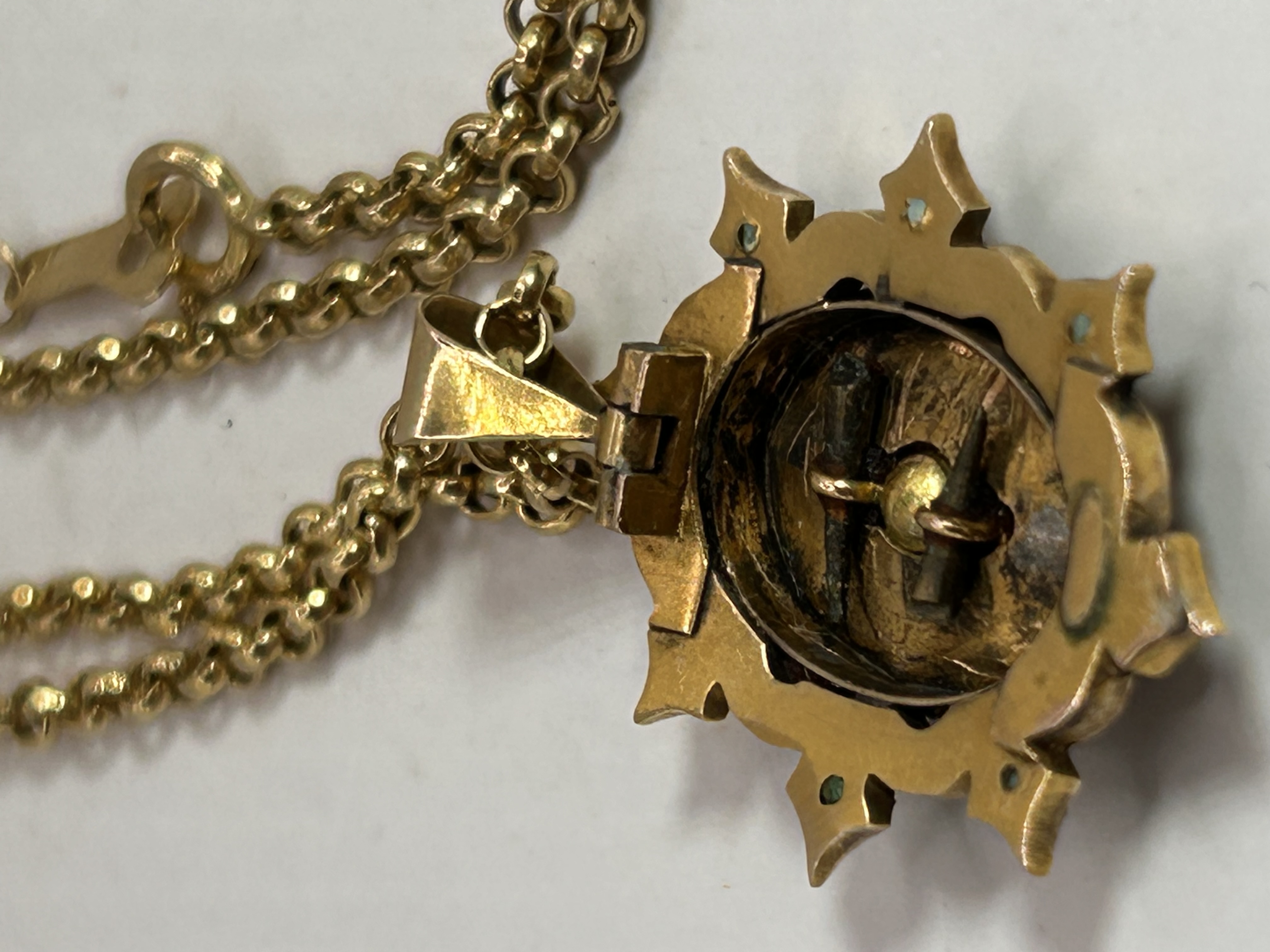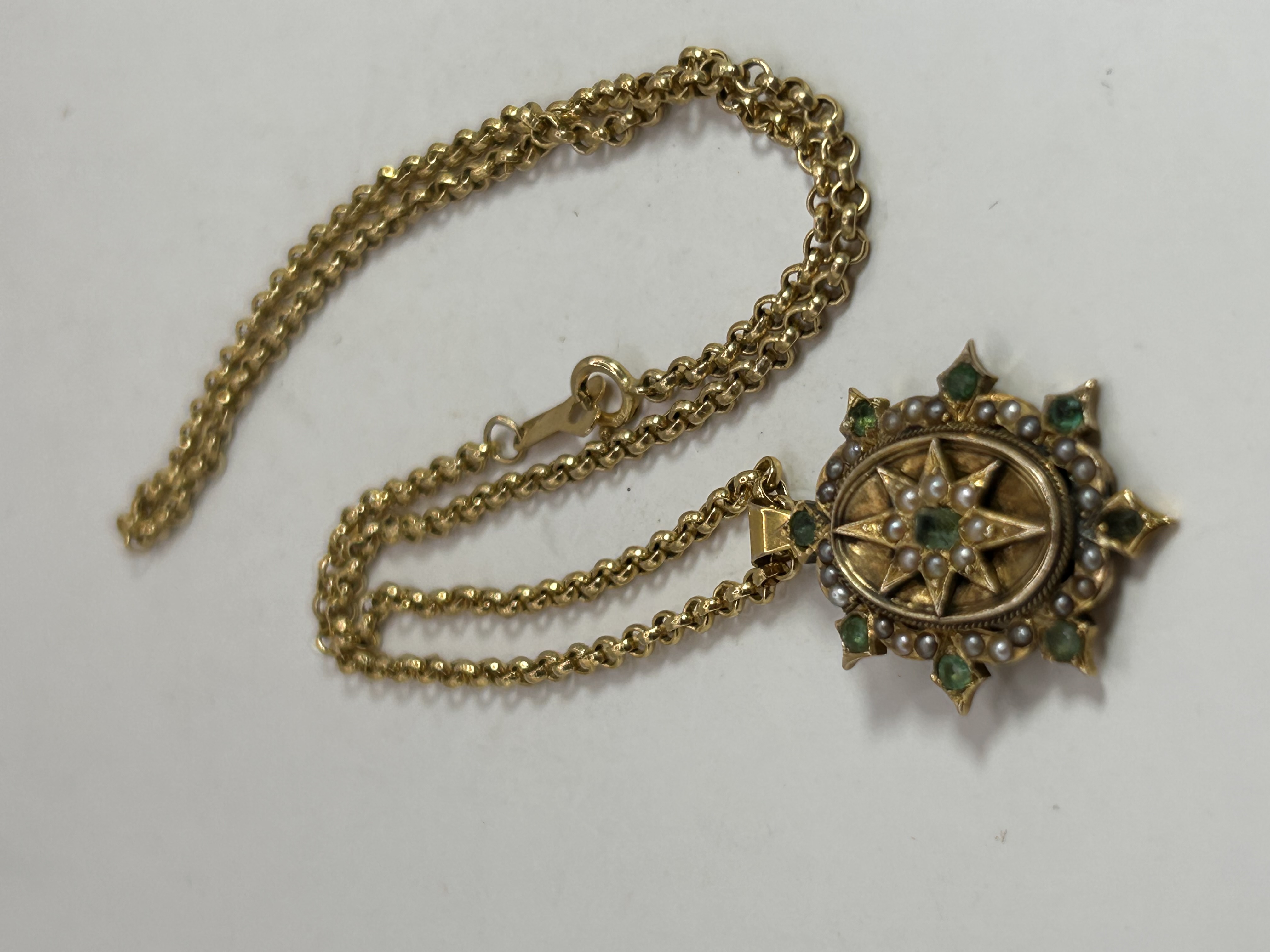 A vintage 9ct gold necklace comprising a rollo chain and a starburst-motif locket pendant. The pendant is adorned with small round pearls and faceted green stones, featuring a central raised star design. The locket opens from the back to reveal an internal compartment. The lobster claw clasp is visibly marked “K18” alongside an additional, unidentifiable stylized maker’s mark.