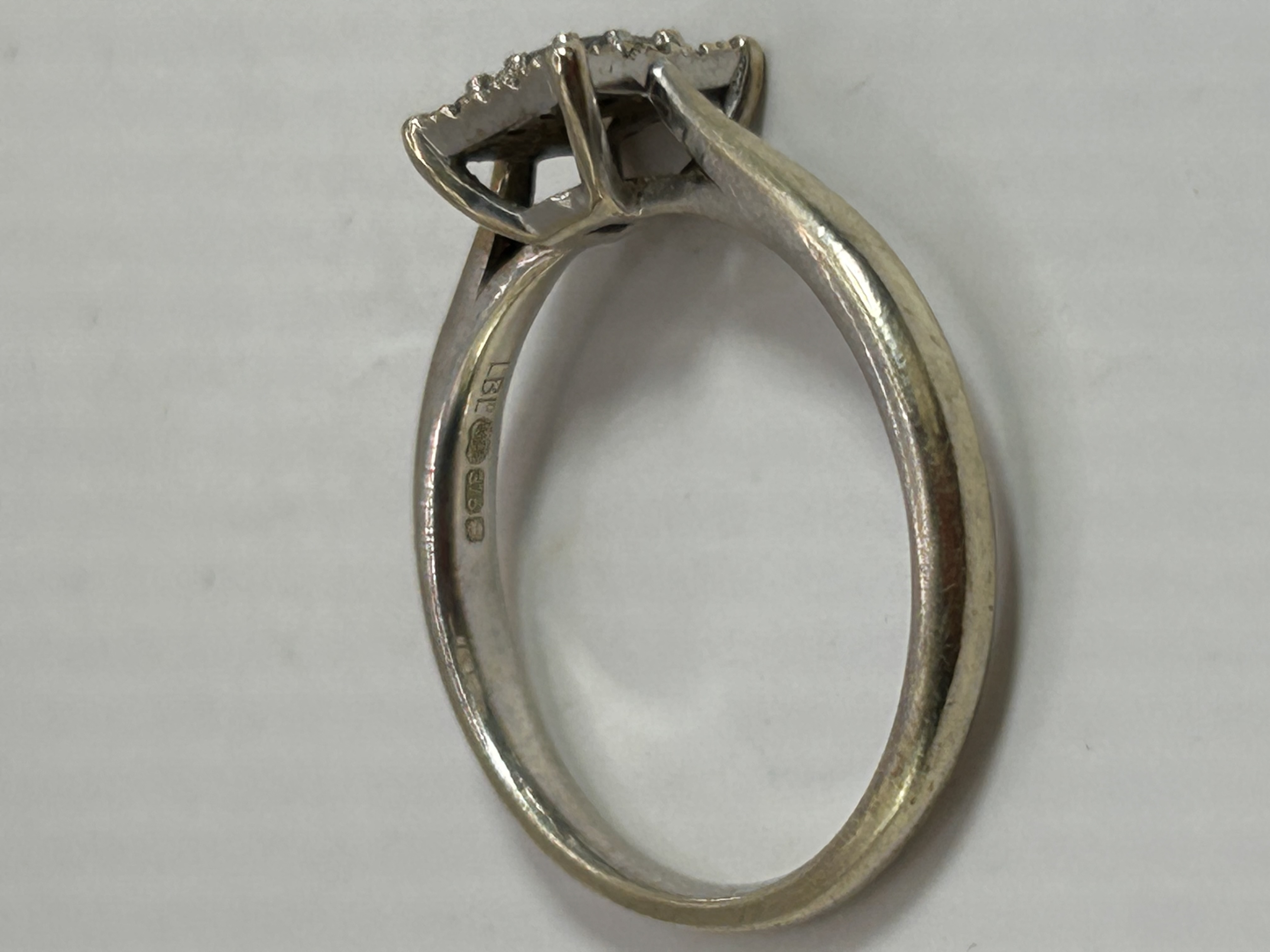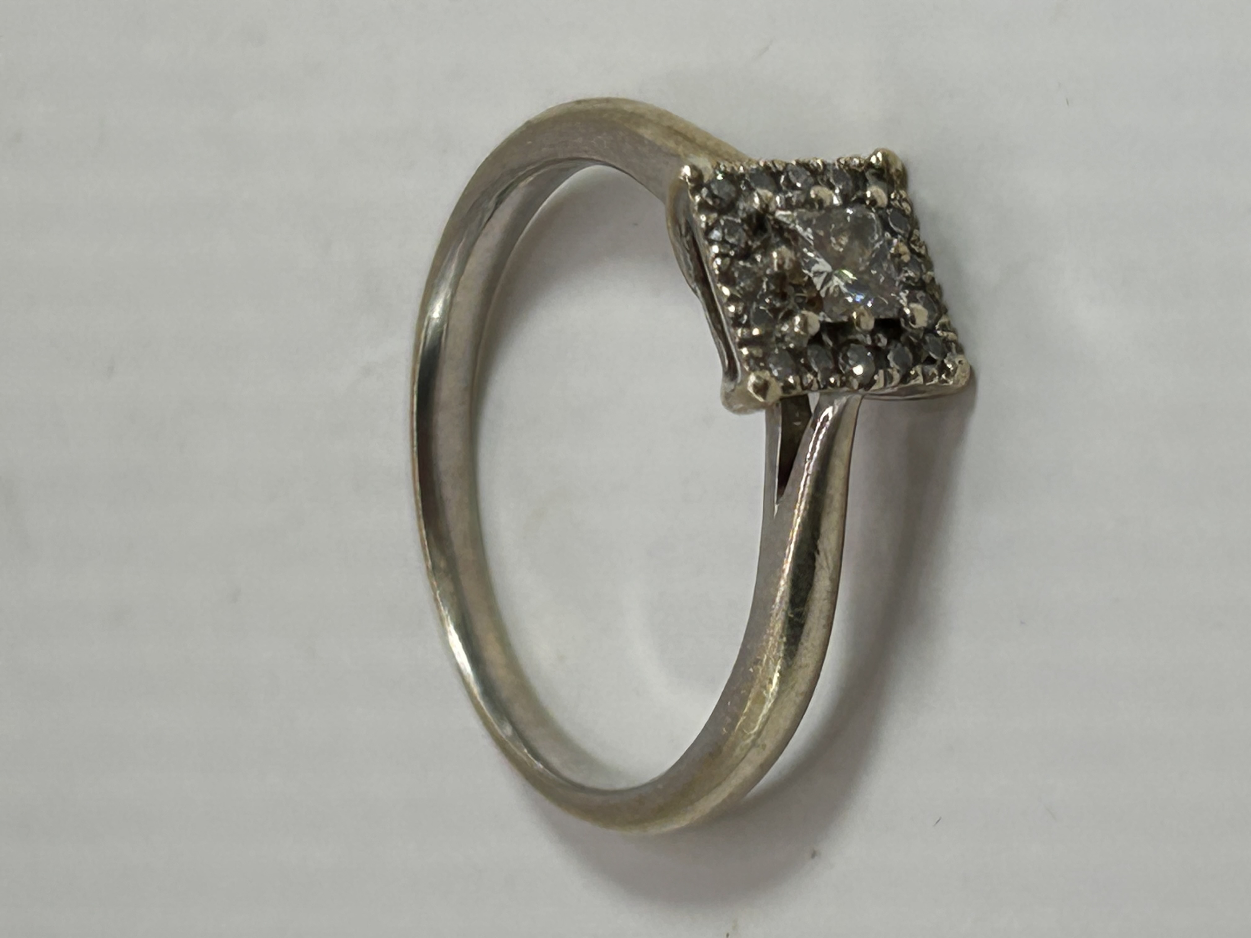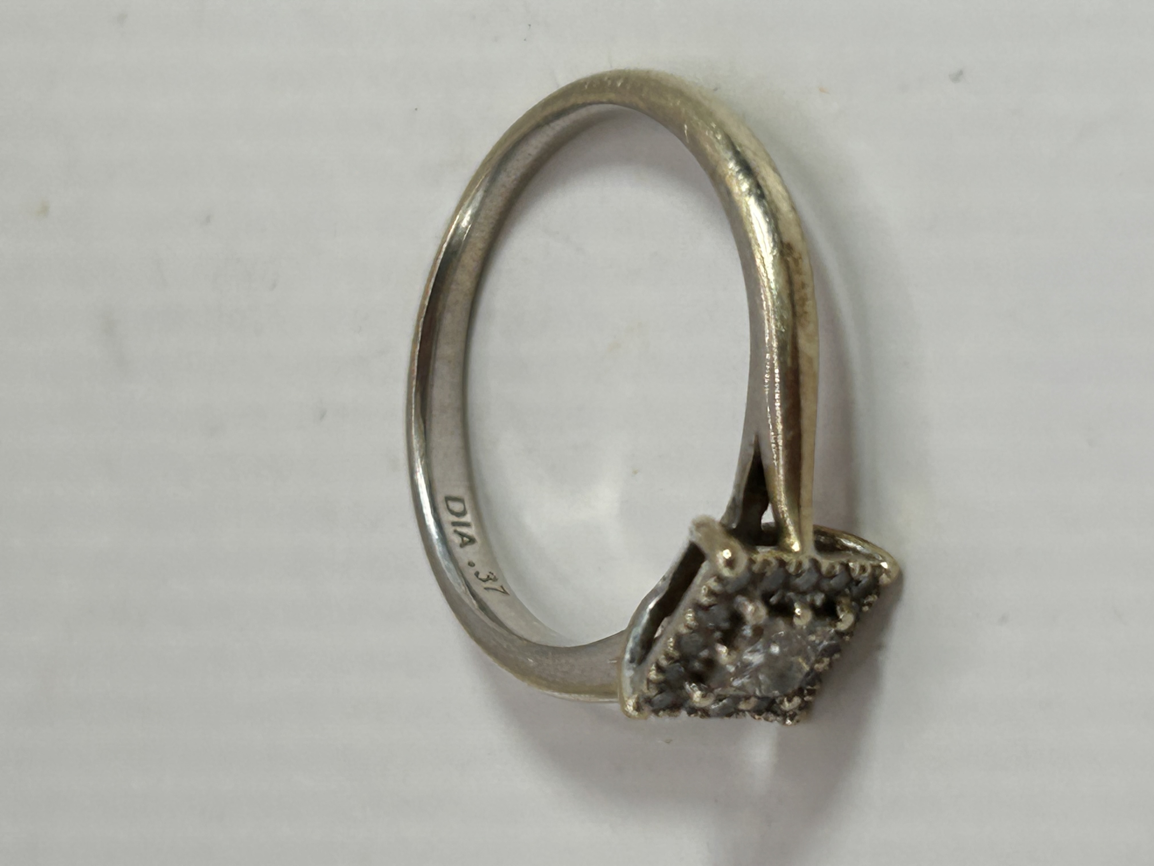 A contemporary ladies’ ring, marked 375 The ring features a square-shaped cluster head, set with multiple round brilliant-cut diamonds, including a central stone, creating an illusion of a larger solitaire. An inscription “DIA .37” is visible on the inner band, indicating a total diamond carat weight of 0.37 carats. Other indistinct hallmarks are present.