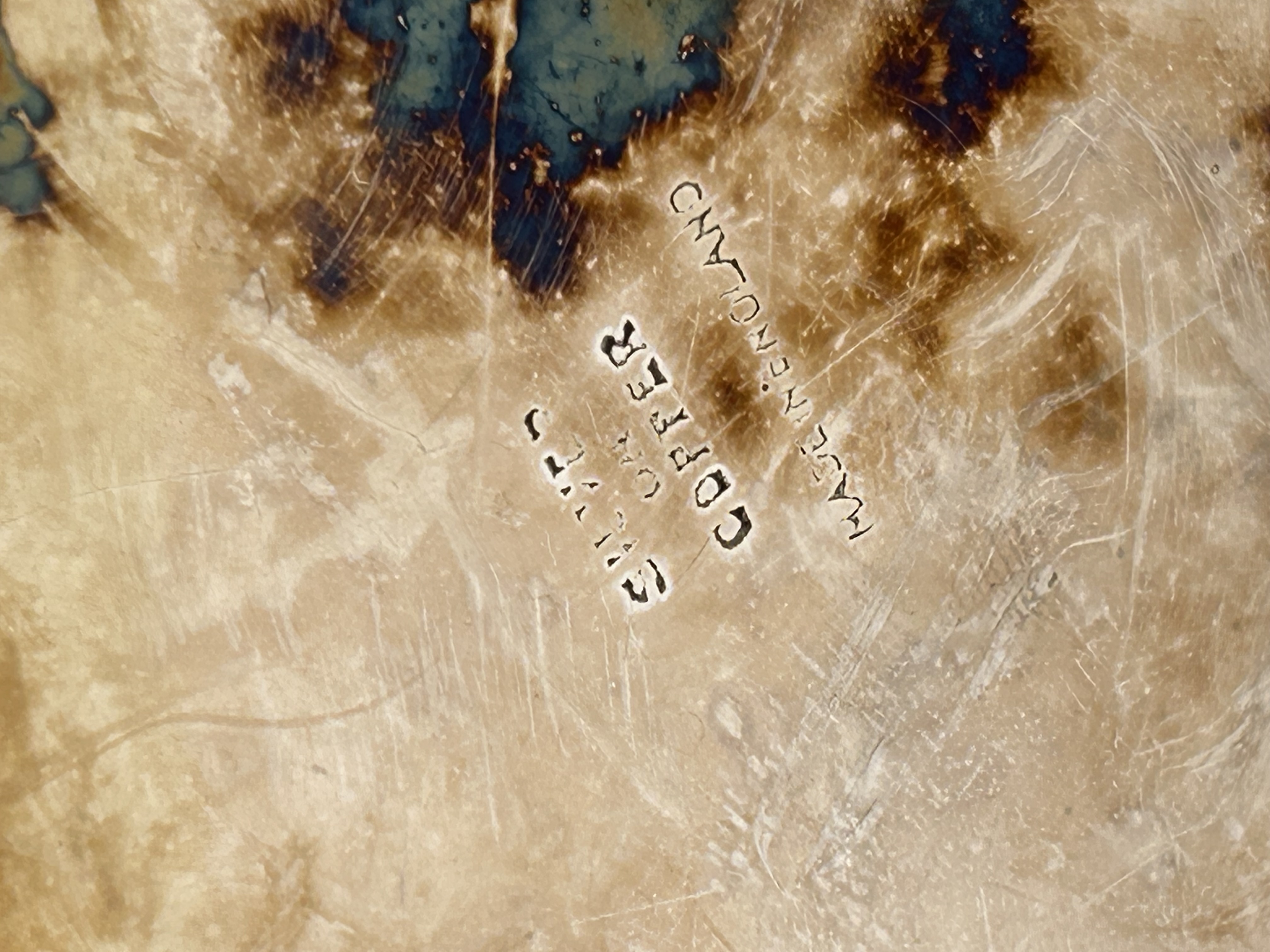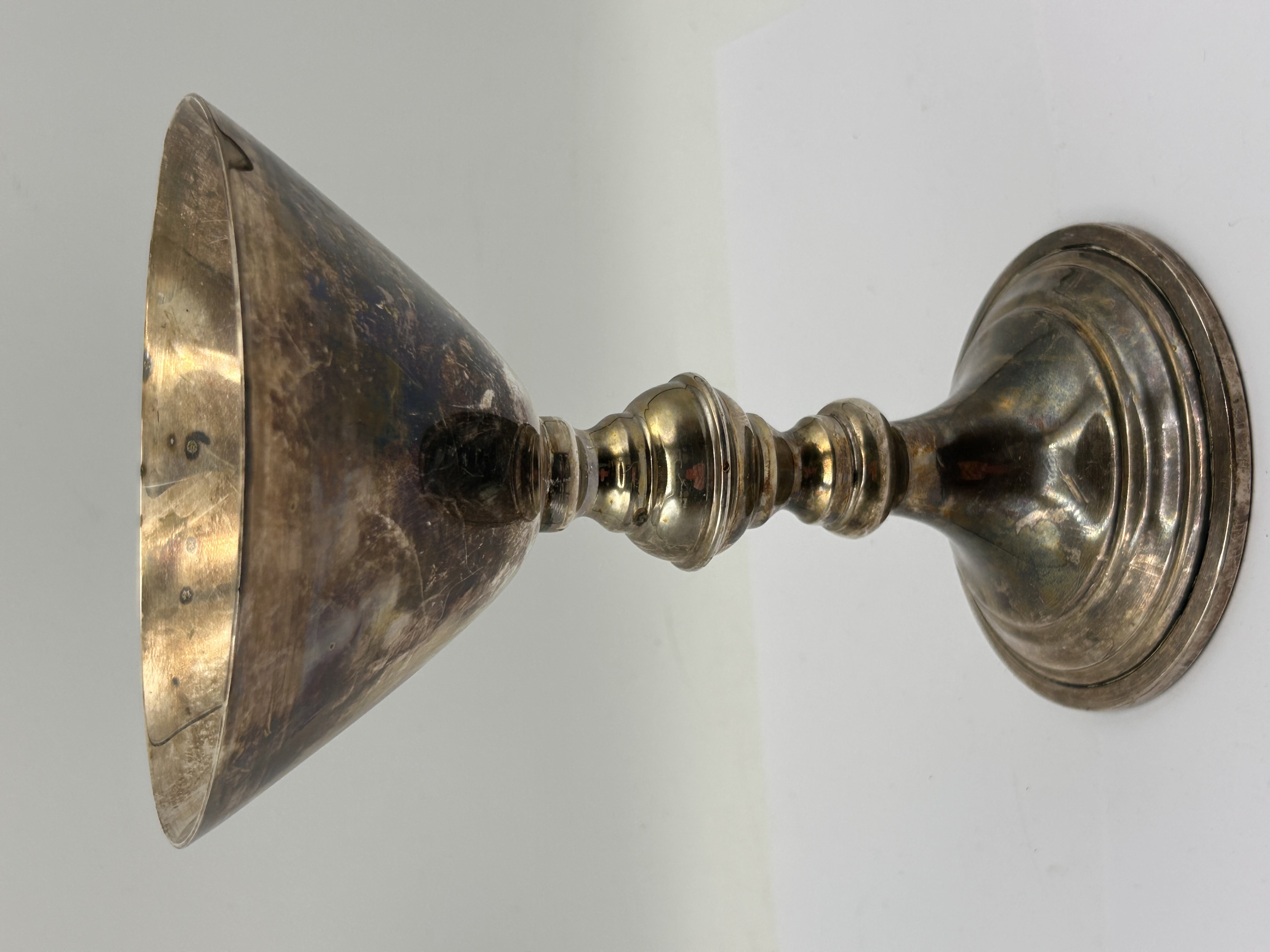 An English footed goblet or chalice-like vessel, crafted from silver-plated copper as confirmed by the legible markings “SILVER ON COPPER” and “MADE IN ENGLAND” on its underside. The design features a circular, flared base supporting a baluster-turned stem, topped with a deep, V-shaped bowl. A faint numeral “9” is visible within the interior of the bowl, and the rim appears slightly uneven.