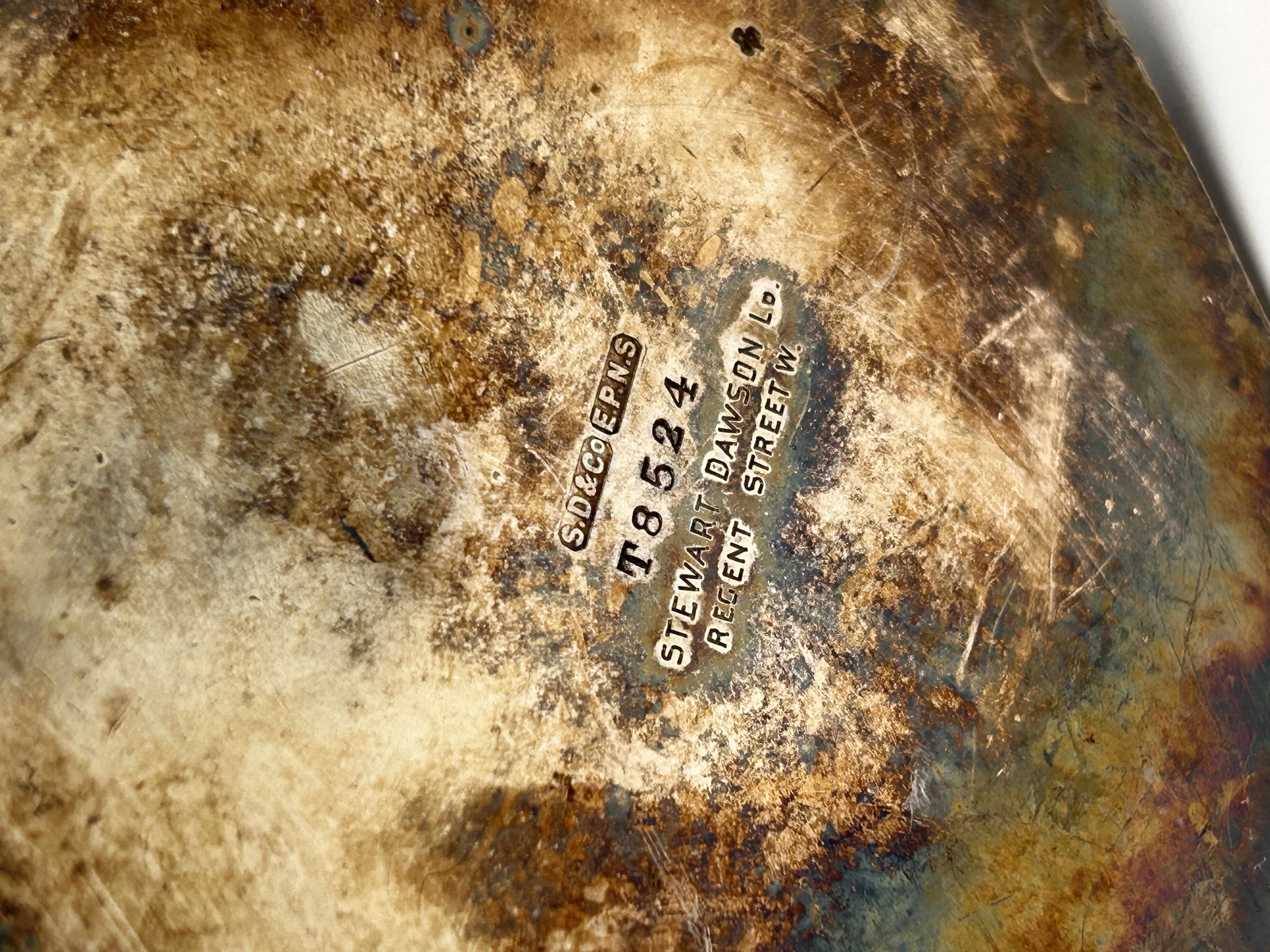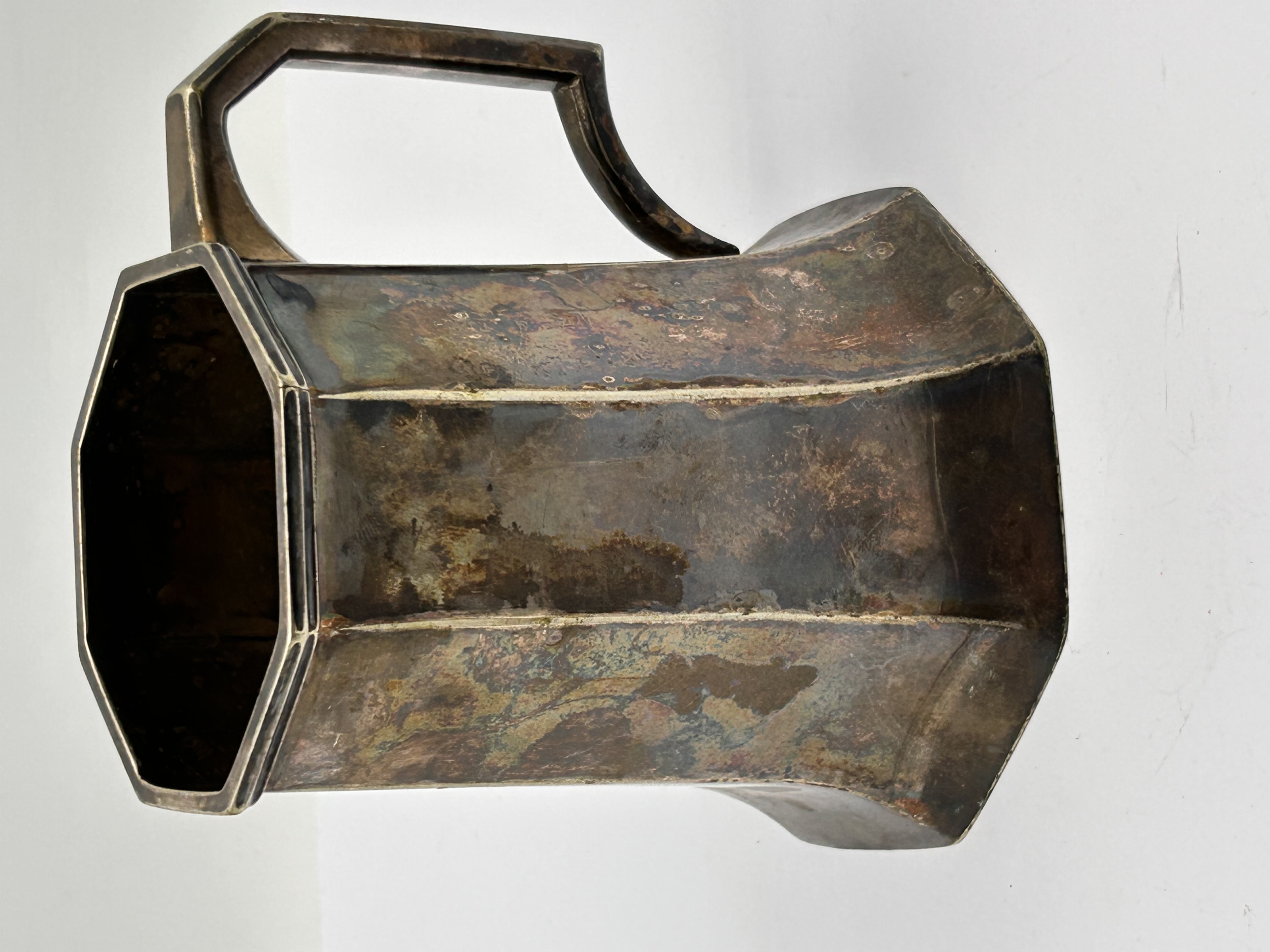 An octagonal, faceted electro-plated nickel silver (EPNS) mug or tankard, featuring a geometric body and handle. The base is clearly stamped with “S.D.&CO EPNS”, “T8524”, and the retailer/manufacturer information “STEWART DAWSON LD. REGENT STREET W.”. The style and markings suggest an early to mid-20th century production.
