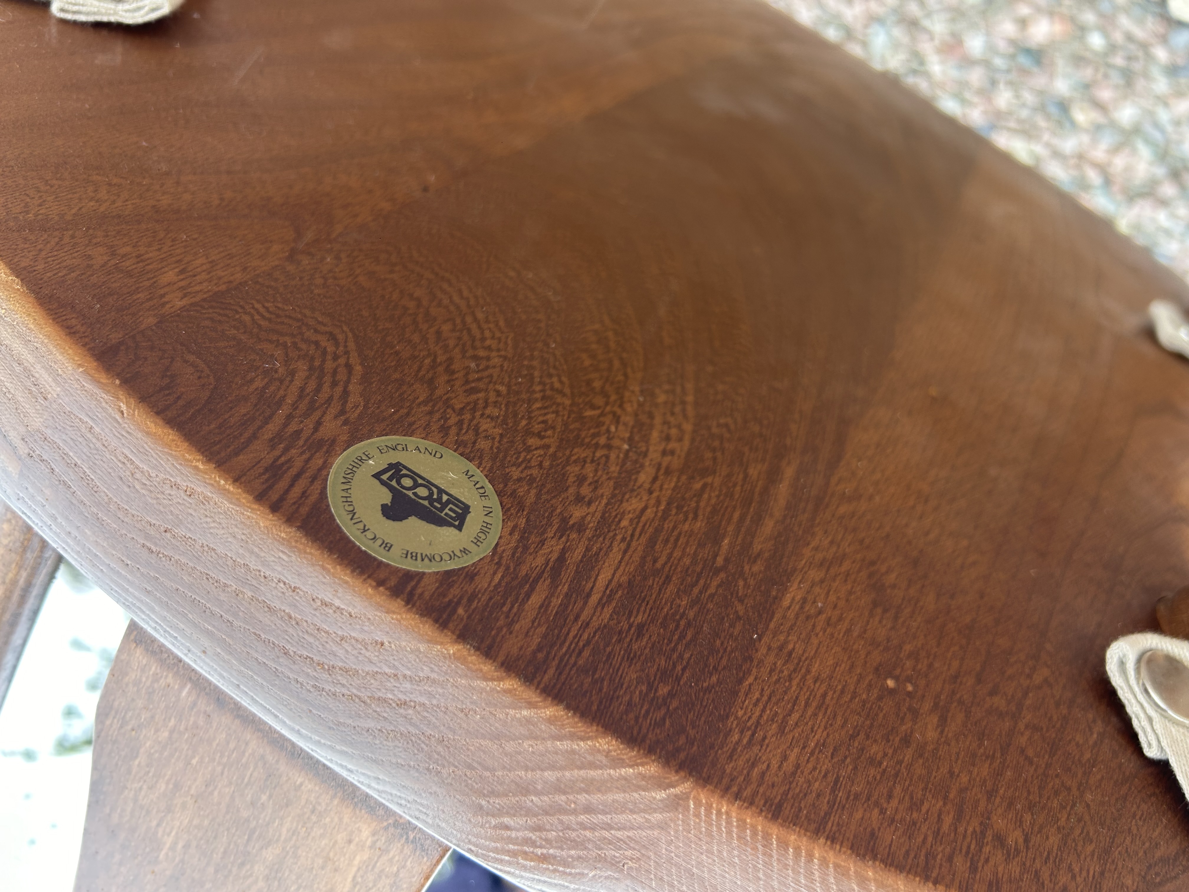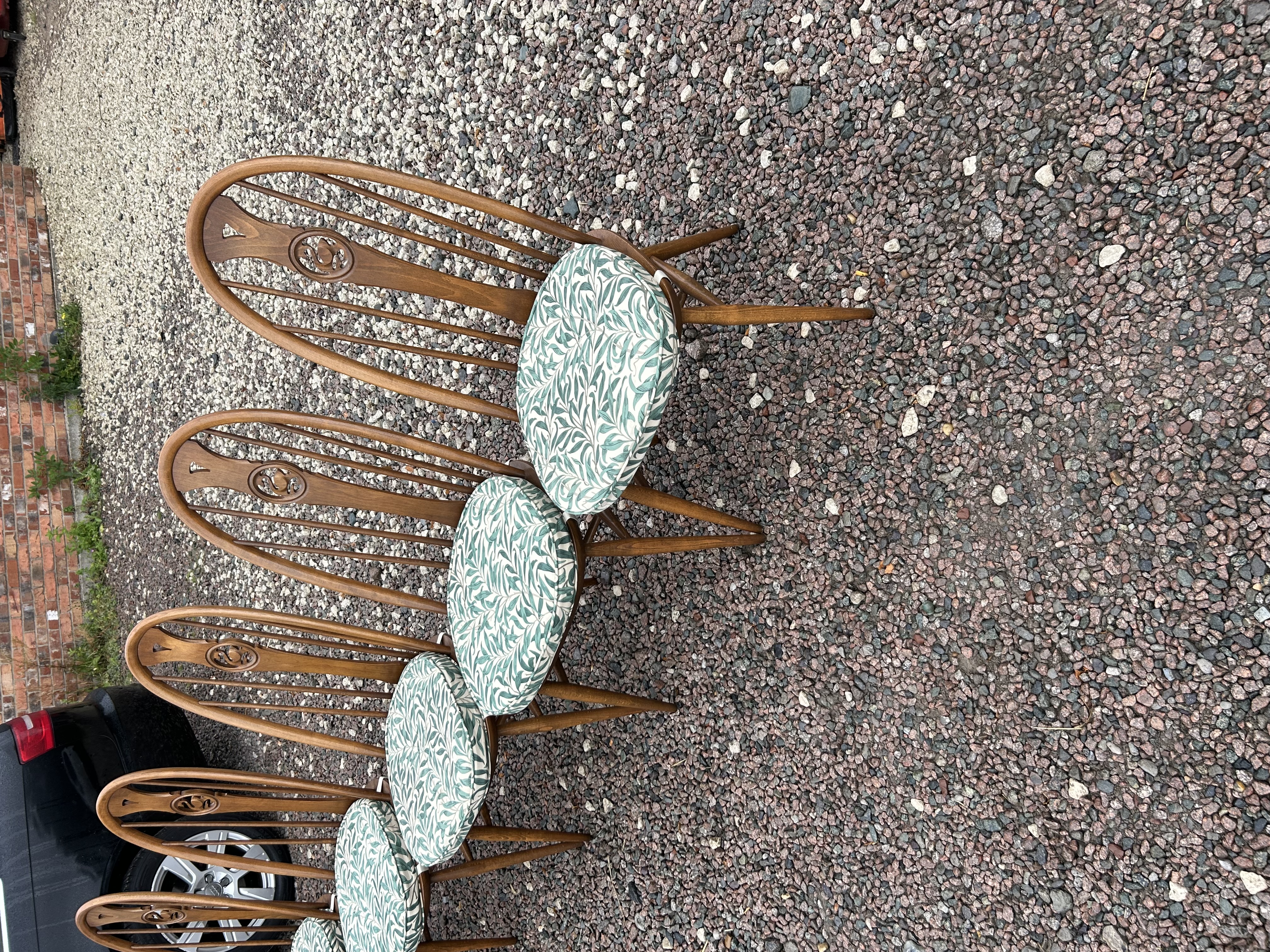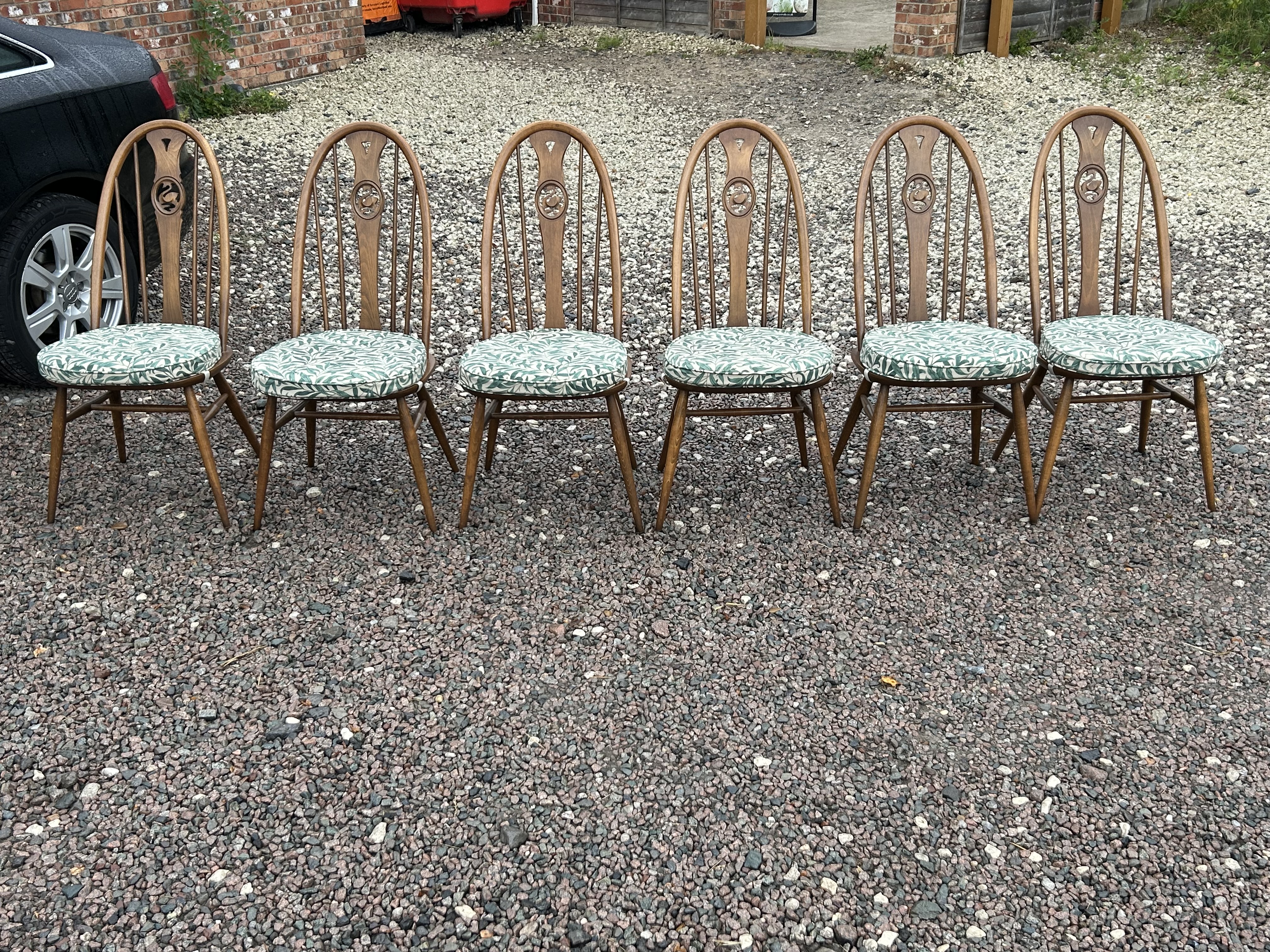 A set of six Ercol Windsor-style dining chairs, dating from the mid-20th century. Each chair features a curved wooden spindle back with a distinctive central carved medallion, solid turned legs, and an upholstered drop-in seat cushion. The frames are constructed from a medium-dark stained wood, characteristic of the manufacturer. The cushions are covered in a patterned fabric featuring a repeating organic motif in green and white tones. A manufacturer’s label is visible on one chair, reading ‘ERCOL’ in the center, encircled by ‘MADE IN HIGH WYCOMBE BUCKINGHAMSHIRE ENGLAND’.