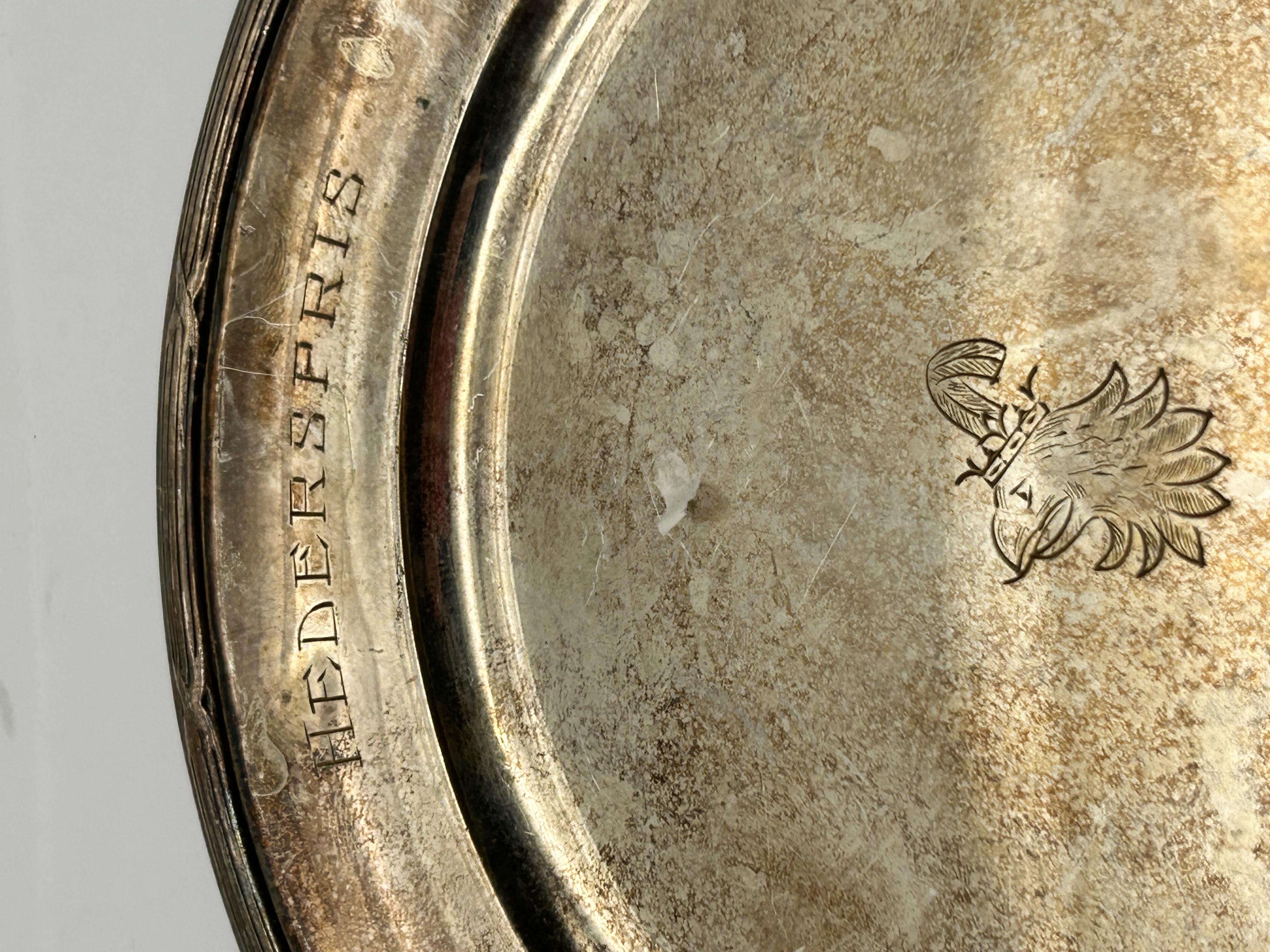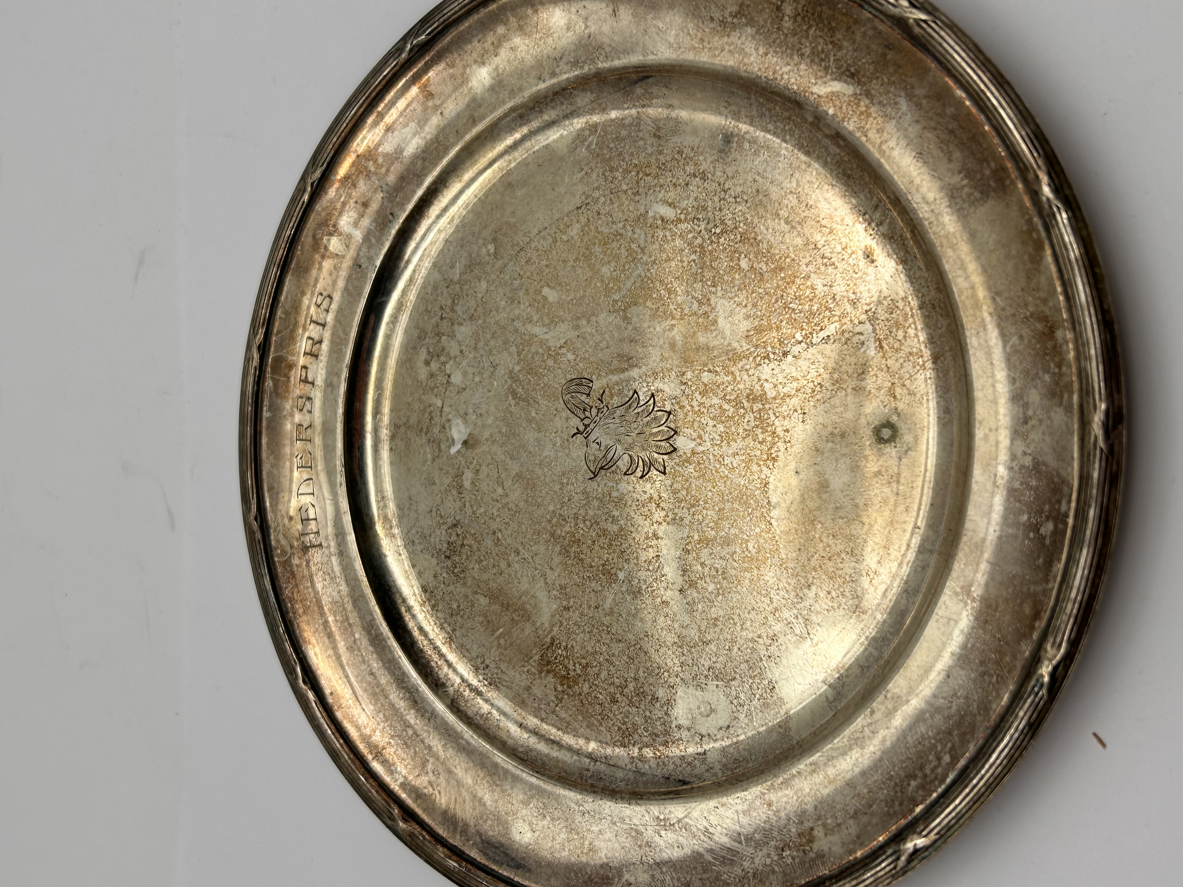 A round, silver-colored metal platter or tray, appearing to be silver plate or sterling silver. The rim features engraved text, ‘HEDERSPRIS,’ which translates from Swedish/Norwegian as ‘Prize of Honor’ or ‘Honorary Prize.’ Centered on the main surface is an engraved heraldic-style motif depicting a crowned head, likely an eagle or gryphon.