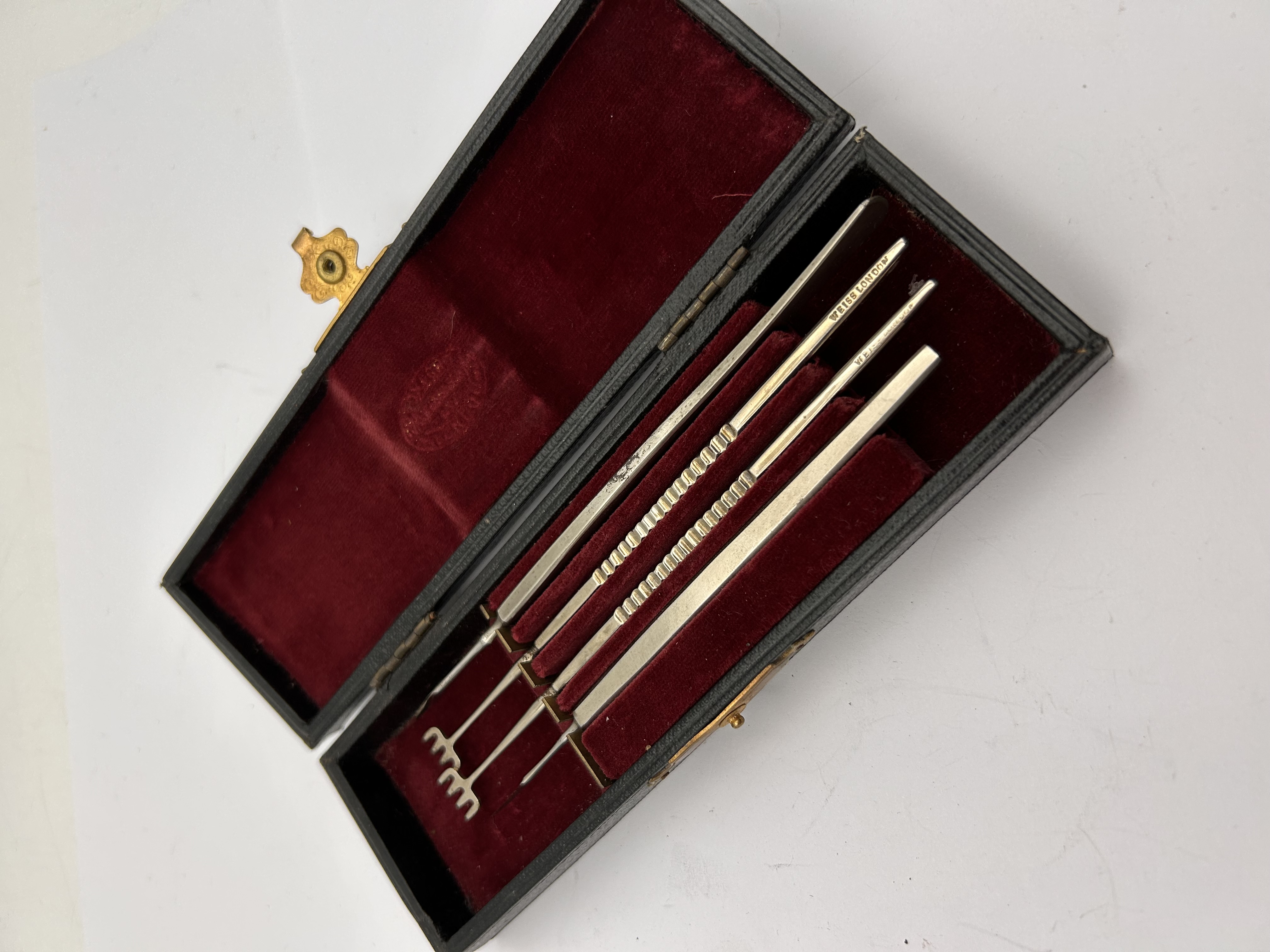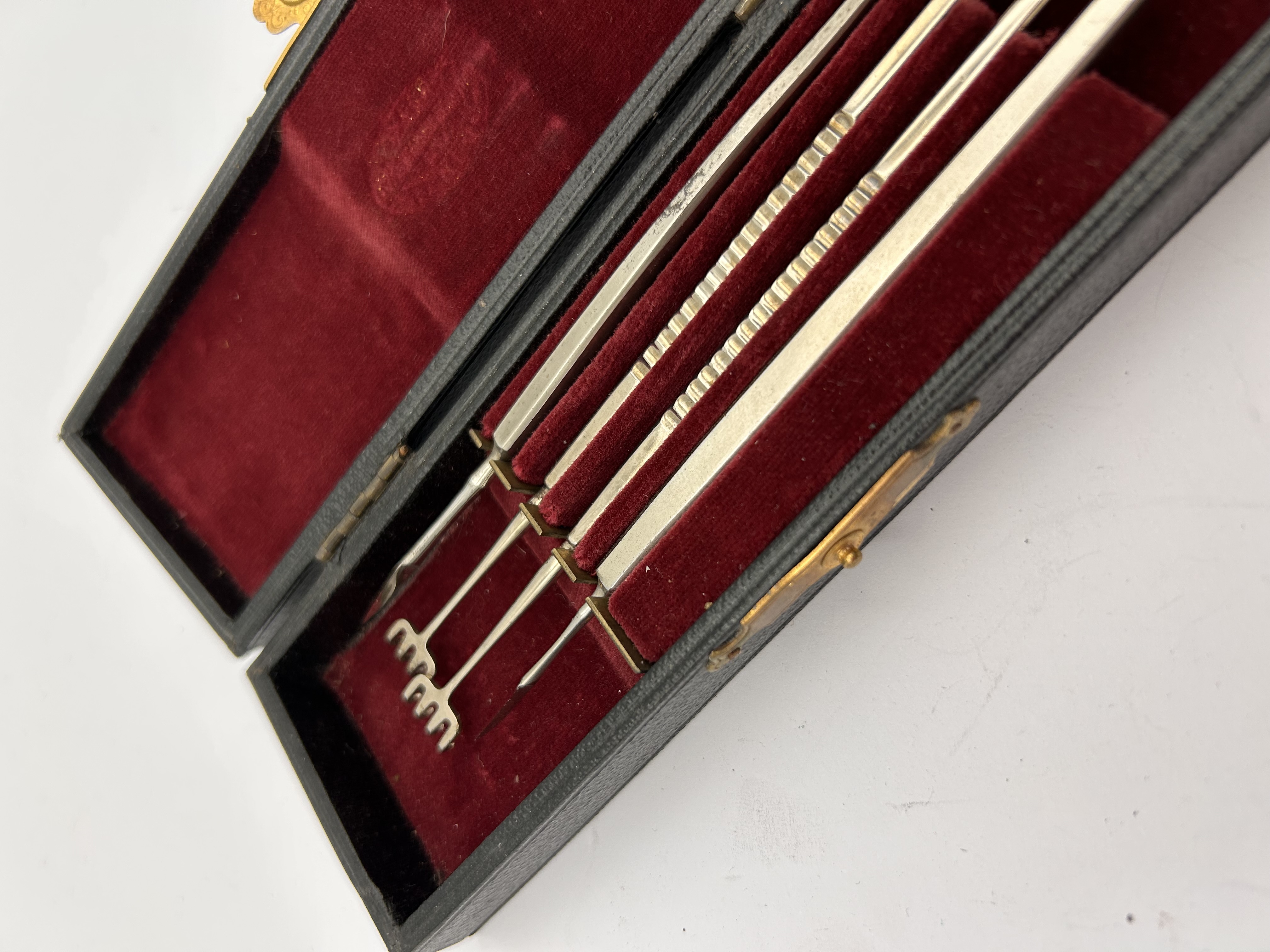 A late 19th Century Ophthalmic Surgery Kit by J. Weiss and Son and Dixey, England, comprising five silver-tone metal instruments. The instruments include a rake-like implement, various pointed tools, and ribbed tools. One instrument is clearly marked “SILVER COATED”, indicating a silver layer applied to its surface. They are presented in a rectangular black leatherette case with brass-tone clasps and a vibrant red velvet interior. An illegible embossed mark is present within the lid’s lining.