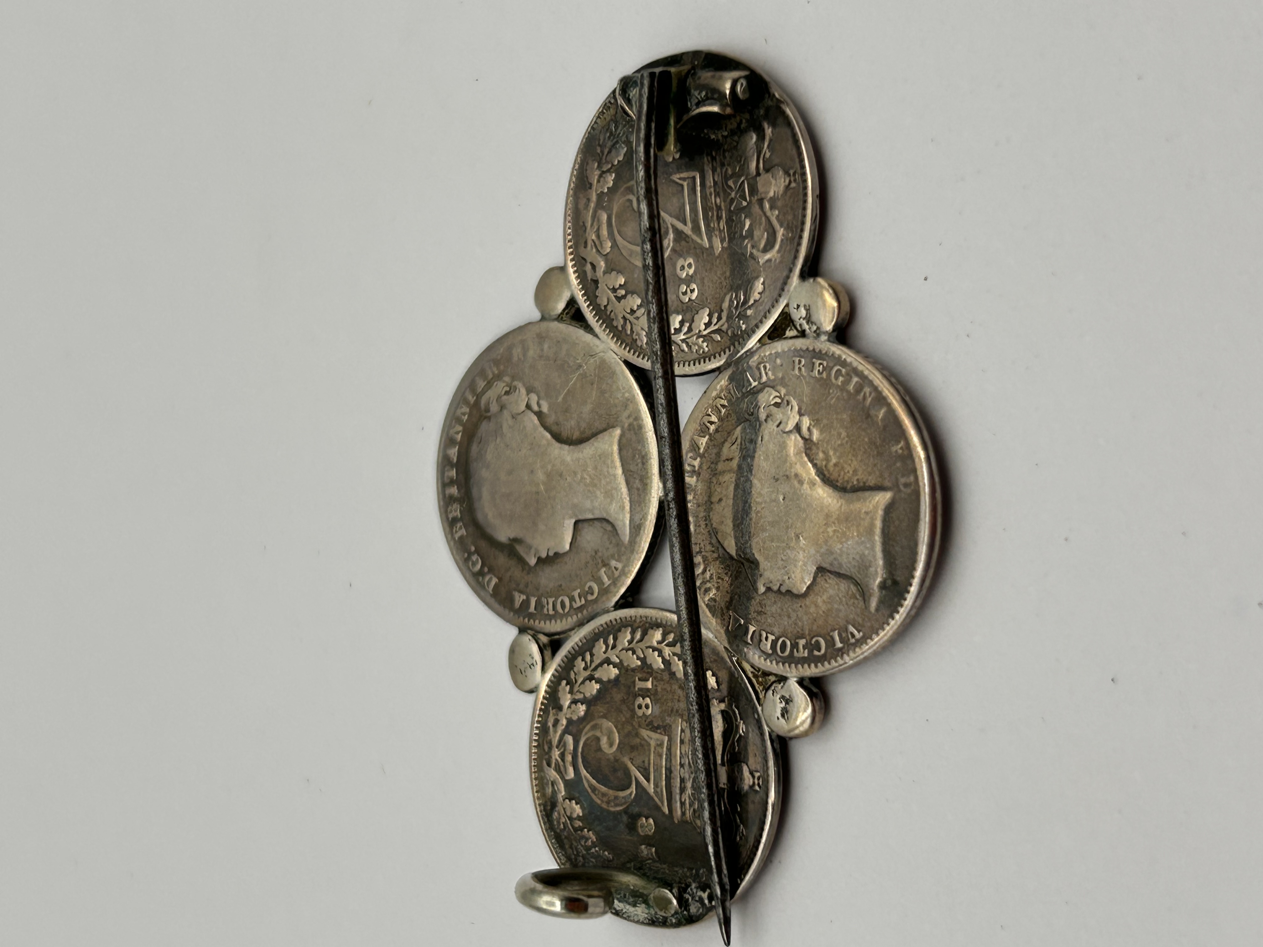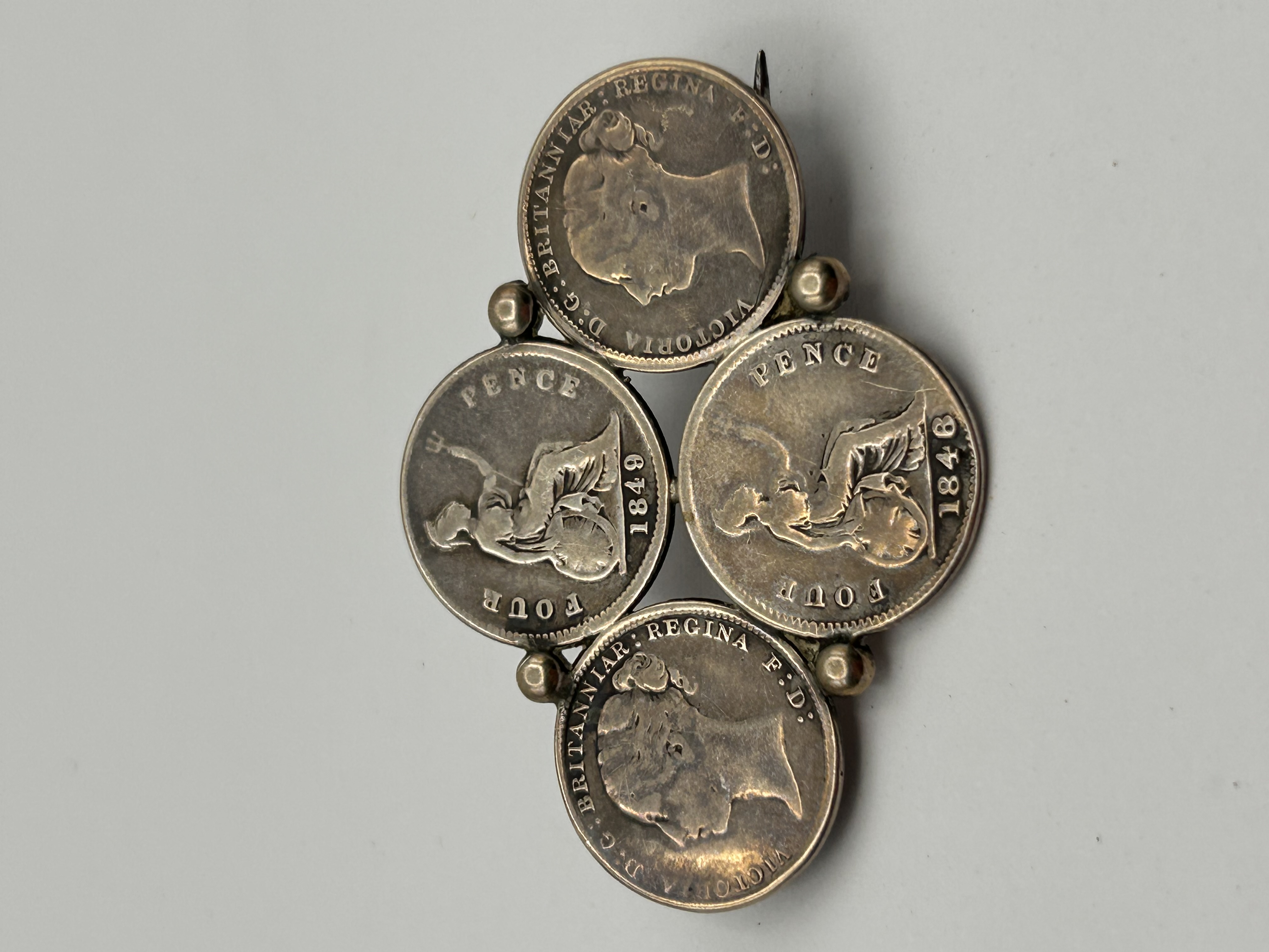 A Victorian silver-toned metal brooch constructed from four British fourpence coins (groats)And Threepence arranged in a cruciform pattern. The coins are joined by small spherical connectors, with a simple pin and catch mechanism affixed to the reverse. The obverse of two coins depicts a seated Britannia figure holding a trident and shield, inscribed “FOUR PENCE” and dated “1849” and “1846” respectively. The other two coins display a profile portrait of Queen Victoria, encircled by the Latin inscription “VICTORIA D:G: BRITANNIAR: REG: F:D:” (Victoria, by the Grace of God, Queen of the Britains, Defender of the Faith). The reverse of the coins, where visible, shows worn numeral designs and partial dates, such as “18” and “88”.