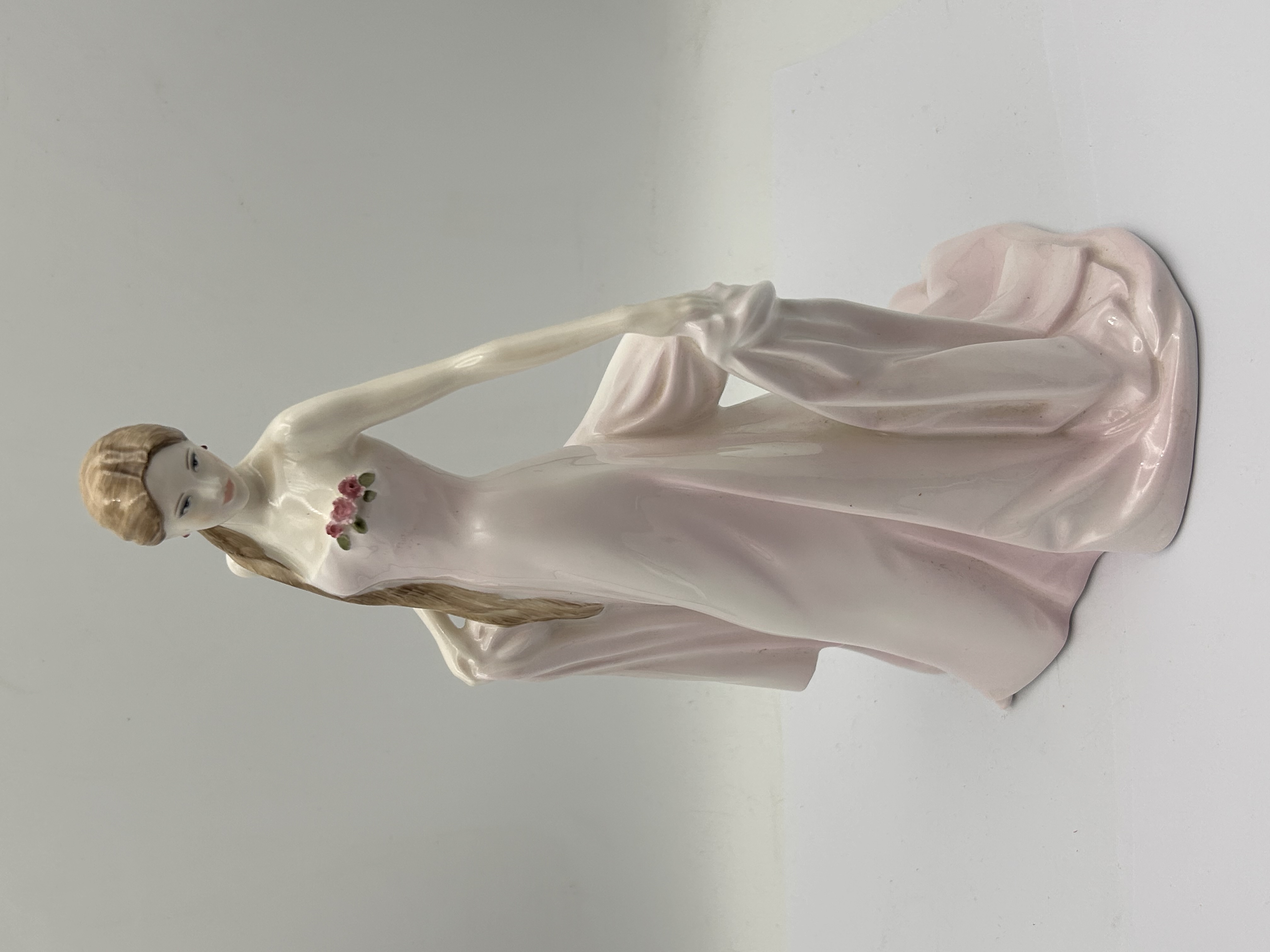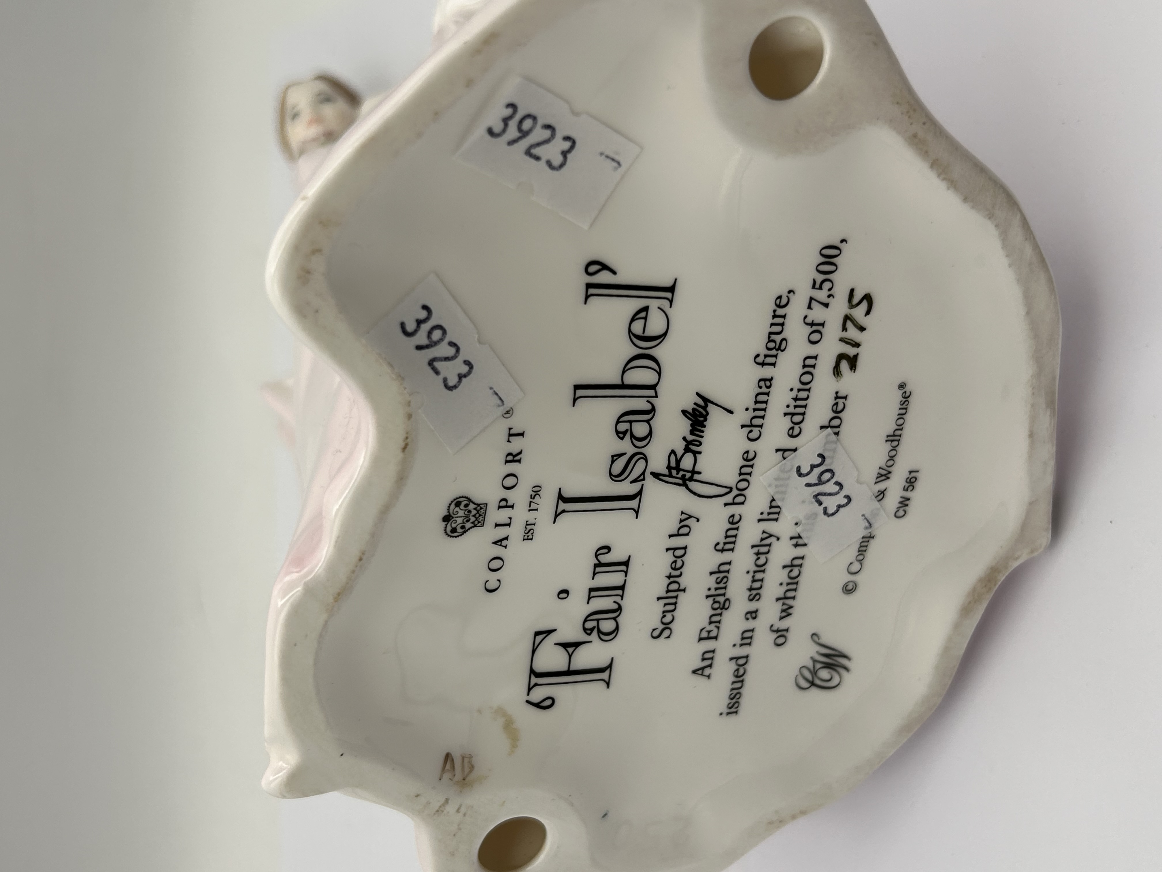 A Coalport ‘Fair Isabel’ fine bone china figurine, sculpted by J. Bromley. The figurine depicts a standing female figure with long, light brown hair, wearing a flowing light pink gown adorned with three small pink roses on the bodice. This piece is number 2175 from a strictly limited edition of 7,500. The base is clearly marked “COALPORT EST. 1750” with a crown logo, “‘Fair Isabel’,” “Sculpted by J. Bromley,” “An English fine bone china figure, issued in a strictly limited edition of 7,500, of which this is number 2175,” alongside a copyright mark for “Compton & Woodhouse®” and “CW 561.” The figurine presents an elegant, decorative style consistent with late 20th or early 21st-century production.