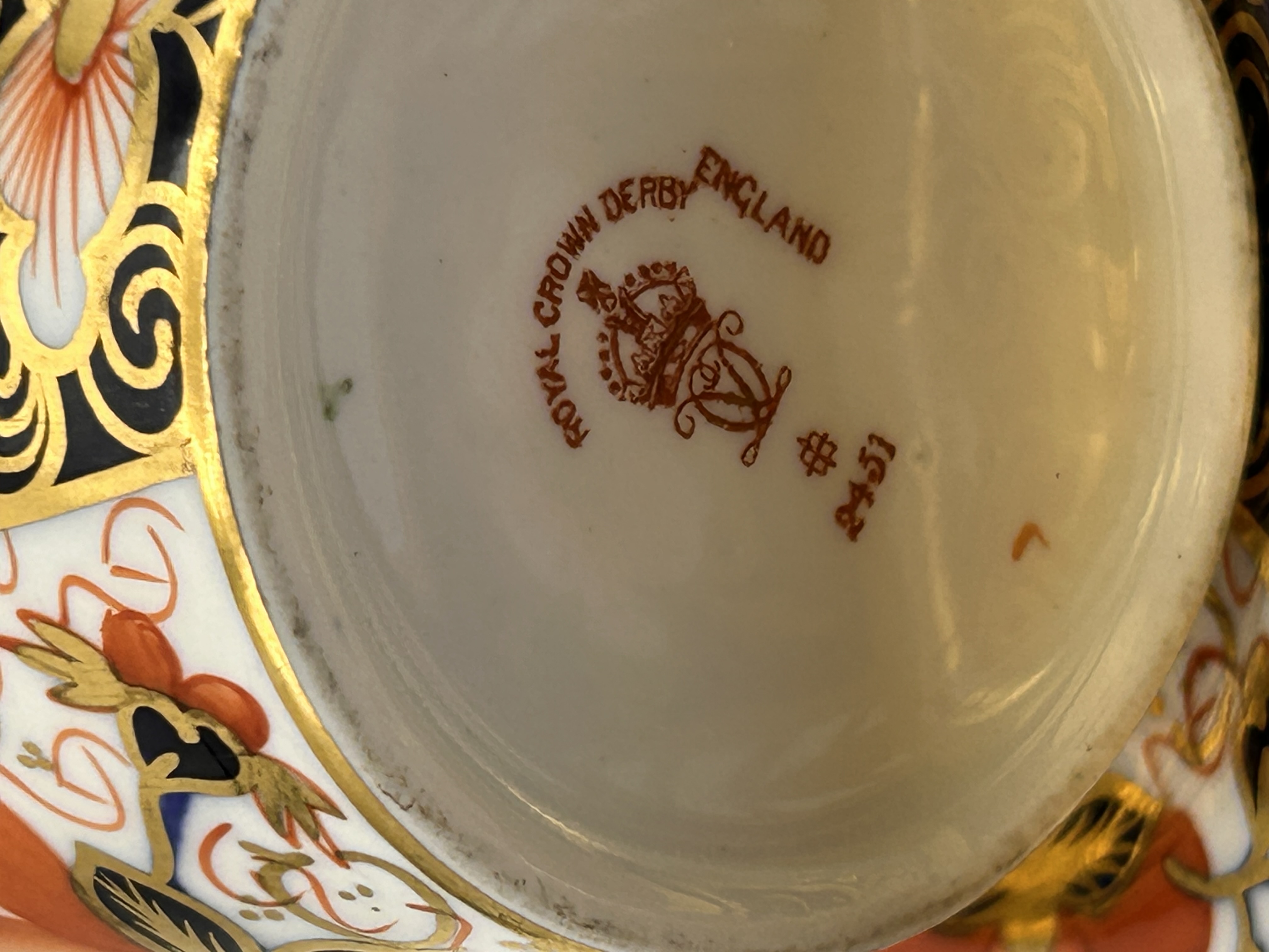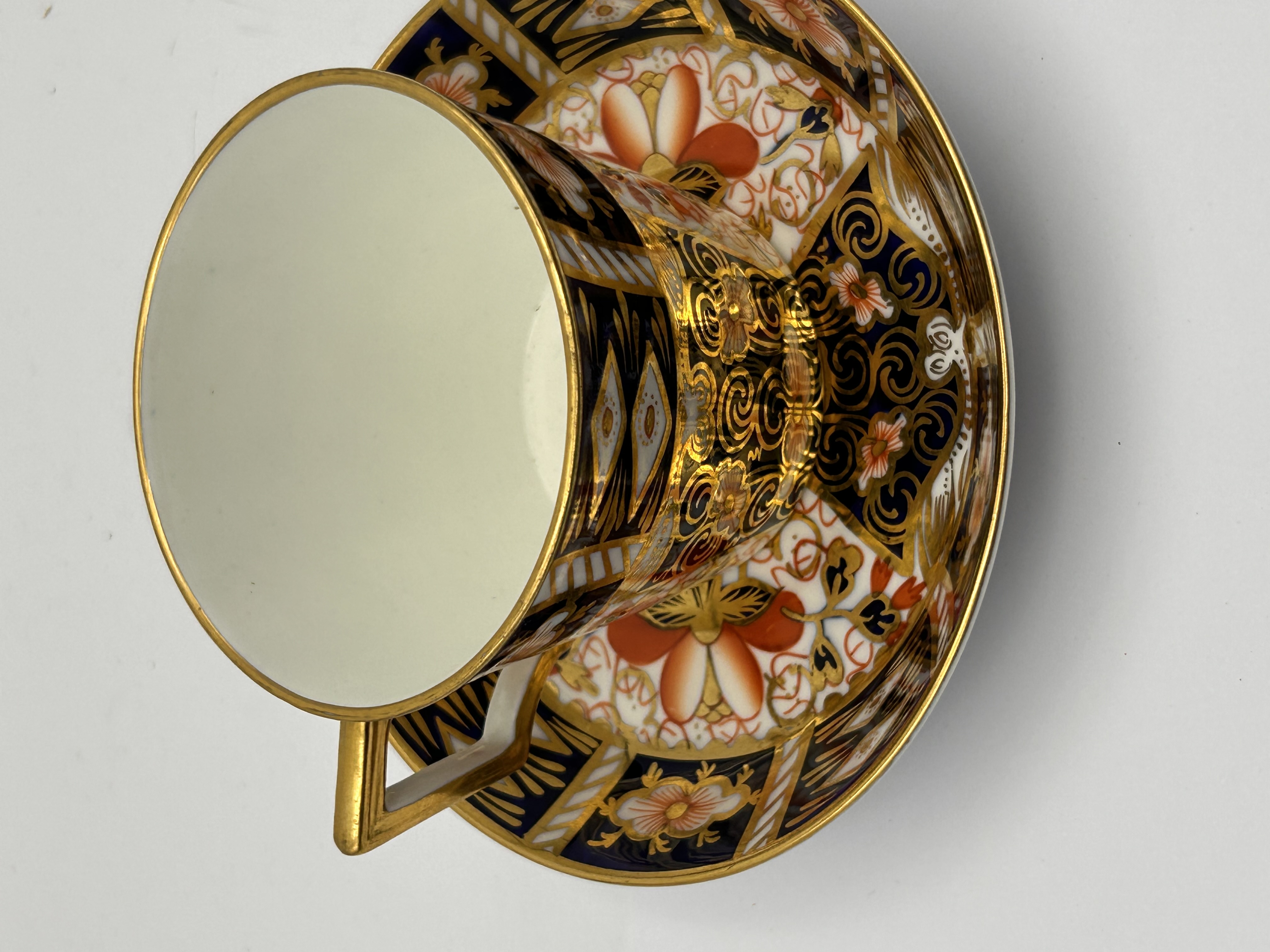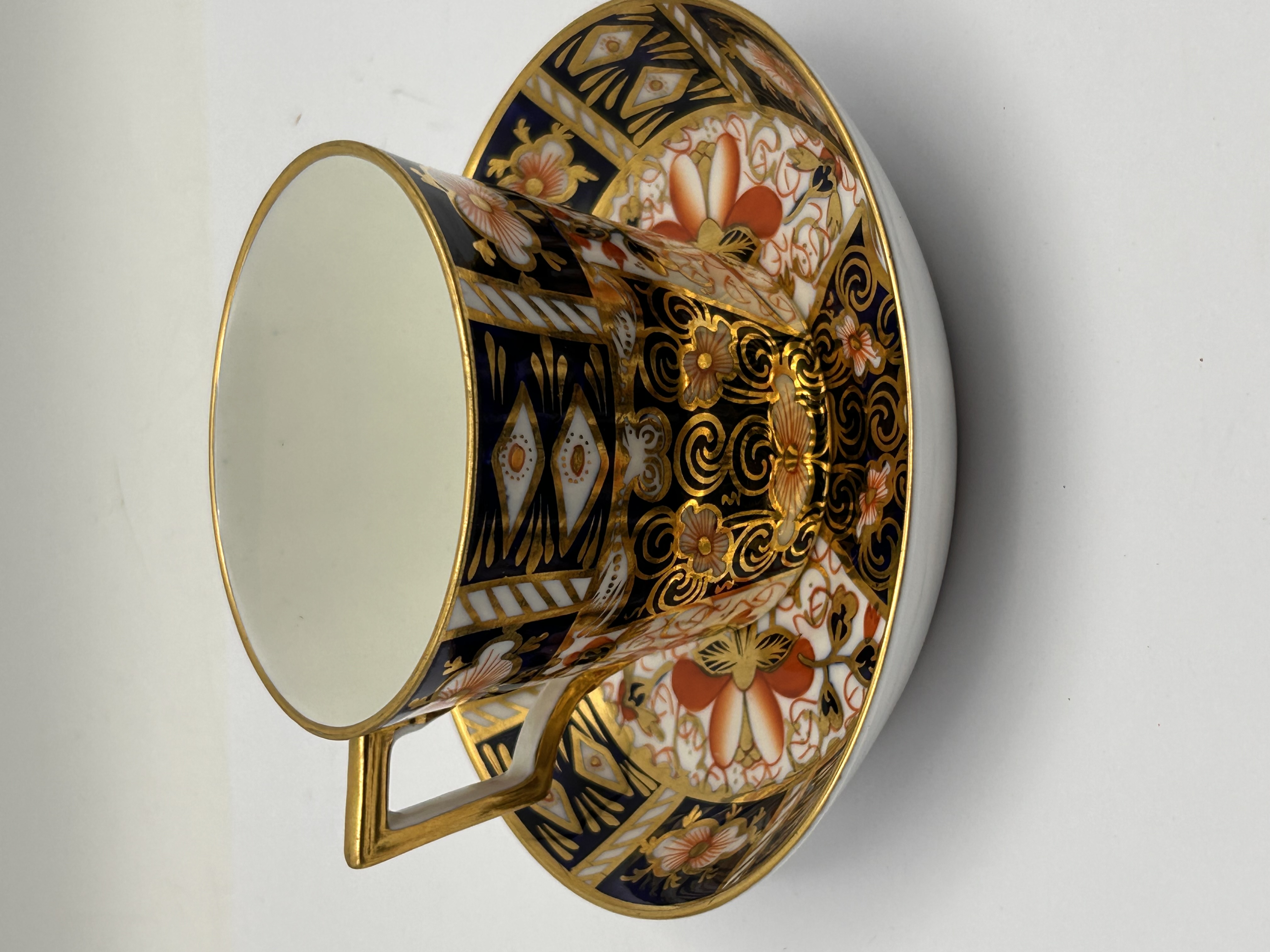 A Royal Crown Derby Imari 2451 teacup and saucer set, crafted from bone china. The set is rendered in an elaborate Imari-style pattern, featuring a rich palette of cobalt blue, iron red, and extensive gold gilding. The design incorporates intricate stylized floral motifs, geometric elements, and scrollwork throughout both pieces. The cup presents a straight-sided form with a squared, gilded handle. The base of the cup is clearly marked with a red printed “ROYAL CROWN DERBY ENGLAND” surrounding a crowned monogram, with “2451” visible below.
