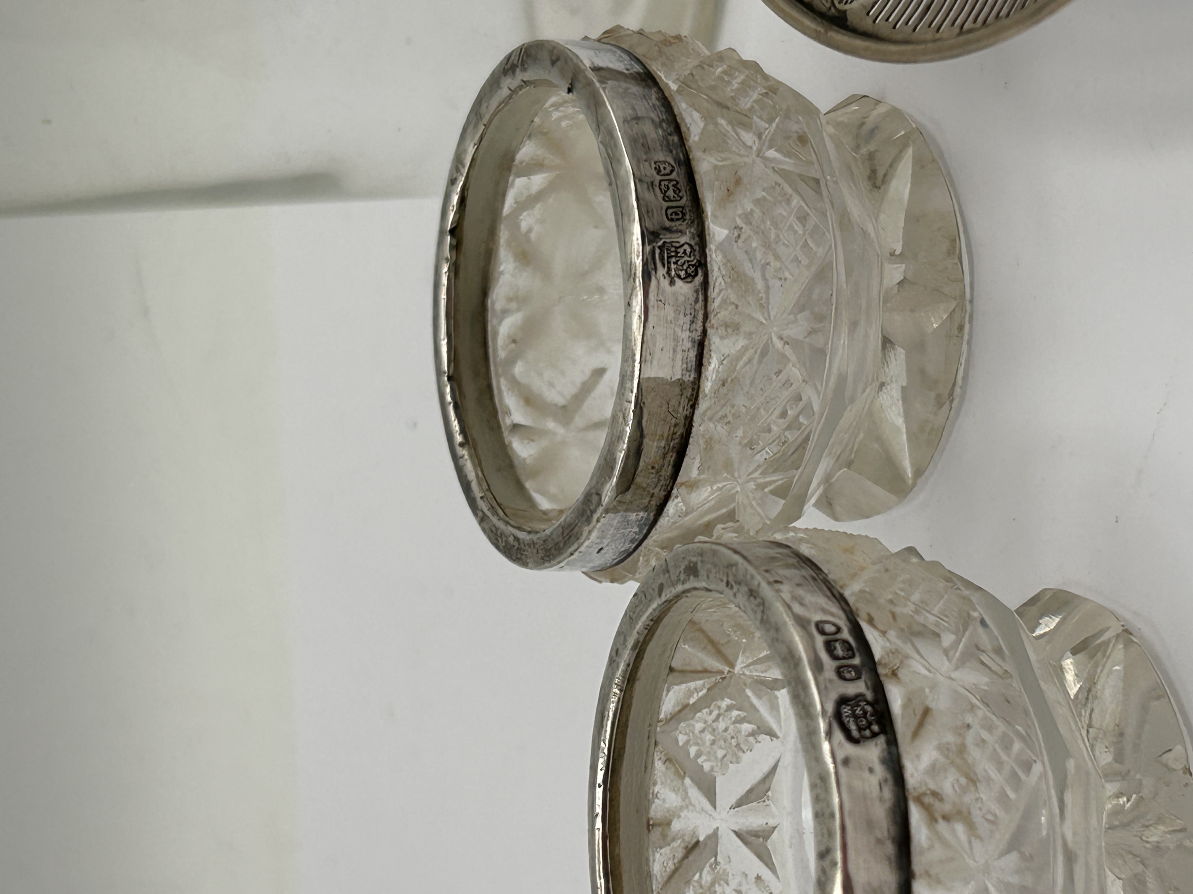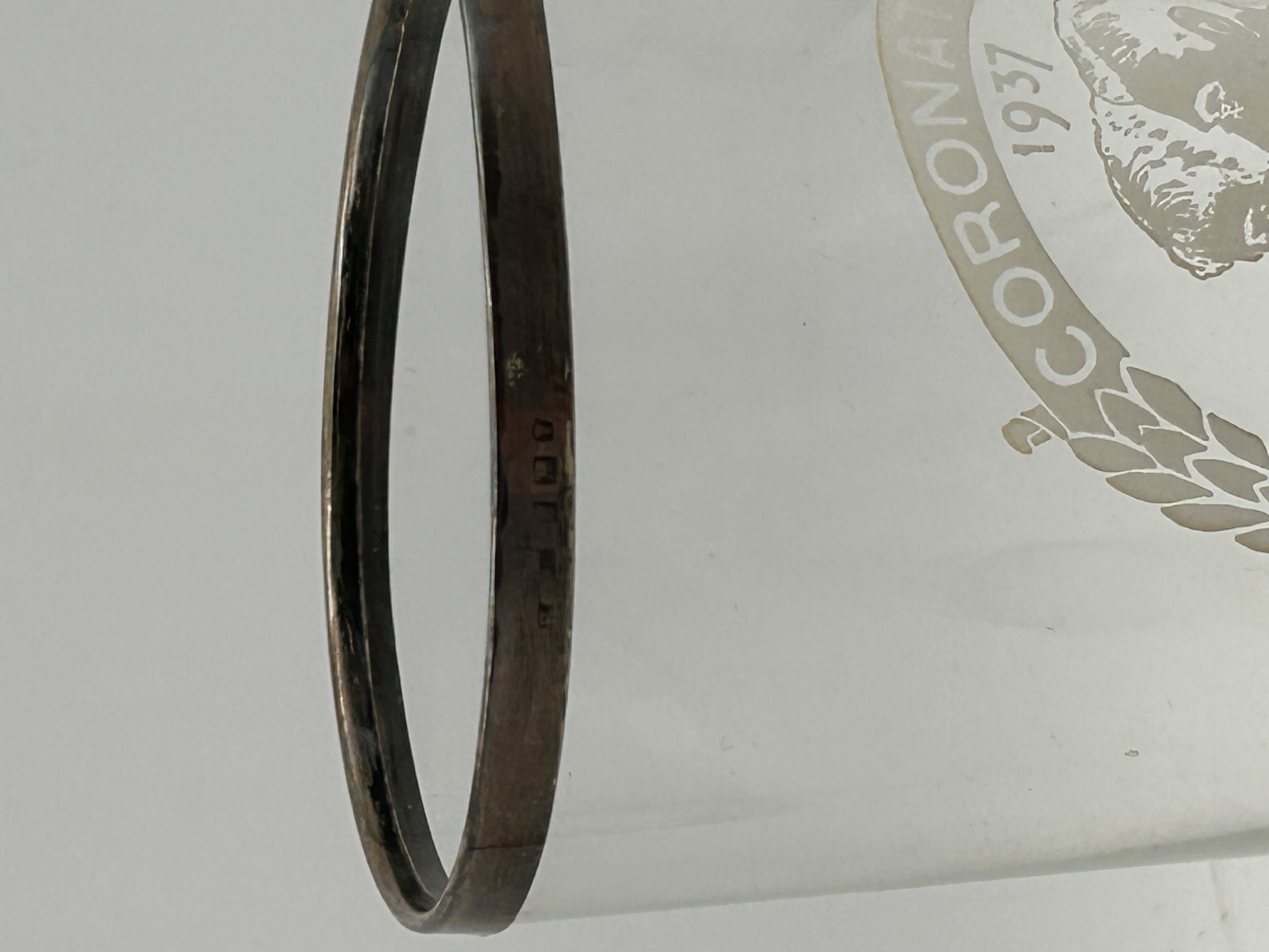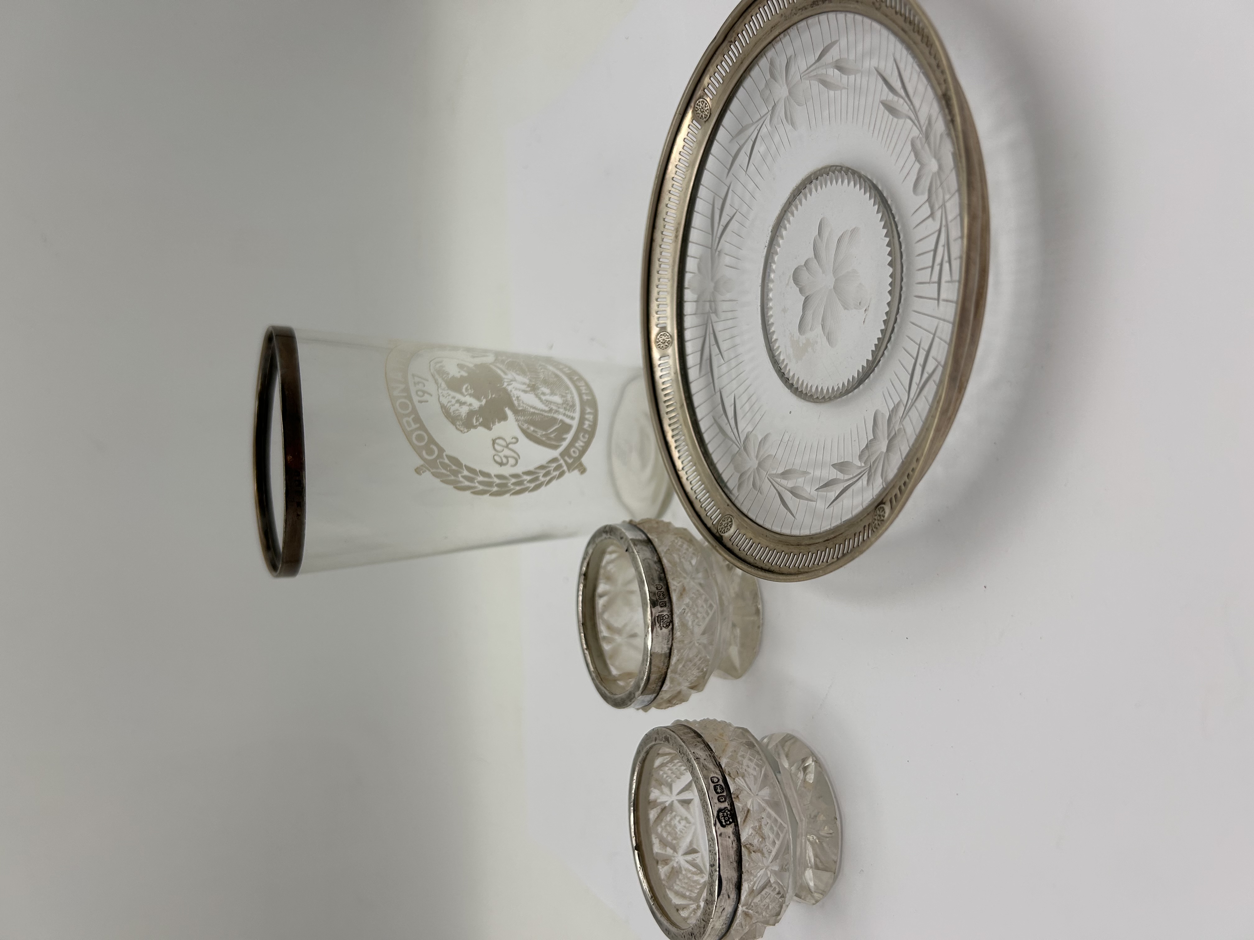 This lot comprises a set of four commemorative items, likely produced for the 1937 Coronation of King George VI and Queen Elizabeth. The set includes a clear glass tumbler, two small cut glass dishes, and a larger cut glass plate or coaster. The tumbler is decorated with etched or frosted designs depicting King George VI and Queen Elizabeth, along with the text “CORONA 1937”, “R G” (Royal Cypher GR VI), and partially visible “LONG MAY THEY” (likely “Long May They Reign”). The two smaller dishes and the larger plate feature geometric cut glass patterns. All pieces are fitted with sterling silver rims, confirmed by visible hallmarks including the lion passant, an anchor assay mark for Birmingham, a date letter ‘L’ (corresponding to 1935/36, consistent with the 1937 coronation event), and a maker’s mark ‘G&CL’.