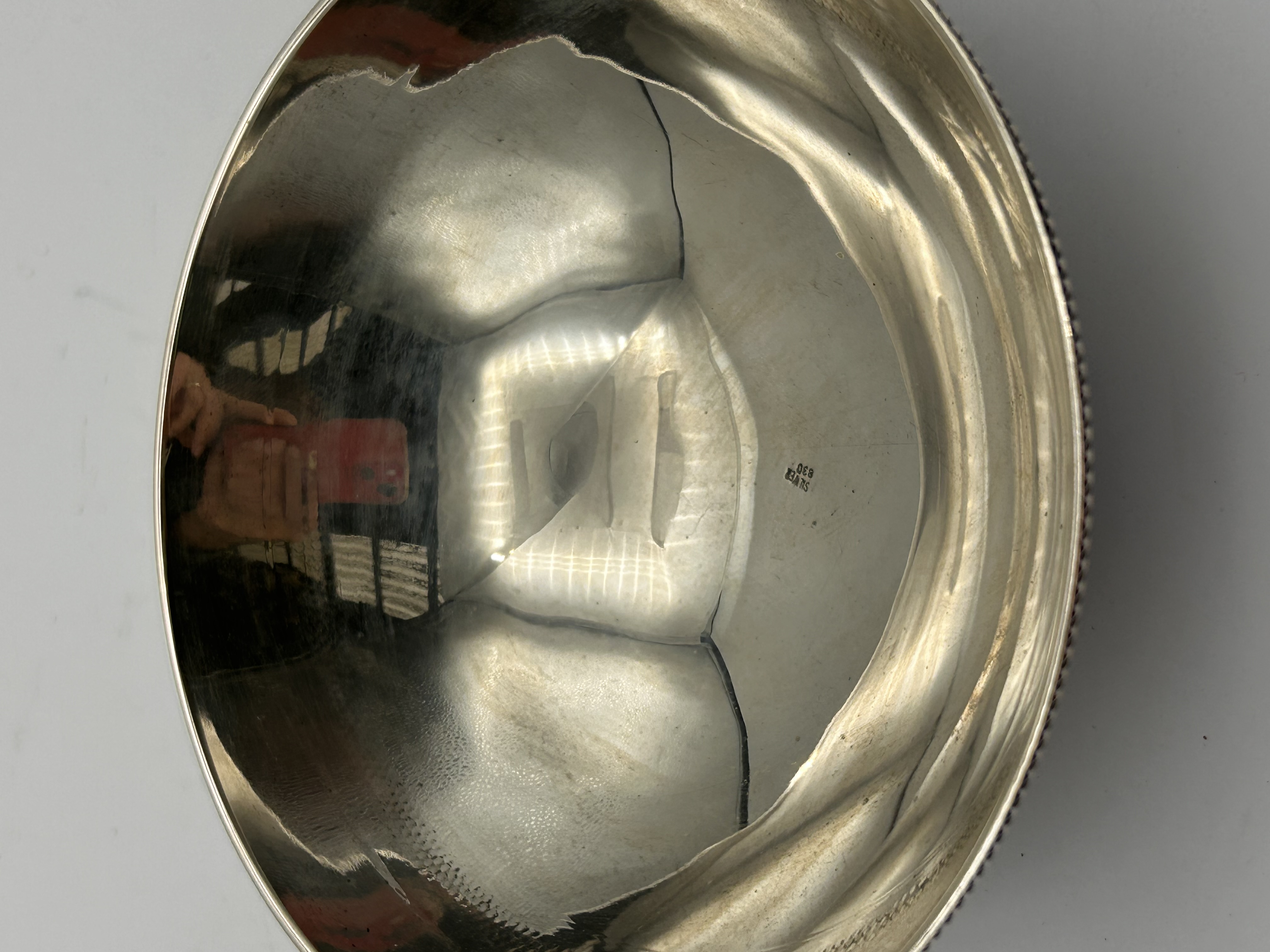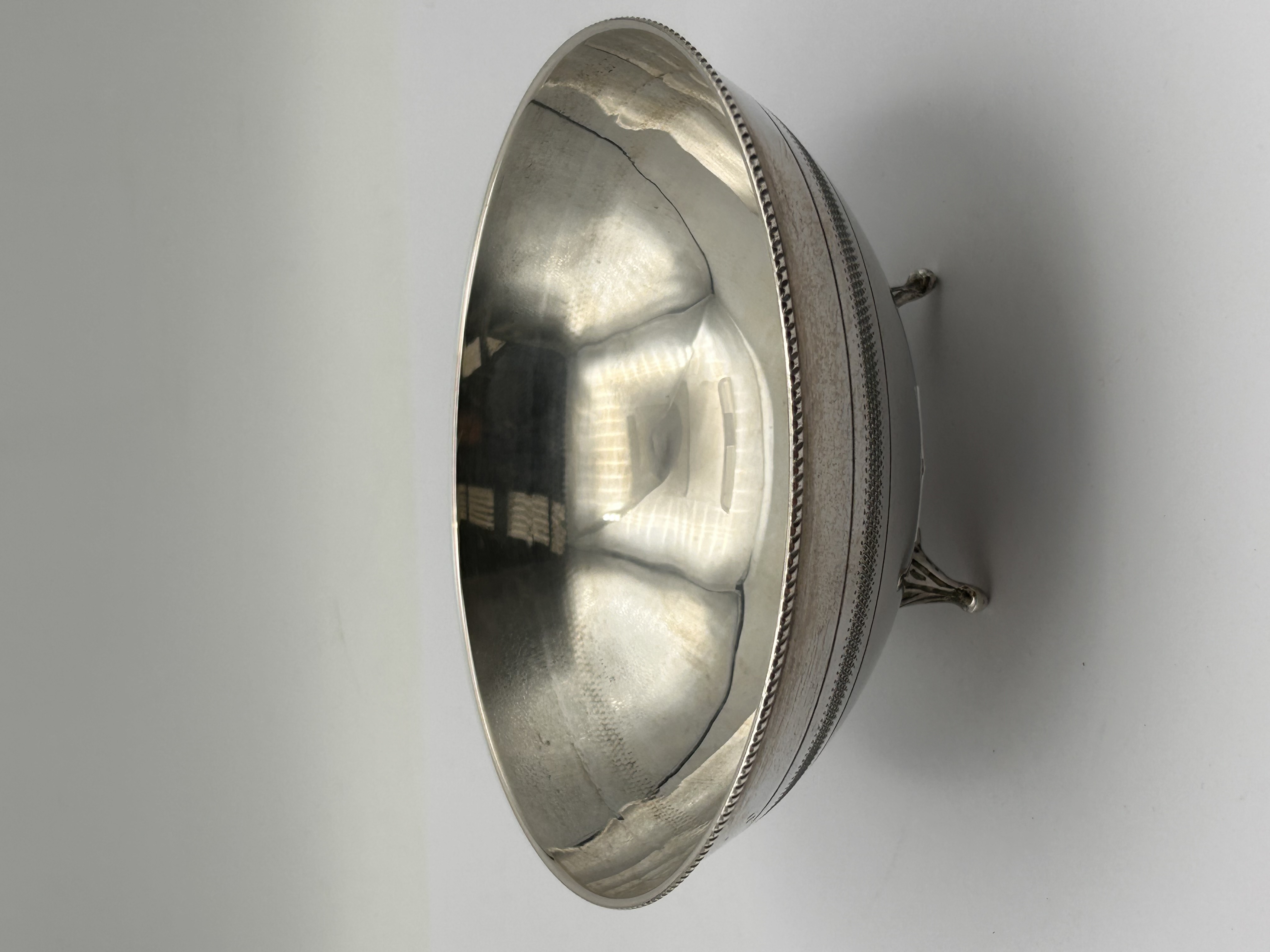 A circular, footed bowl crafted from sterling silver. The object features a slightly flared rim adorned with a reeded or beaded edge, below which lies a band of finely textured or chased decoration, followed by a second reeded band. It is supported by three splayed, decorative feet, cast as acanthus leaves. The interior bottom clearly displays a rectangular mark reading “SILVER” and “830”. The overall aesthetic is traditional or classical-inspired.