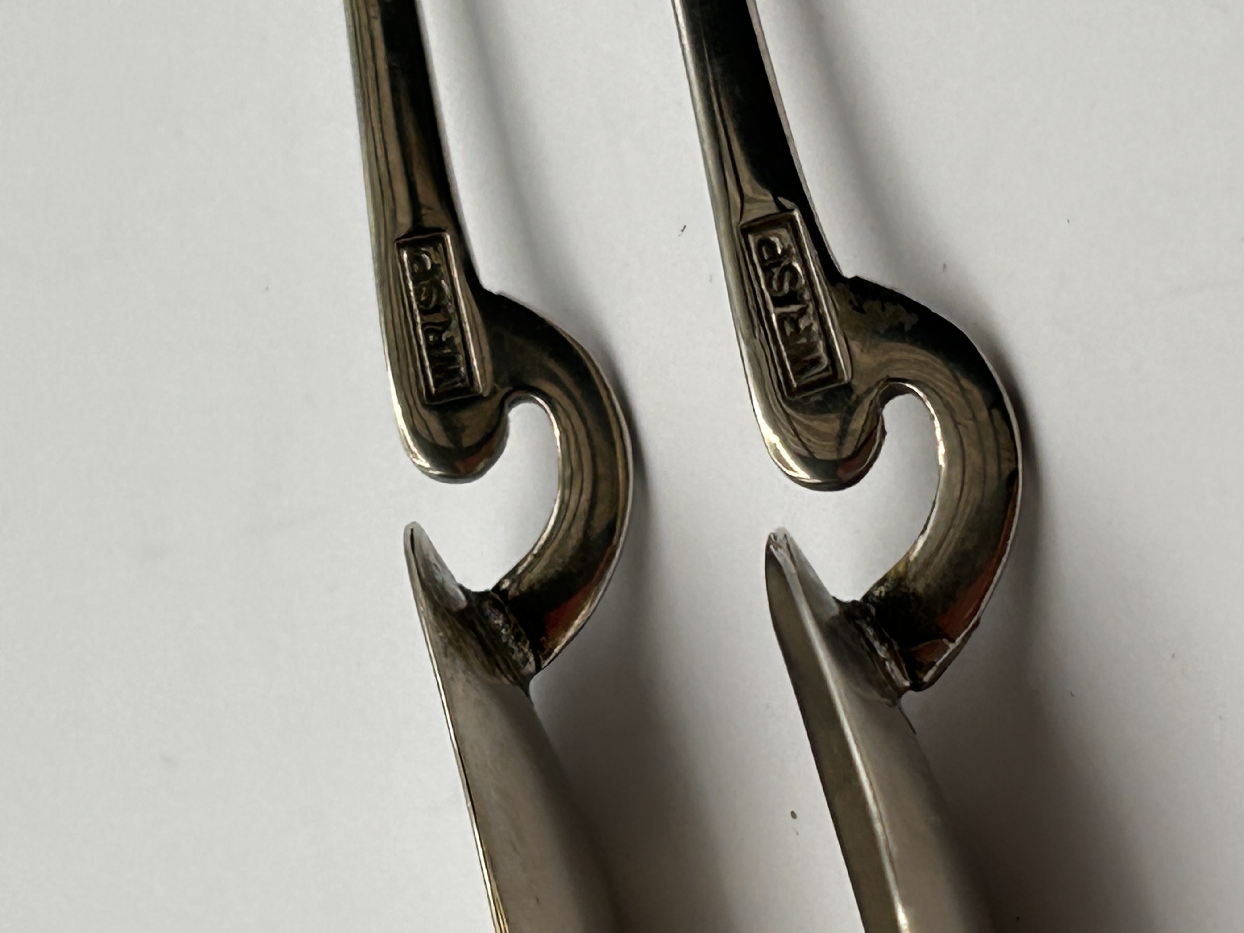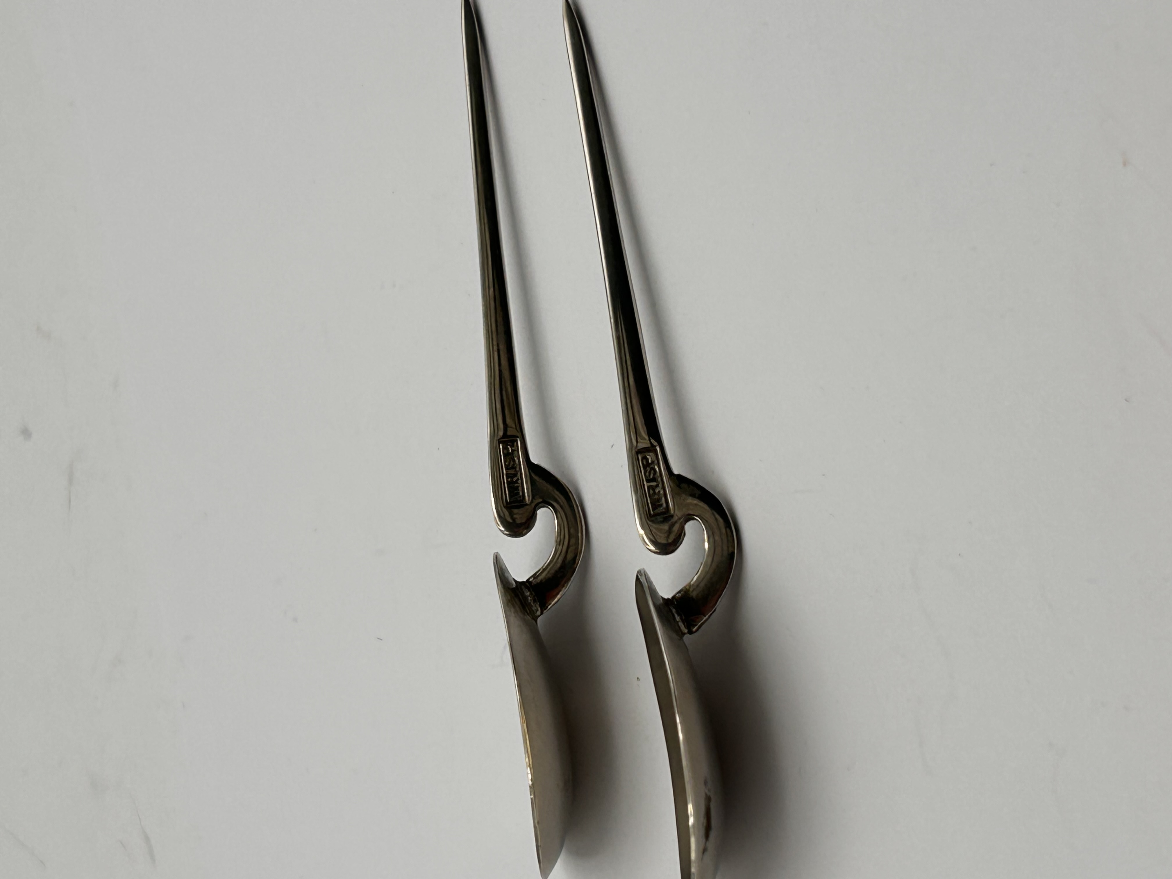 A pair of identical small, sterling silver-toned metallic utensils, each featuring a shallow, rounded bowl and a distinctively curved handle. The handle forms a hook-like shape, suggesting a specialized function such as hanging or resting on an edge. Both handles are clearly embossed with the text “KRUSP” within a rectangular cartouche. The style appears consistent with mid-20th century modernist design.