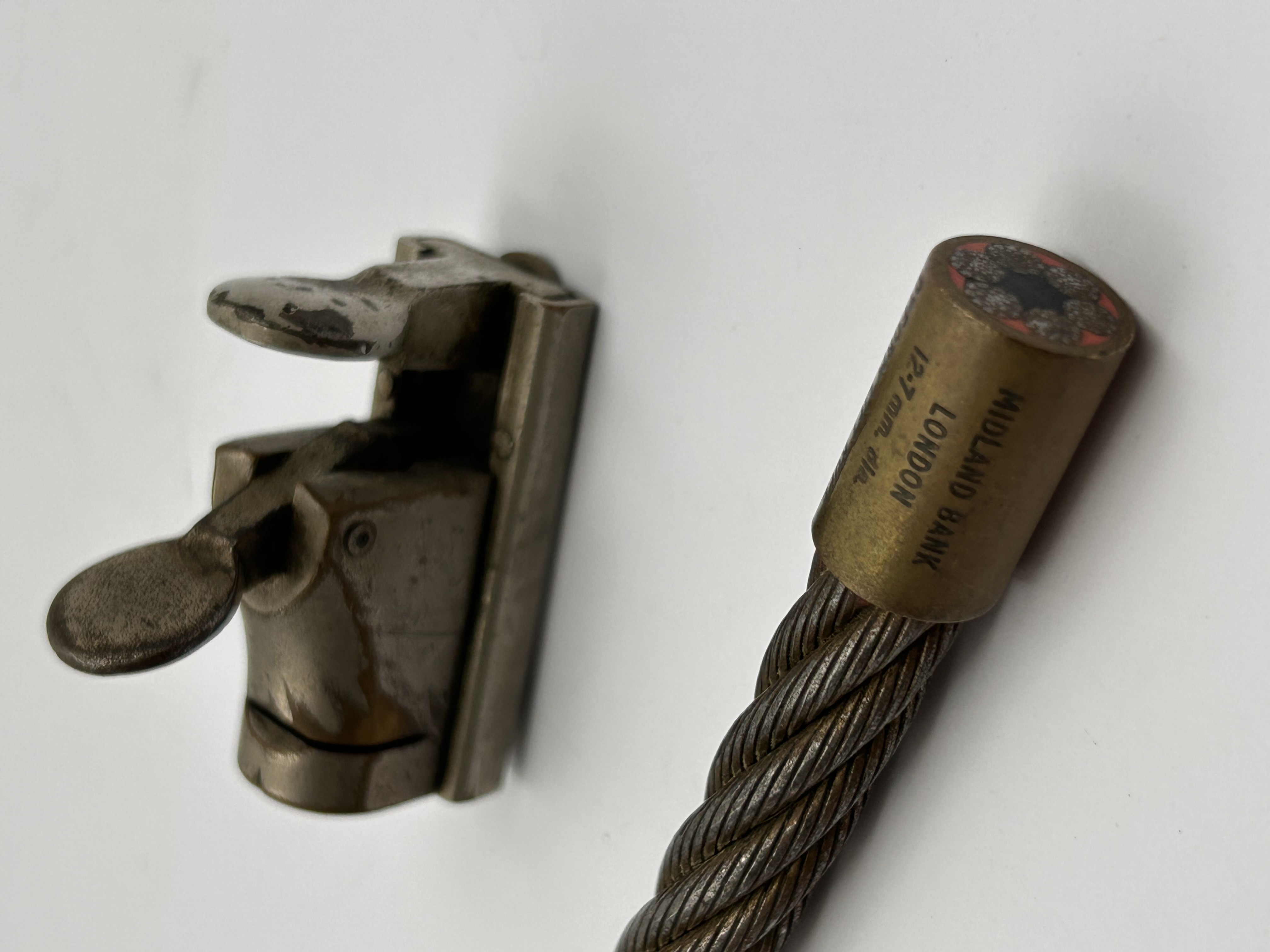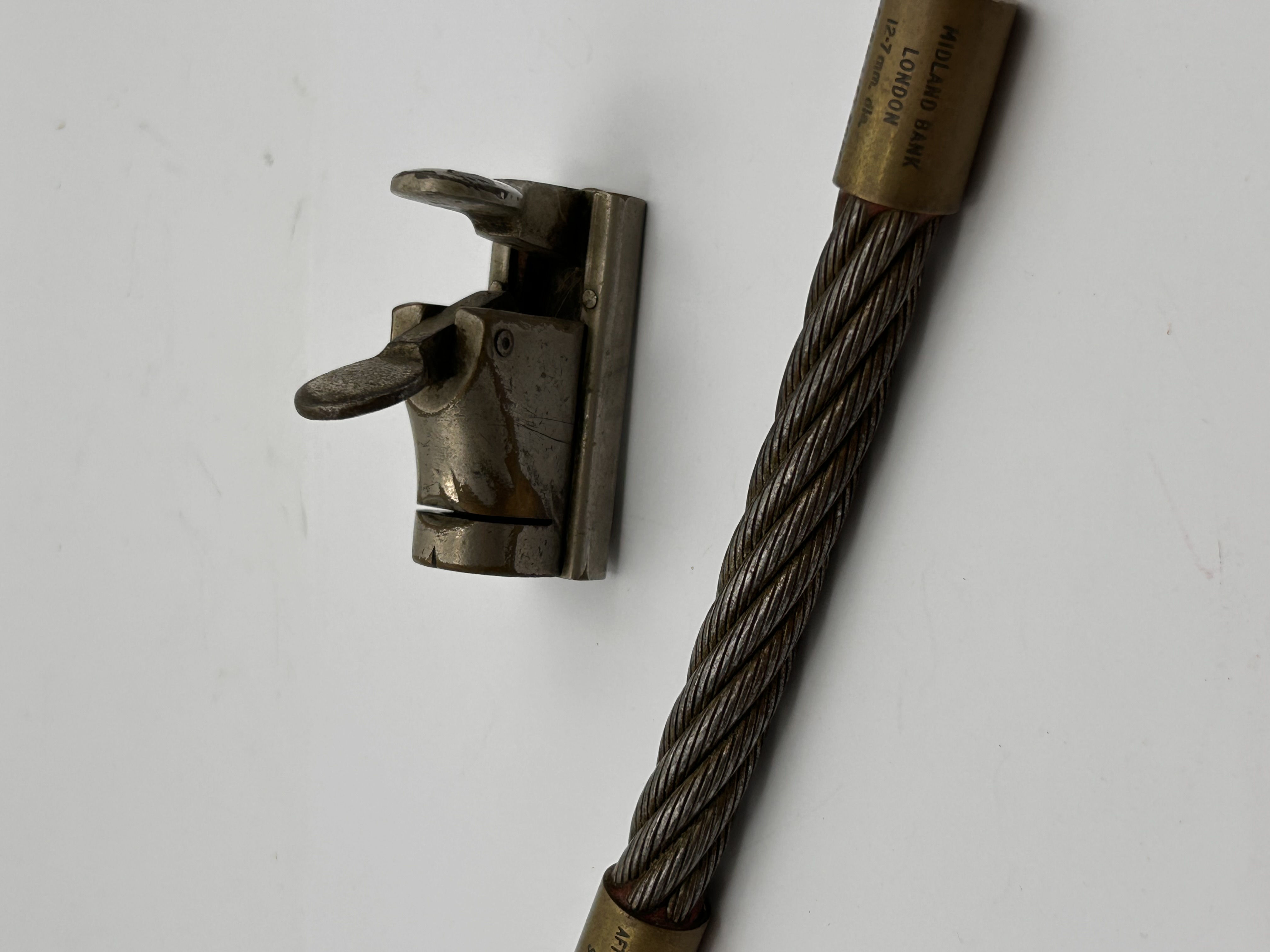The braided steel cable is terminated by a brass-colored ferrule, clearly engraved with “MIDLAND BANK,” “LONDON,” and “12-7 mm. dia.” (12.7 mm diameter). The cable itself appears intact, revealing a multi-strand construction with a reddish central core at its exposed end. These items, likely dating from the mid-to-late 20th century, suggest components for a security or industrial application.