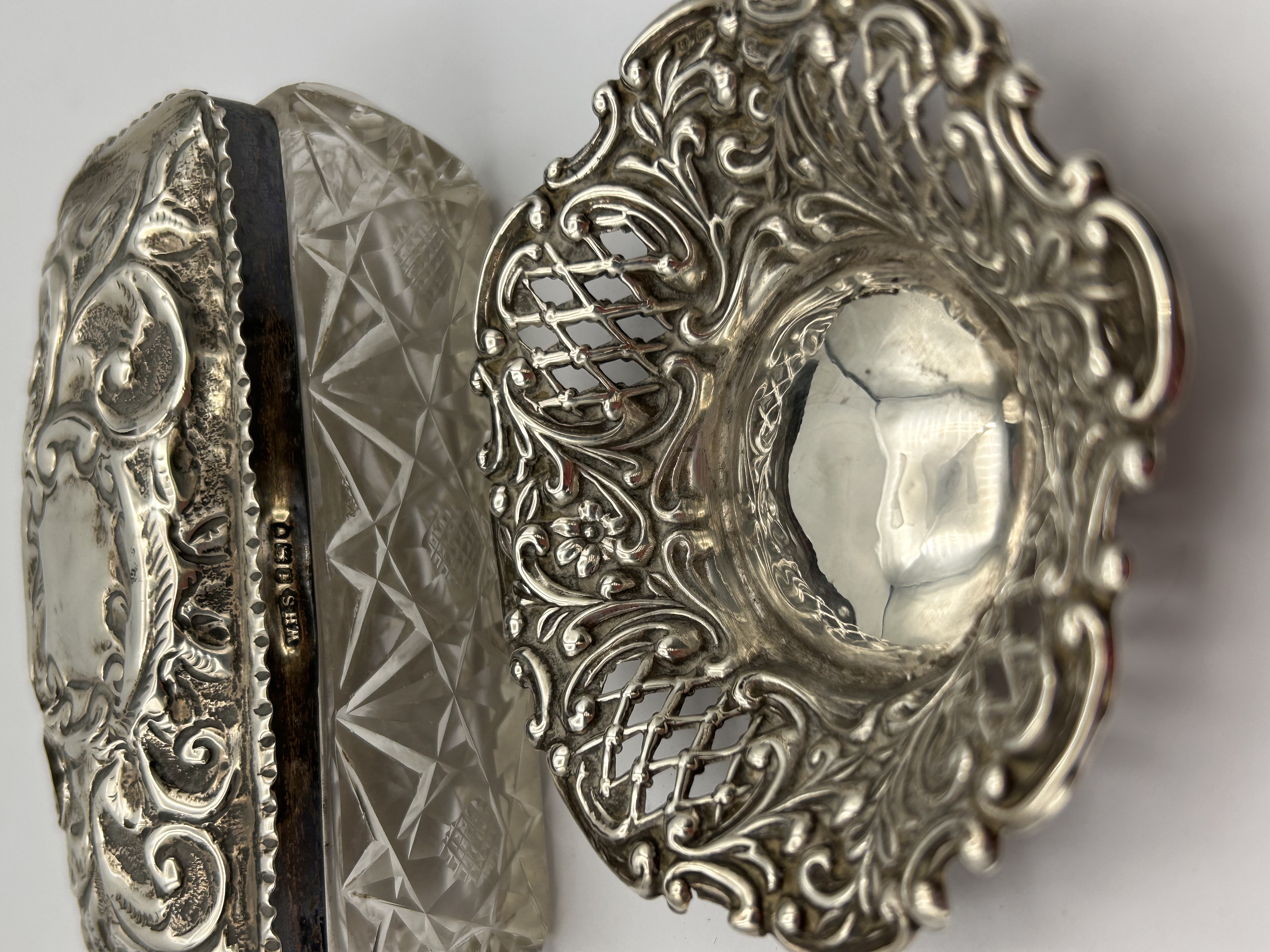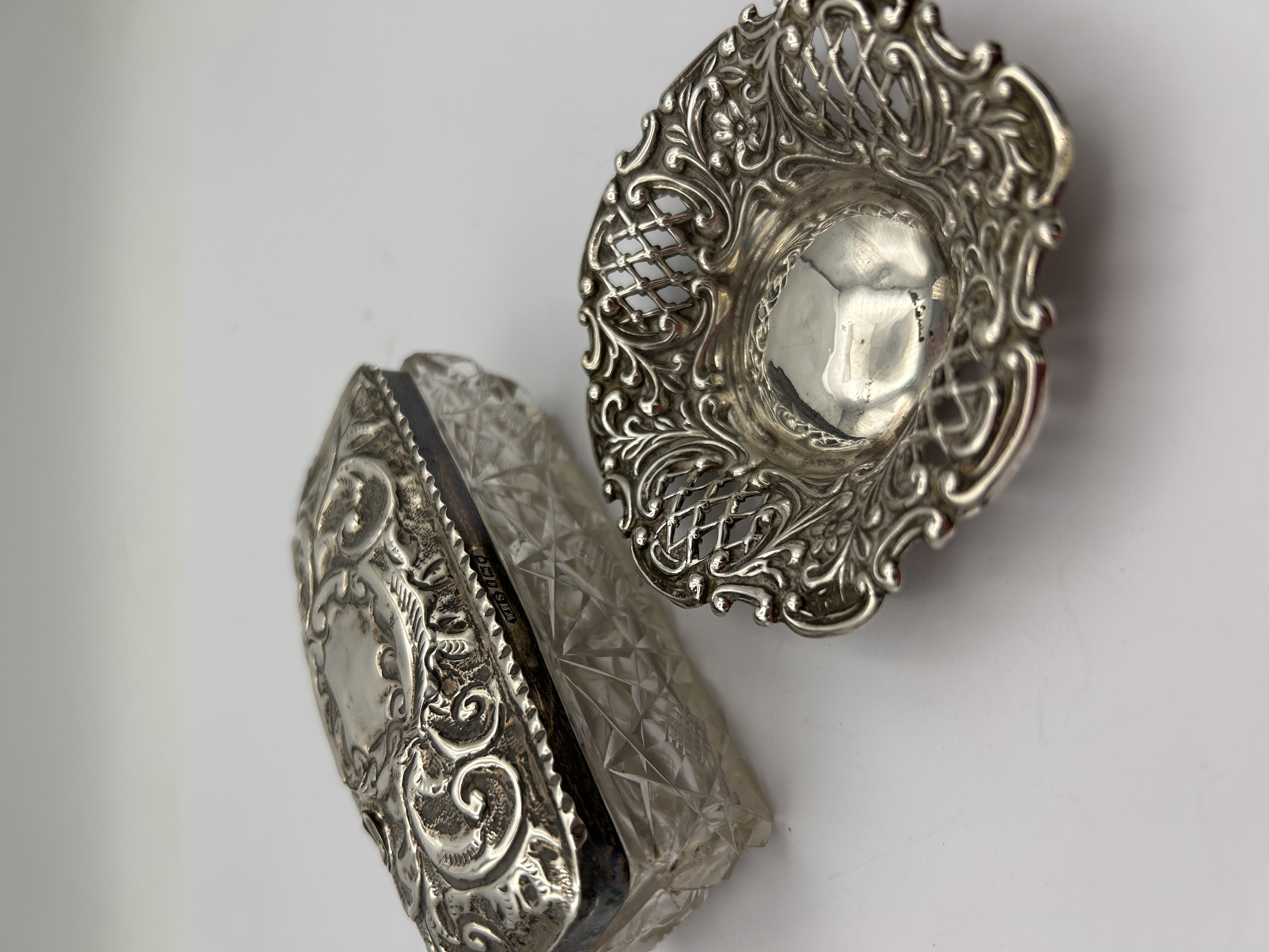 This lot features two ornate items exhibiting a Rococo-revival or similar ornate scrolling style. The first item is a rectangular lidded box with a clear, faceted glass base and a heavily embossed lid. The lid is visibly marked “W.H.S & Co.”. The accompanying item is a small, scalloped dish crafted entirely from a silver-toned metal, featuring a scalloped edge, pierced lattice work, and intricate foliate decoration. No visible markings are present on the dish.