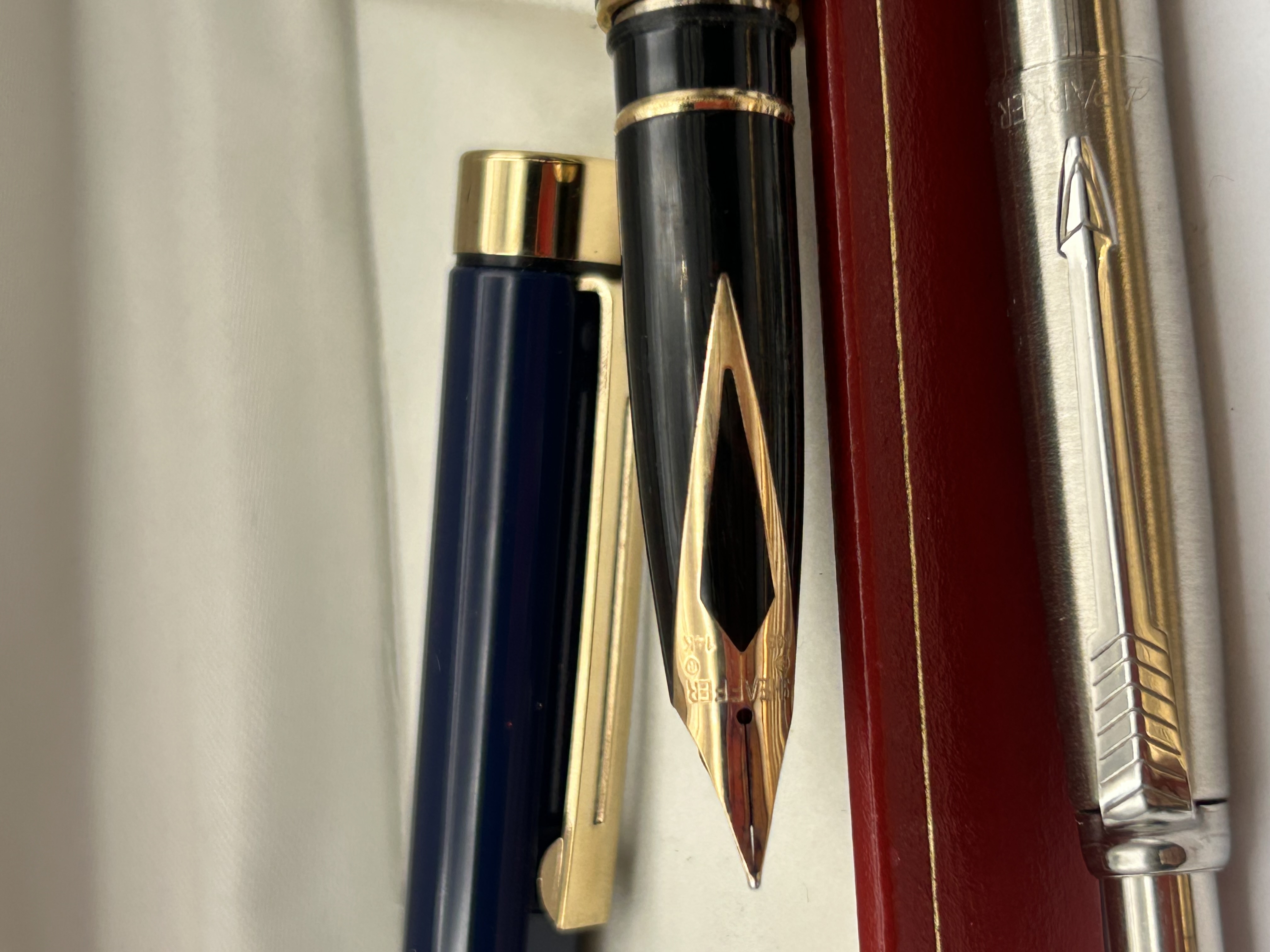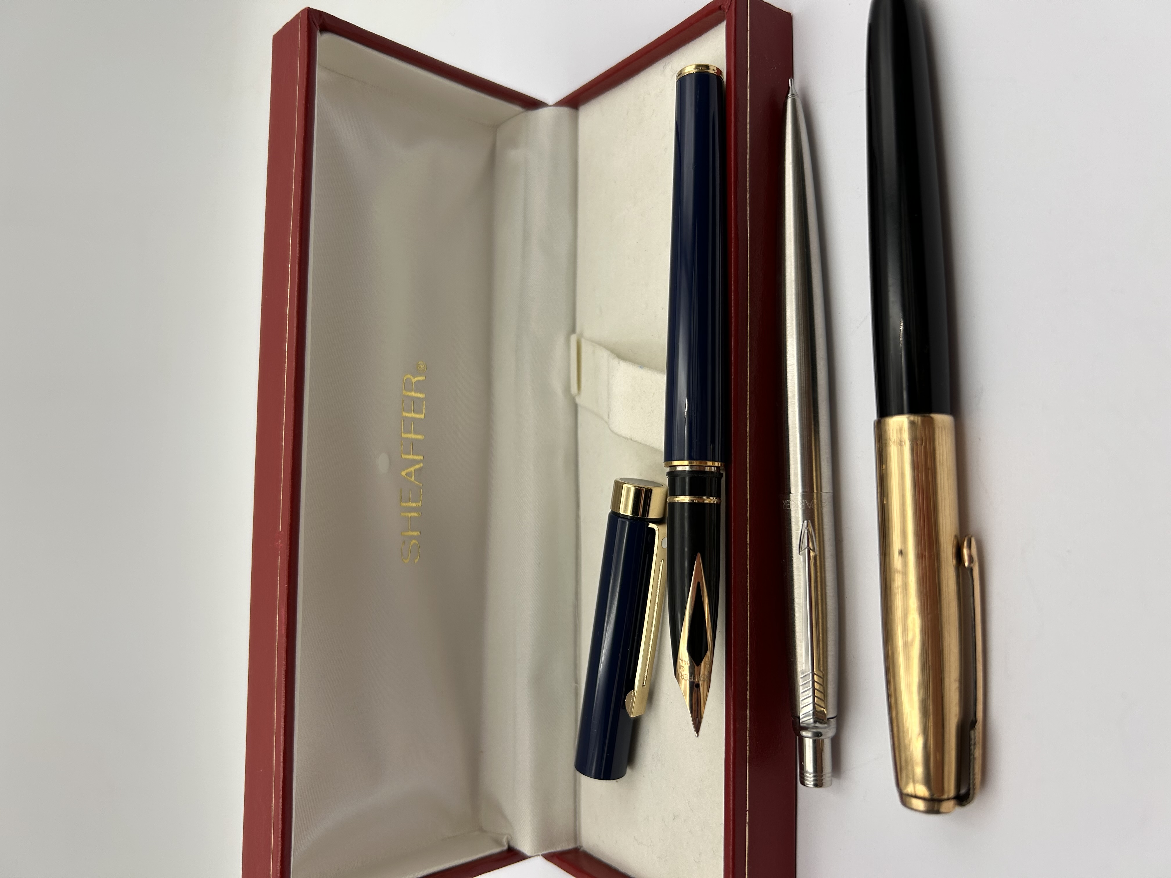 A Sheaffer Targa Lacquer Hermes Blue fountain pen with gold-colored trim and an inlaid 14 carat gold-tone nib, marked “SHEAFFER” on the nib. This pen is presented in its original red, satin-lined box, embossed with “SHEAFFER” in gold. Accompanying this are two additional writing instruments: a silver-toned Parker pen with a patterned barrel and gold-colored clip bearing the “PARKER” brand name and iconic arrow, and a black-barreled pen with a gold-colored cap and trim.