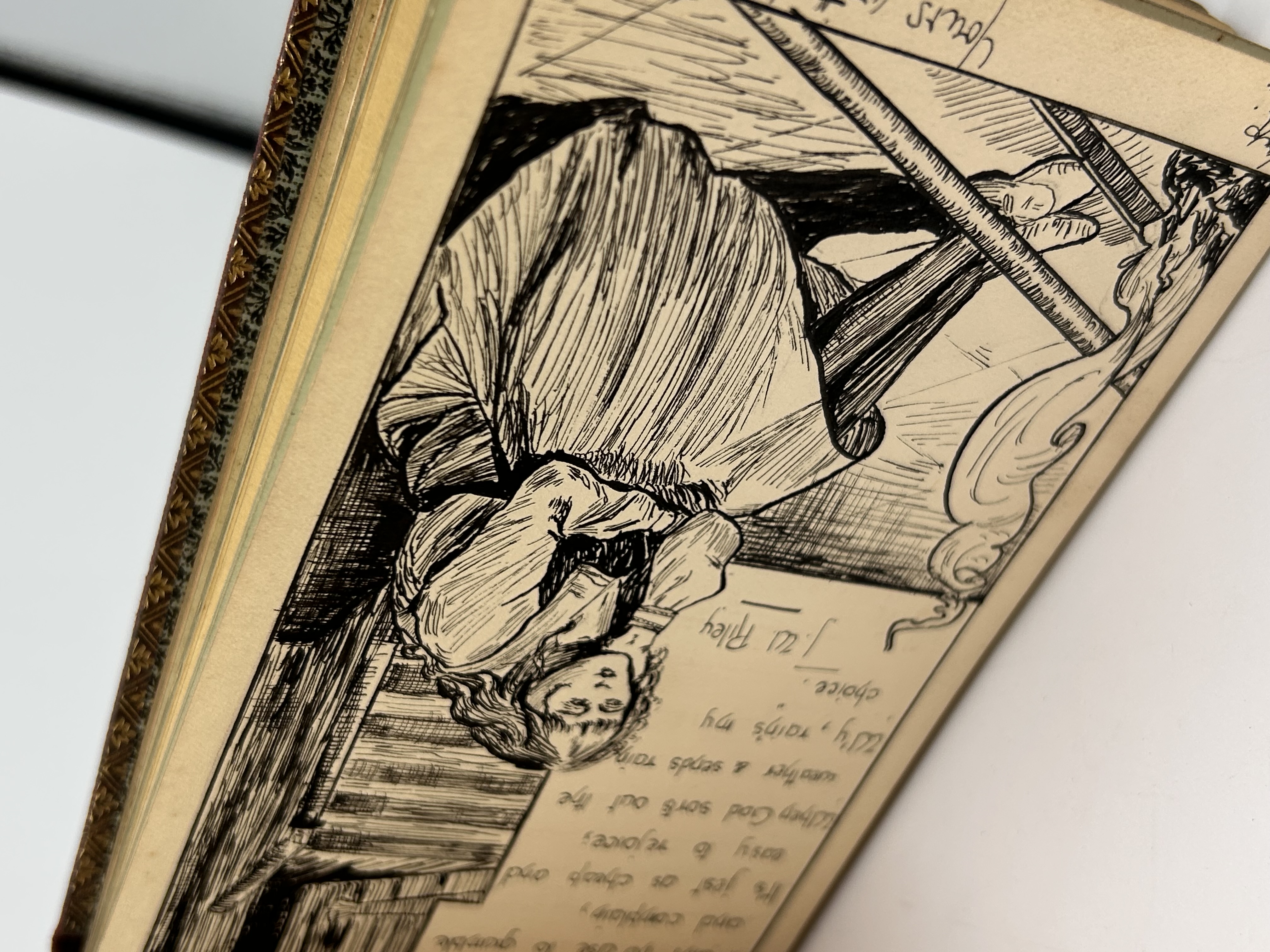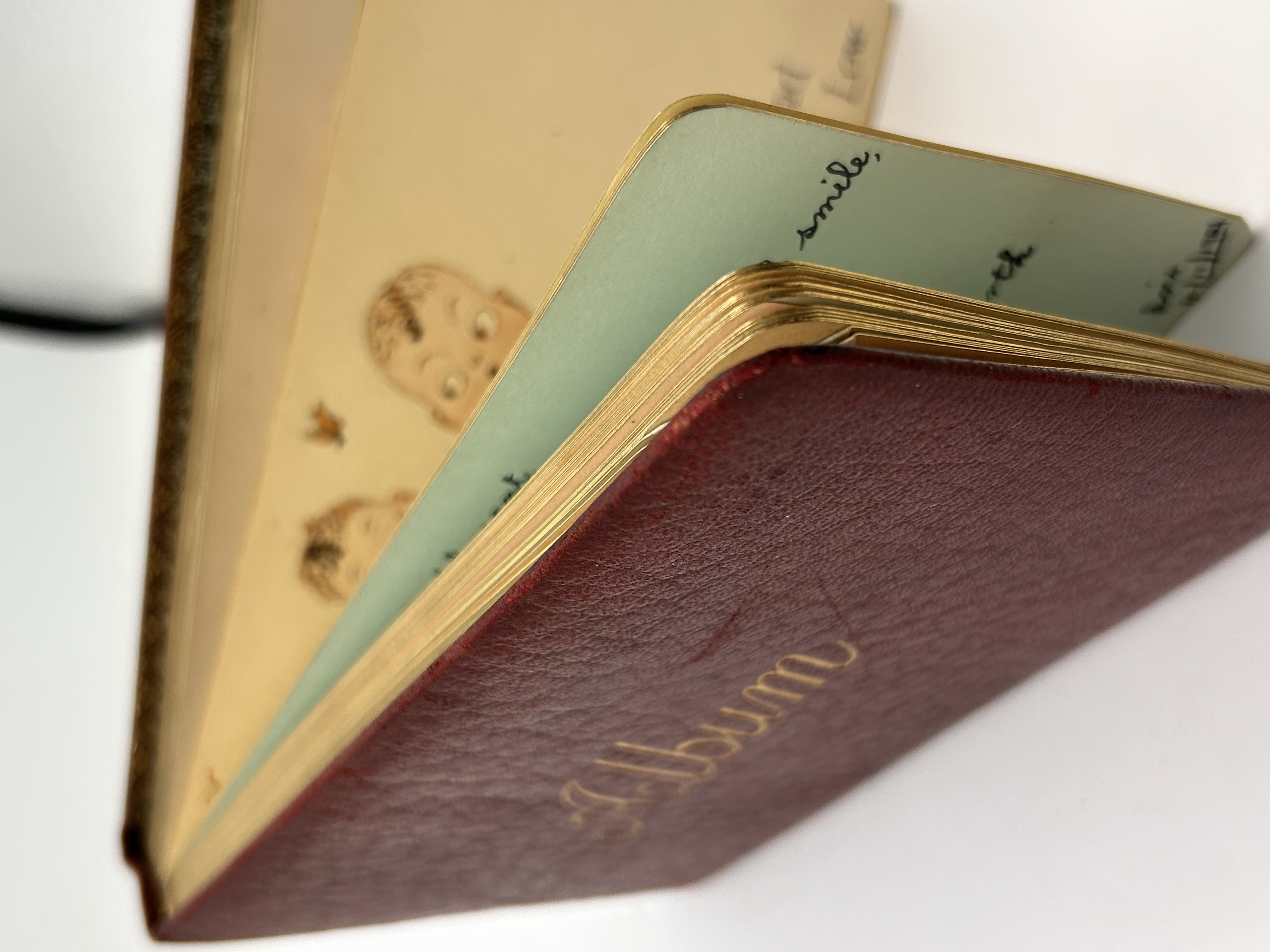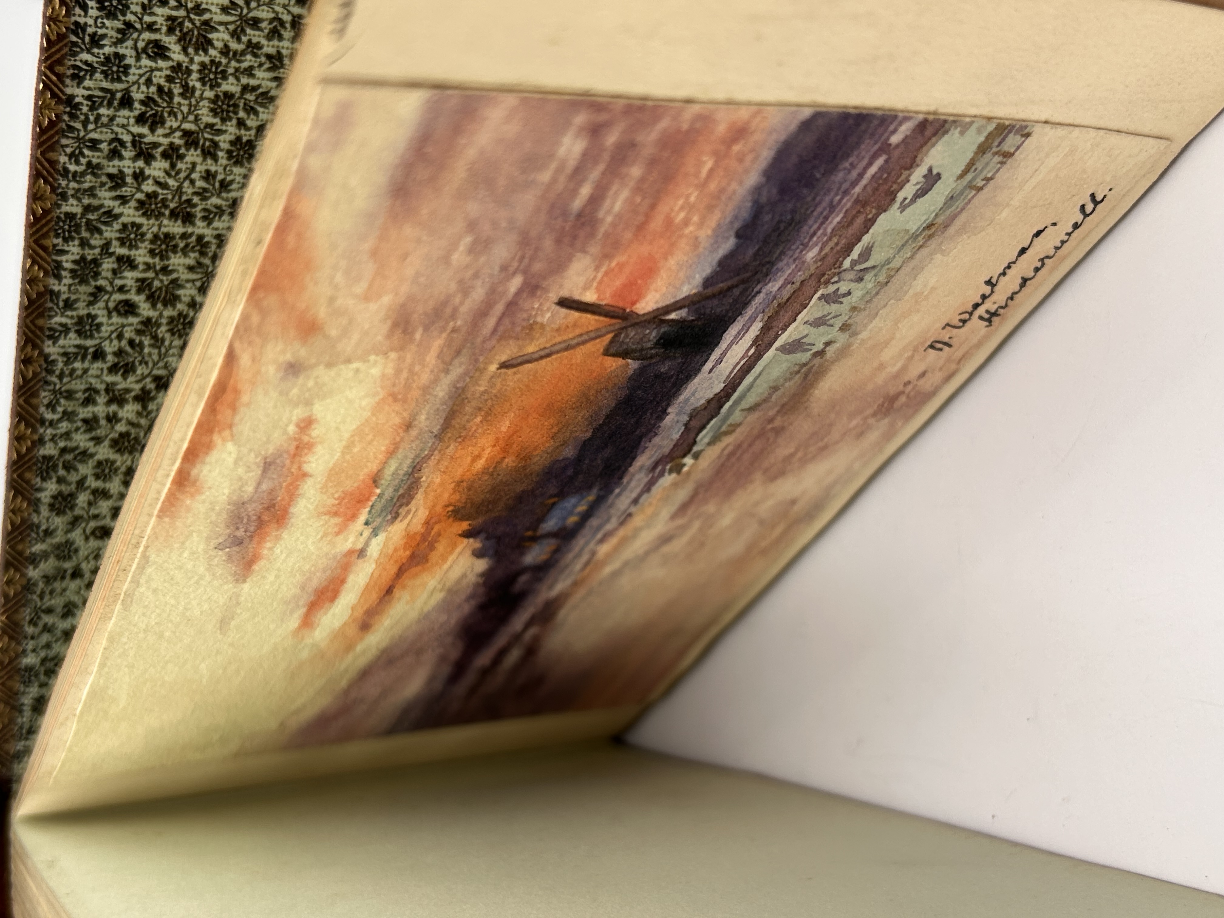 An antique or vintage album, bound in a red textured cover, likely leather or faux leather, with “Album” embossed in gold script on the front. The interior features thick pages, some with gilded edges, varying in color including cream and light green. Contents include illustrations in a late 19th to early 20th-century style, such as cartoon baby faces. A detailed black-and-white drawing of a sleeping figure is present, signed “J. W. Riley.” Handwritten text includes an excerpt of poetry with visible lines: “…to grumble and complain. It’s just as cheap and easy to rejoice, when God says out the weather & sends you. Why, rain’s my choice.” Another page features a watercolor landscape depicting a windmill at sunset or sunrise, signed “J. Westman, Hinderwell.”