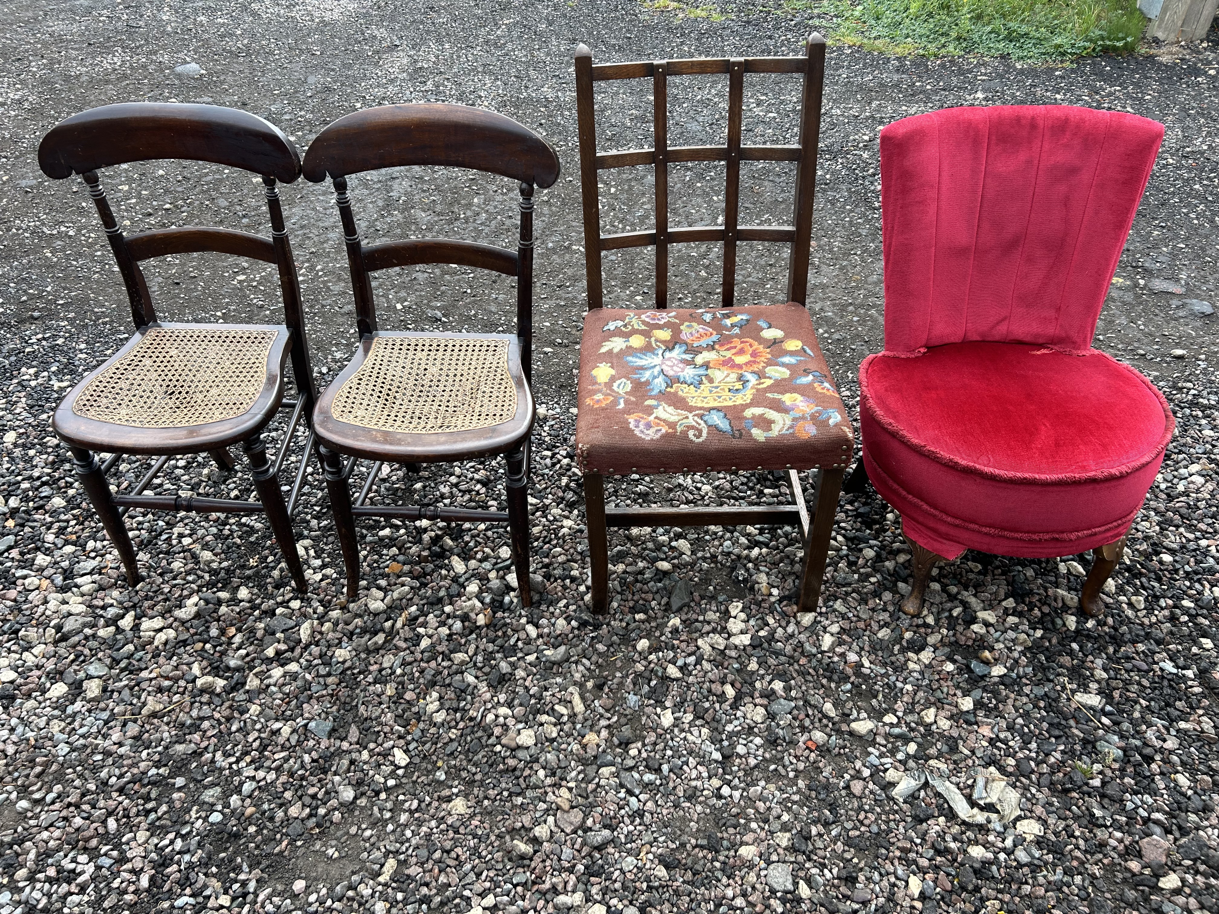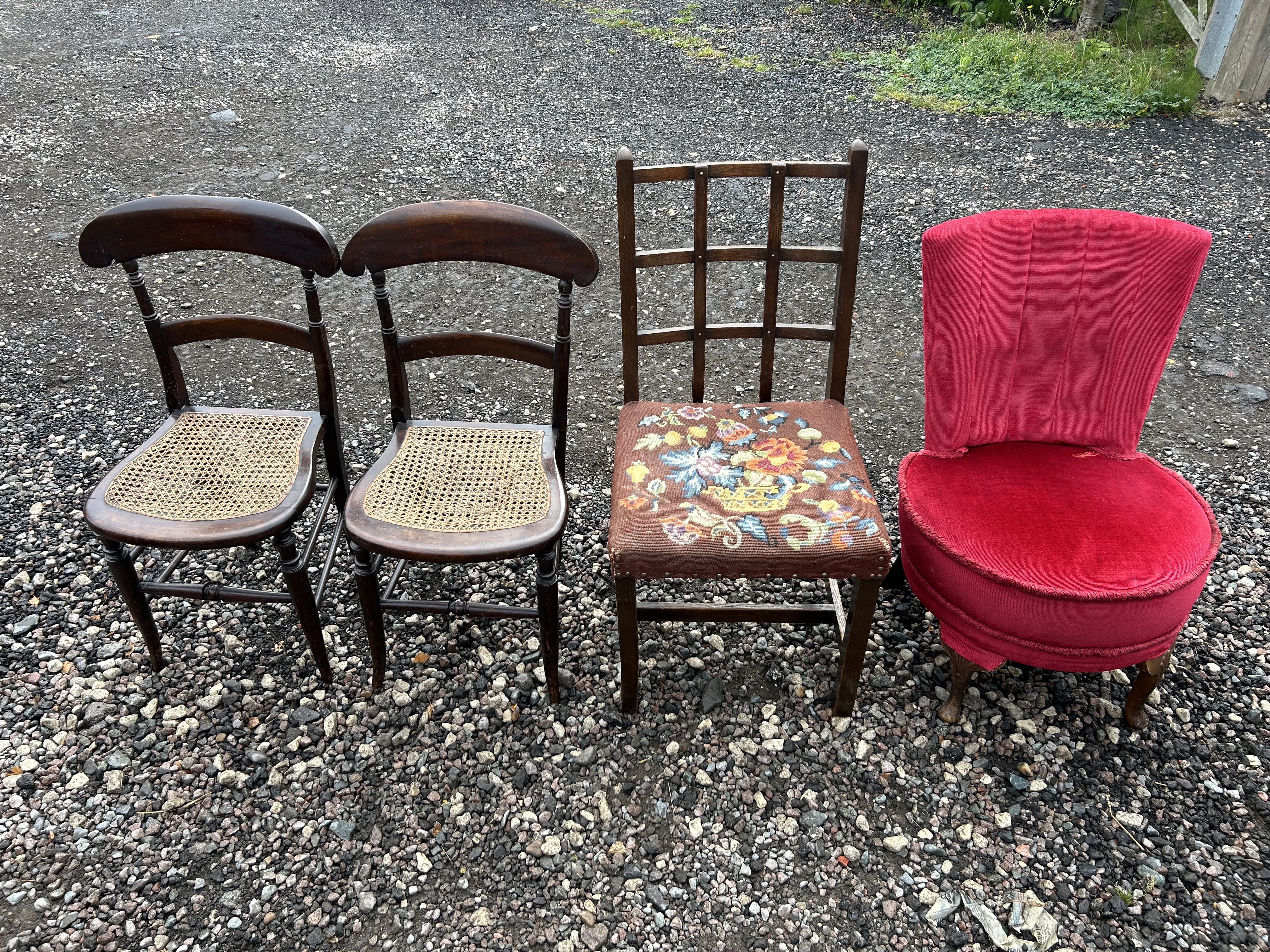 This lot comprises four assorted chairs. The two leftmost are a near-matching pair of late 19th to early 20th-century dark-stained wood dining chairs, consistent with Aesthetic Movement or Victorian styles, featuring spoon-back crest rails and intact caned seats. The third chair is a dark-stained wood side chair, possibly oak, with a simple grid back and an upholstered seat displaying a floral needlepoint or tapestry design on a brown ground. The final item on the right is a low-back fully upholstered armchair or slipper chair, likely mid-20th century, covered in a vibrant red velvet-like fabric with a button-tufted back.