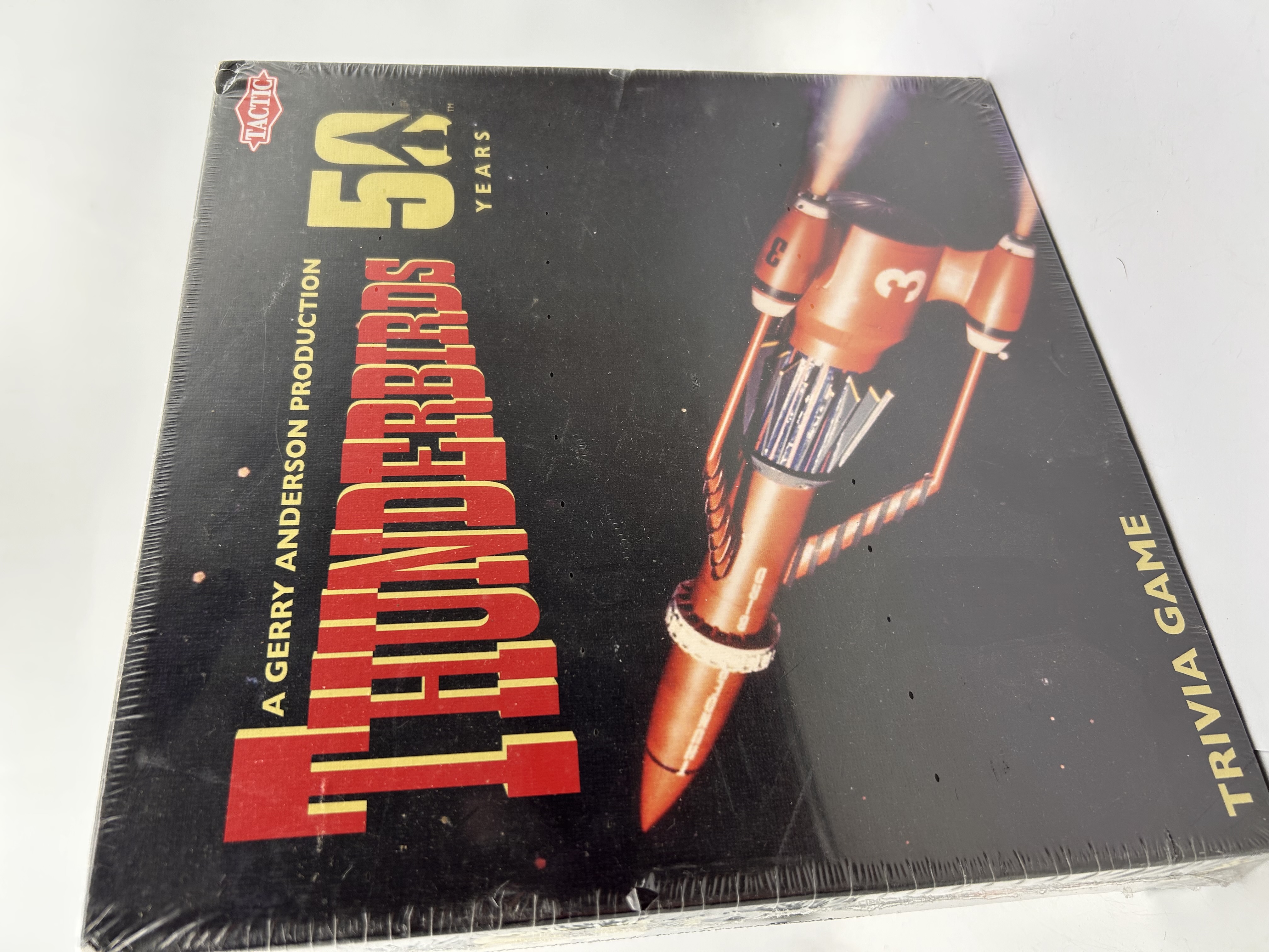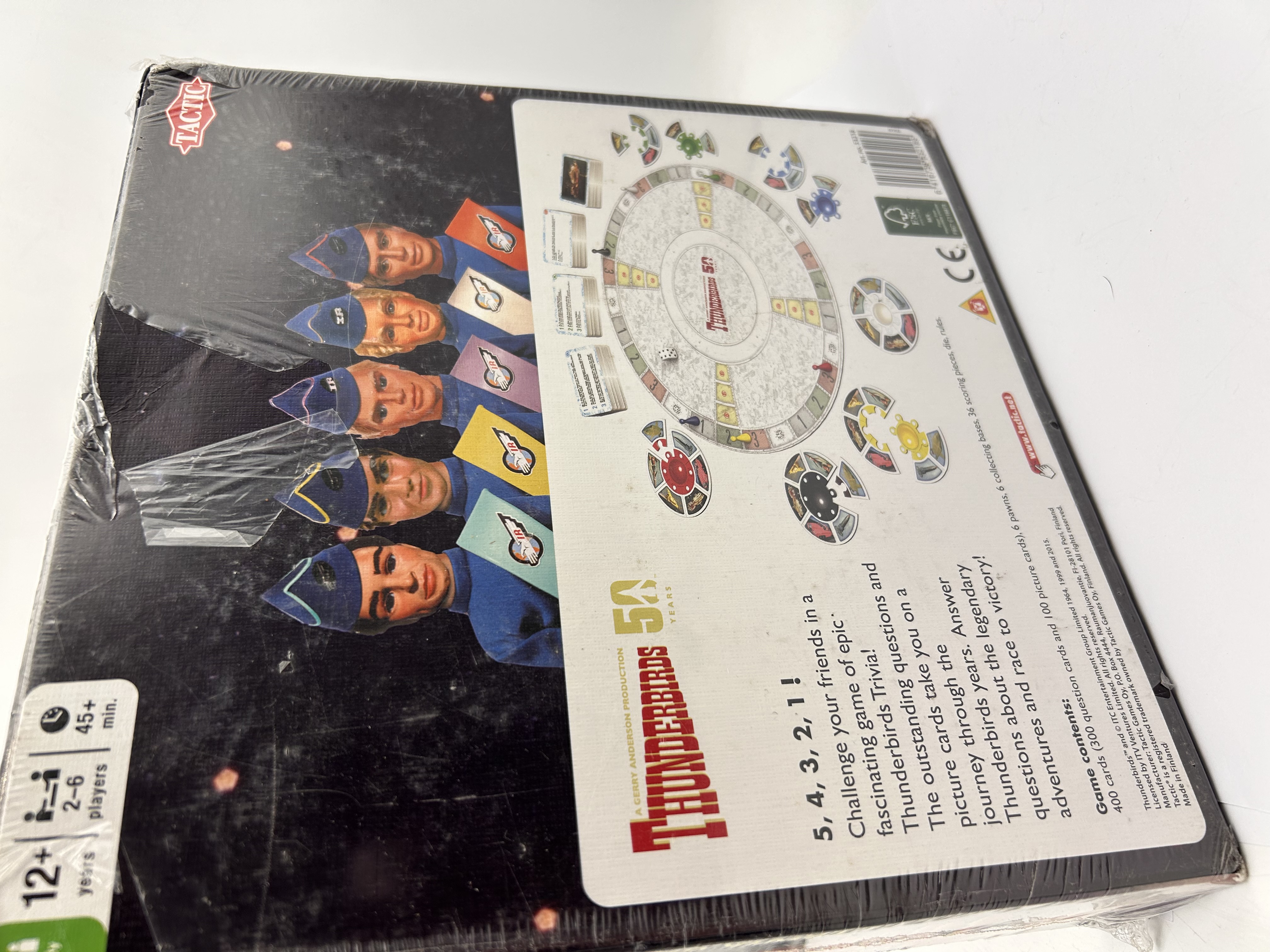 A Tactic Games ‘Thunderbirds 50 Year Anniversary Trivia Game,’ produced as ‘A Gerry Anderson Production.’ This boxed board game commemorates the show’s 50th anniversary, with copyright dates including 1964, 1999, and 2015, suggesting a 2015 release. The front of the box features a stylized image of Thunderbird 3, while the reverse displays the main characters, game board, and various components. The game is designed for 2-6 players aged 12+ years, with an estimated play time of 45+ minutes. The contents include 400 cards (comprising 300 question cards and 100 picture cards), 6 pawns, 6 collecting boxes, 36 scoring pieces, a die, and rules.