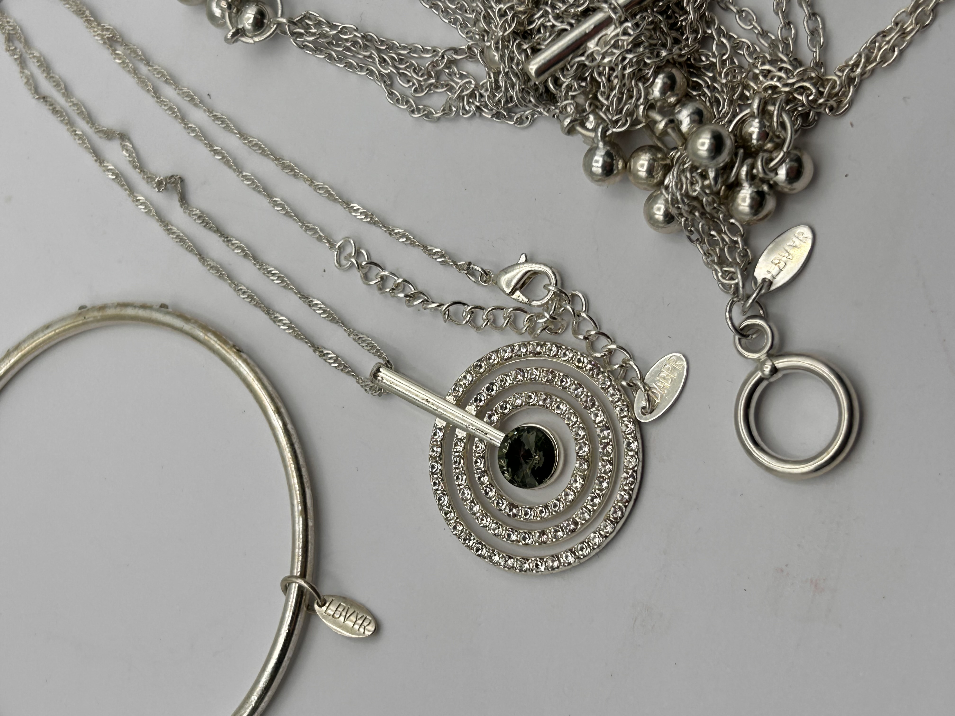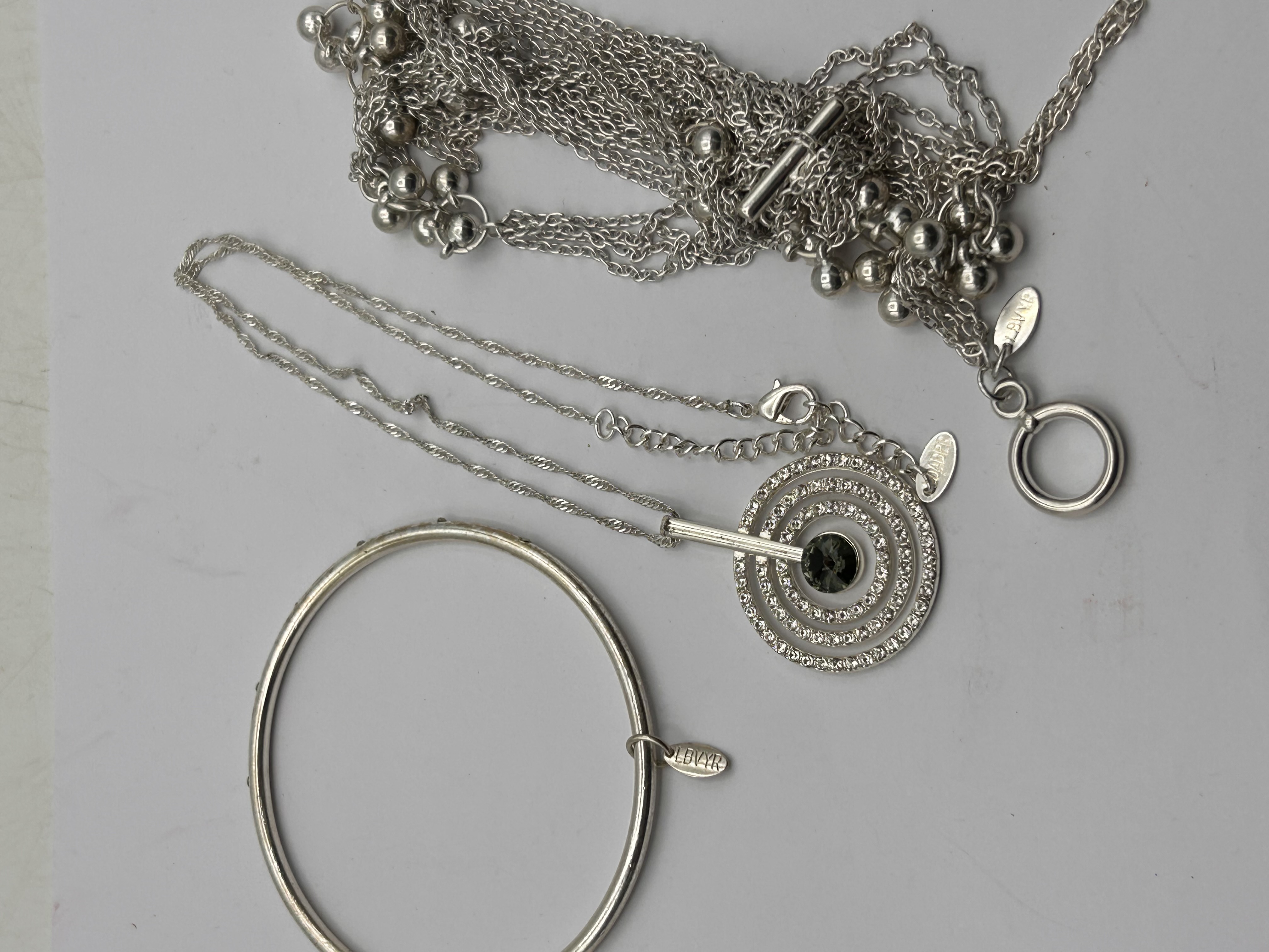This lot comprises three pieces of silver-tone costume jewelry by AVON. It includes a plain rigid bangle bracelet and two necklaces. The first necklace features a twisted link chain with a circular pendant detailed with concentric rings of small clear imitation stones surrounding a central dark, possibly faceted, imitation stone. The second necklace is a multi-strand design incorporating various chain types and spherical beads, fastened with a toggle clasp. All three items feature small oval tags bearing the text “AVON.” The components appear to be silver-tone metal with imitation stones.