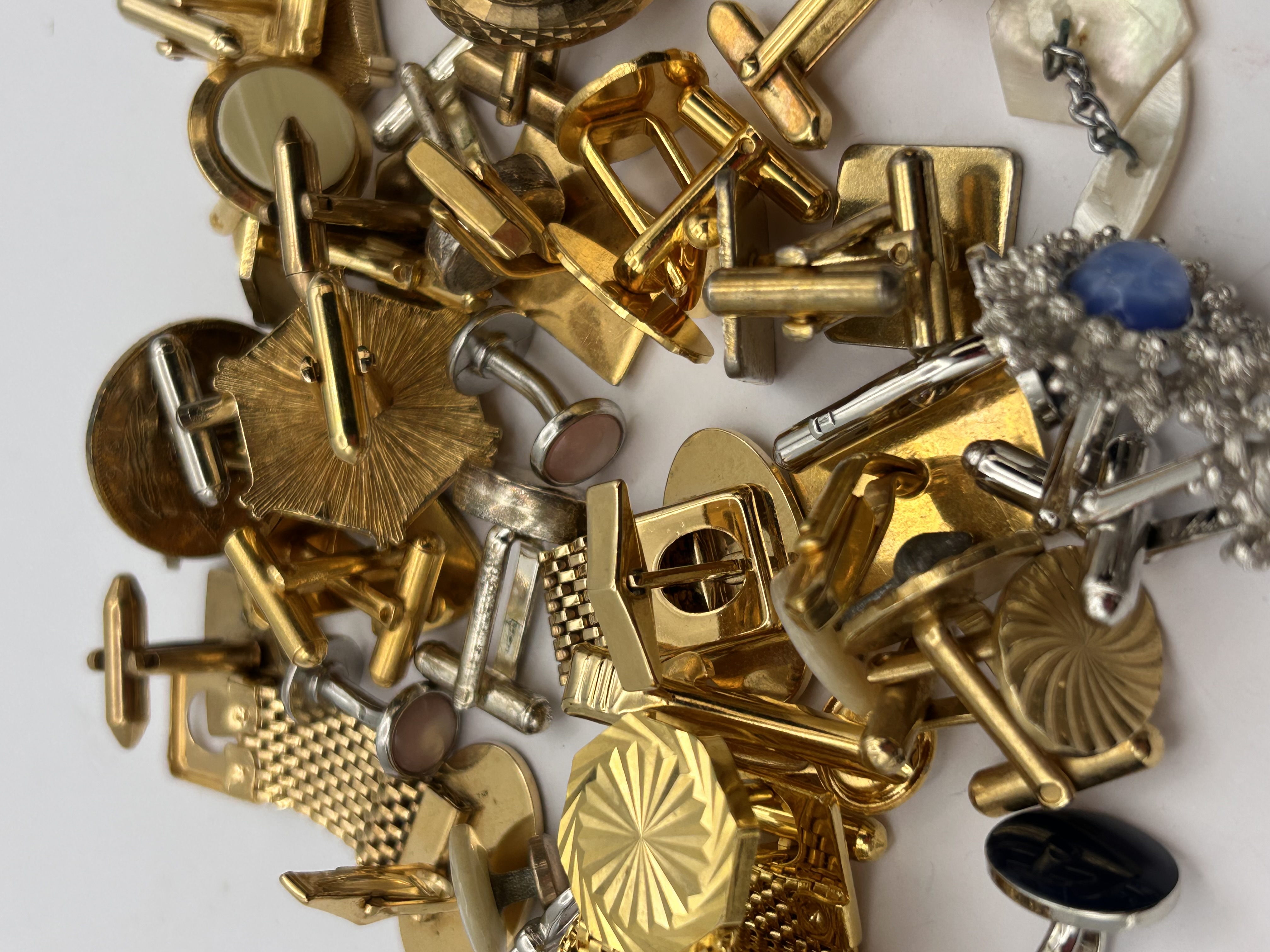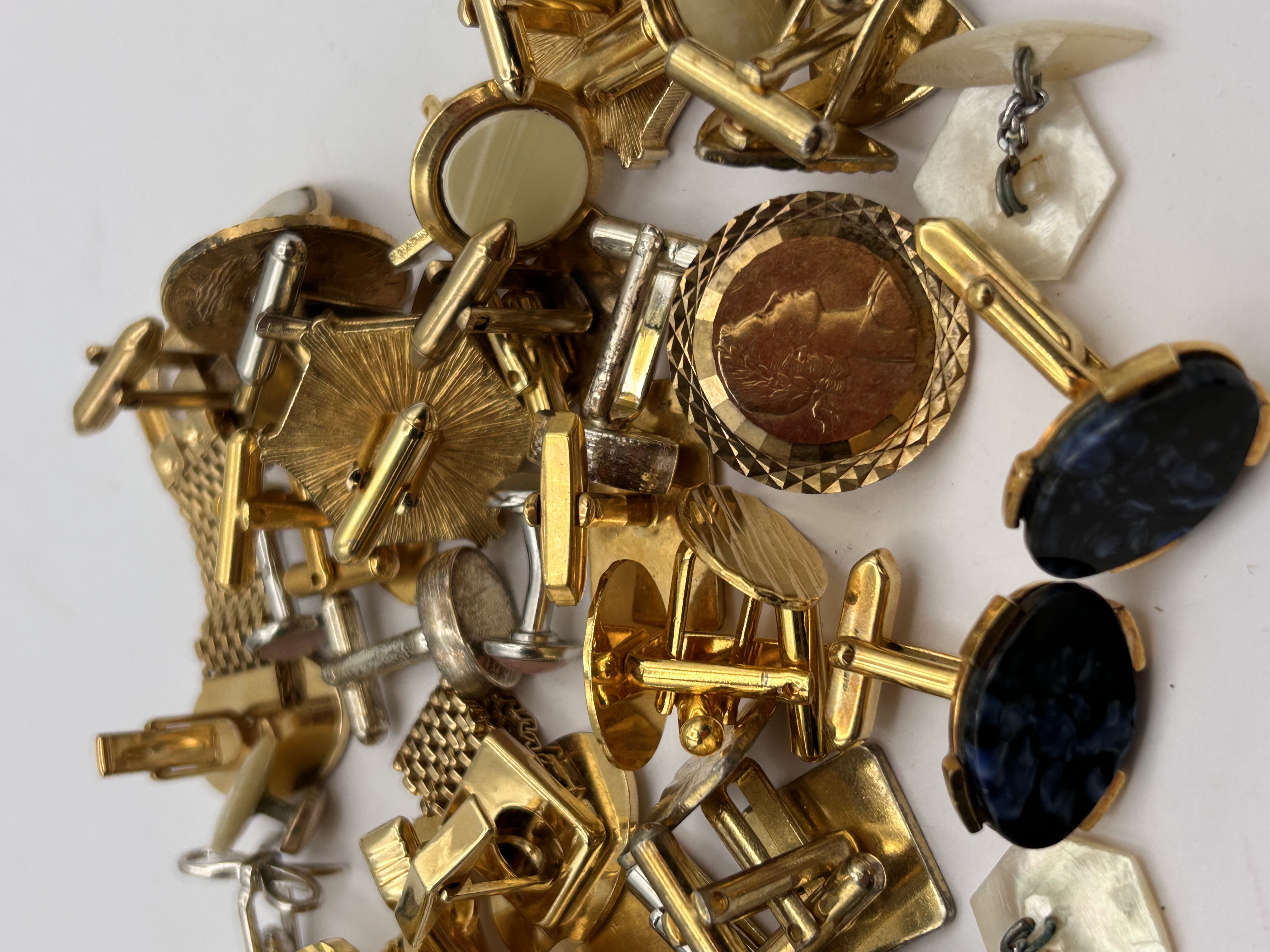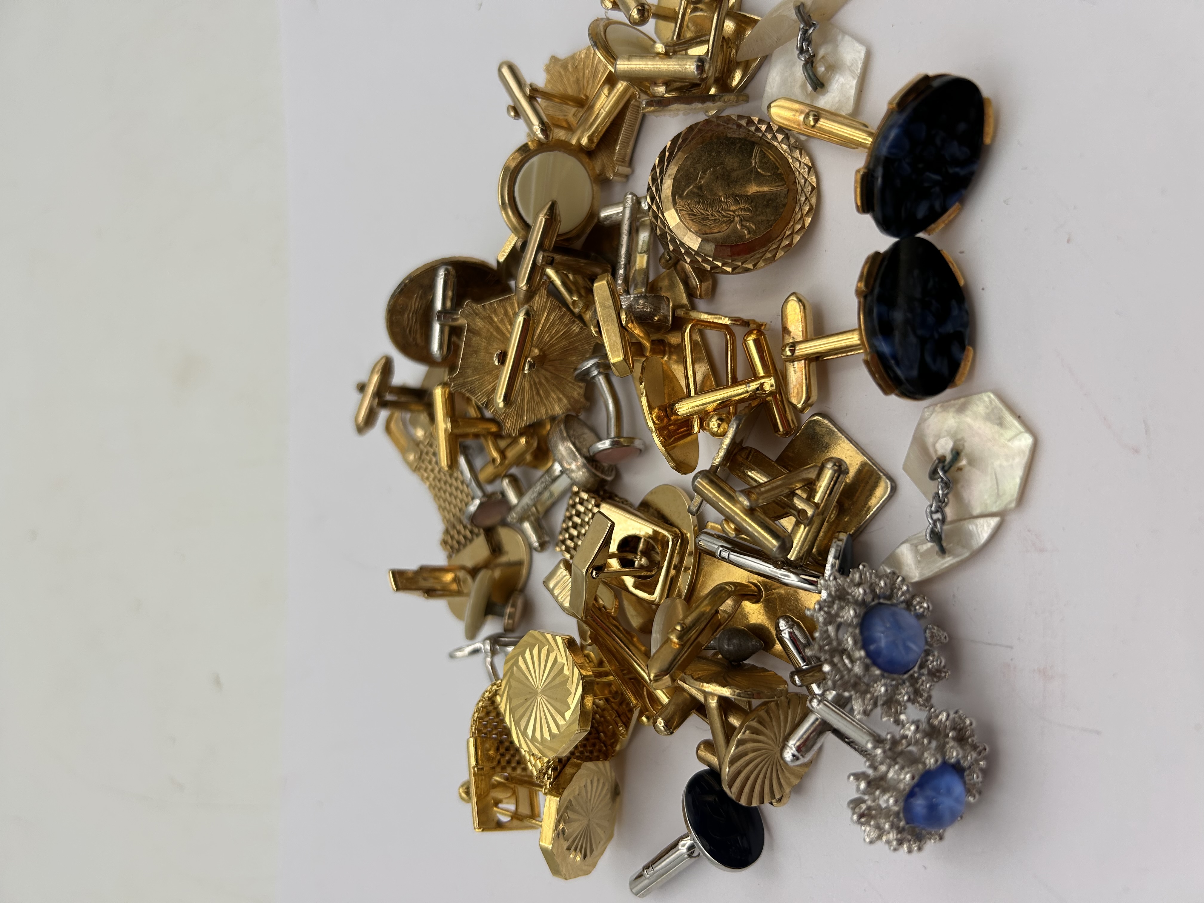 A diverse collection of approximately 50-60 individual and paired cufflinks, primarily dating from the mid-to-late 20th century. The cufflinks are predominantly crafted from gold-toned and silver-toned base metals, many featuring decorative inlays and accents such as polished mother-of-pearl, blue cabochon-style stones, dark blue/black polished stones, and textured finishes including mesh, sunburst, and geometric patterns. One prominent gold-toned example features a profile depiction, possibly of a classical figure or monarch, set within a faceted border. No legible text or manufacturer’s marks are visible.