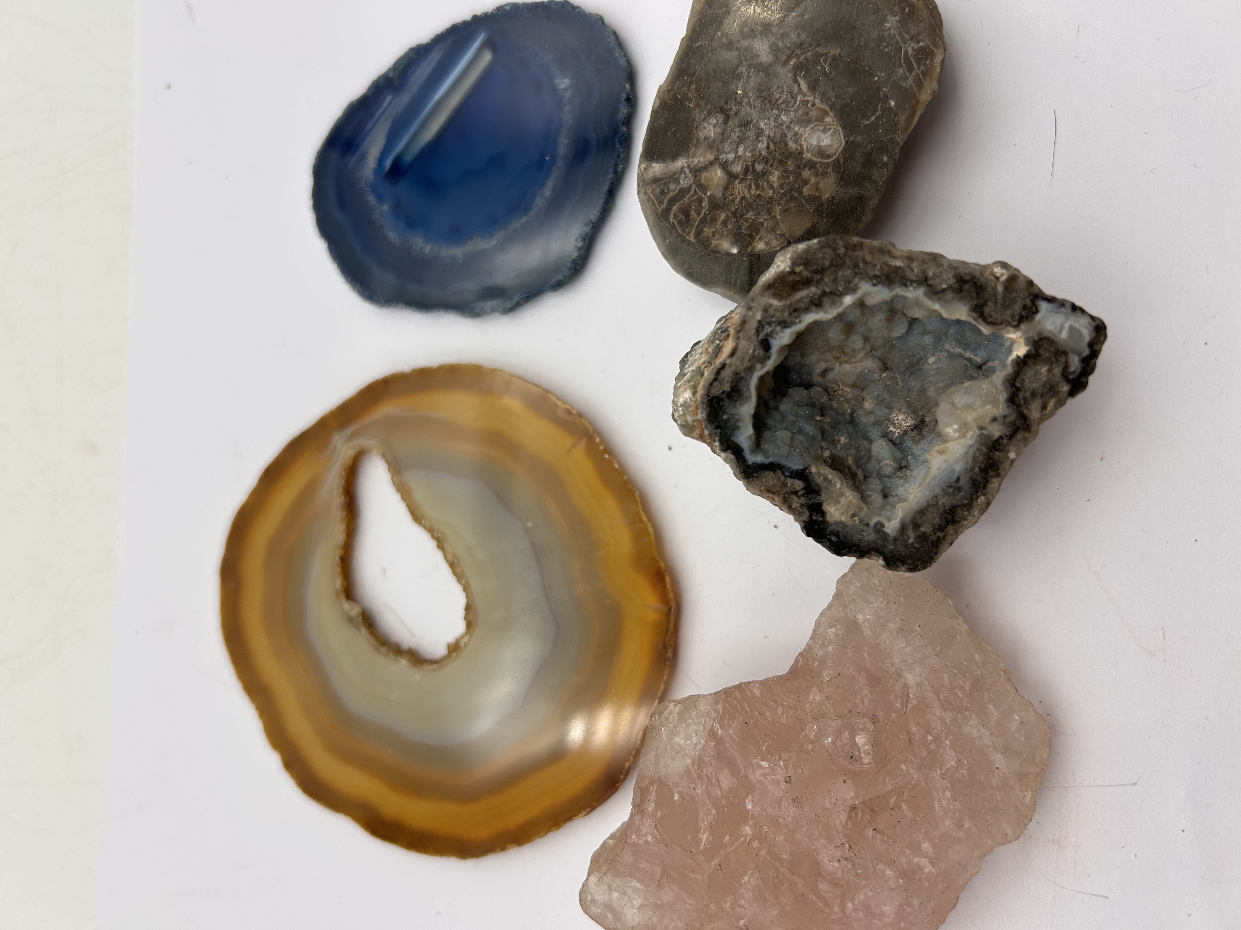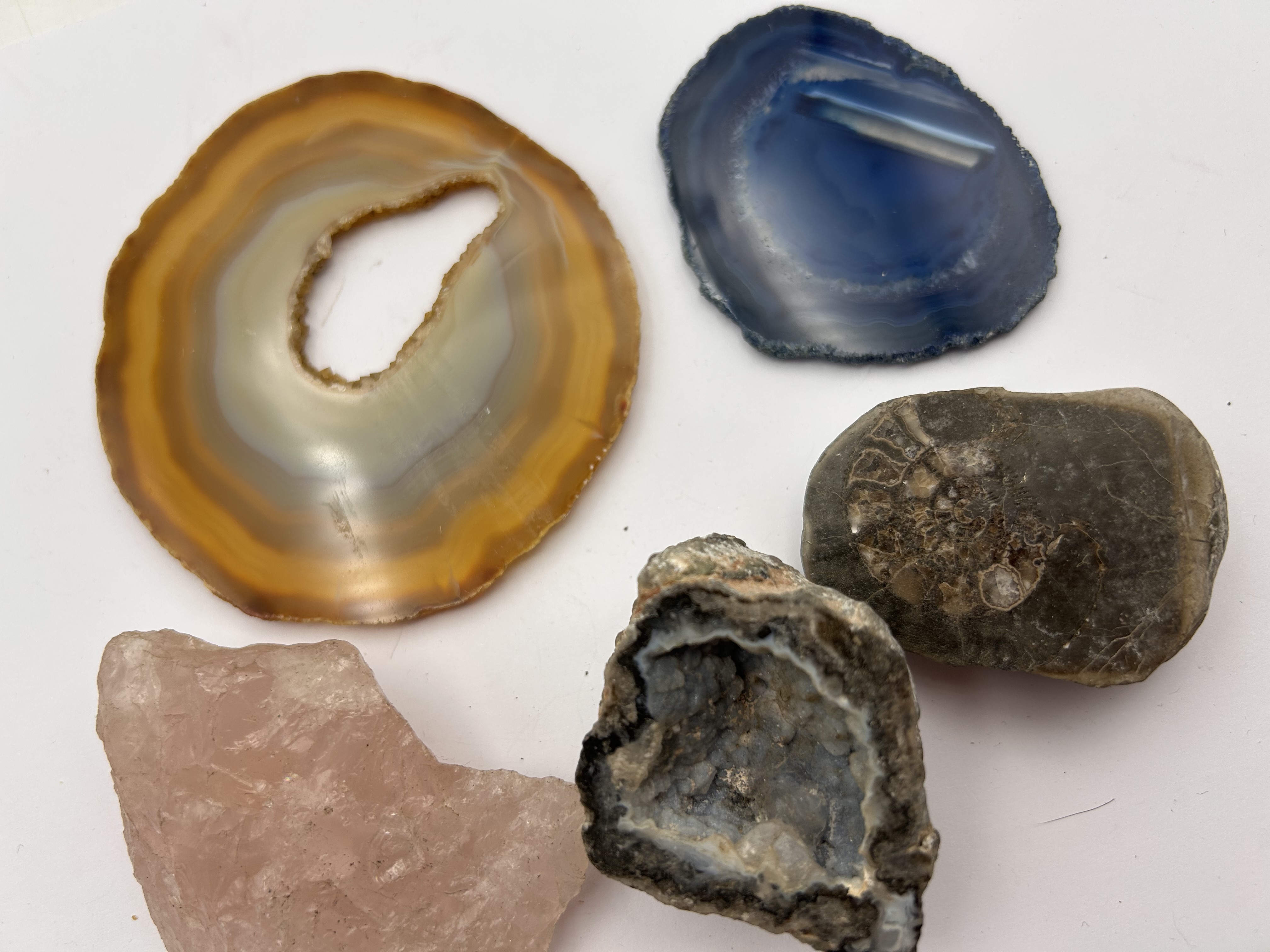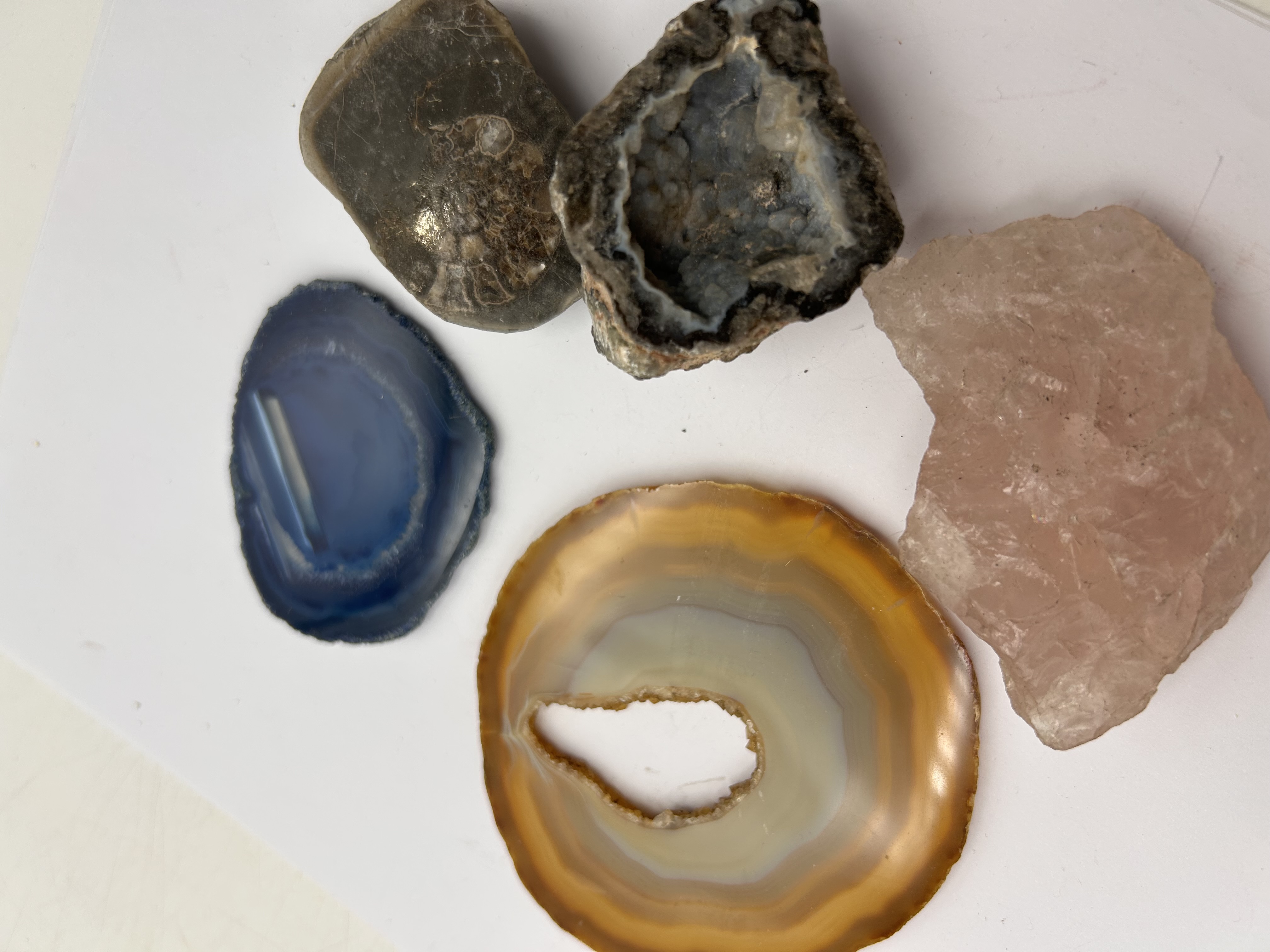 A collection of five assorted mineral specimens, primarily consisting of quartz varieties. The lot includes a large, polished, roughly circular agate slice displaying natural concentric banding in shades of yellow, orange, and white, with an unpolished central cavity. Also present is a smaller, oval, polished agate slice, dyed blue with visible banding. A significant, irregularly shaped chunk of translucent pink mineral, consistent with raw rose quartz, is included. The collection further features a naturally fractured geode fragment, exhibiting a dark exterior rind and an interior lined with greyish-white crystalline formations, alongside a smooth, dark grey-brown rounded stone.