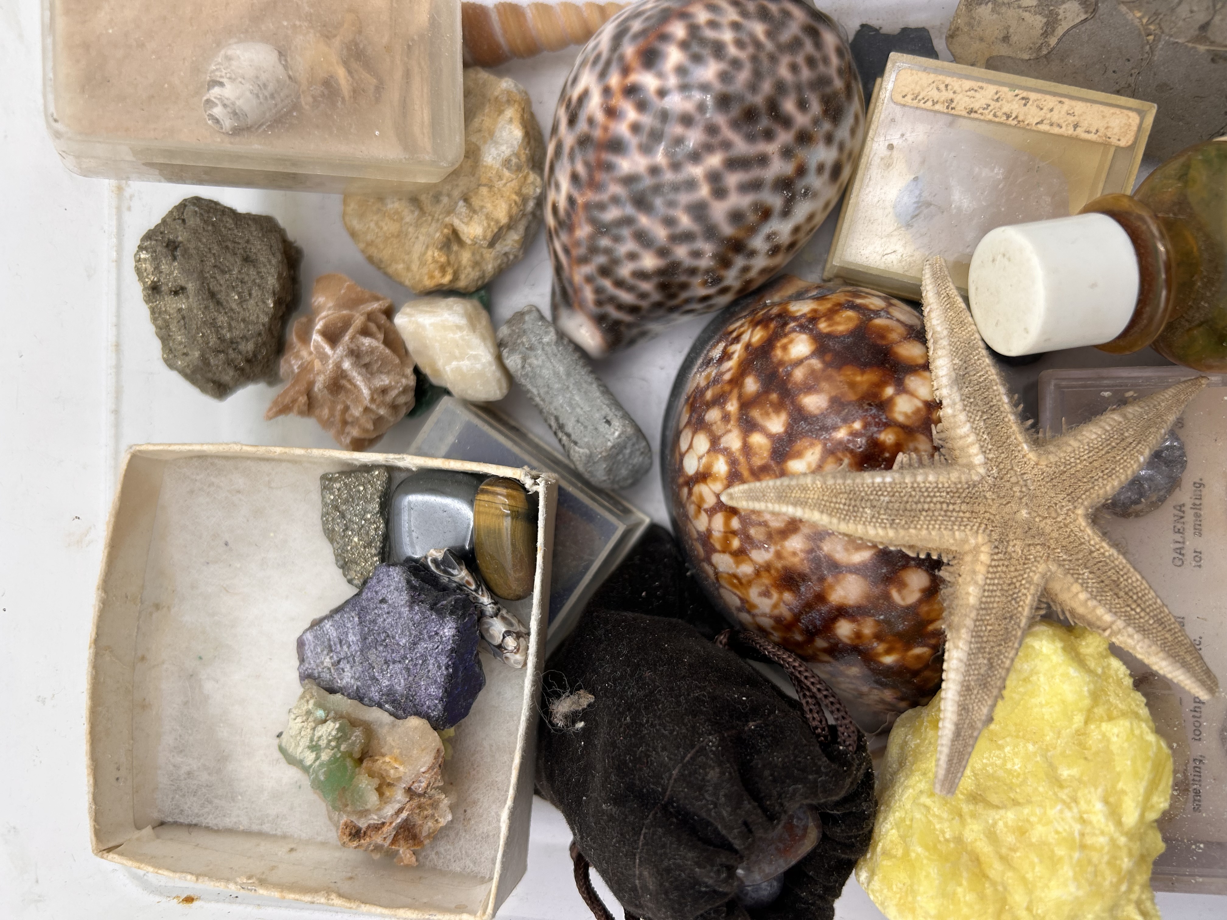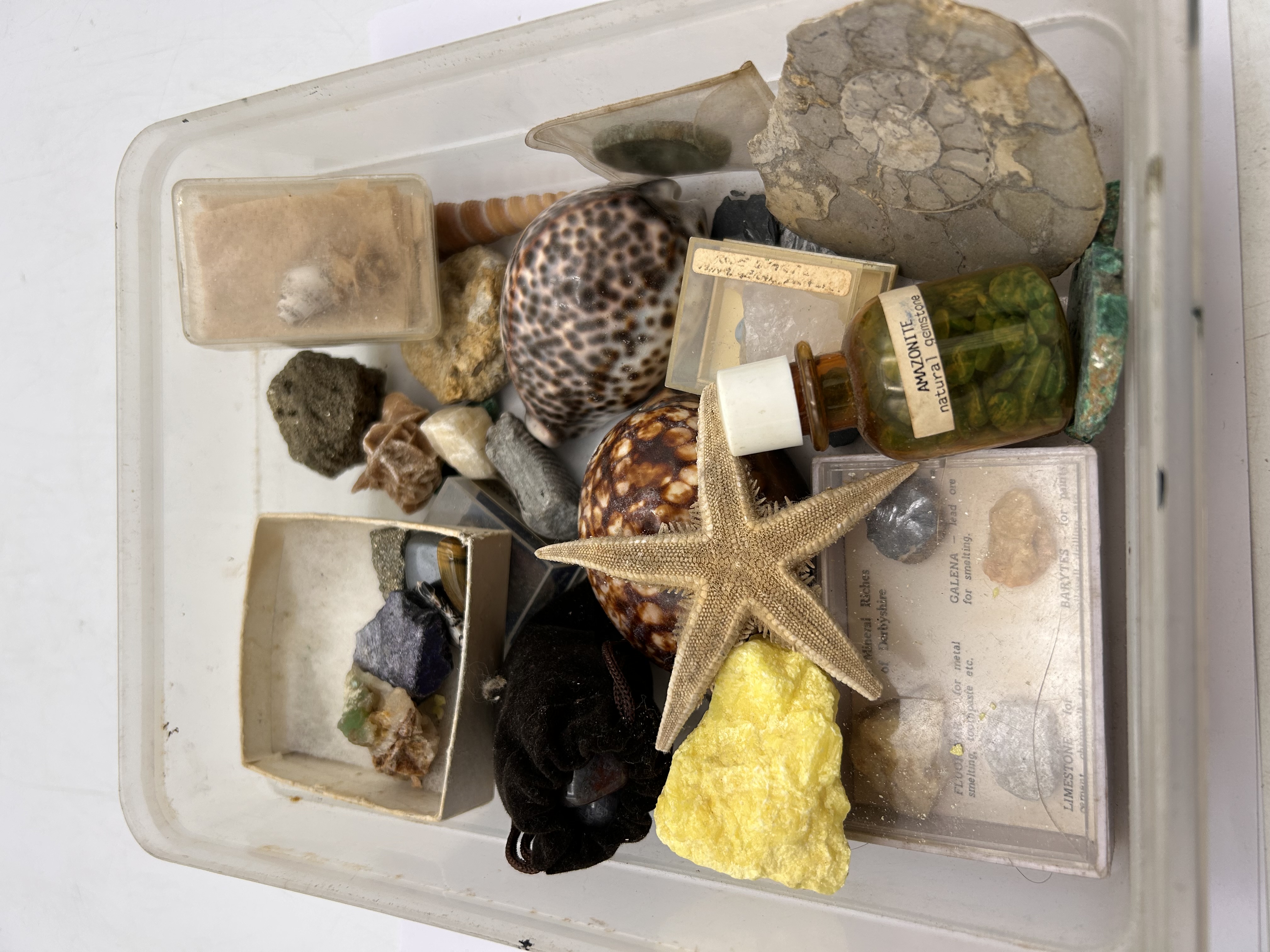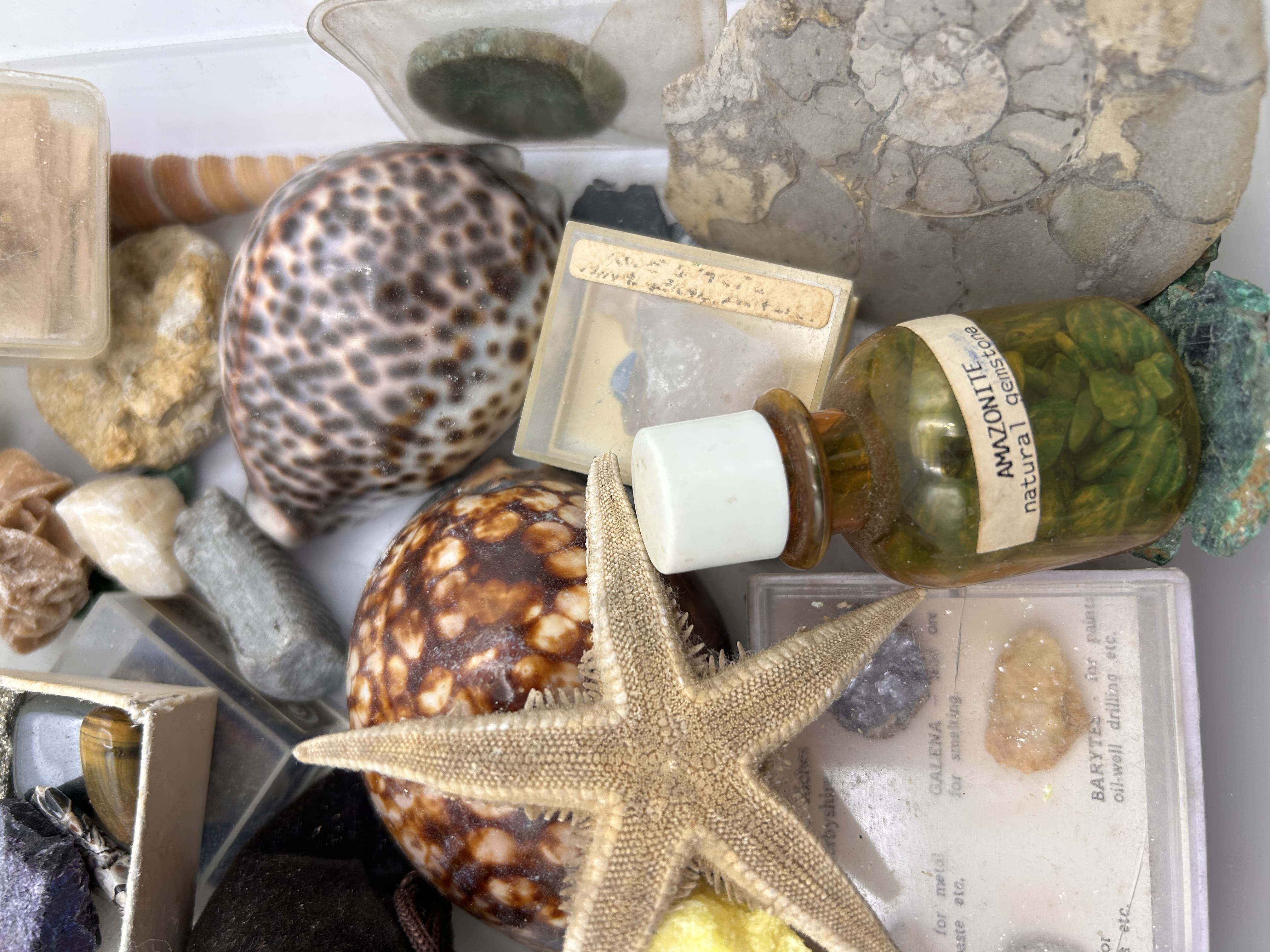 A mixed collection of natural history specimens, including assorted raw mineral samples, fossils, and marine life, housed within a clear plastic container. The collection features a prominent ammonite fossil, a dried starfish, and several seashells. Various rocks and crystals are present, including yellow sulfur, metallic gray galena, pyrite, and other colorful unidentifiable minerals. A small amber glass bottle, labeled “AMAZONITE natural gemstone,” contains small green stones. The collection includes several labeled small boxes and cases, with visible text identifying “LIMESTONE for metal,” “GALENA for smelting,” “BARYTES for paints oil-well drilling etc.,” and a general indication of “Mineral Riches of Derbyshire,” suggesting a vintage educational or study set.
