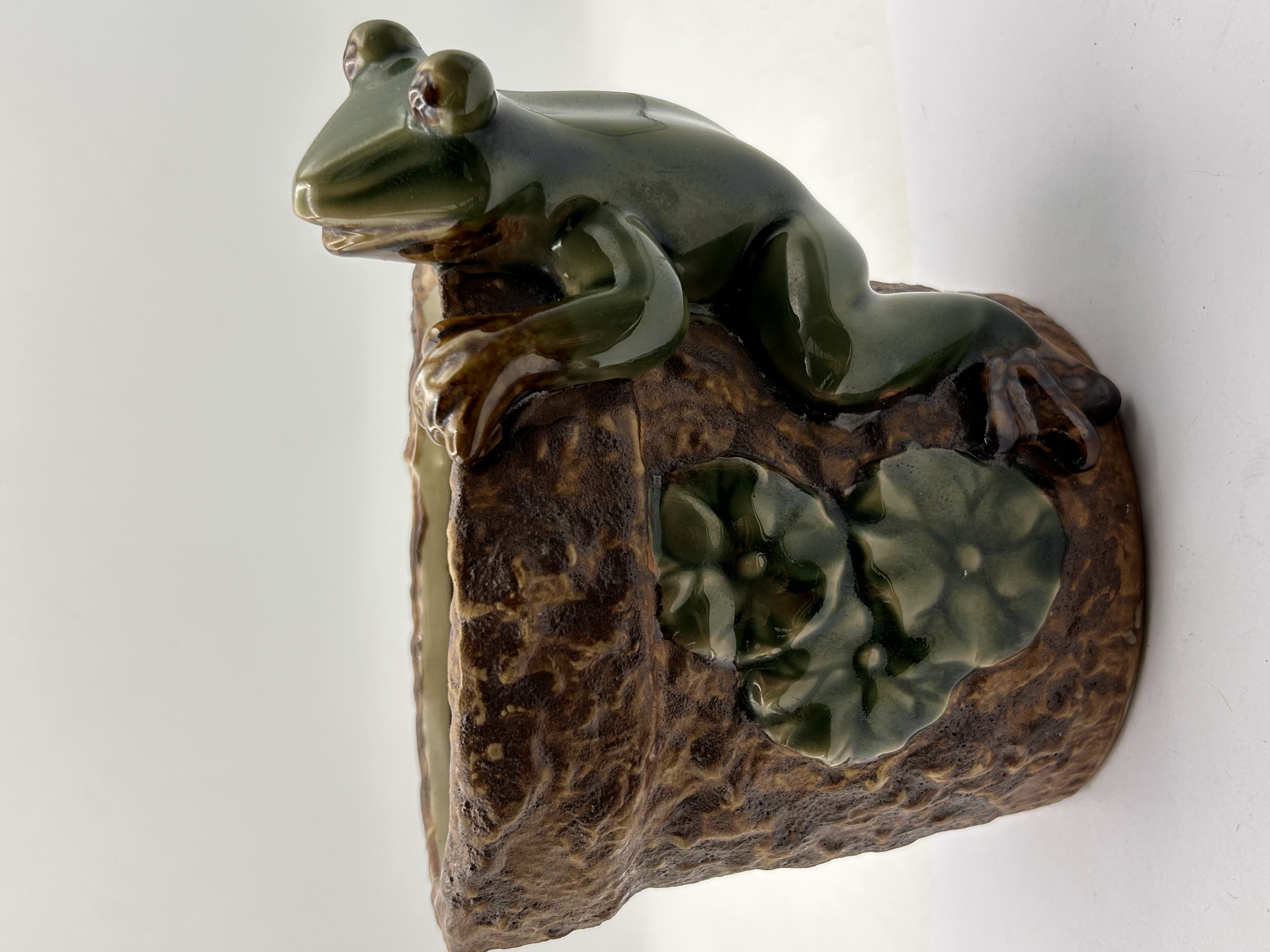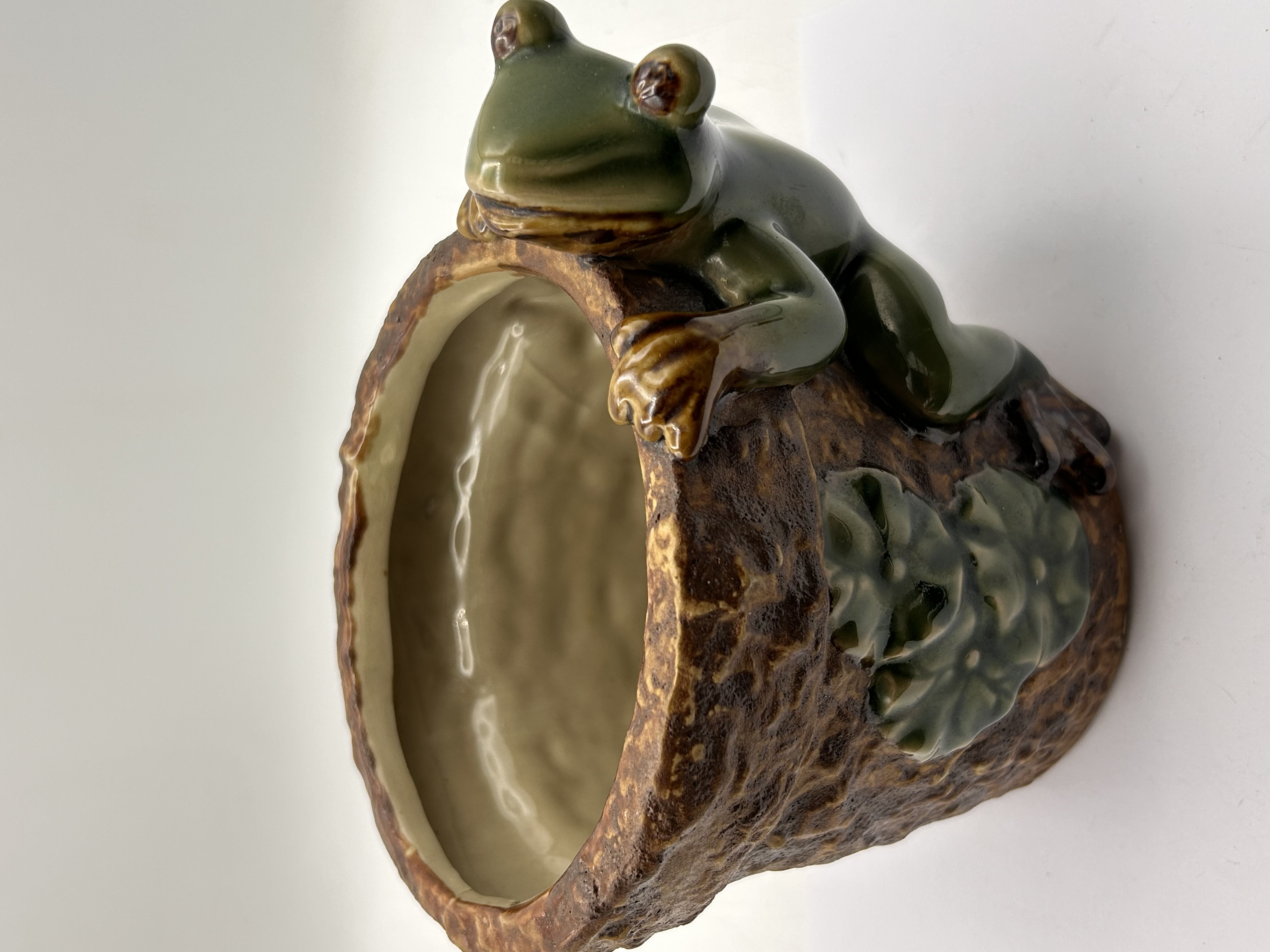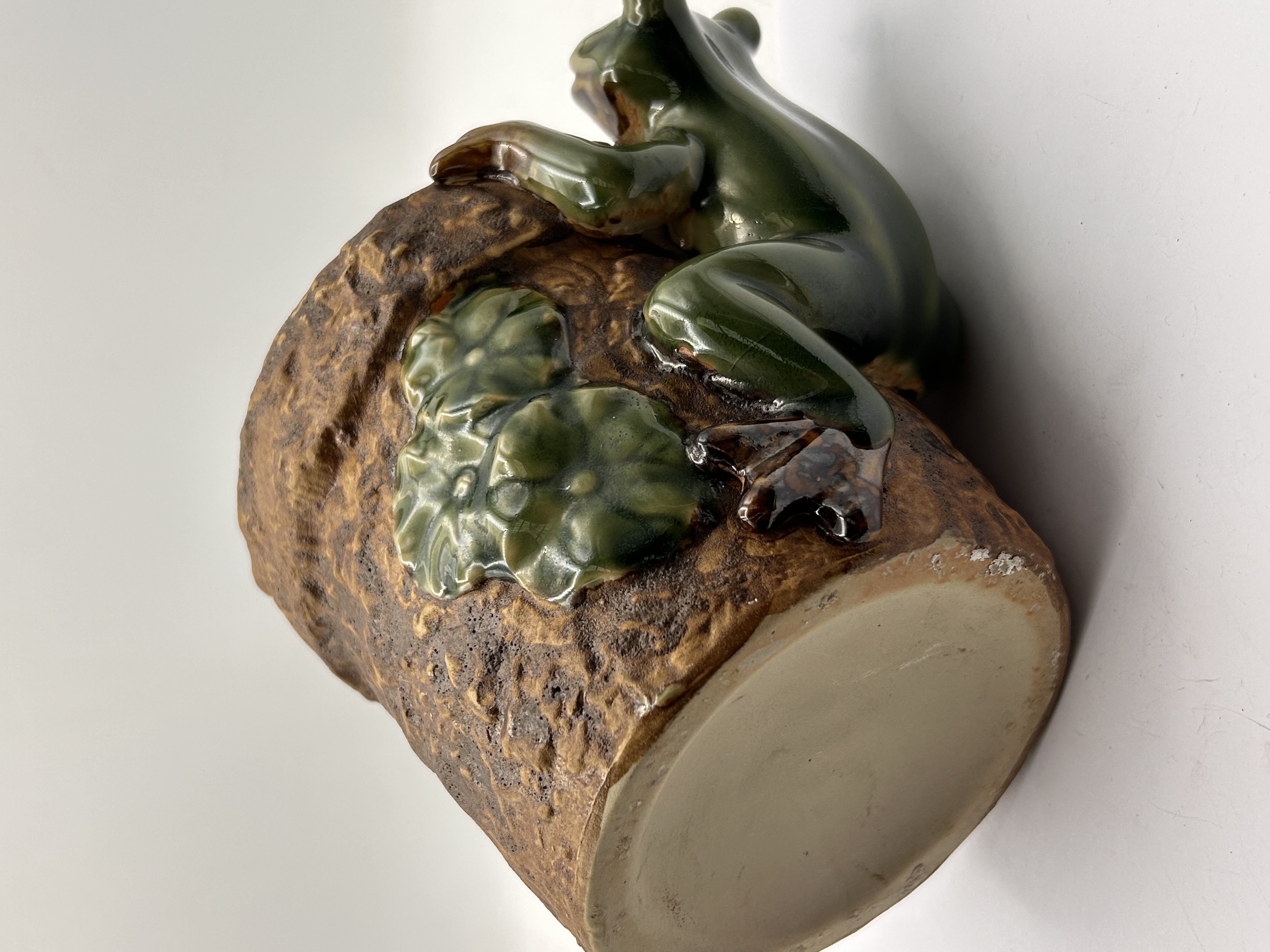 A vintage ceramic figural planter featuring a naturalistic style. The cylindrical body is finished with a textured, matte brown glaze, simulating tree bark, and accented with two relief-molded green lily pads. A glossy, dark green glazed frog figure is prominently molded in high relief on one side, appearing to climb the pot. The interior is a lighter, unglazed ceramic, and the unglazed base confirms the ceramic material. No visible text, maker’s marks, or inscriptions are present.