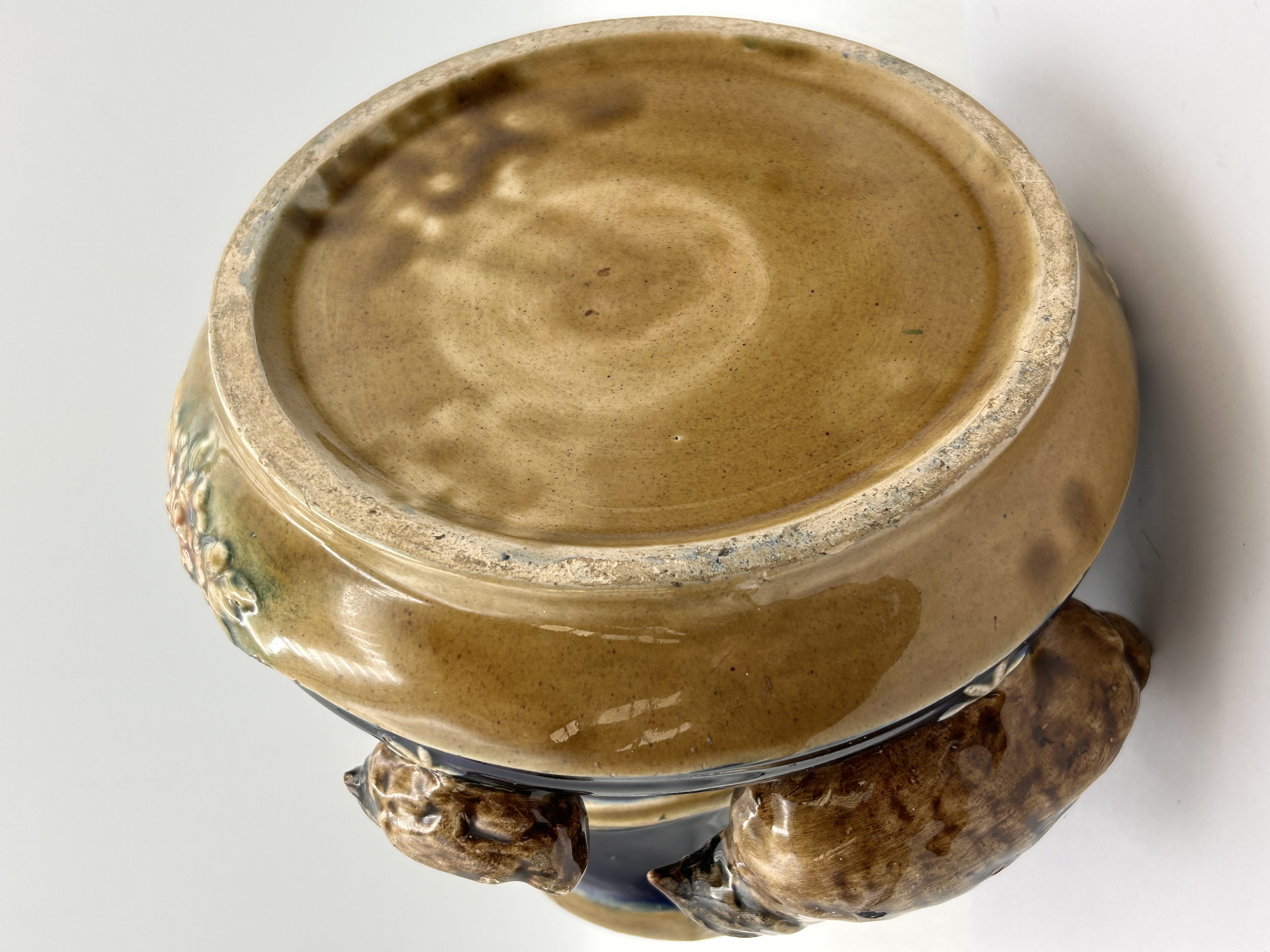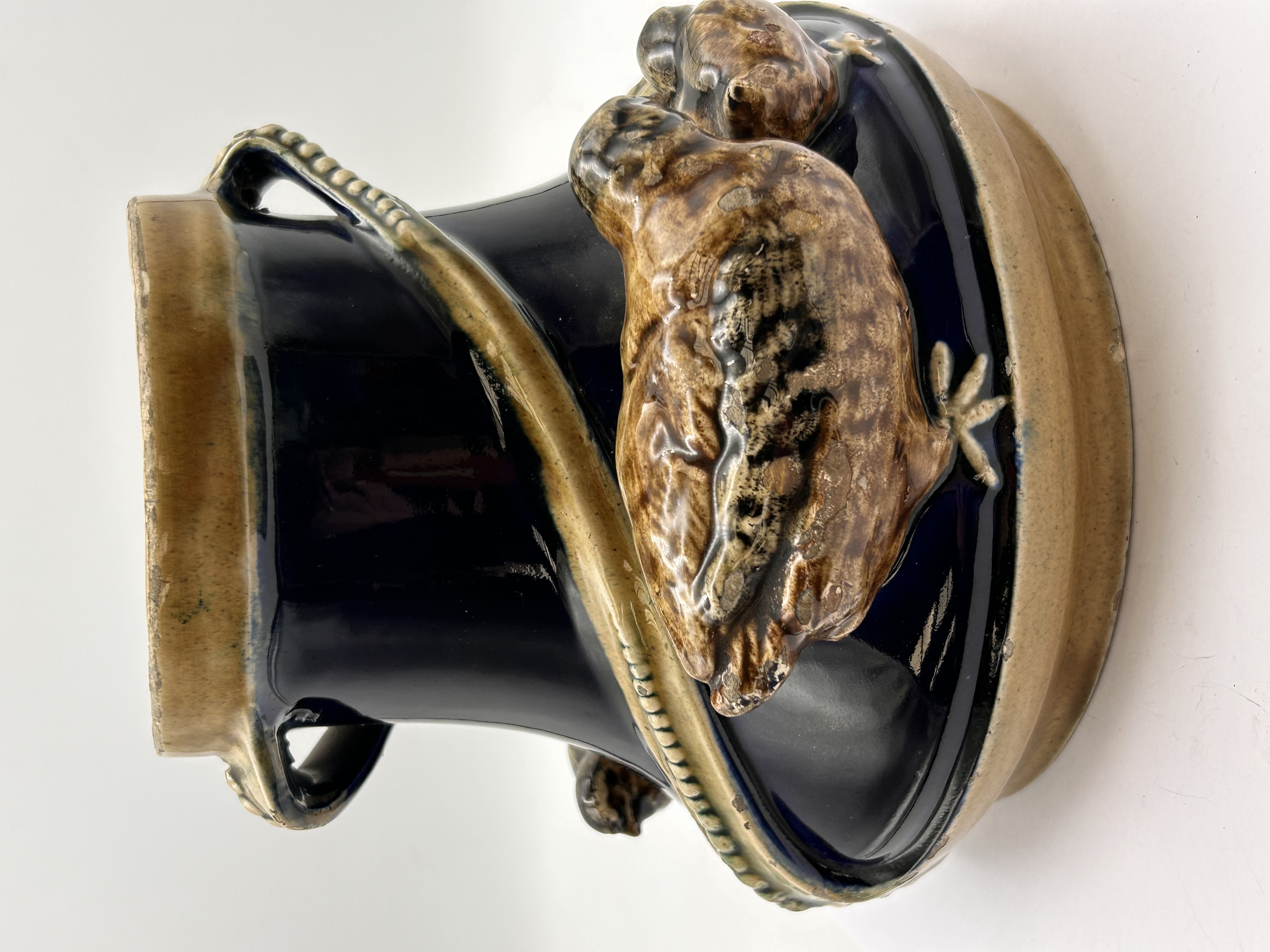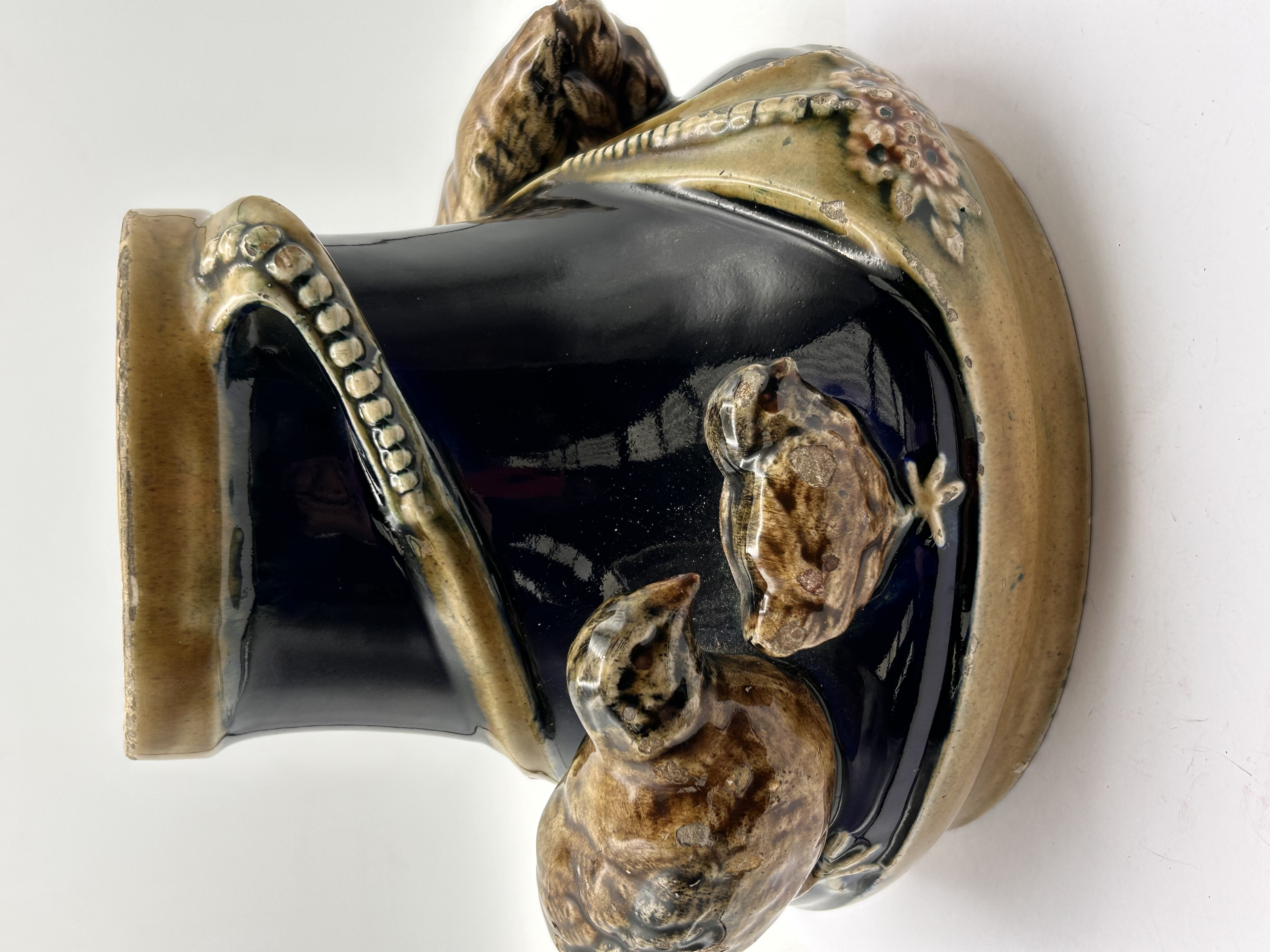 This glazed ceramic vase features a deep, dark blue body adorned with high-relief naturalistic decoration. Several brown-glazed birds, resembling quails or partridges, including both adults and chicks, emerge from the base. A textured, coiled element, possibly depicting a snake or vine with a beaded surface, wraps around the body, concluding with subtle floral accents near the base. The rim and the unglazed foot are finished in a contrasting tan-brown color. The underside is unglazed brown pottery, bearing no visible manufacturer’s marks or text.