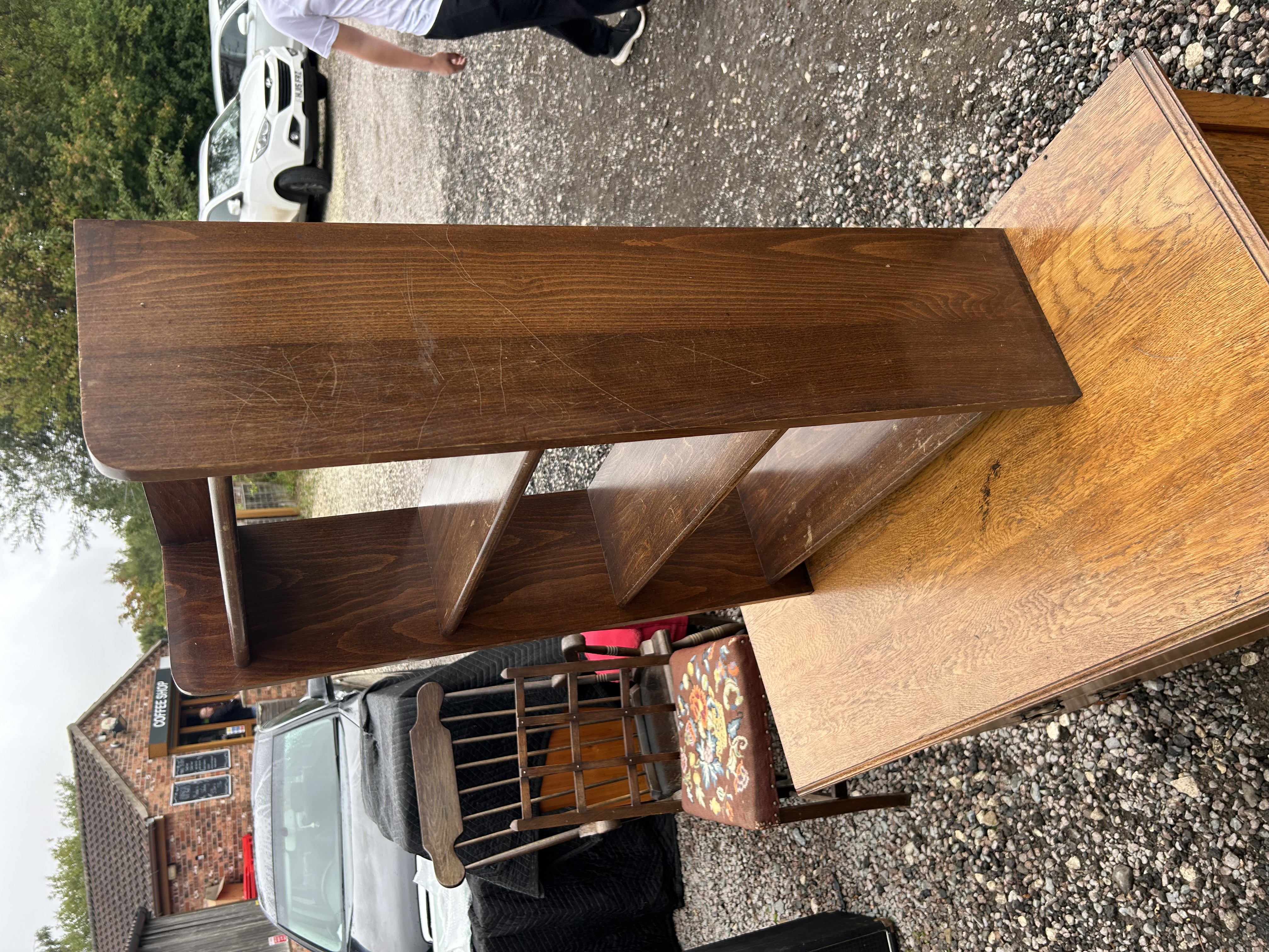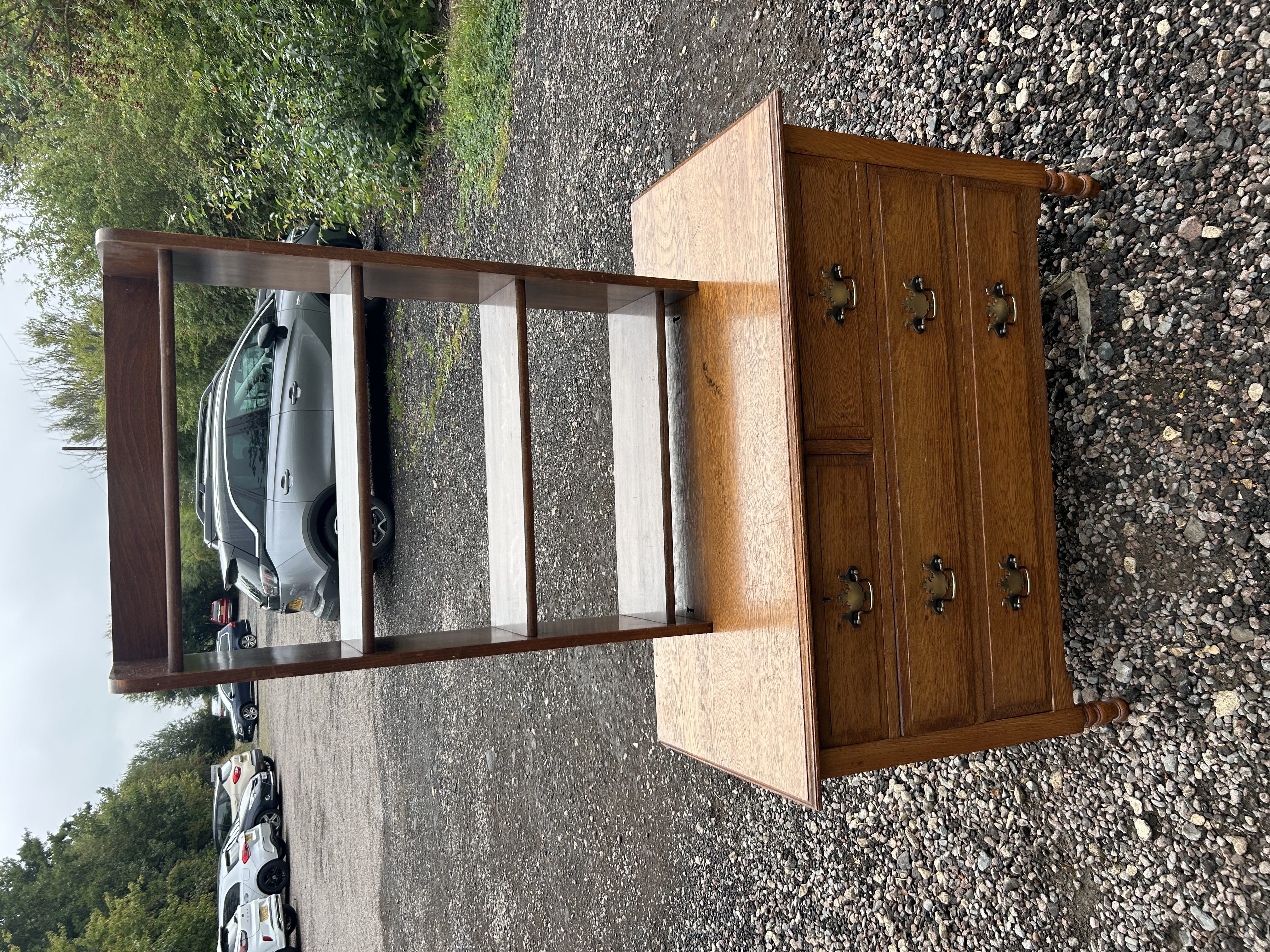 A Mid-Century Modern bookshelf credenza, comprising a chest of drawers with a separate open bookshelf hutch. The chest features four brass drop-handle drawers and turned legs. The hutch has three open shelves and a curved top rail. Constructed from a medium-brown wood, likely oak, the piece exhibits characteristics consistent with Mid-Century Modern design. No discernible maker’s marks or text are visible.