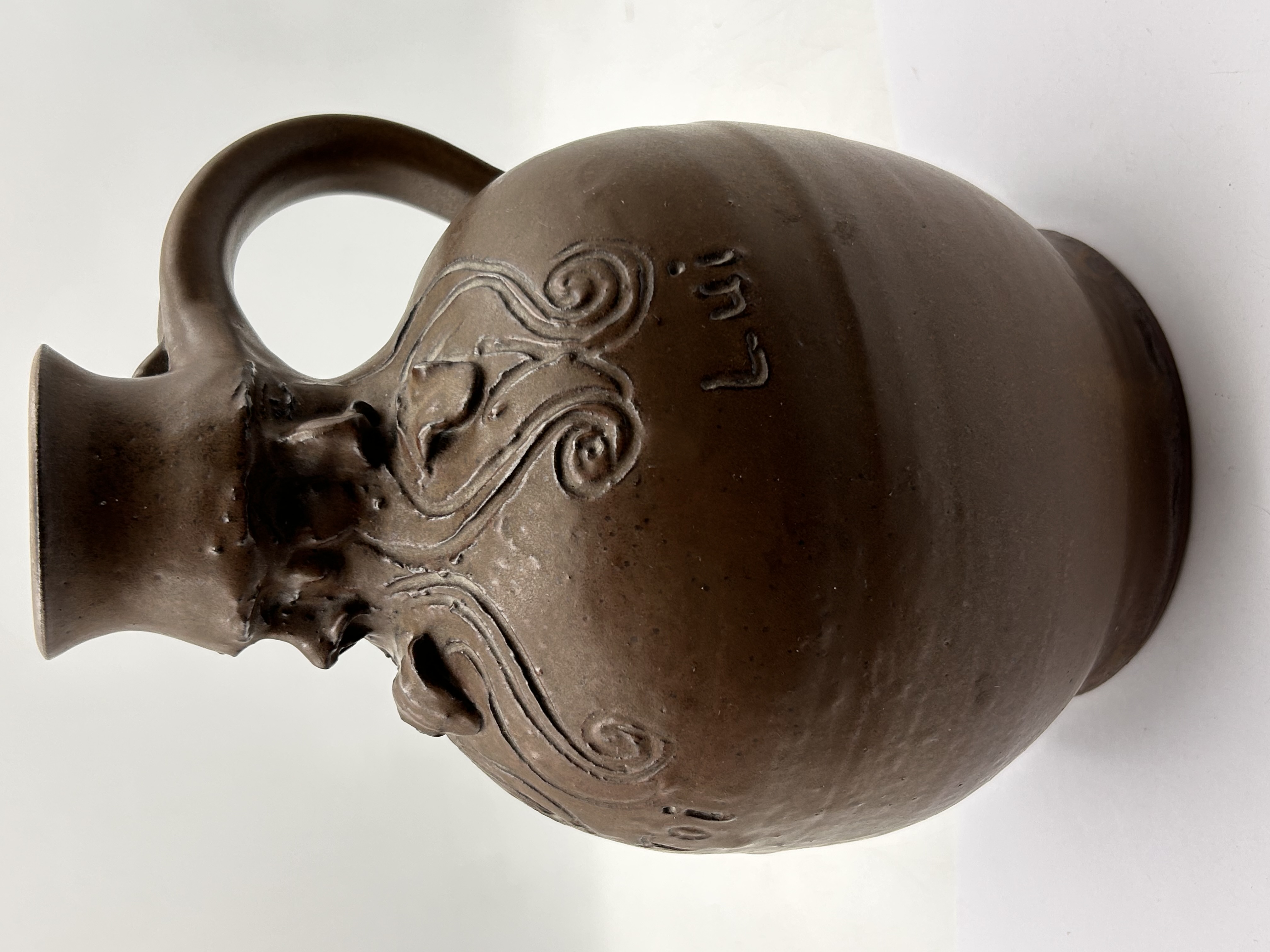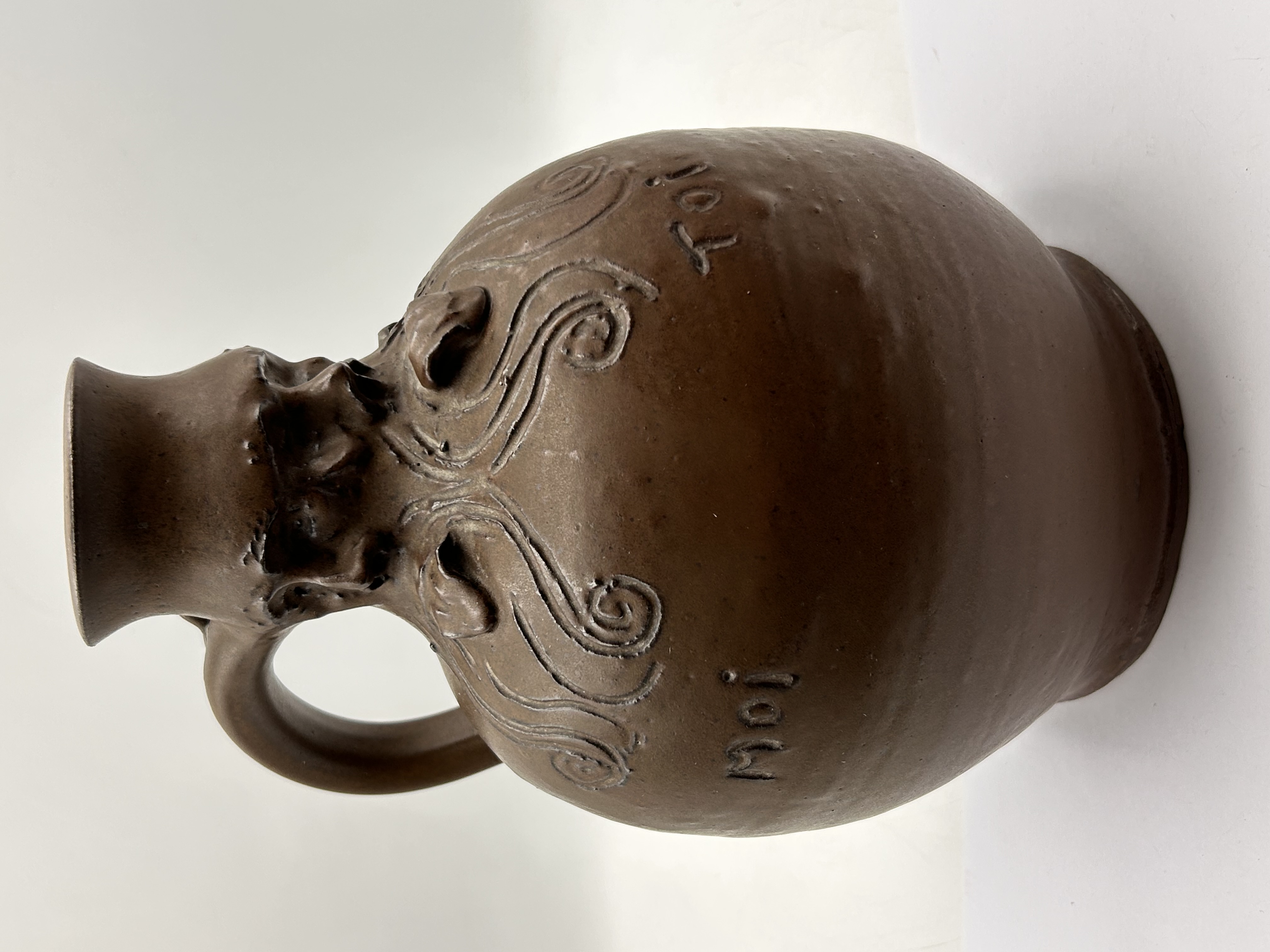 A globular, dark brown stoneware jug or pitcher with a narrow neck and a C-shaped handle. The neck is adorned with multiple molded relief grotesque or bearded faces, while the shoulder exhibits incised and low-relief foliate or vine-like motifs. On the main body, the French pronouns “Moi” (Me), “Toi” (You, informal singular), and “Lui” (Him/Her/It) are incised. The base bears a deeply impressed circular mark with an indistinct, possibly heraldic or stylized figure design.