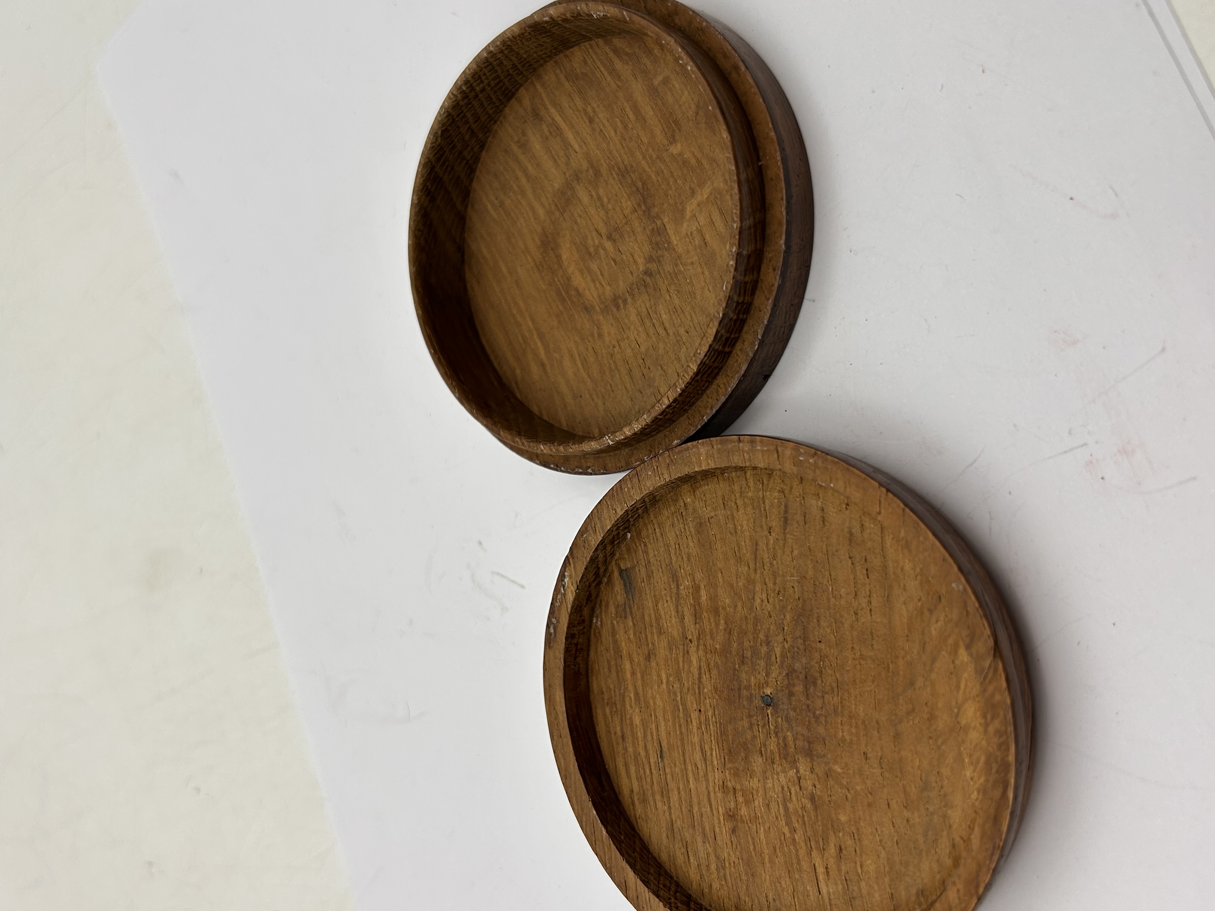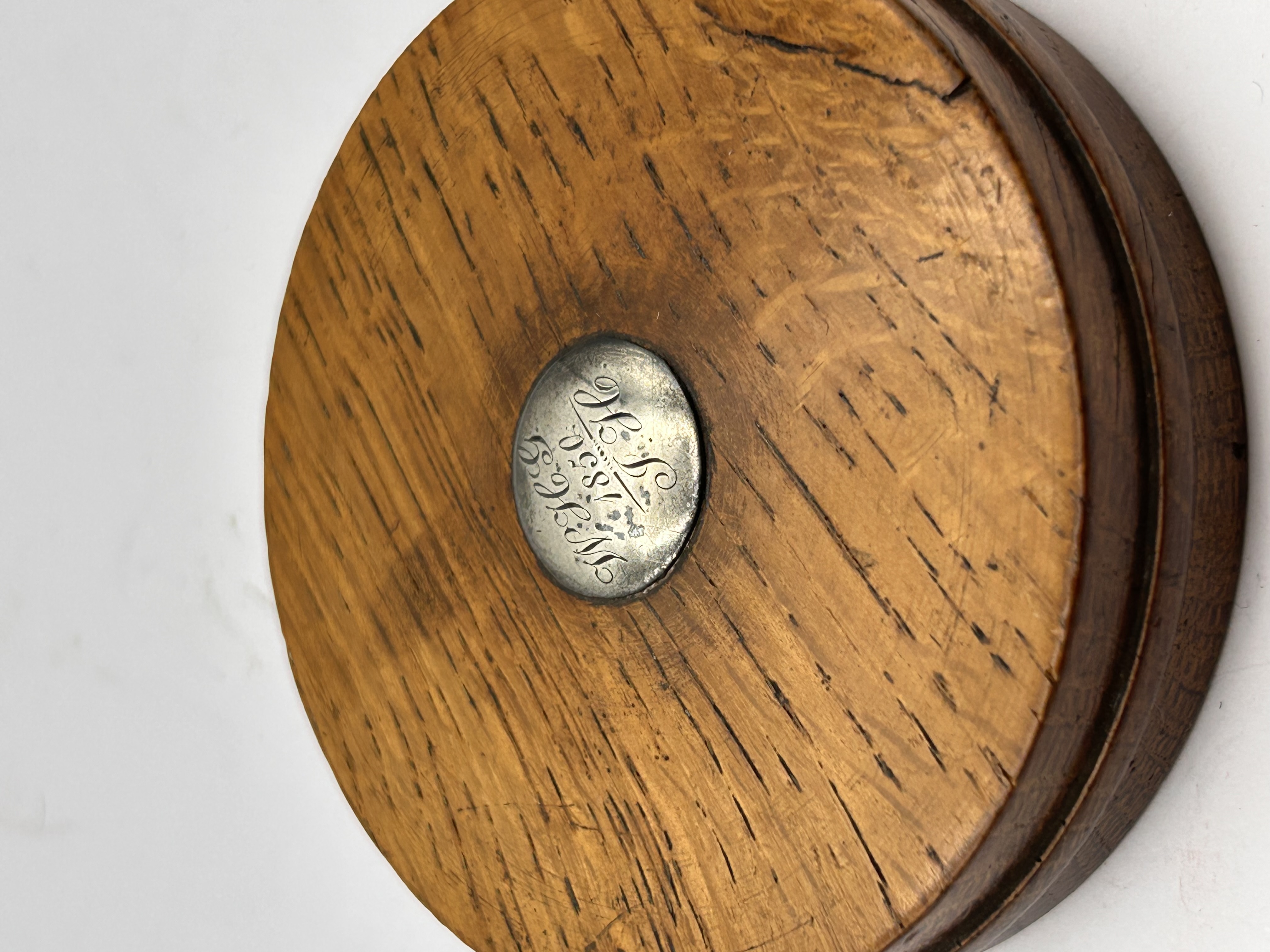 This antique, round wooden box features a fitted lid, crafted from a hardwood, likely oak, exhibiting a prominent grain. Recessed into the center of the lid is a slightly domed metal plaque, possibly silver or pewter, which is engraved with the initials “W.H.G.” above the year “1850,” and further initials “J.T.H.” below. The object’s design and materials are consistent with mid-19th century craftsmanship.