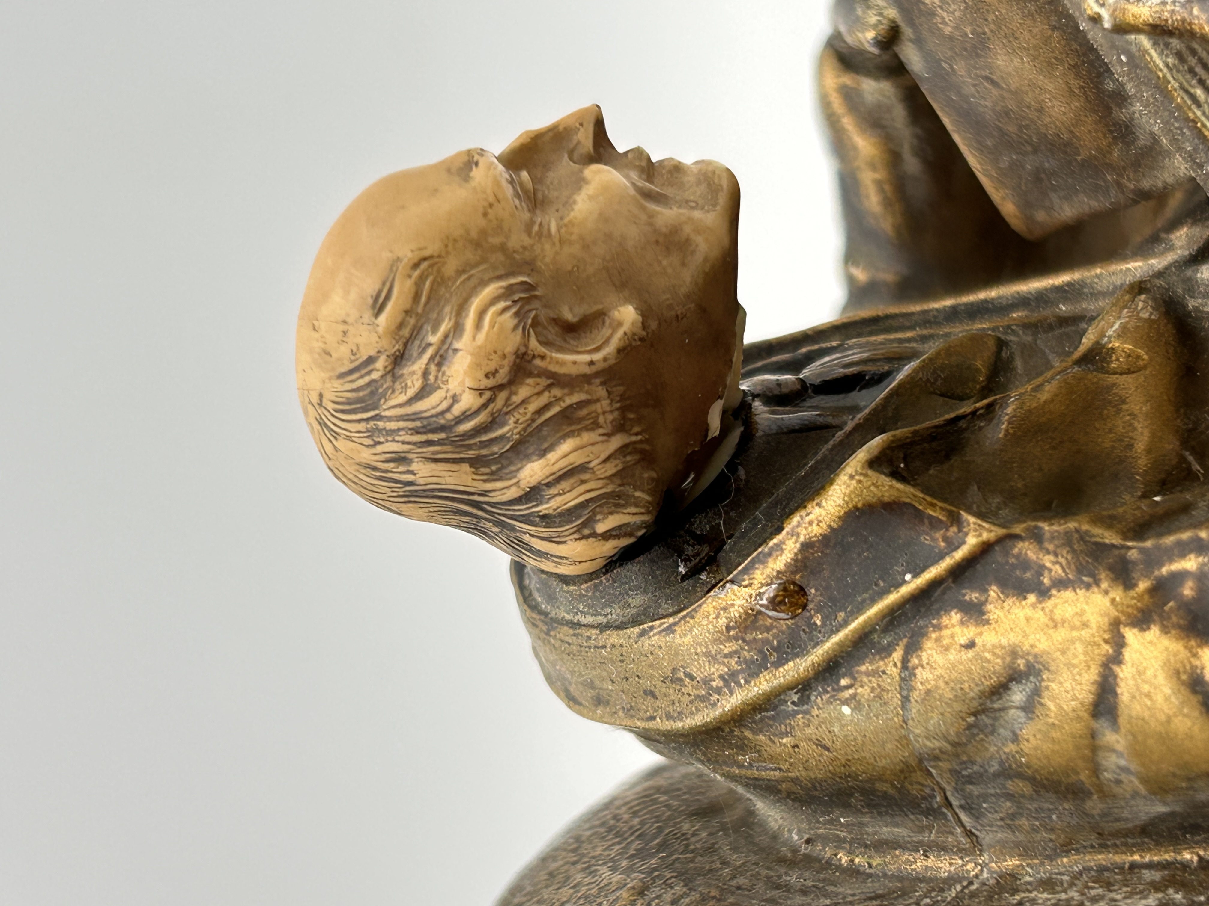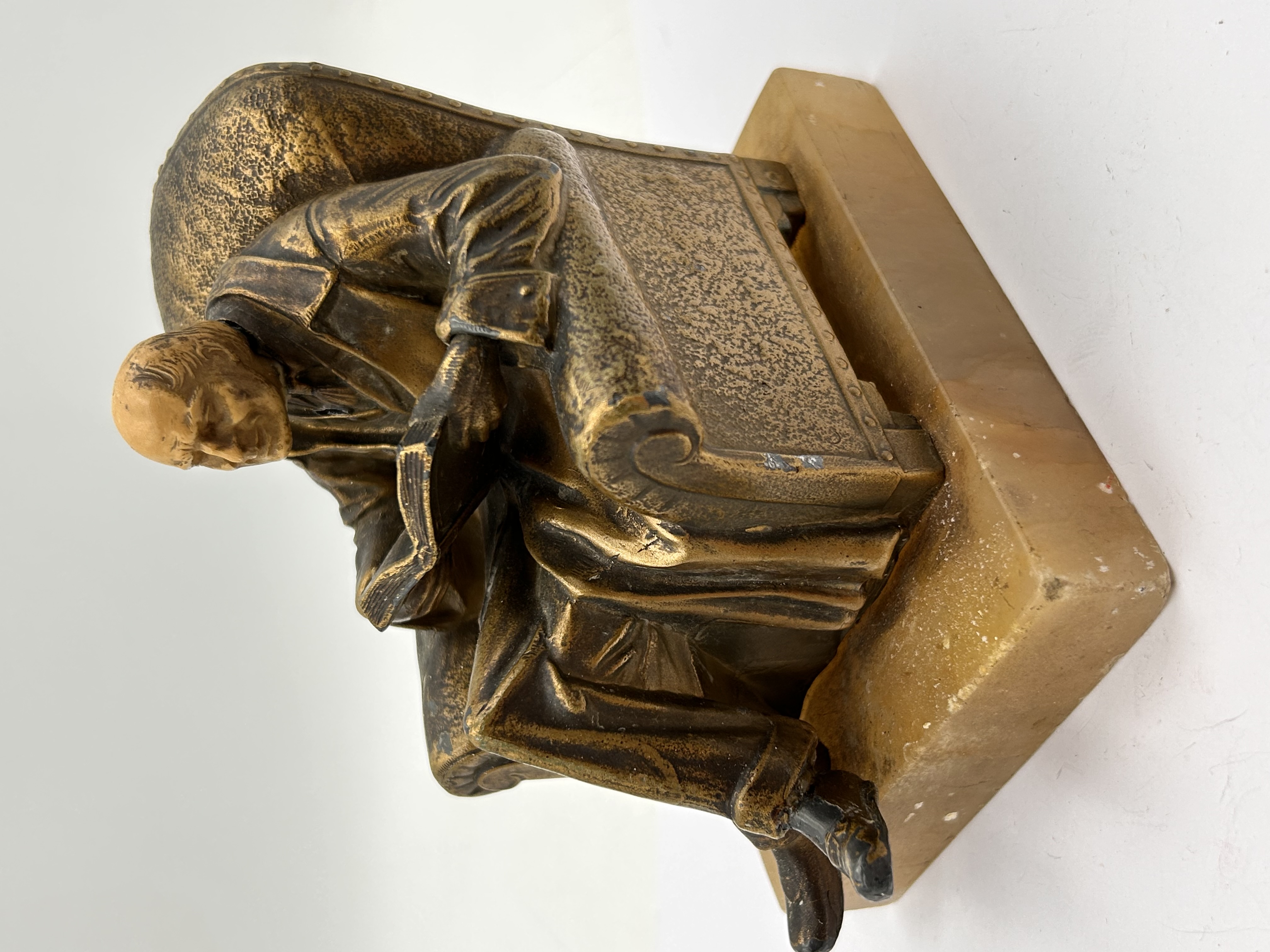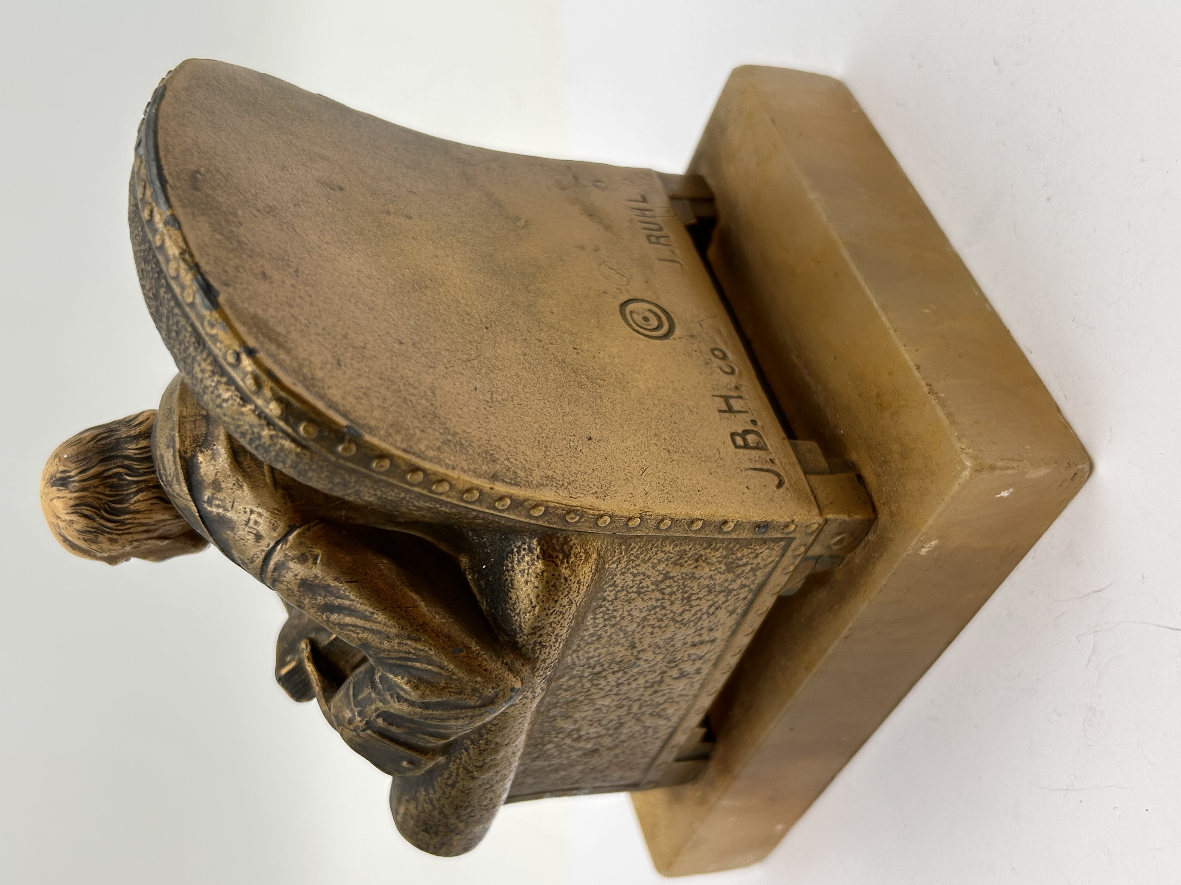 A JB Hirsch J. Ruhl Design figural single bookend, depicting an elderly man, often referred to as a ‘Librarian’ or ‘Scholar’, engrossed in reading a book. The statuette features a main body, comprising the figure and armchair, crafted from cast metal, likely spelter or another alloy, with an applied antique bronzed finish. It is mounted on a polished, yellowish-tan marble or alabaster base. Distinctly, the man’s face and hair are fashioned from a separate material, identified as celluloid, which was a common material for these figures. The reverse of the chair bears the markings ‘J.B.H. Co.’, a circular maker’s mark, and ‘J. RUHL’, indicating the manufacturer and designer respectively.