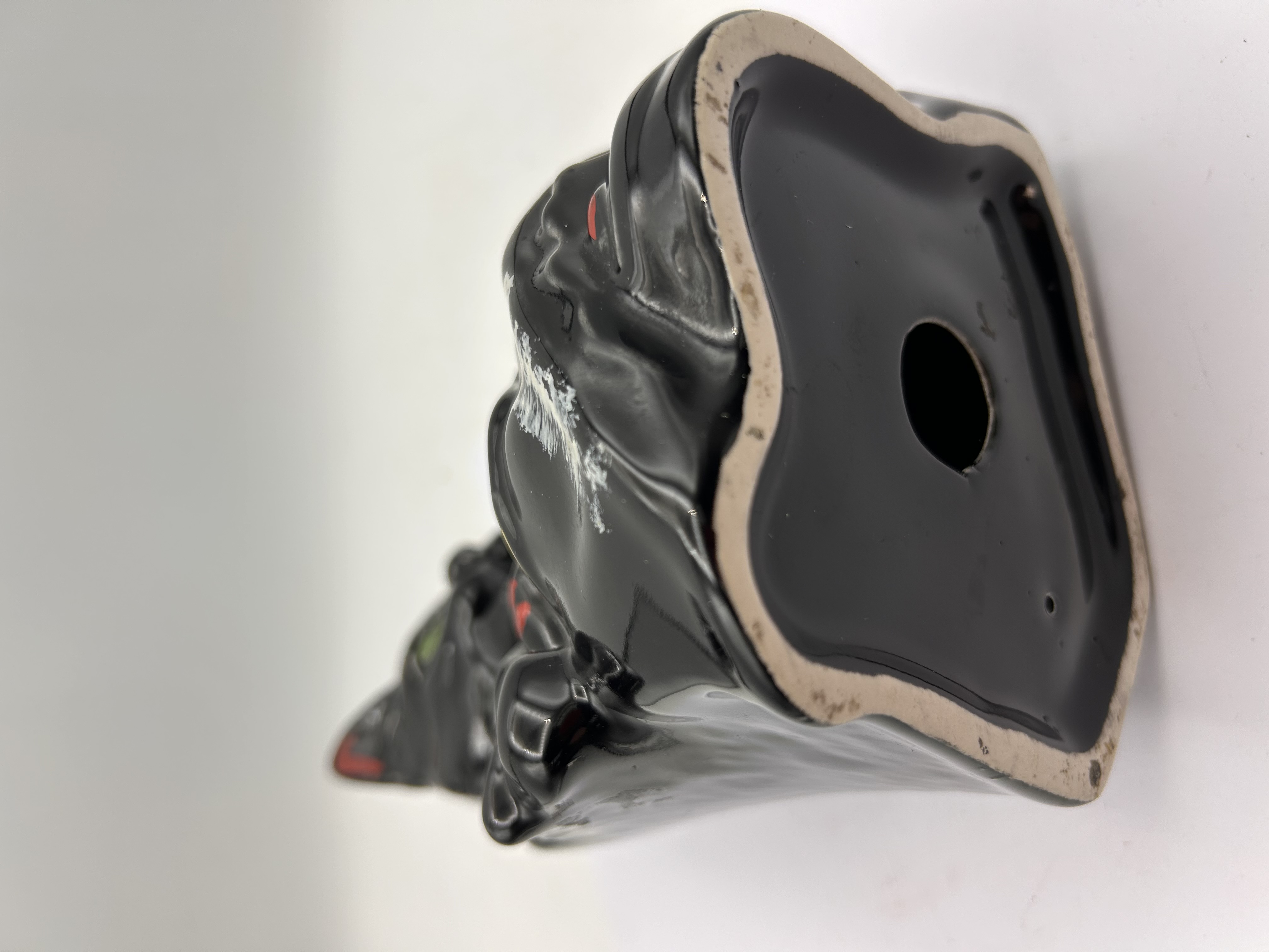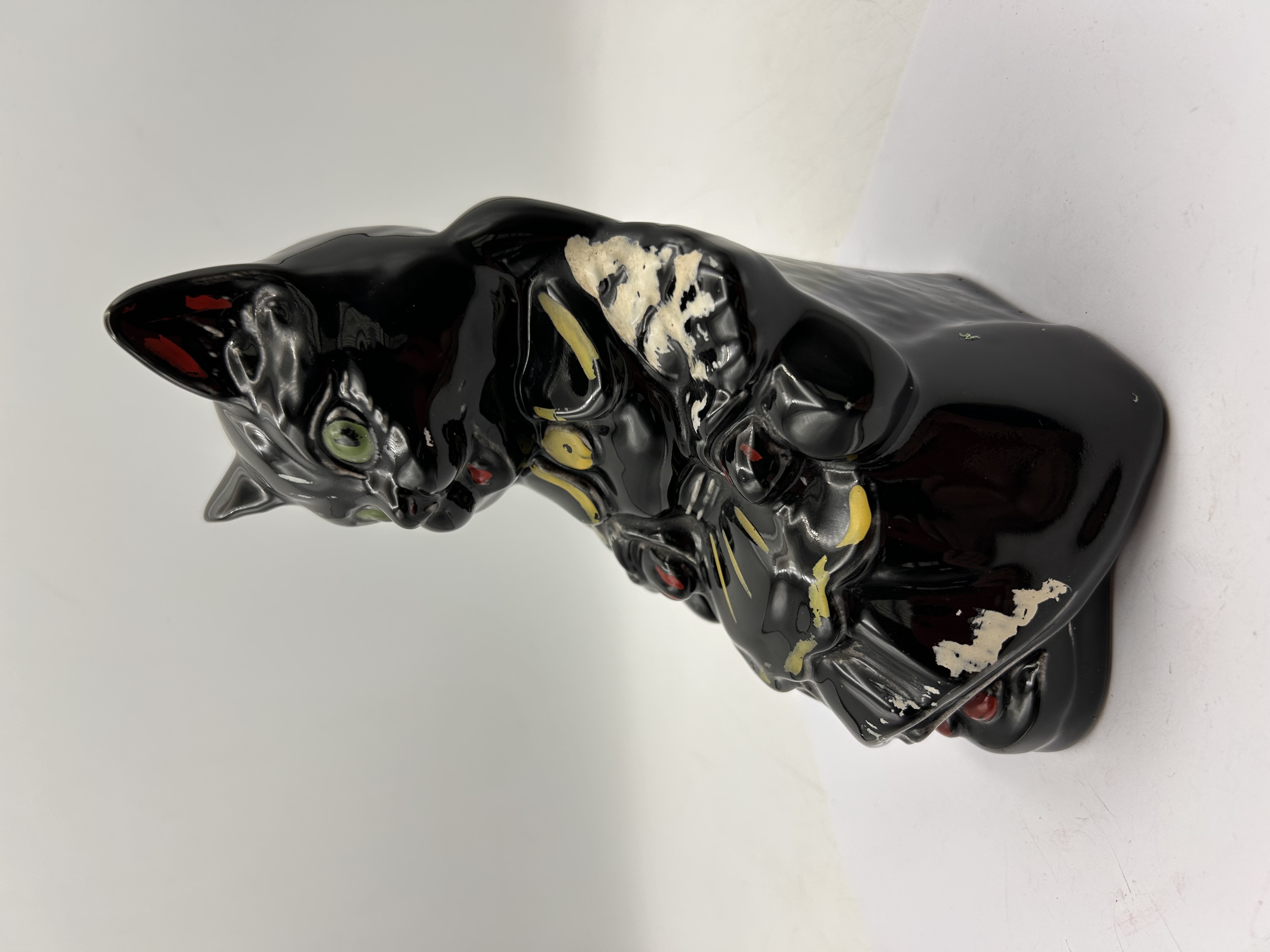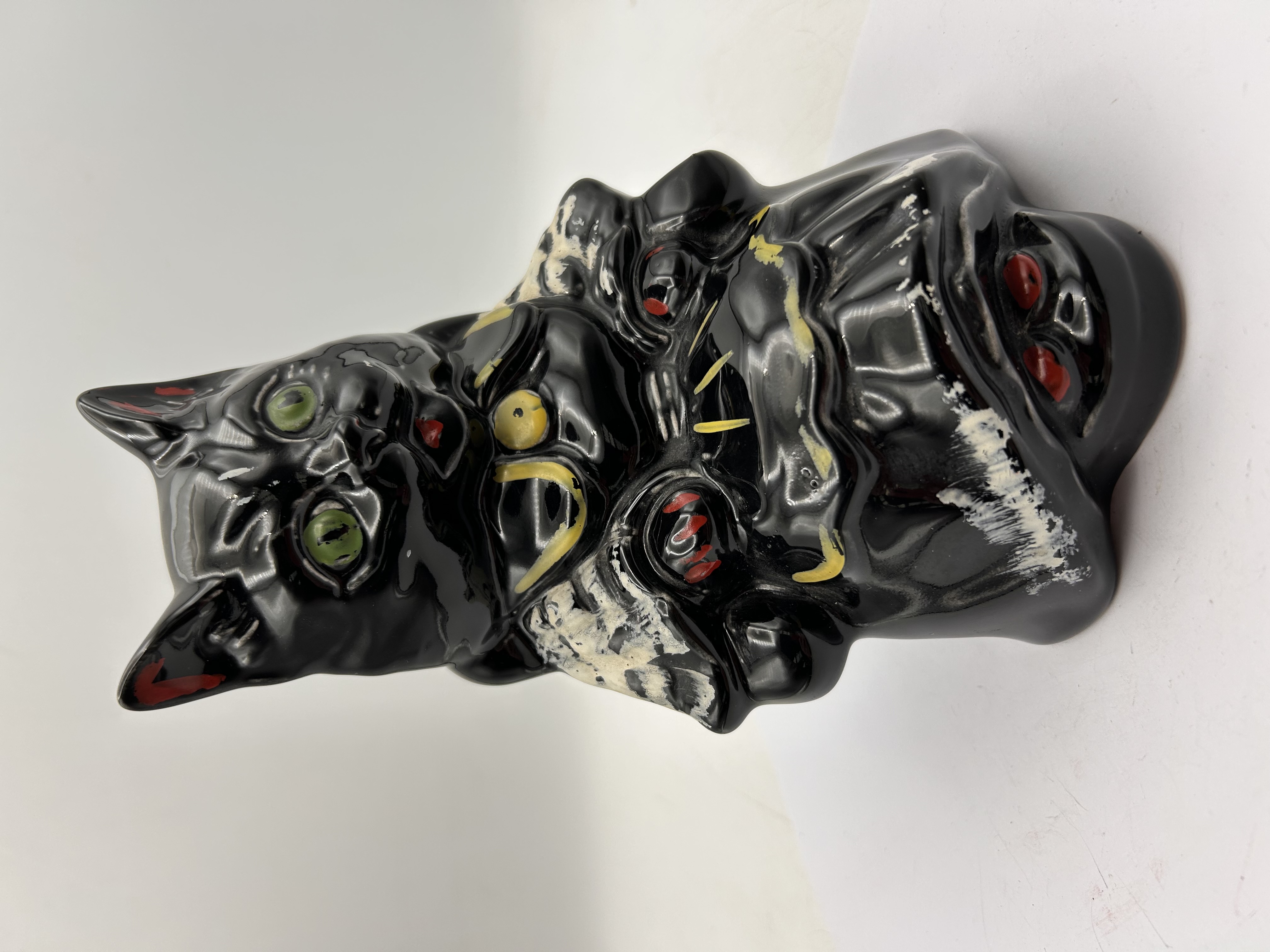 A vintage mid-20th century Halloween-themed figural ceramic bank. The piece depicts a stylized black cat with vibrant green eyes and red accents on its ears, nose, and mouth. The cat is adorned with a yellow painted necklace and is seated, holding a lower, stylized head or pumpkin-like object featuring red, yellow, and textured white painted details. Crafted from earthenware with a glossy black glaze, the piece includes a circular access hole on its unglazed base.