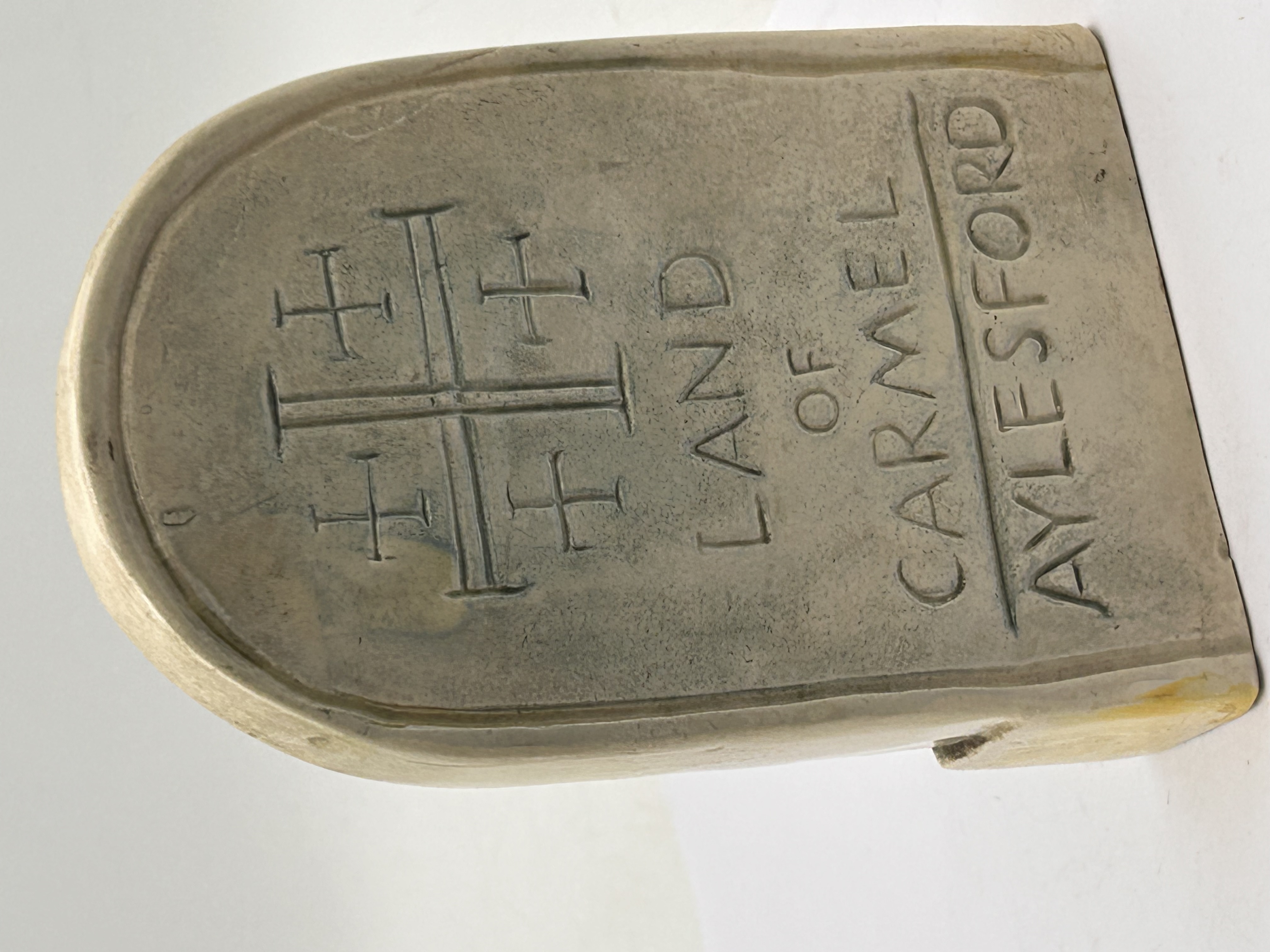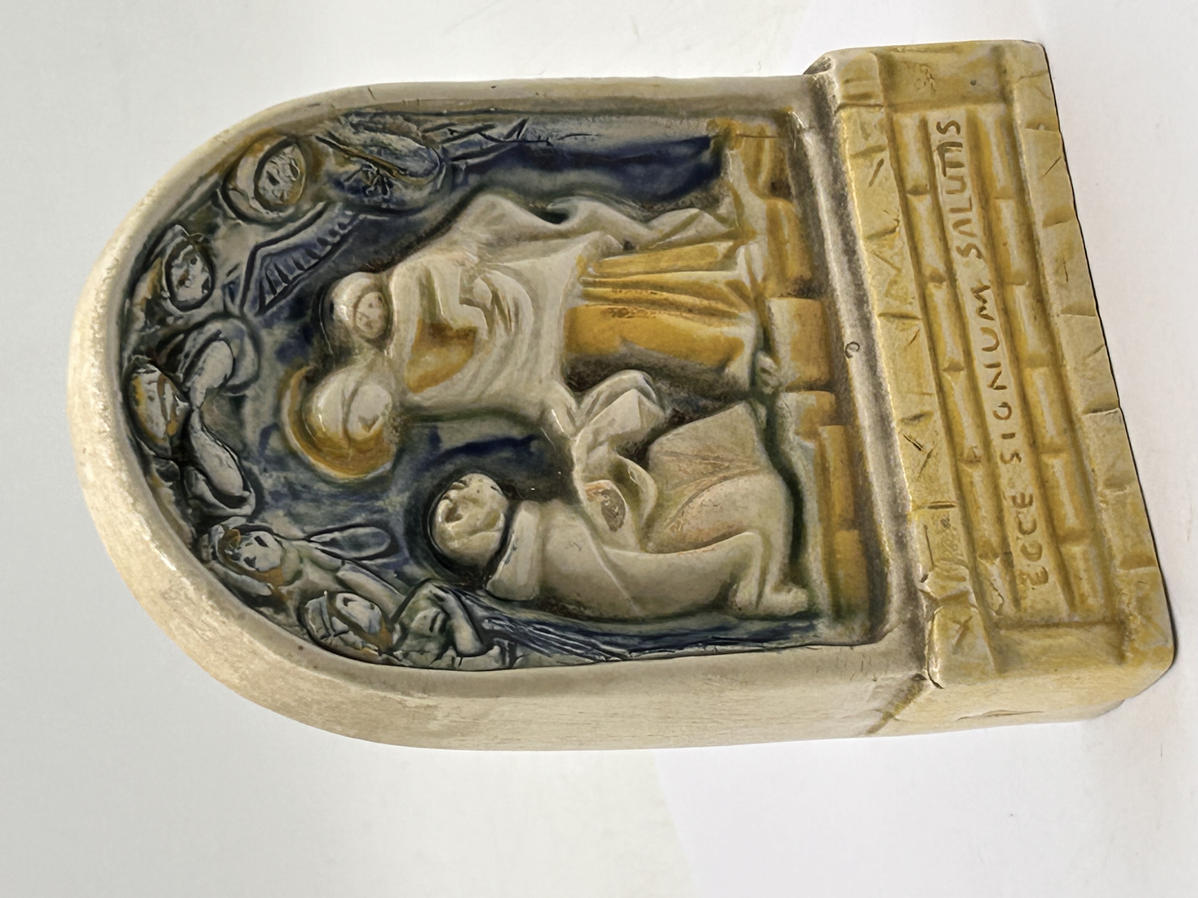 A freestanding, glazed ceramic relief plaque or tablet depicting a religious scene on its obverse. The front features the Virgin Mary holding the Christ Child interacting with a kneeling monastic figure, surrounded by other haloed figures, all rendered in low relief within an arched niche and colored with cream, yellow, and blue glazes. Below this scene, incised text reads “ECCE SIGNUM SALUTIS,” which translates to “Behold the sign of salvation.” The reverse features an incised Jerusalem cross motif above the text “LAND OF CARMEL AYLESFORD.”