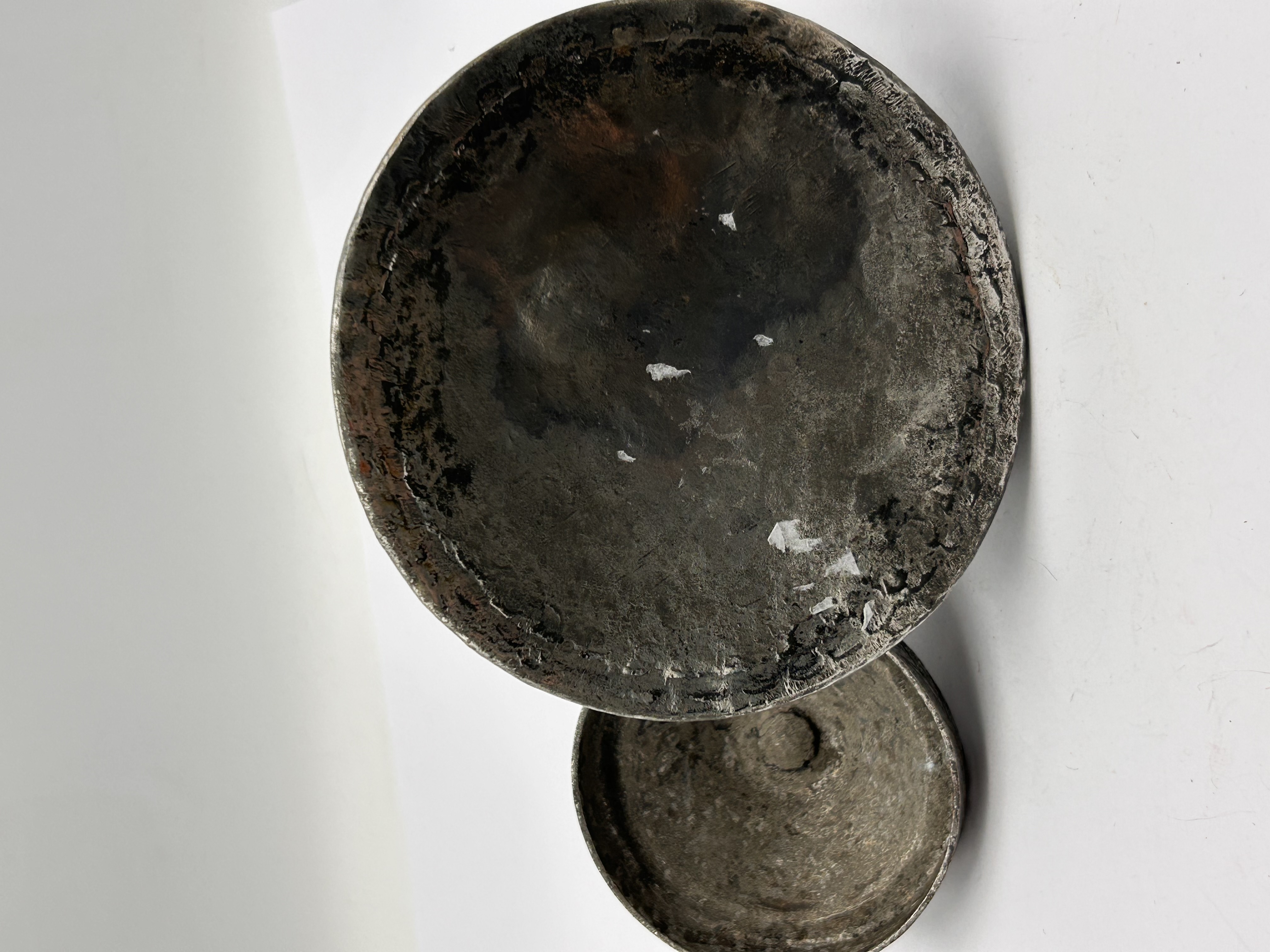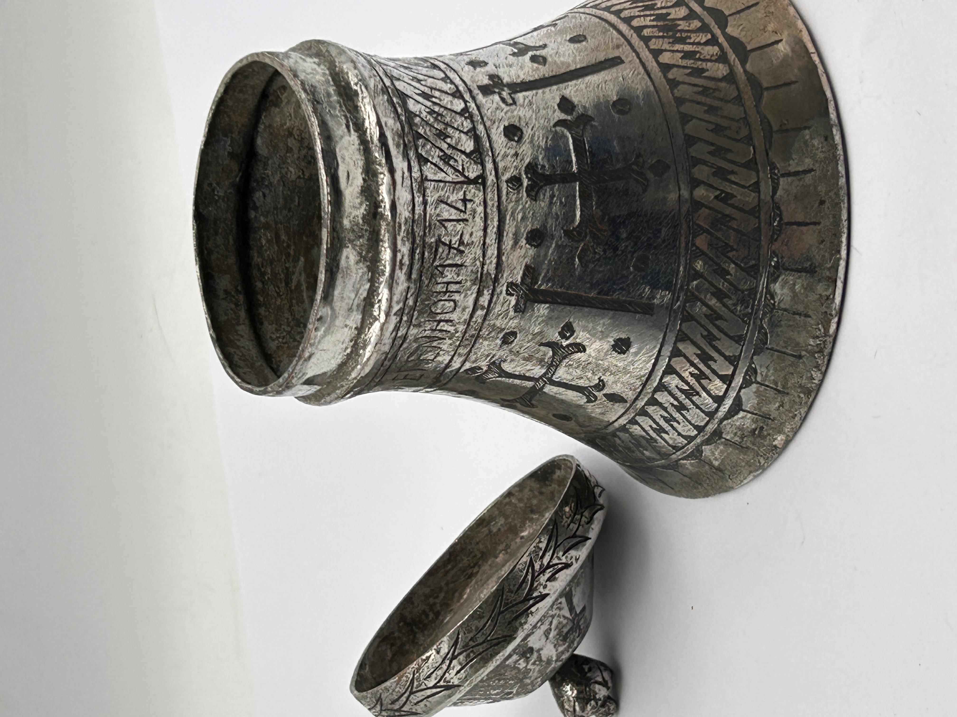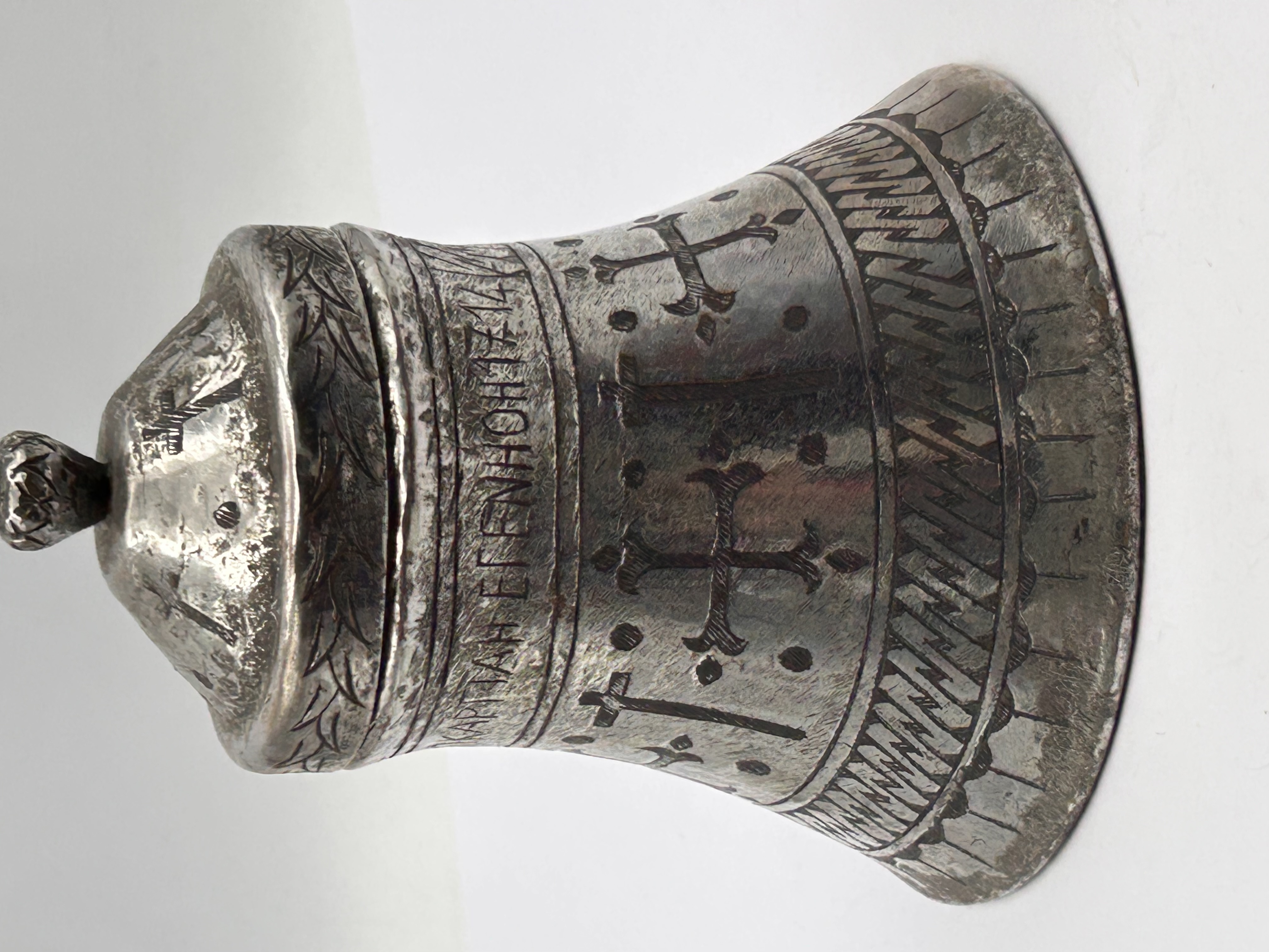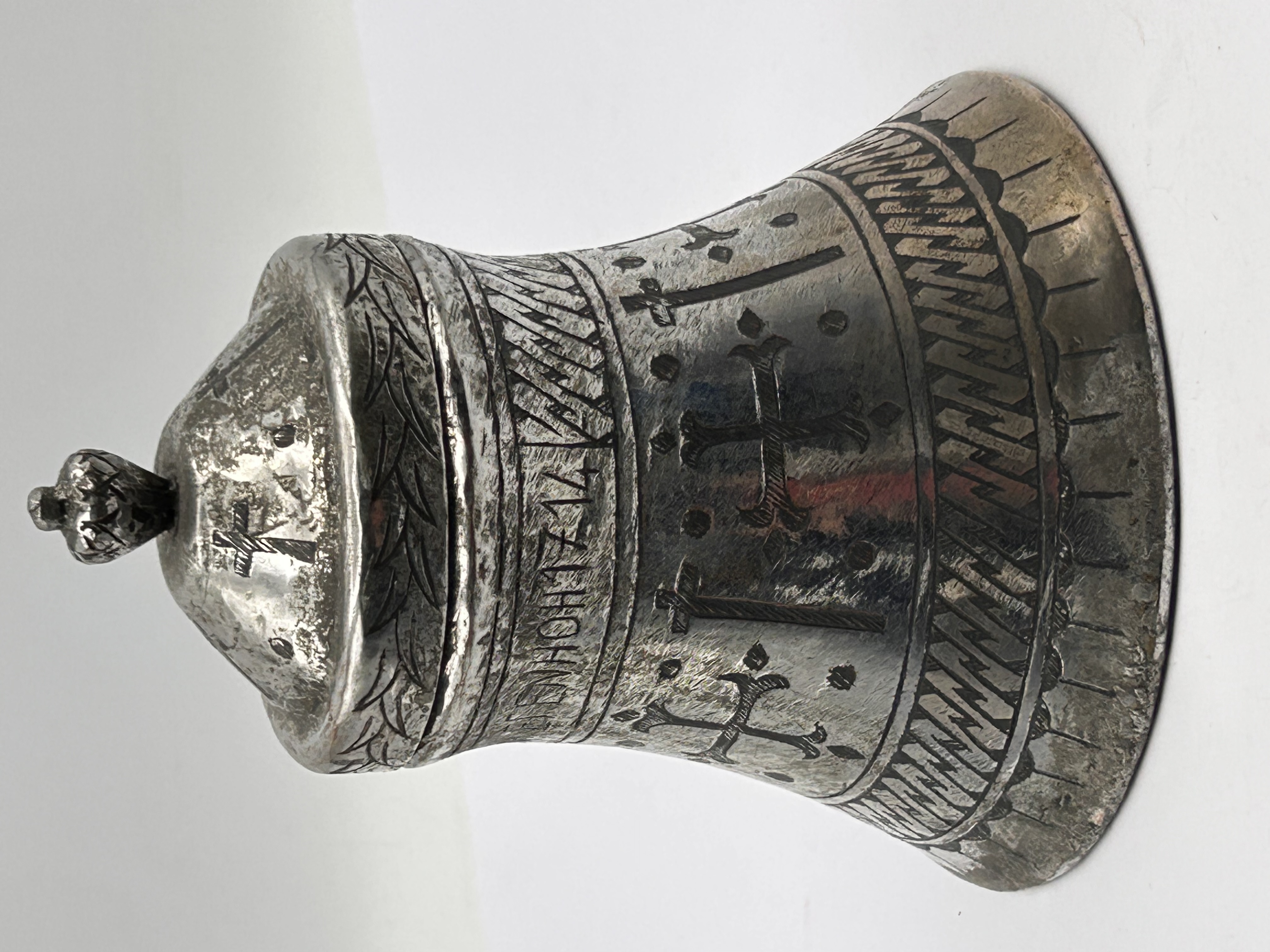 An early 18th Century bell-shaped lidded metal vessel, likely silver or a silver-plated alloy, featuring a decorative finial. The surface is extensively engraved in a folk-art style, depicting multiple crosses of varying designs and bands of geometric and foliate patterns. A prominent inscription in Greek script on the mid-section reads “KAPTAN EΓENHOHT 1714,” which translates approximately to “Kaptan (was) made/created/dedicated 1714.”