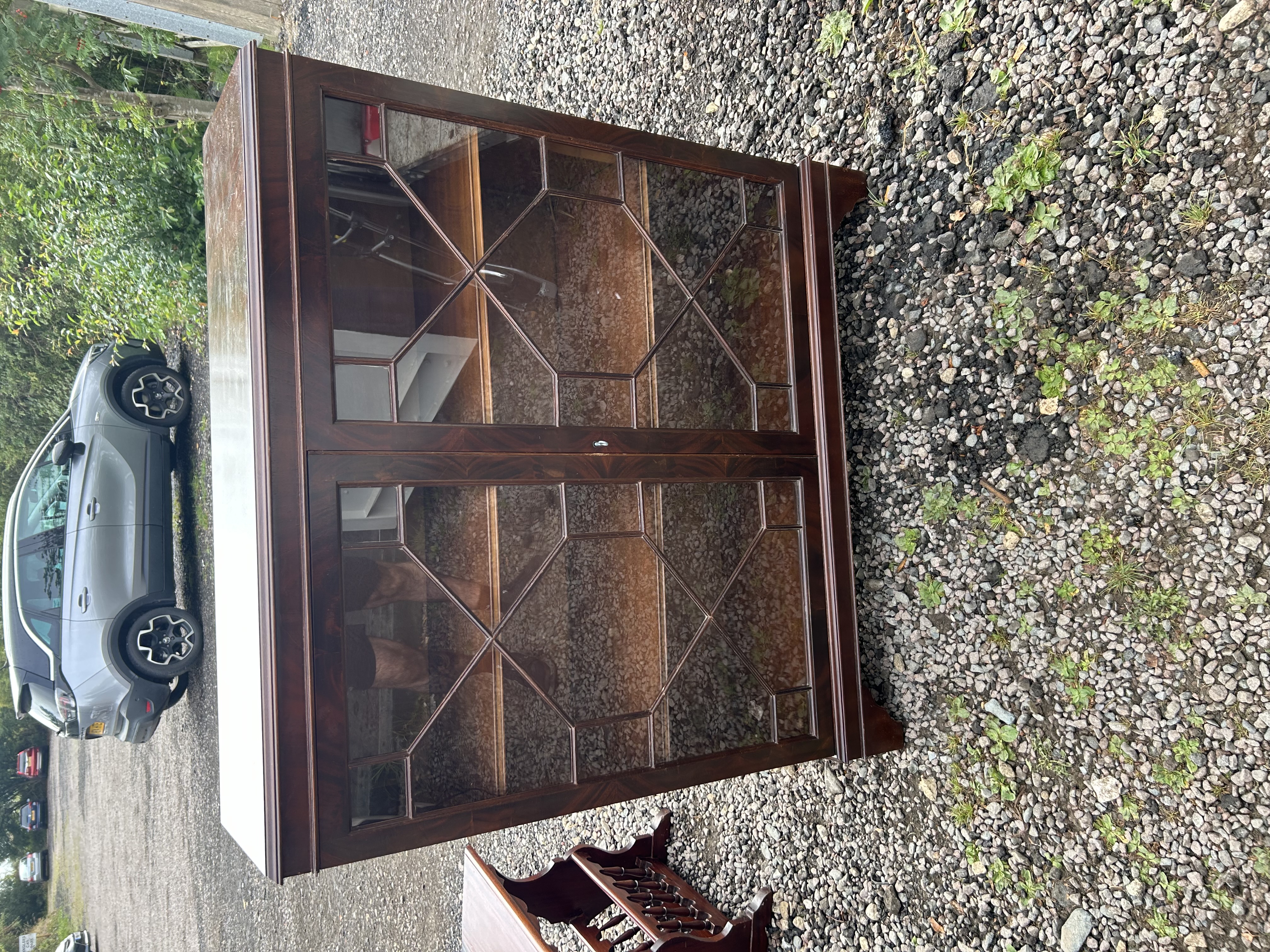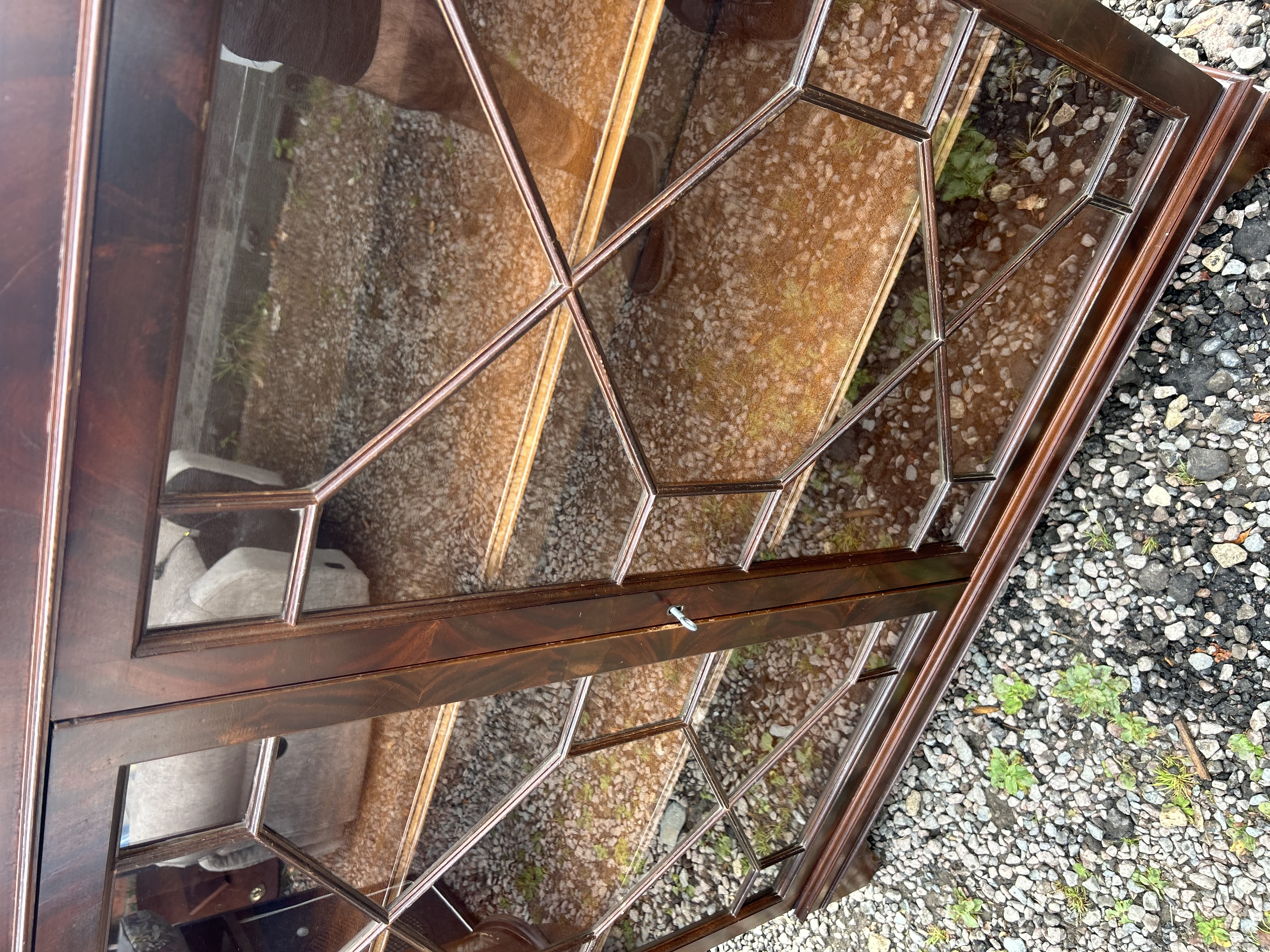 A two-door glazed display cabinet or bookcase, constructed from a dark, reddish-brown wood, likely mahogany or a similar hardwood, possibly veneered. The piece exhibits a classical revival style, emulating Georgian aesthetics, featuring a molded cornice and a plinth base. The two doors are fitted with clear glass panels, intricately divided by geometric astragal glazing bars forming diamond and hexagonal patterns. A single brass-tone key escutcheon is visible on the central stile.