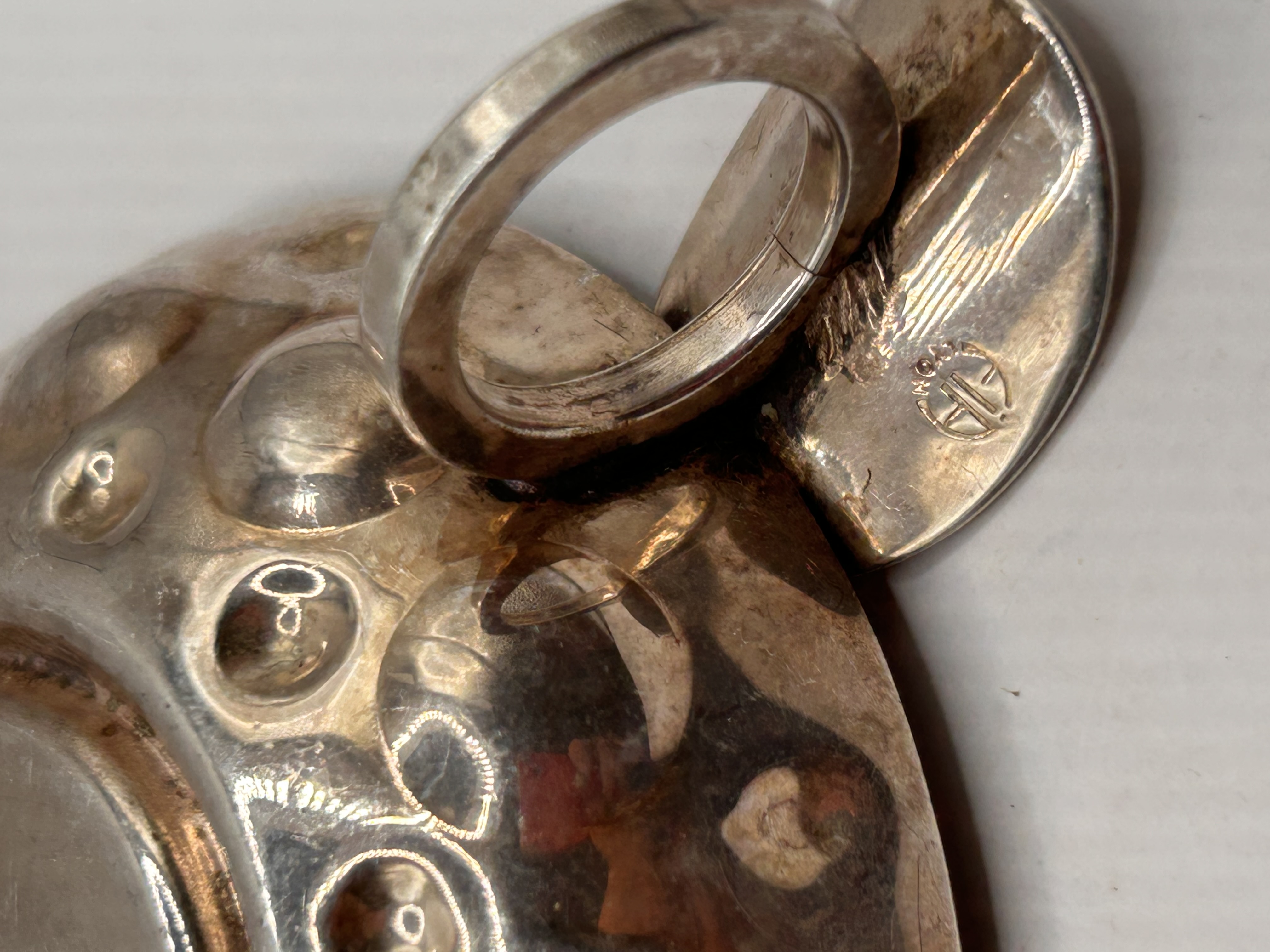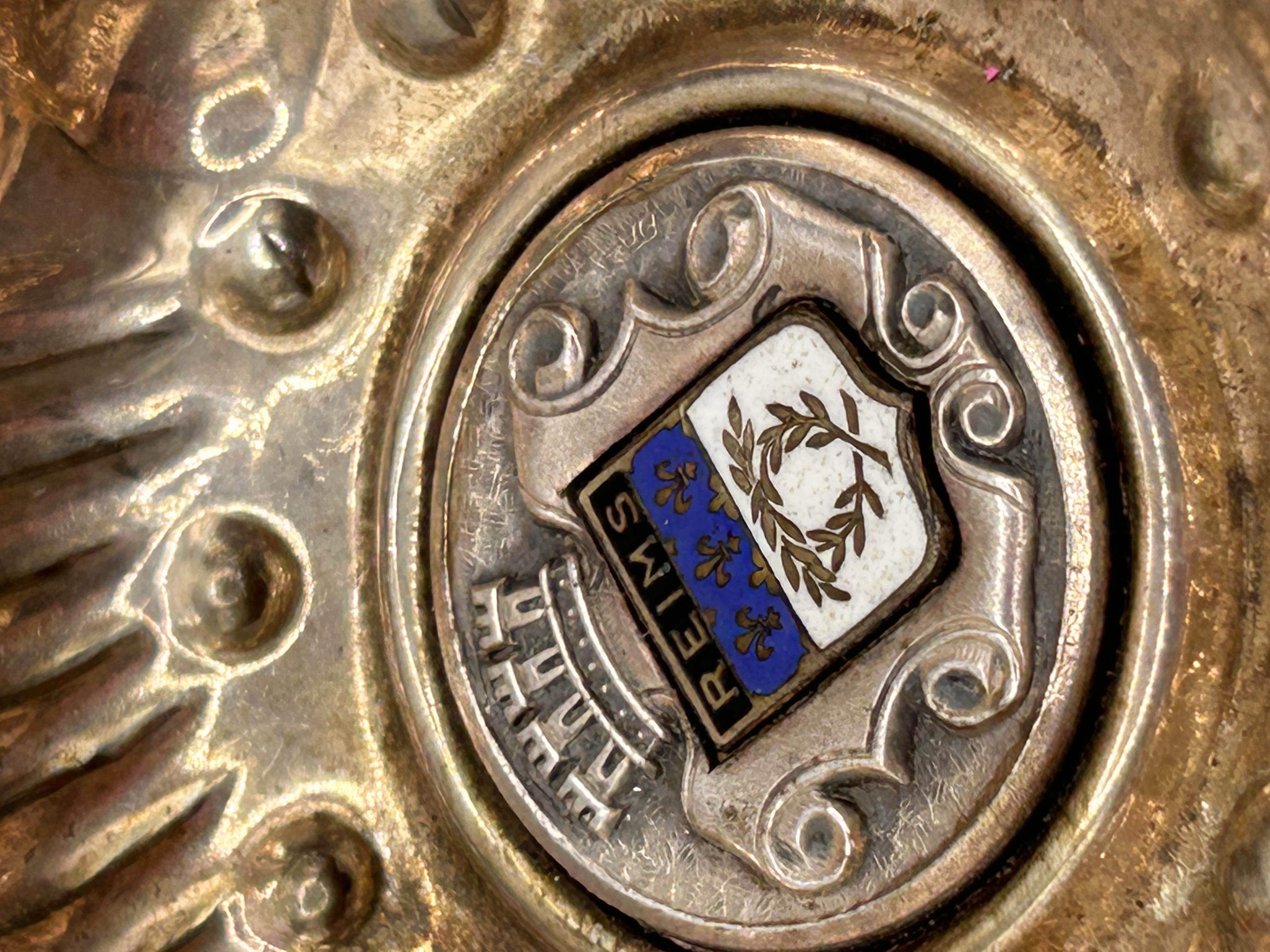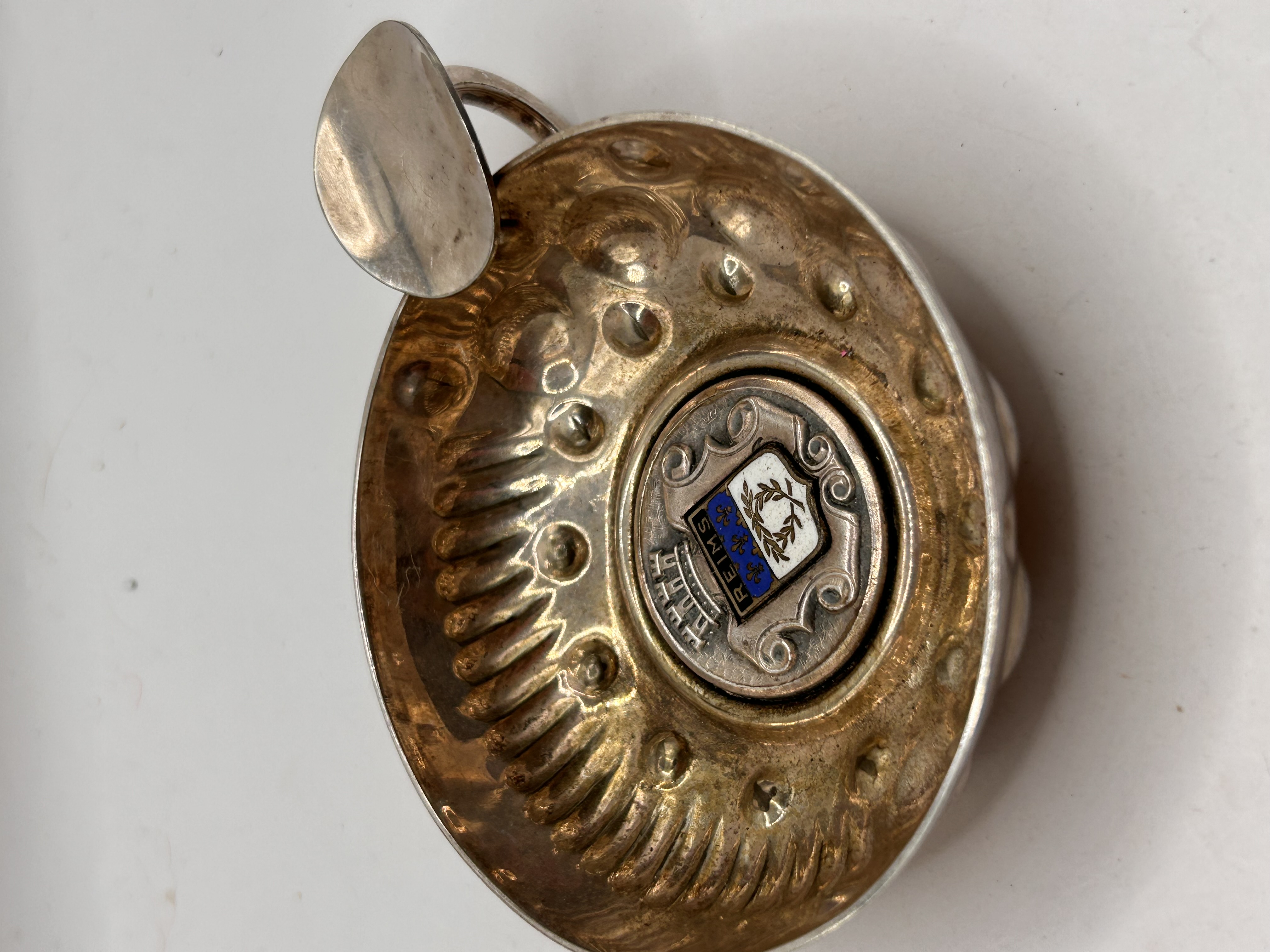 A silver plate tastevin, featuring a small, ornate dish form with a ring handle and a side rest. The interior is decorated with embossed and repoussé patterns, centering on a colorful enamel medallion. This medallion displays the coat of arms for the city of Reims, France, identifiable by the prominent ‘REIMS’ text, a mural crown, three gold fleurs-de-lis on a blue field, and a laurel branch on a white field. A small, indistinct circular hallmark is visible on the underside of the rest.