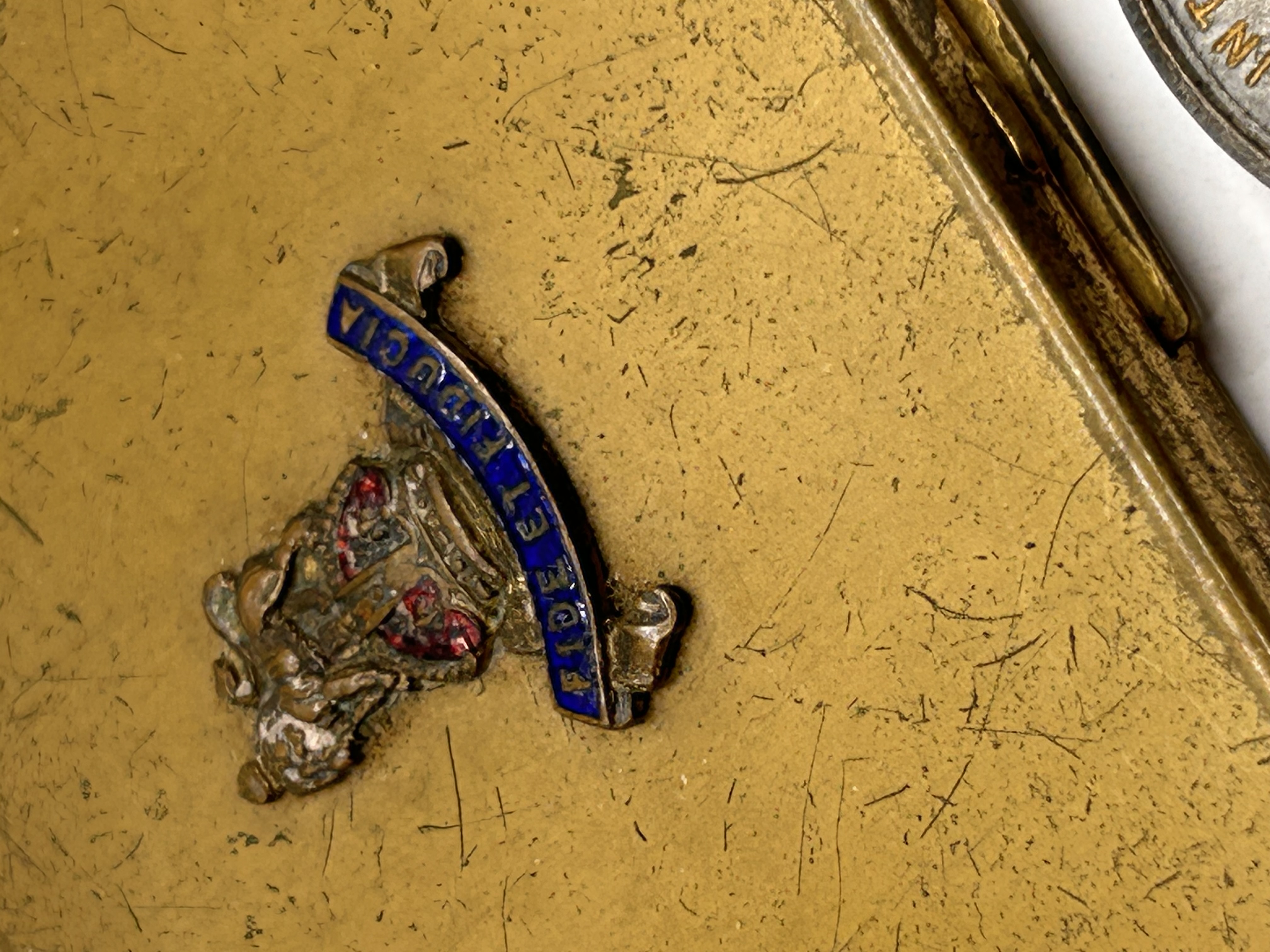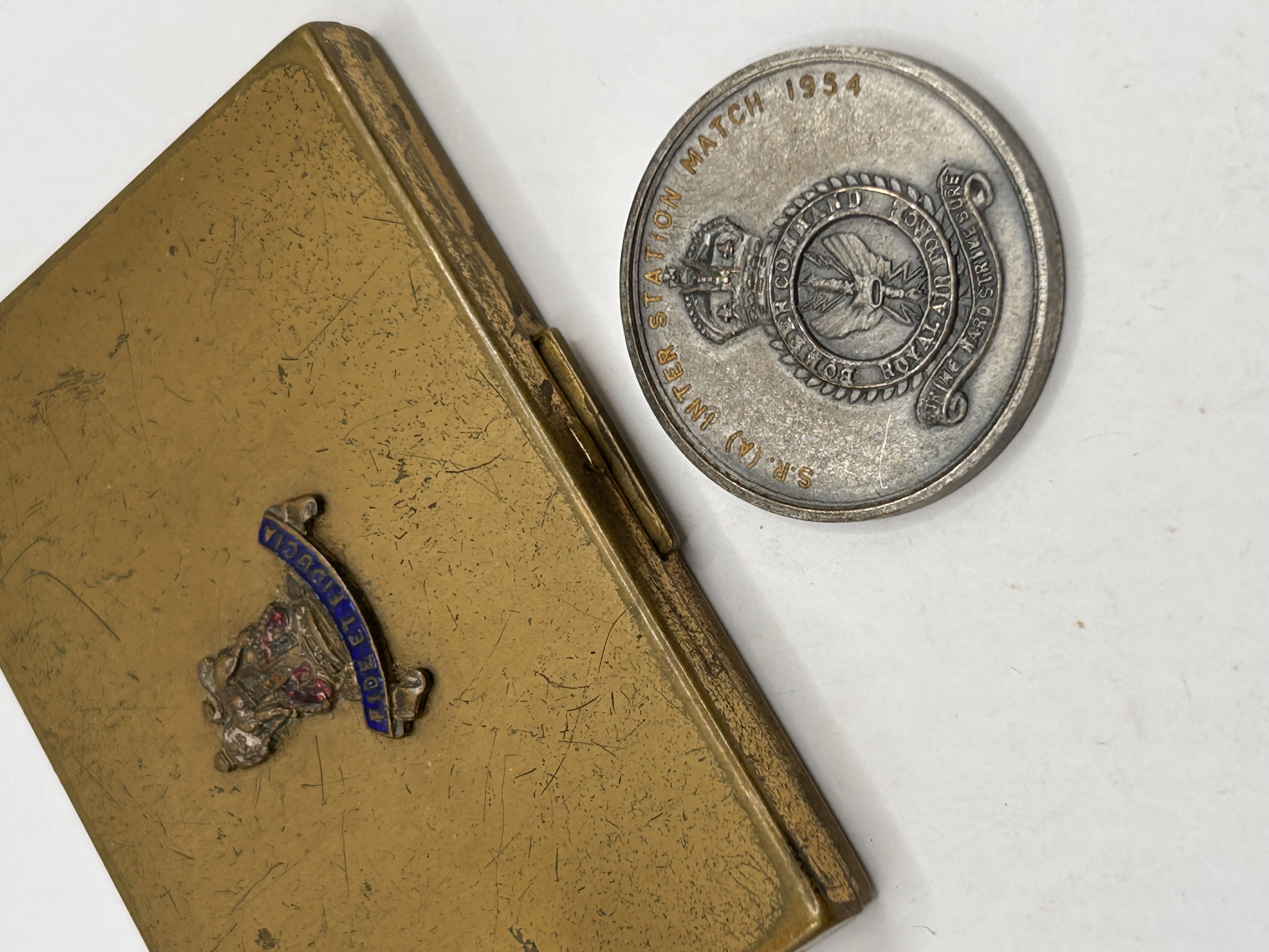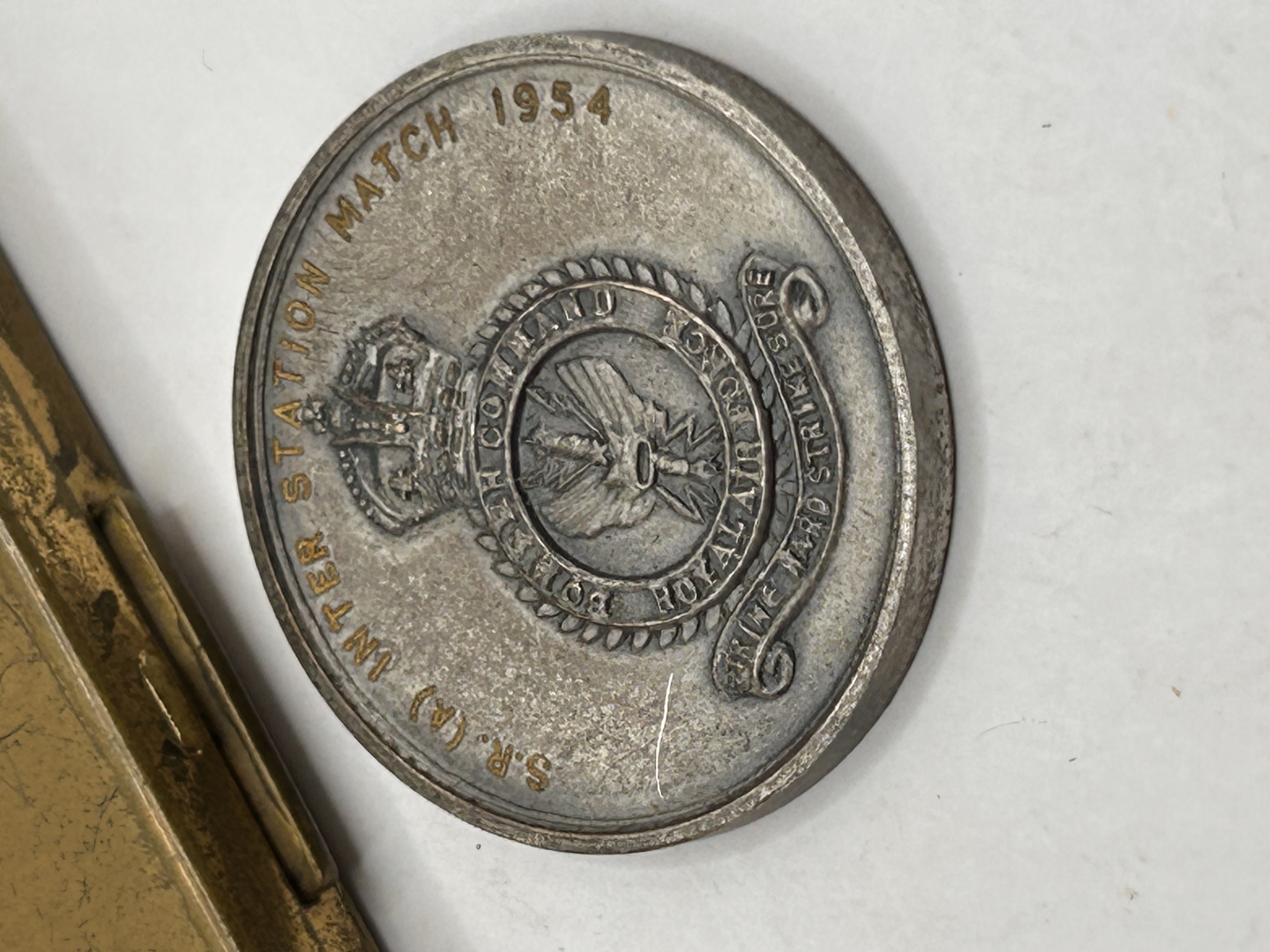 This lot comprises two items: a rectangular, hinged brass or gold-toned metal case and a circular silver-toned metal medallion. The case is adorned with an enamel-detailed military-style badge featuring a crown, lion, and a blue scroll inscribed with the Latin motto “FIDE ET FIDUCIA” (By faith and by trust). The medallion is dated “1954” and features the outer inscription “S.R. (A) INTER STATION MATCH”. Its central design includes a crown above a Royal Air Force Bomber Command emblem, depicting an eagle in flight, encircled by the text “ROYAL AIR FORCE” and “BOMBER COMMAND,” with a lower scroll bearing the English motto “STRIKE HARD STRIKE SURE.”