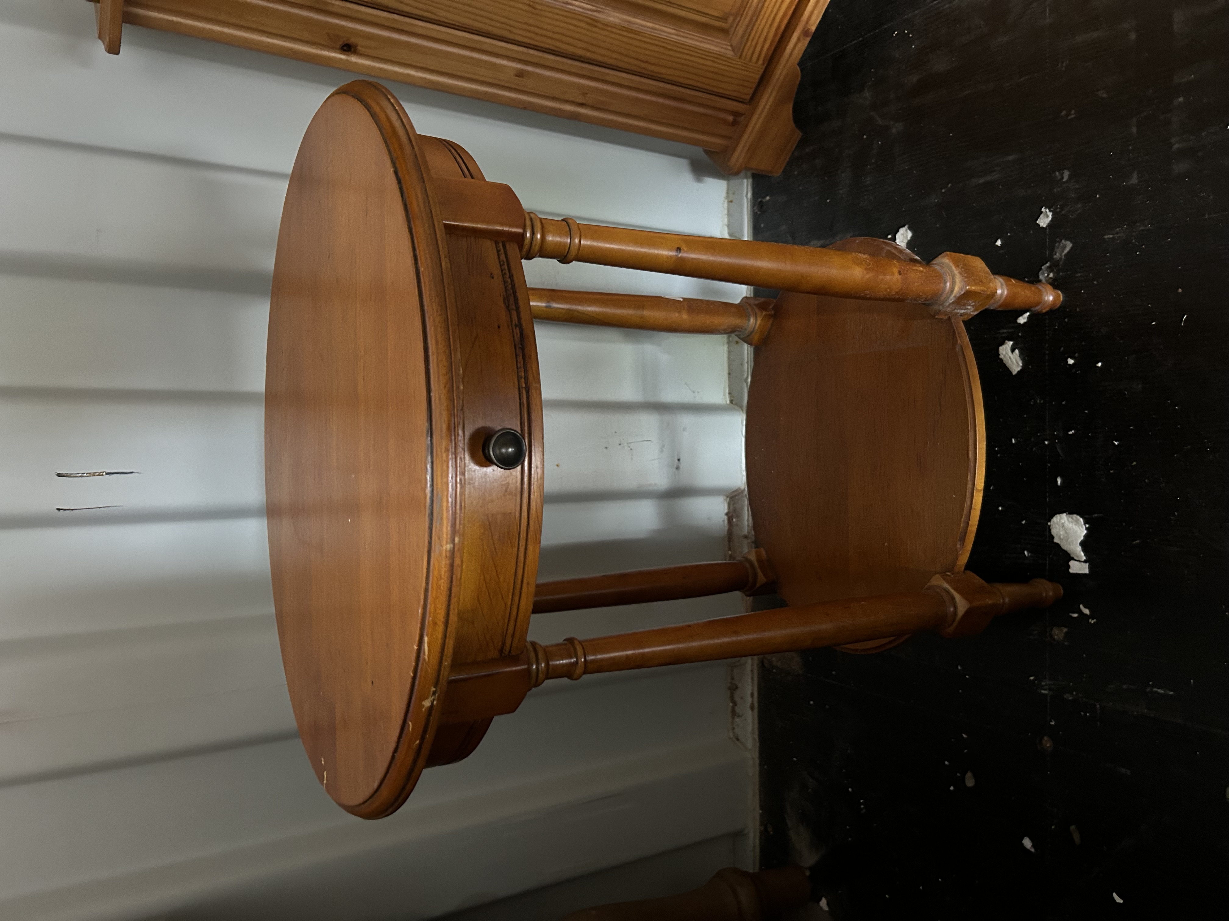 A vintage circular end table crafted from burr yew wood, featuring a reddish-brown finish. The table is designed with a single small drawer, fitted with a dark, possibly metallic, knob. It stands on four turned legs, supporting both the main circular top and a smaller, lower circular shelf.
