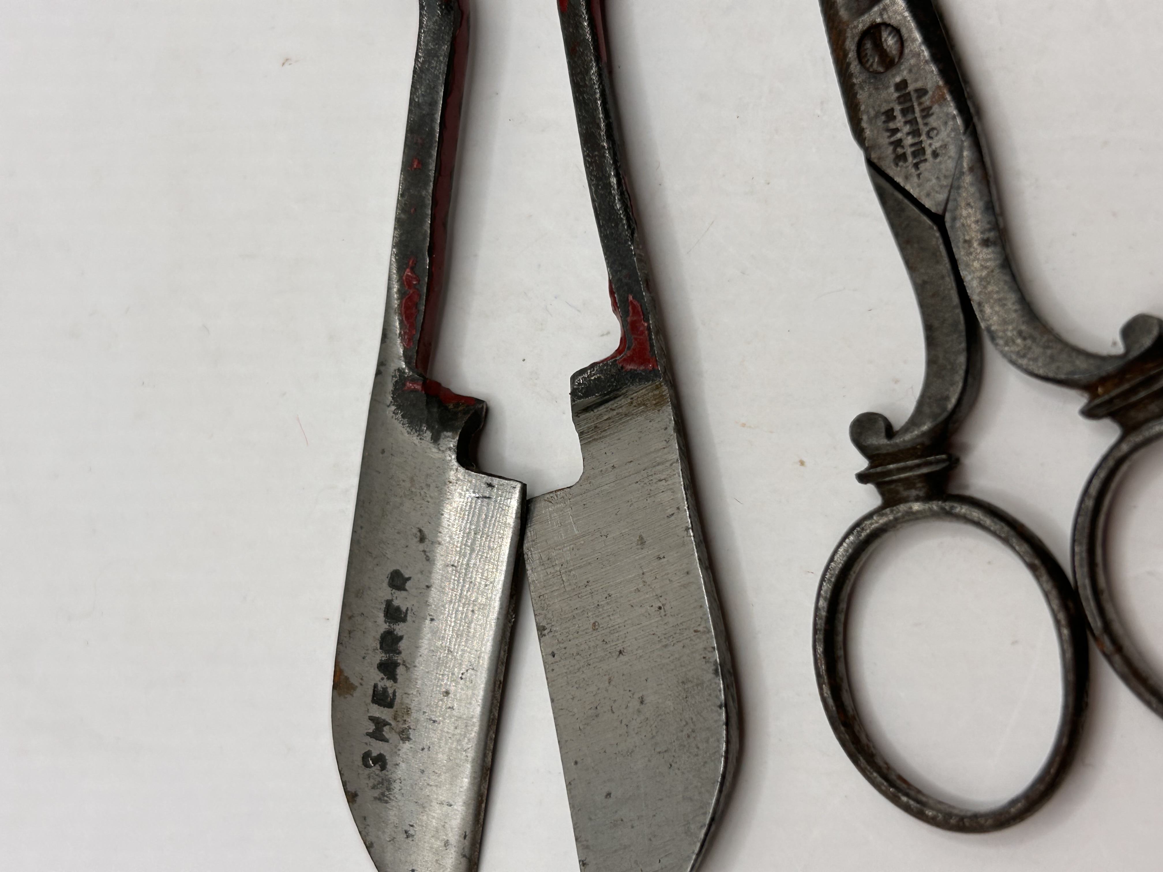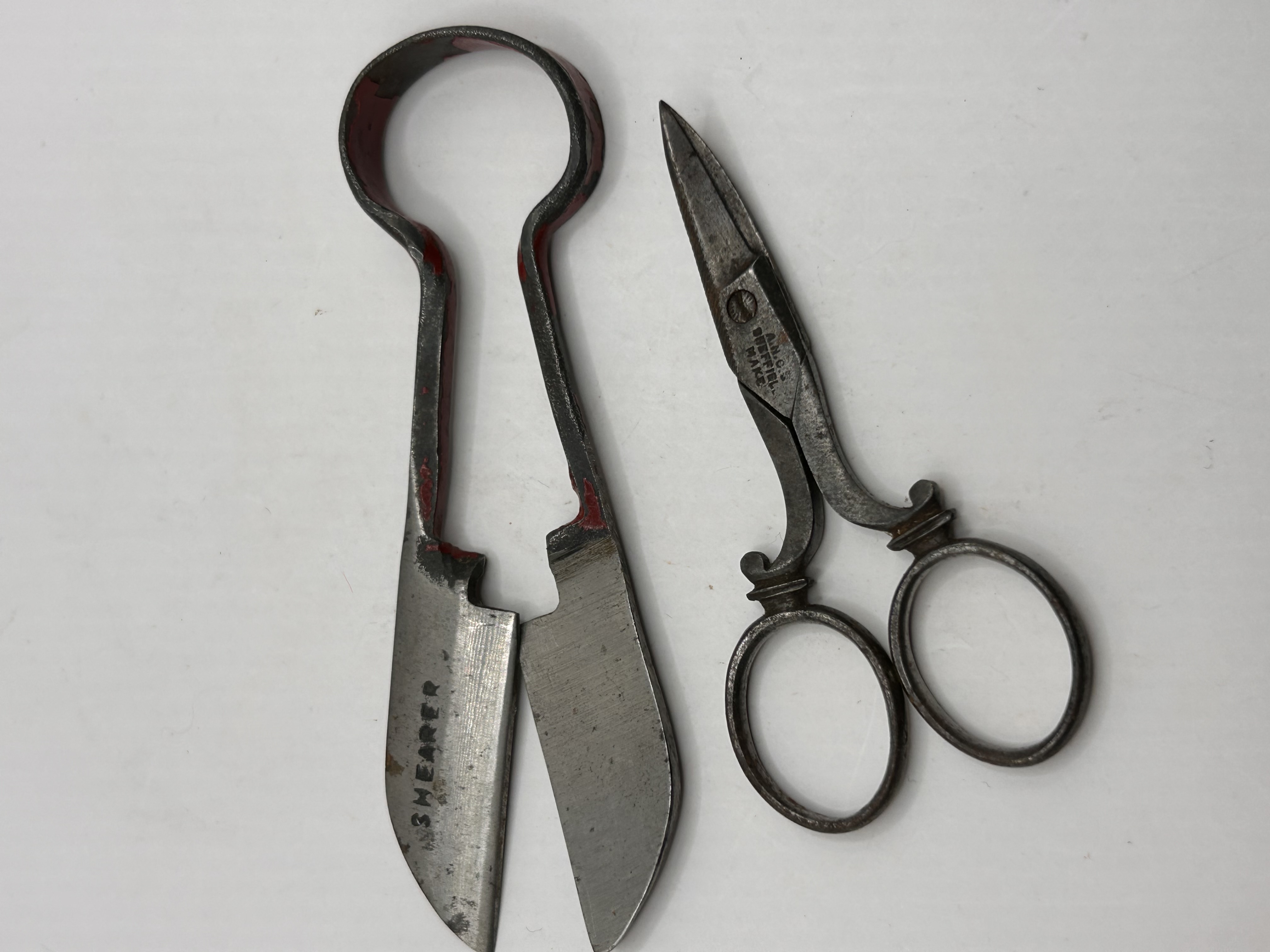 This lot comprises two distinct metal cutting tools. The larger item is a pair of antique hand-operated sheep shears, featuring two broad blades joined by a flexible, spring-loop handle. One blade is stamped ‘3 SHEARER,’ indicating its function. The smaller item is a pair of heavy-duty, pivot-style scissors with two finger loops. Visible markings on one blade include ‘A.H.C.L.’ and ‘SHEFFIELD MADE,’ denoting its manufacture in Sheffield, England, a historically renowned center for cutlery. Both objects are constructed from steel or cast iron.