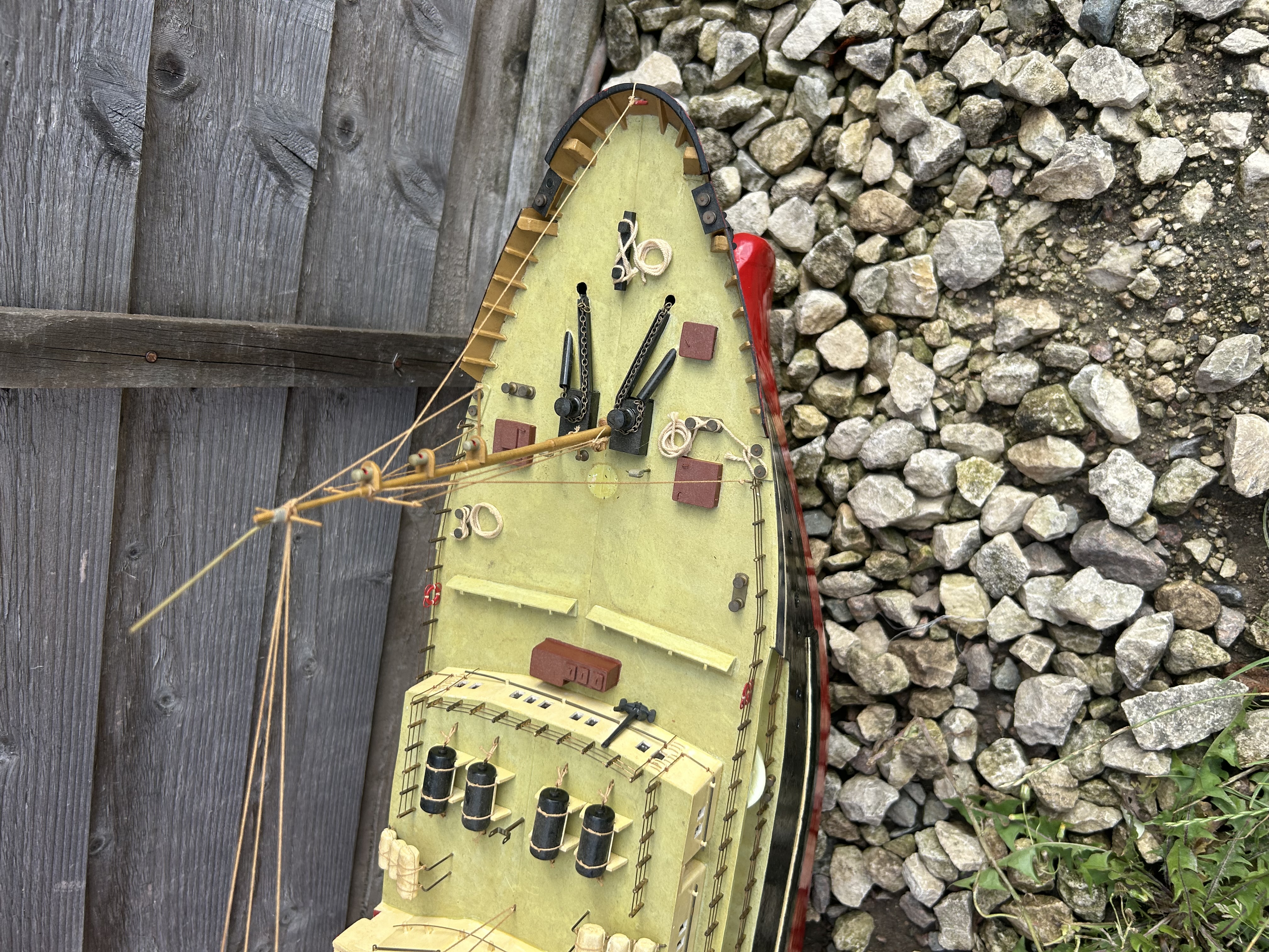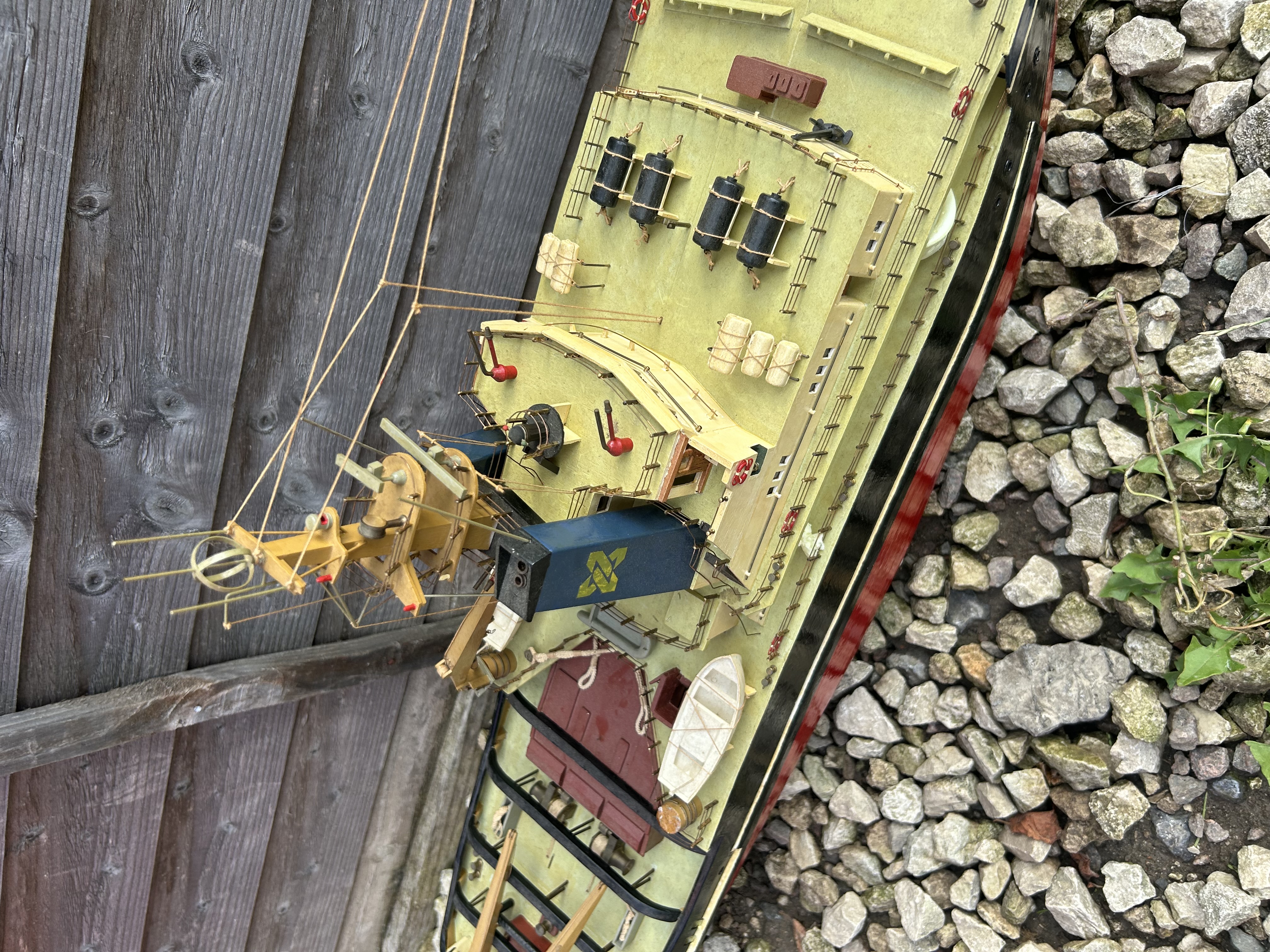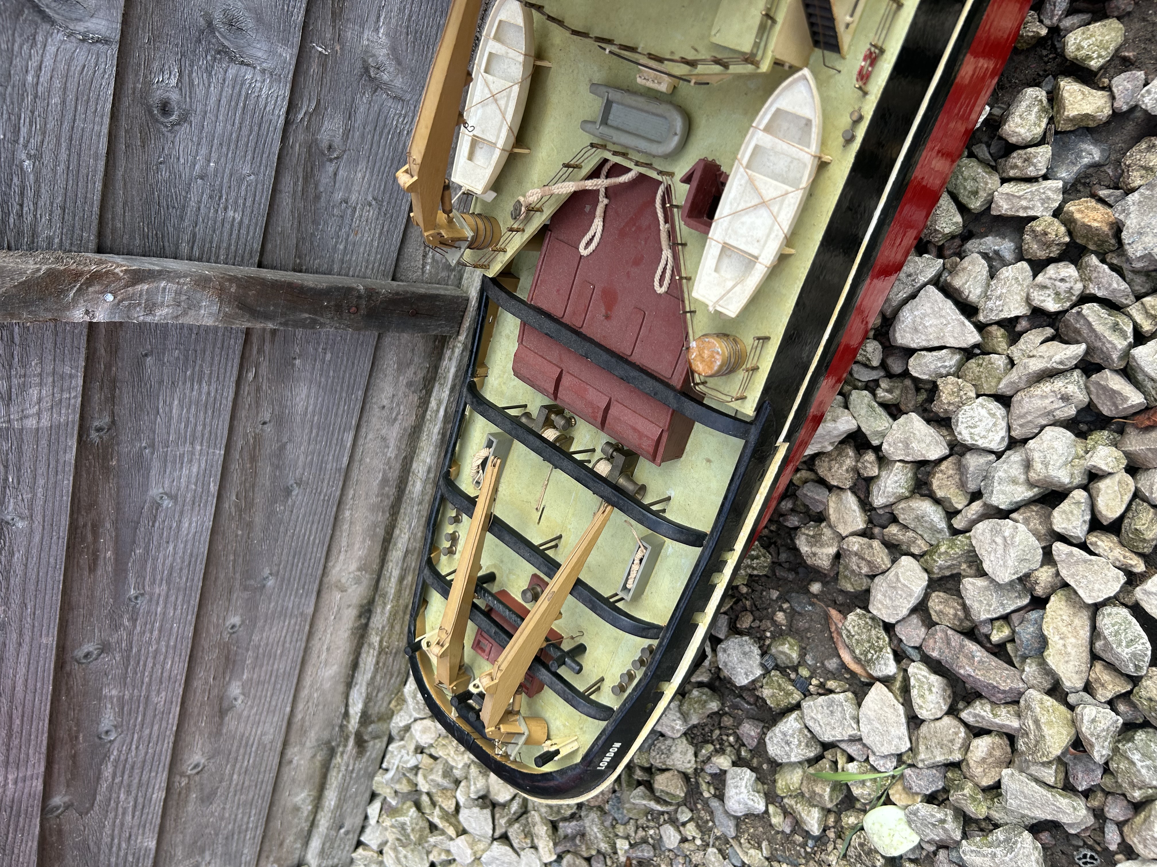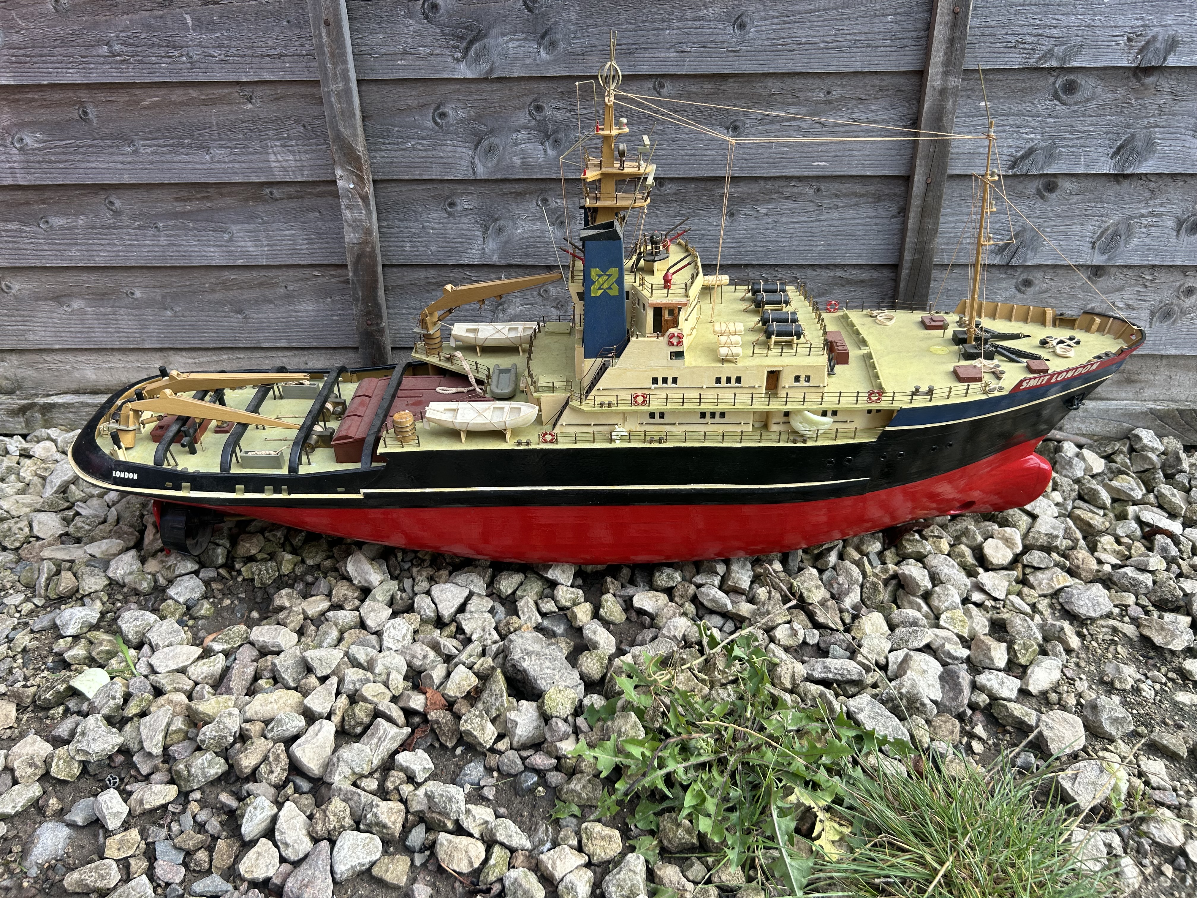 A detailed, realistic scale model of a mid-20th century vessel, likely an icebreaker or robust tugboat, characterized by its sturdy hull and deck equipment. Constructed primarily from painted wood with fine plastic and metal details, the model features a red lower hull, a black upper hull, and cream-yellow deck and superstructure. Visible text includes ‘LONDON’ on the stern and ‘ARCTIC LONDON’ on the bow, while the blue funnel displays a distinct yellow stylized emblem. The model is complete with intricate rigging, lifeboats, and deck fittings.