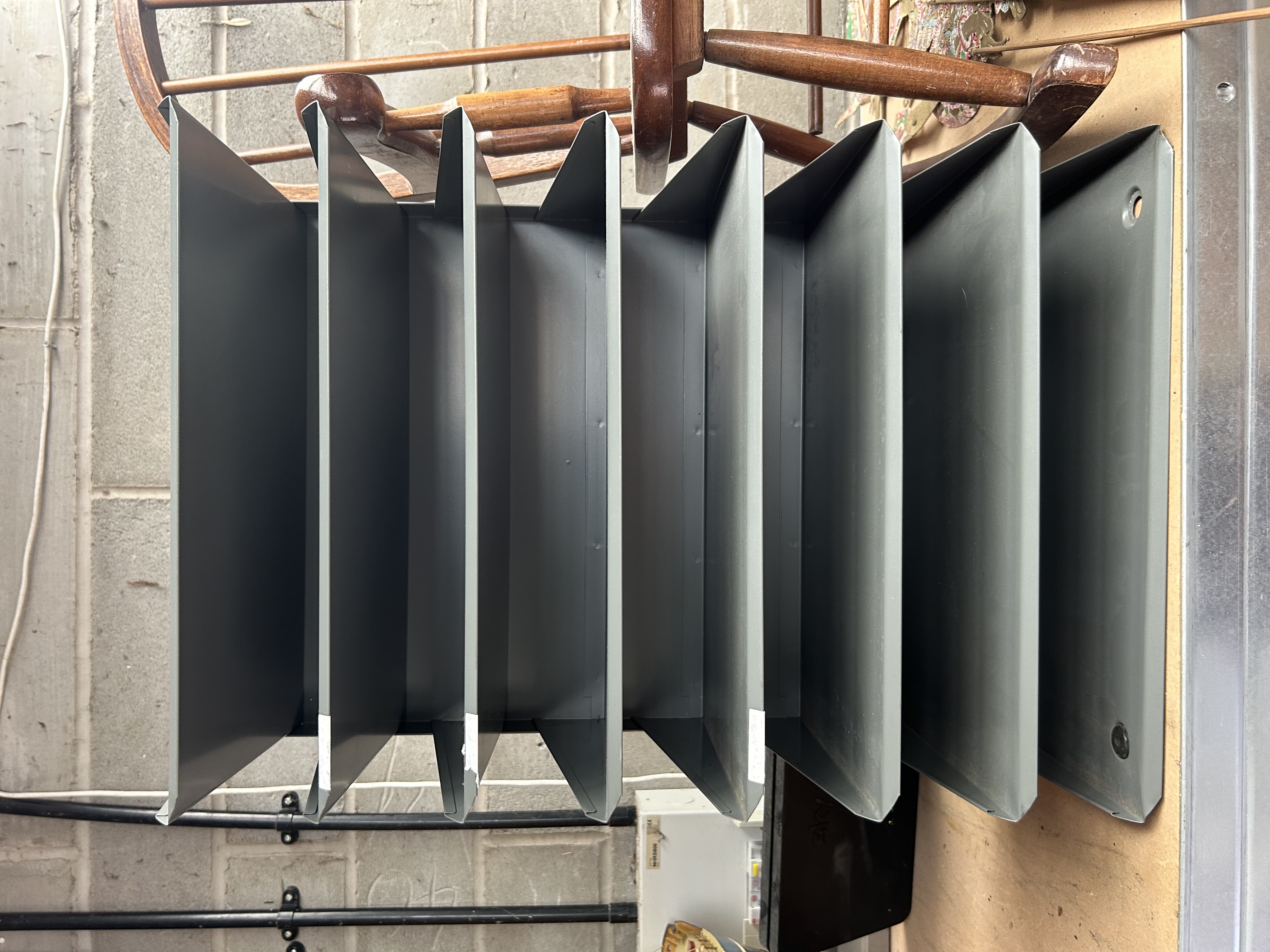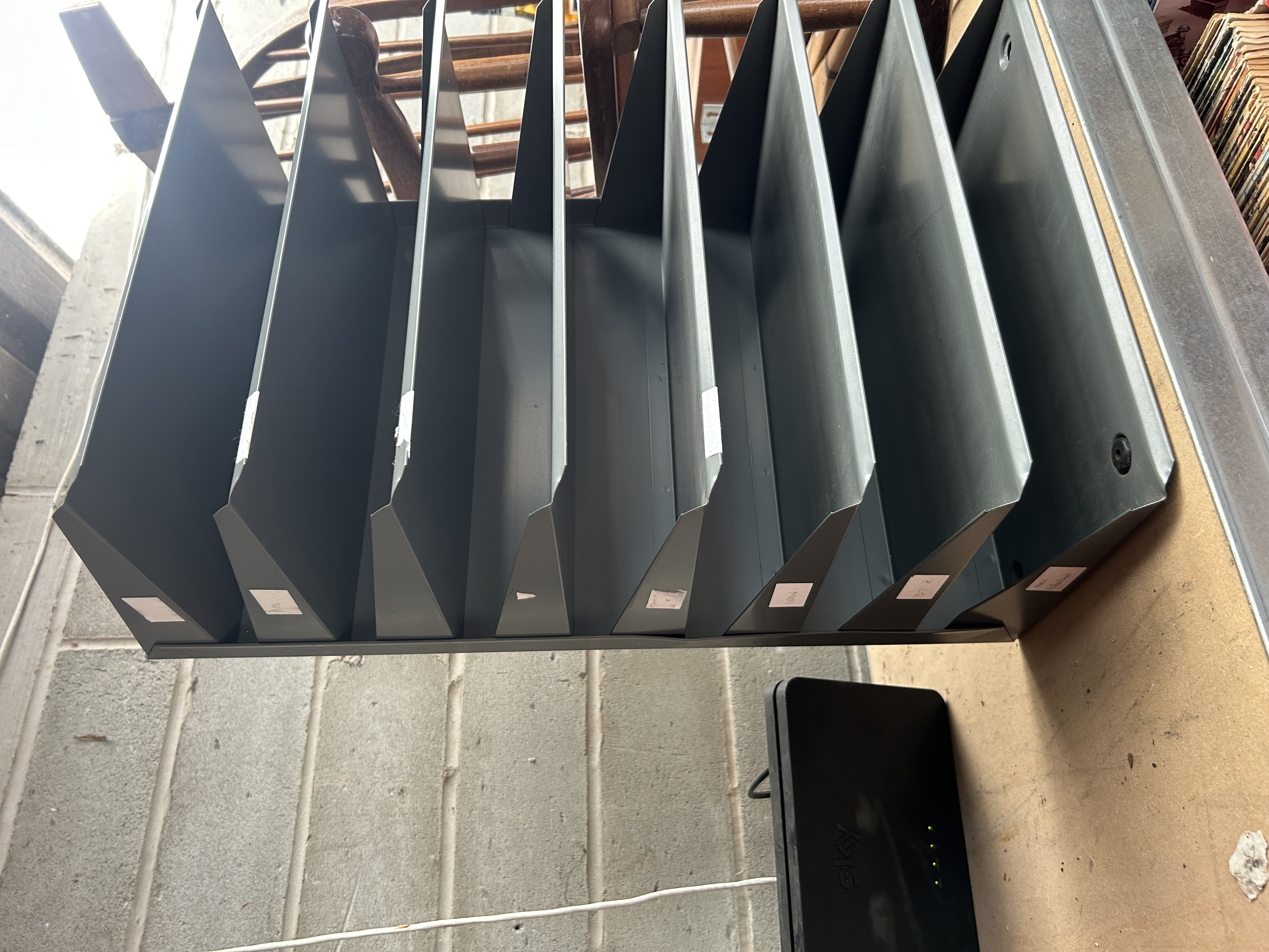 A Bisley multi-tiered steel document sorting rack, constructed from dark grey, likely painted or powder-coated metal. It features eight angled horizontal shelves, presenting a utilitarian, industrial style suitable for office or workshop environments. Small, rectangular white labels are affixed to the front edge of each shelf, but any text on these is illegible.