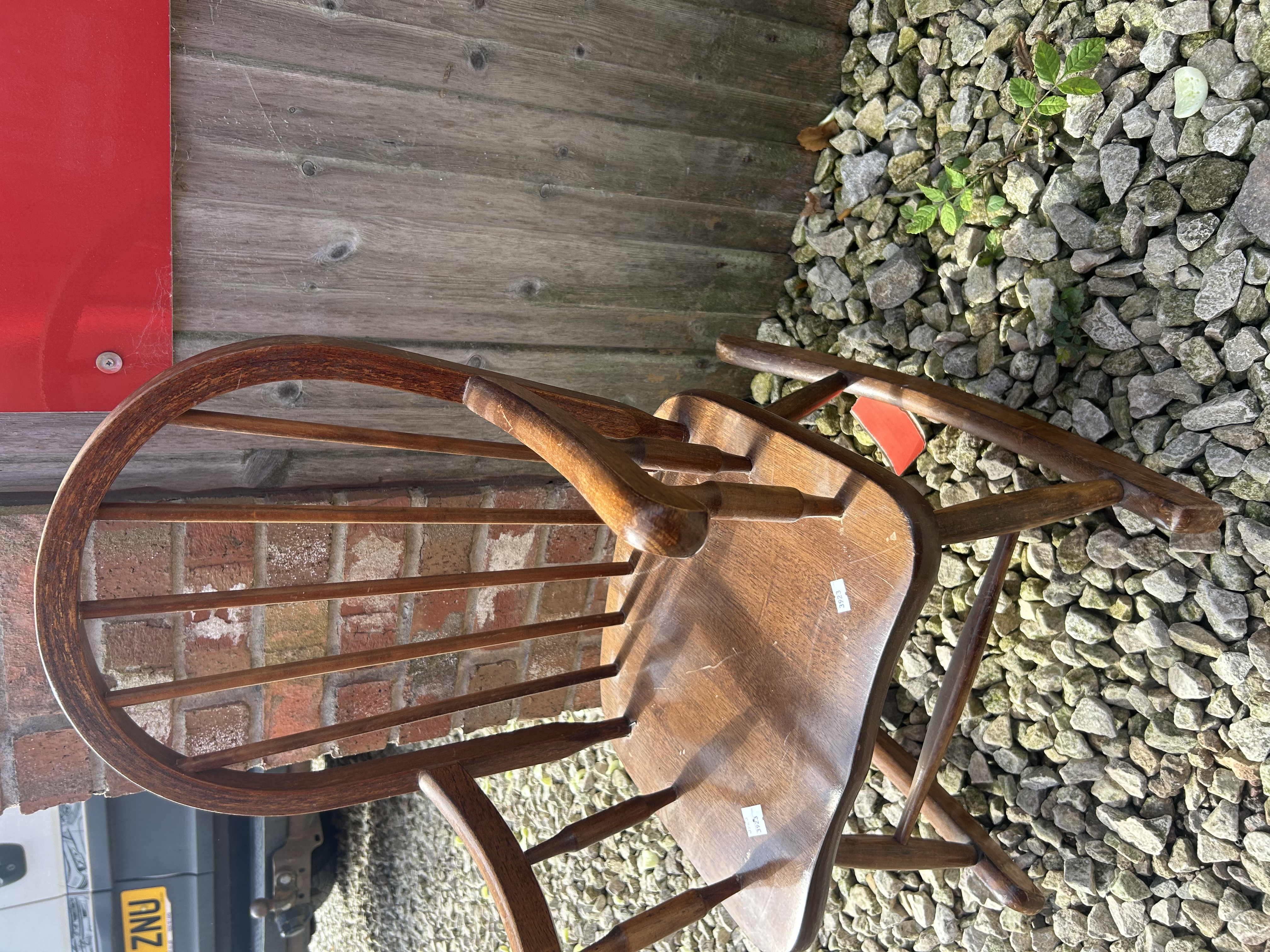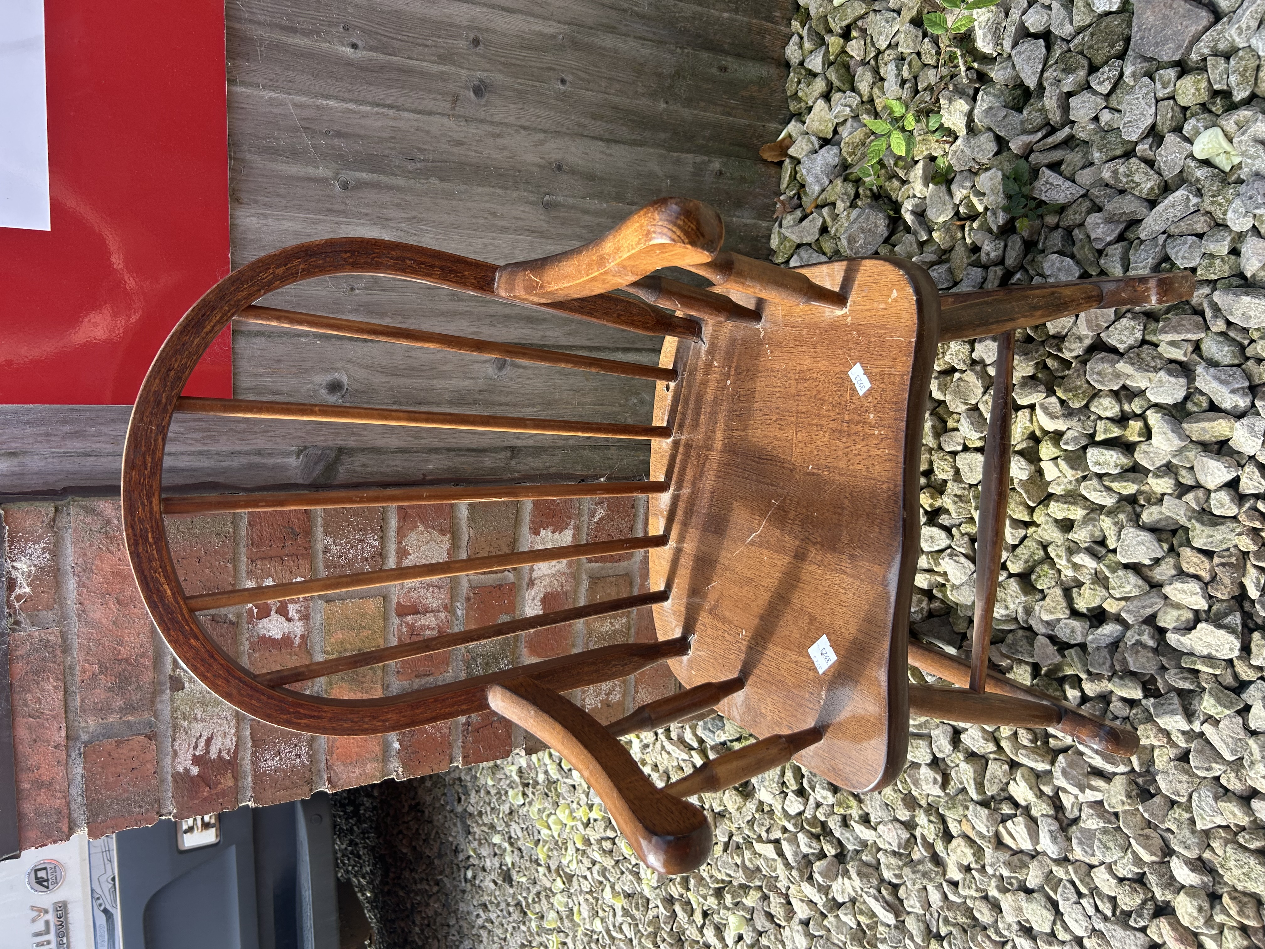 An Antique 19th Century Oak Spindle Back Windsor Rocking Chair. The chair features a bow-back with a spindle backrest and turned arms. Constructed from a medium-brown stained wood, consistent with oak. The flat seat has two small white adhesive labels, one clearly displaying “£45”. A small red tag is visible near one of the rear legs.