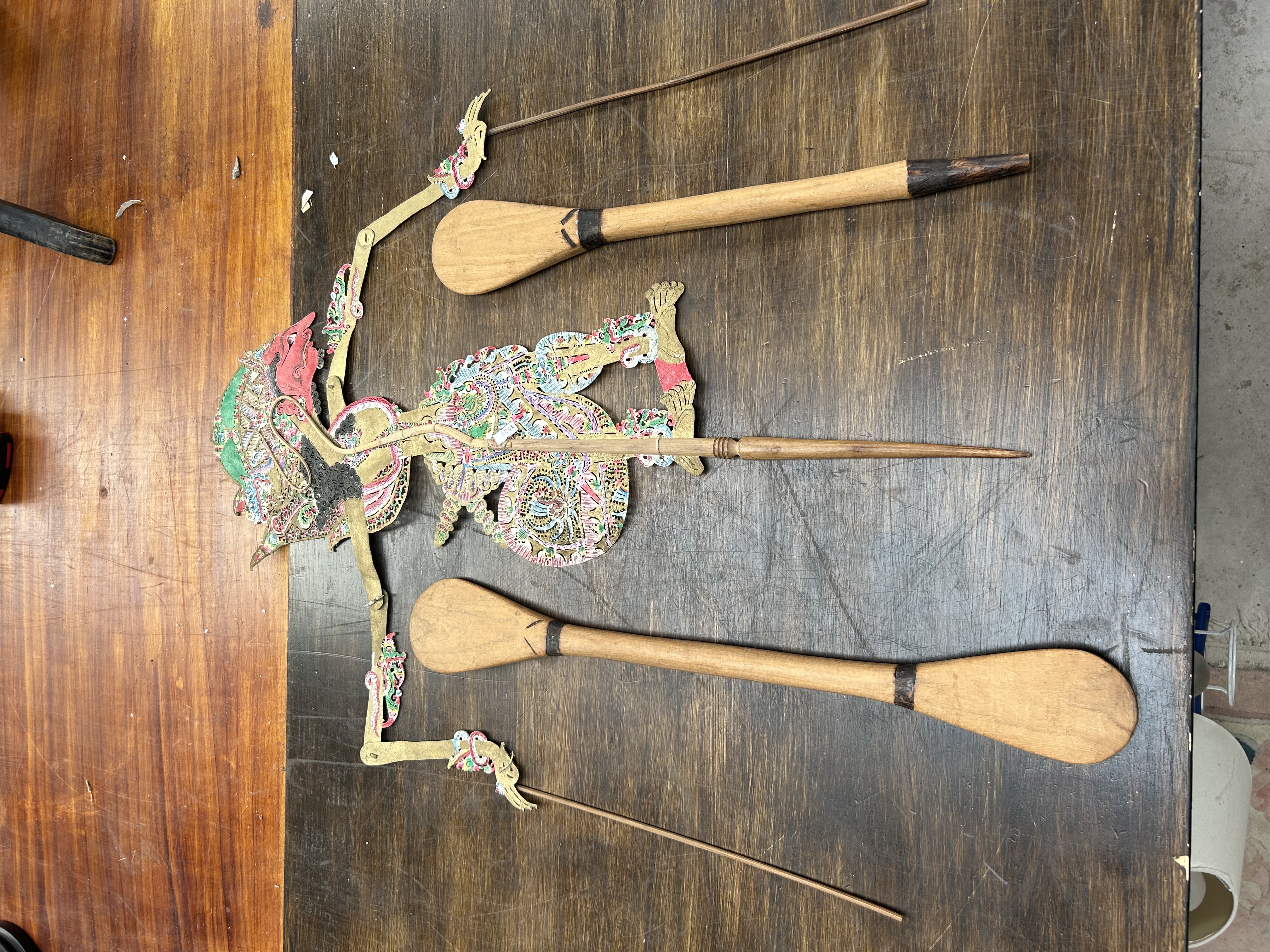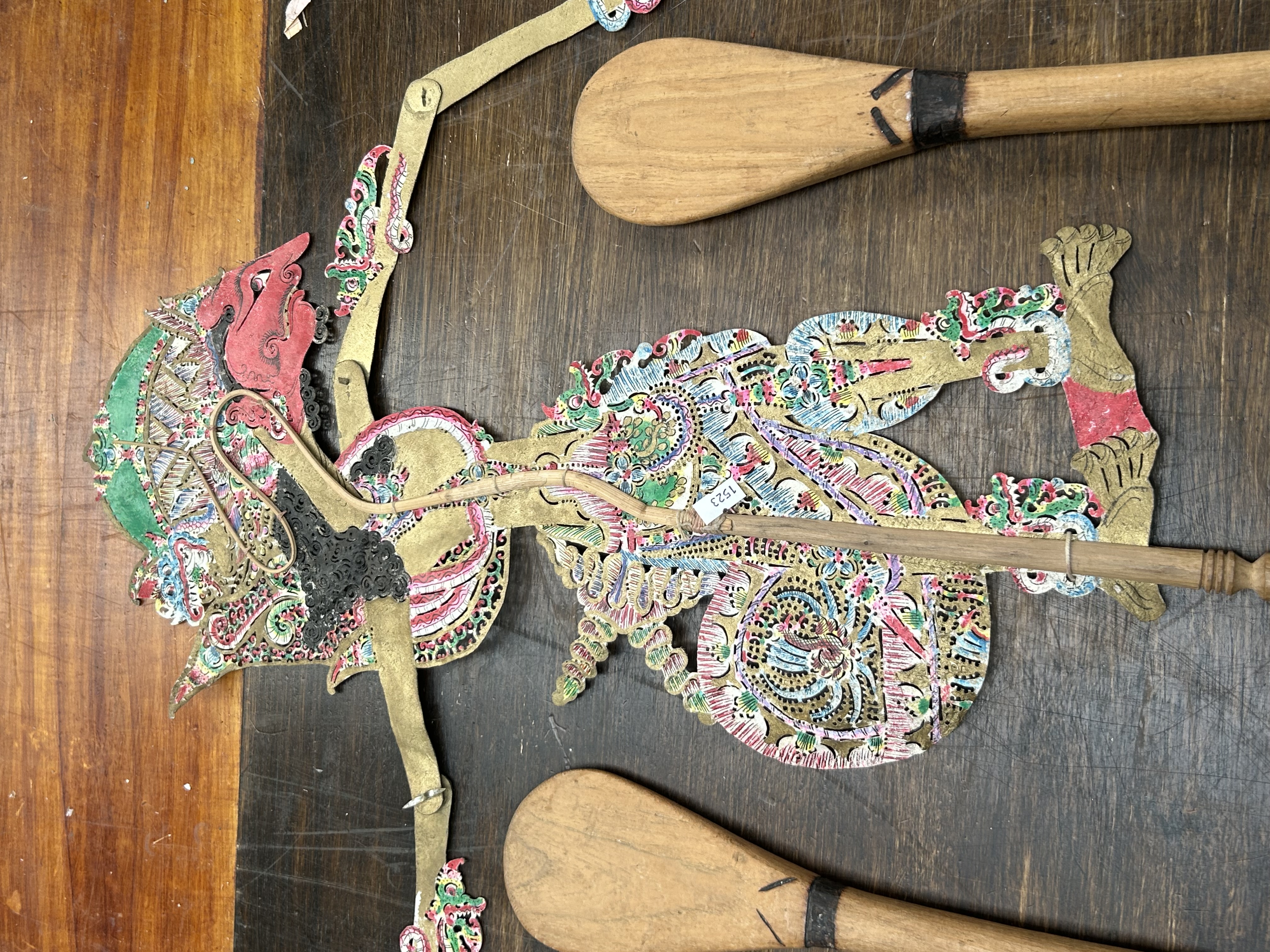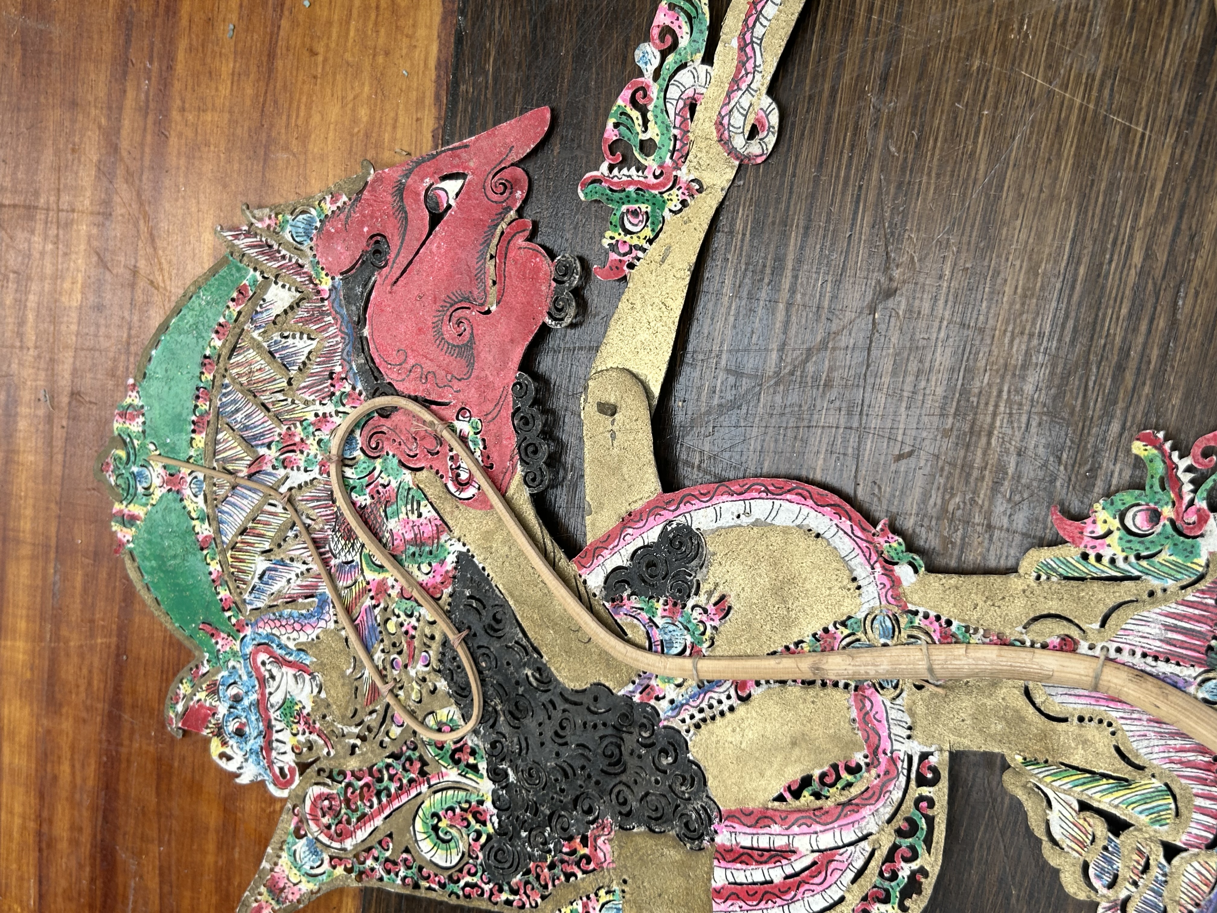 An Indonesian Wayang Kulit shadow puppet, crafted from intricately cut and pierced animal hide. The flat, articulated puppet features extensive polychrome hand-painting in vibrant reds, greens, blues, pinks, and blacks, accented with gold-colored gilding throughout its highly stylized form, which includes a prominent red-faced head and an elaborate headdress. It is accompanied by three wooden control rods: a central pointed spike and two thinner rods with paddle-shaped handles for manipulating the articulated arms. A small white handwritten tag, not clearly legible for translation, is affixed to the central control rod.