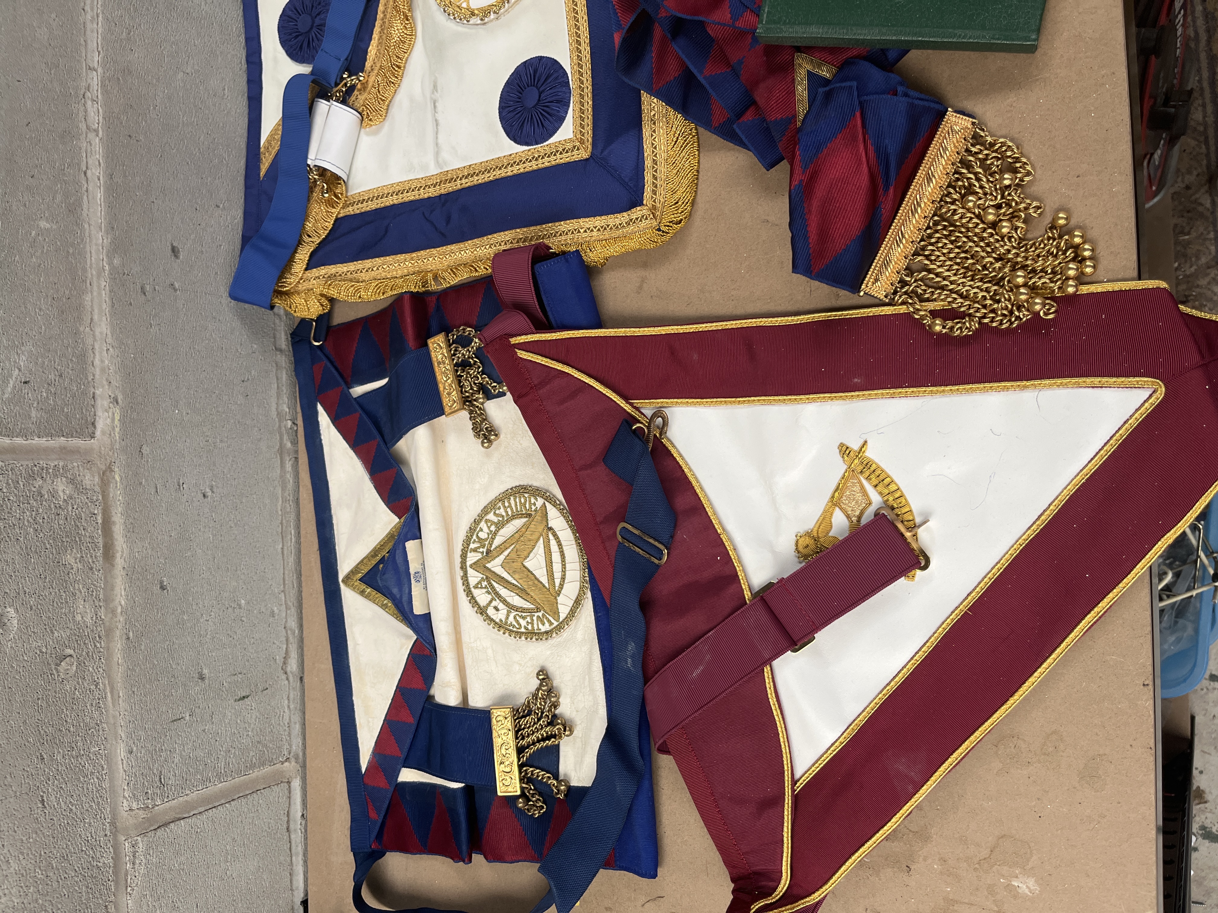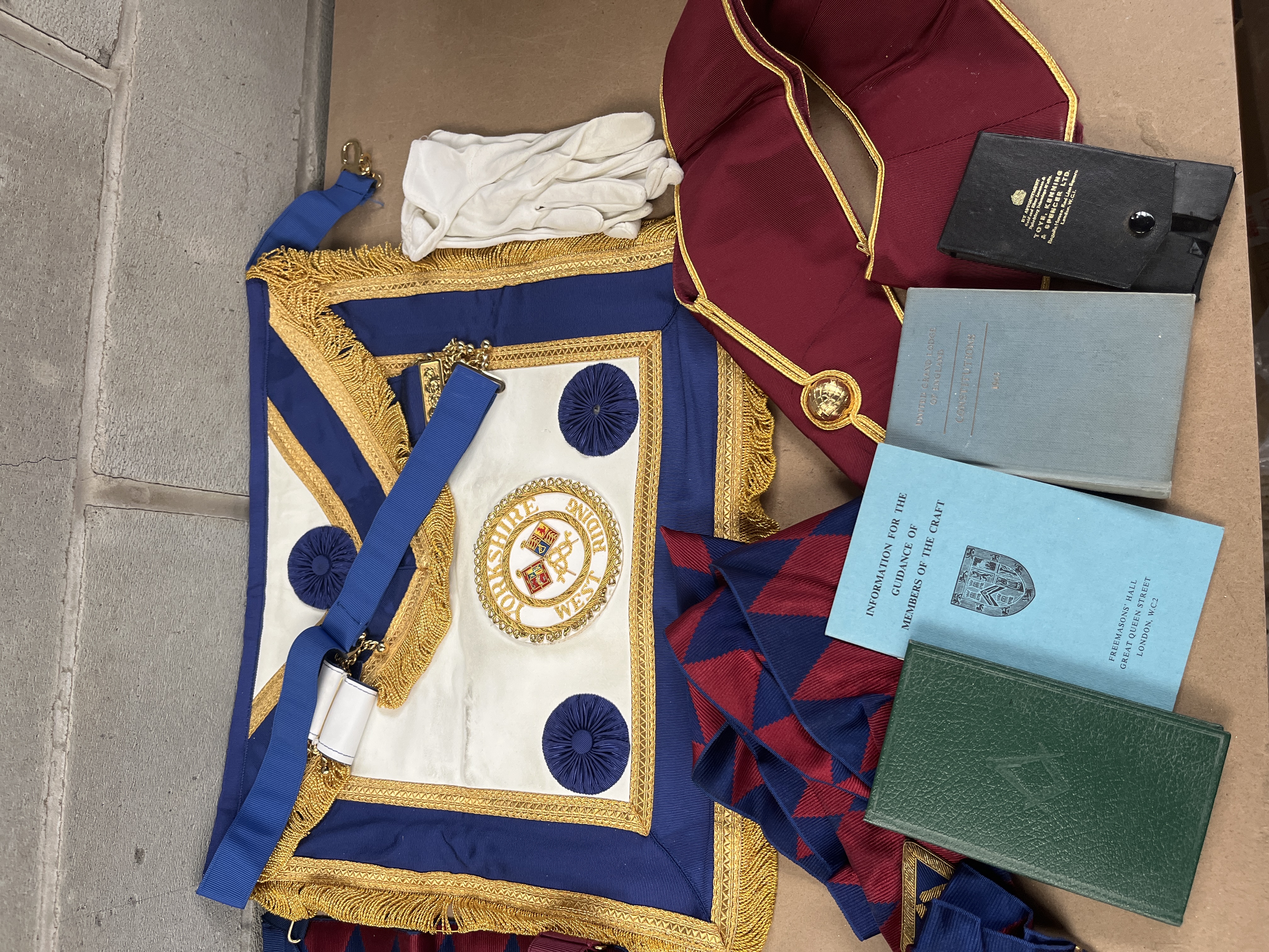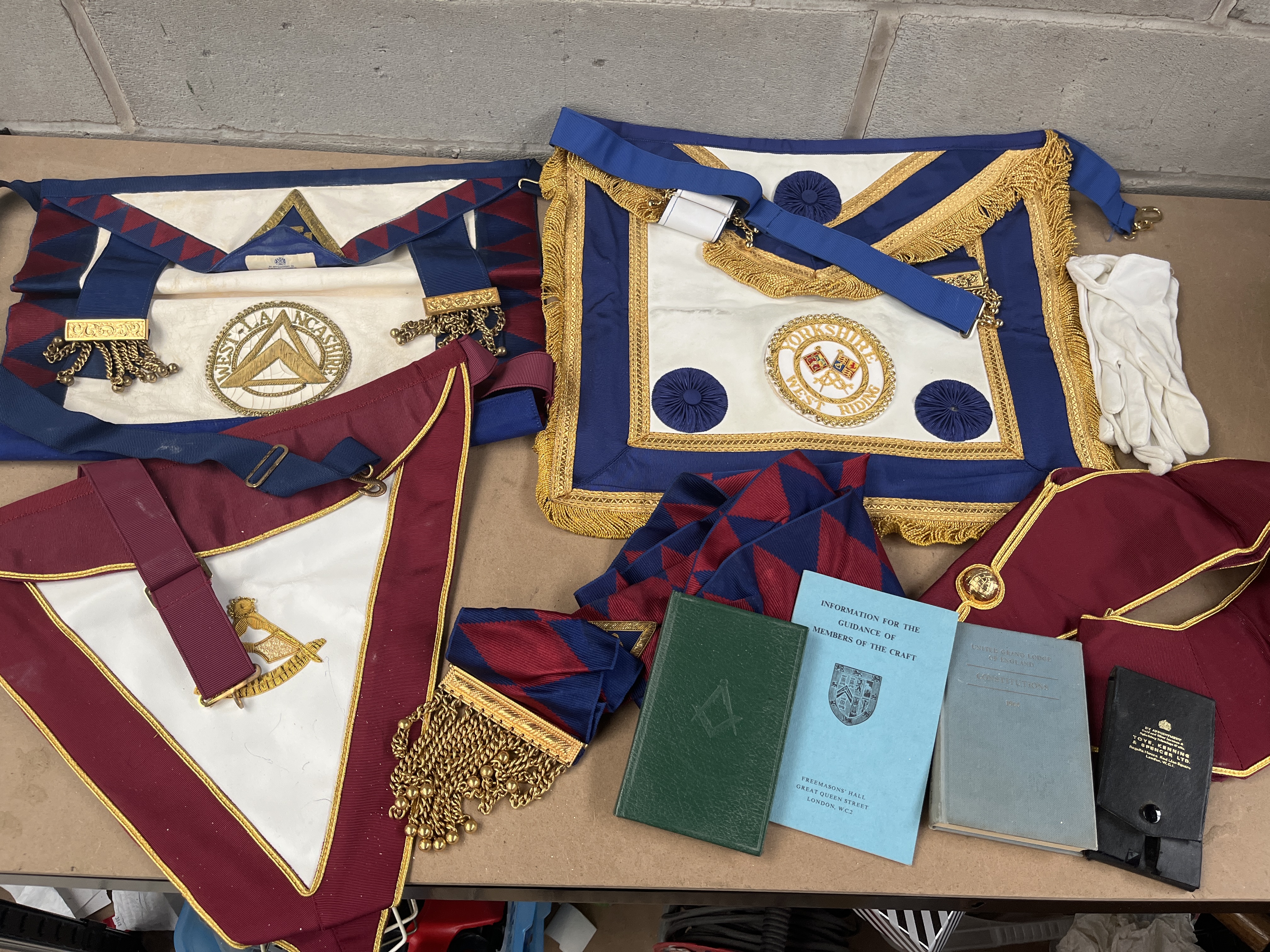 A collection of 20th Century Masonic regalia and related ephemera. The lot primarily includes several fabric aprons and sashes in white, royal blue, and maroon or patterned blue/red, adorned with intricate gold-colored metallic embroidery, fringes, and symbolic emblems. Visible text on the aprons indicates specific lodges or provinces such as “WEST YORKSHIRE” and “YORKSHIRE NORTH AND EAST RIDINGS.” The collection also features a matching maroon cap, a pair of white gloves, and a small assortment of booklets, including “INFORMATION FOR THE GUIDANCE OF MEMBERS OF THE CRAFT” from “FREEMASONS’ HALL, GREAT QUEEN STREET, LONDON W.C.2,” a “CONSTITUTION” volume, and a small item from “E. WYLIE, TYLER, Masonic Furnisher.” Constructed from various textiles and paper.