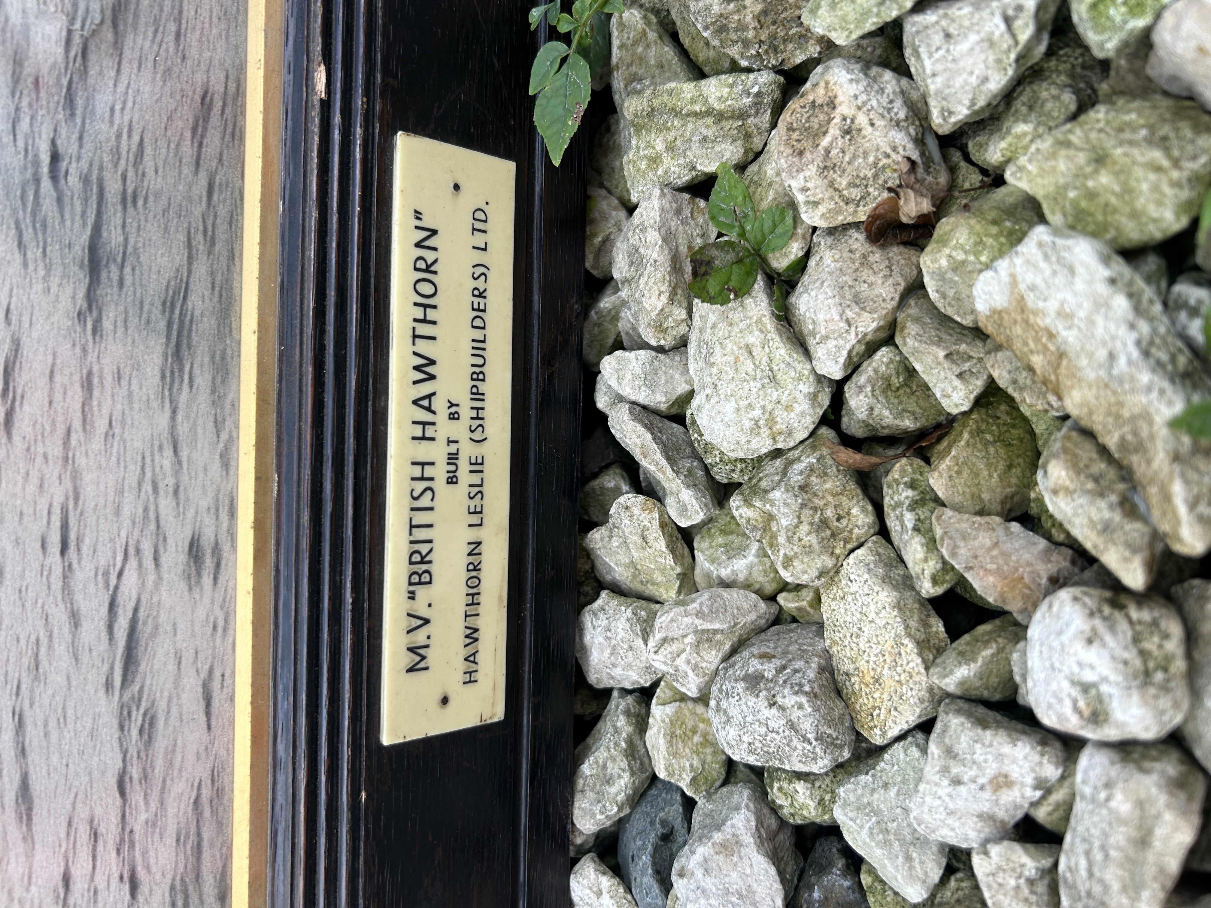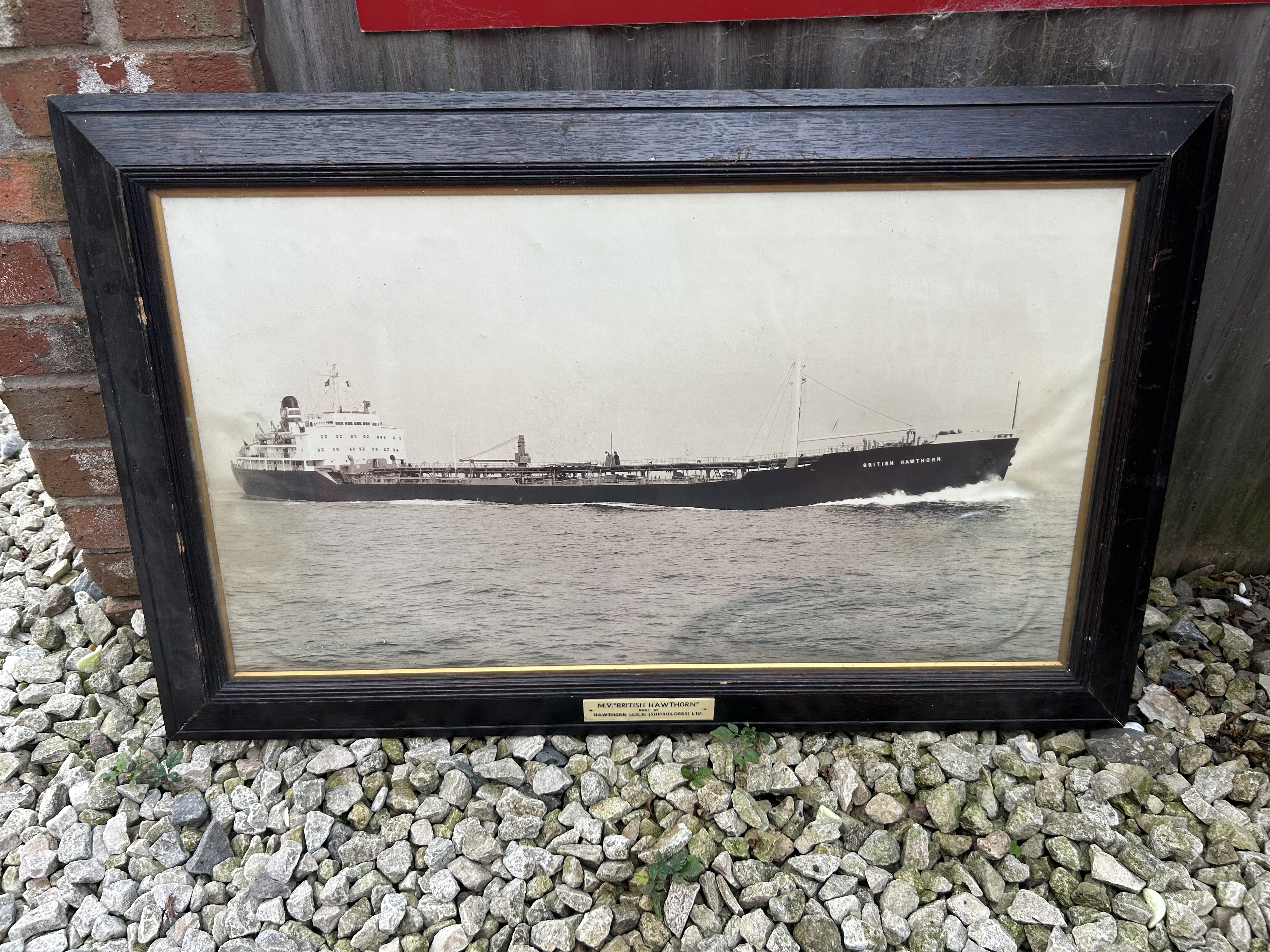 A large, framed black and white photograph or print depicting the merchant vessel “M.V. British Hawthorn” at sea, captured in a style indicative of the mid-20th century. The print is presented in a substantial dark-stained wooden frame with a gilded inner slip. A cream-colored rectangular plaque is affixed to the lower frame, clearly inscribed: “M.V. “BRITISH HAWTHORN”” “BUILT BY HAWTHORN LESLIE (SHIPBUILDERS) LTD.”.