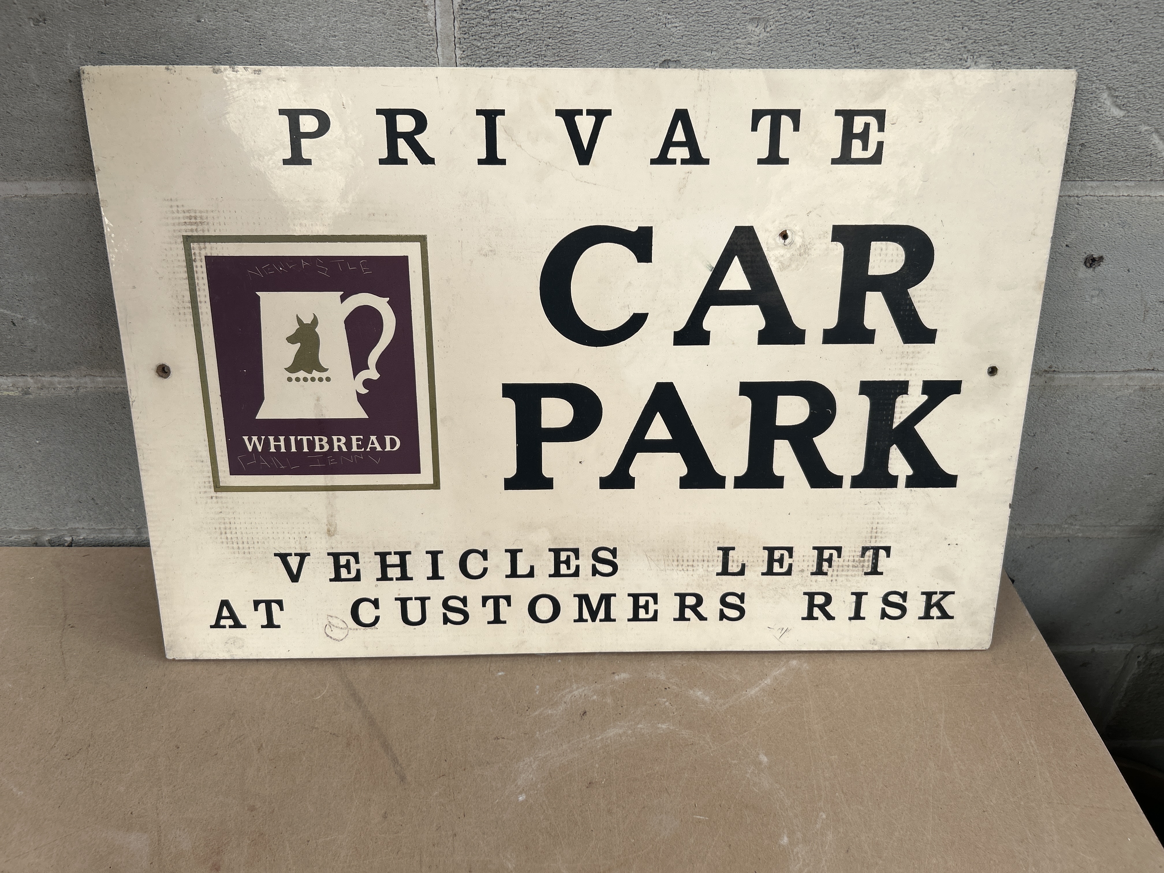 A vintage painted wood or hardboard sign, likely dating to the mid-20th century. The sign features an off-white background with black serif lettering. The primary text reads “PRIVATE CAR PARK” and “VEHICLES LEFT AT CUSTOMERS RISK”. A rectangular graphic on the left side, colored dark purple with a light border, contains a white stylized tankard logo with an animal figure, accompanied by the white text “NEWCASTLE”, “WHITBREAD”, and “PALE ALE & STOUT”.