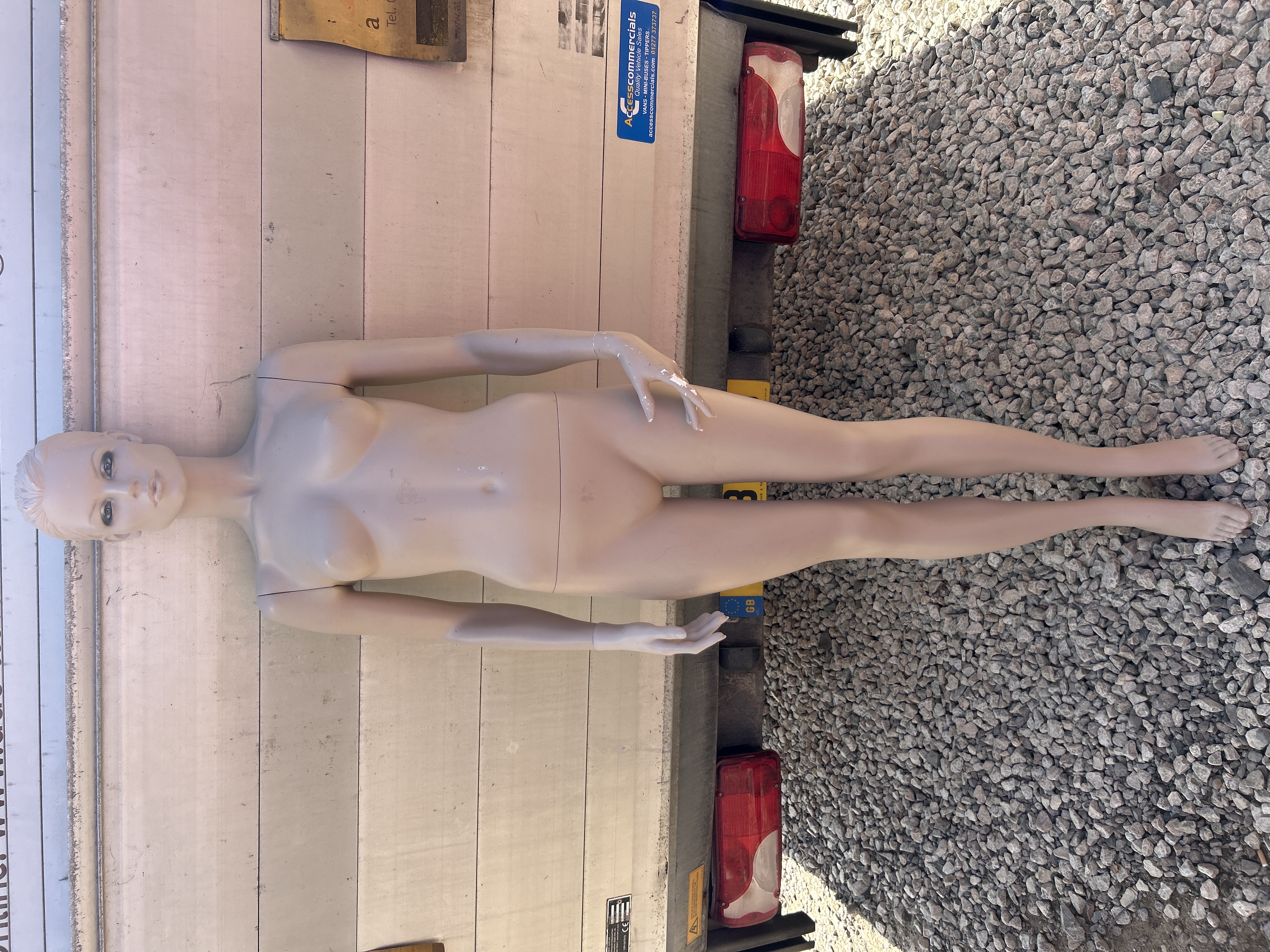 A full-body female mannequin, presented in a semi-realistic contemporary style. It features sculpted, swept-back hair and painted facial details, including prominent eye makeup and light-colored lips. Constructed from a beige-toned composite material, likely fiberglass or plastic, the mannequin exhibits visible articulation points at the shoulders and hips, and possibly elbows and wrists. No discernible text or manufacturer markings are visible directly on the item.