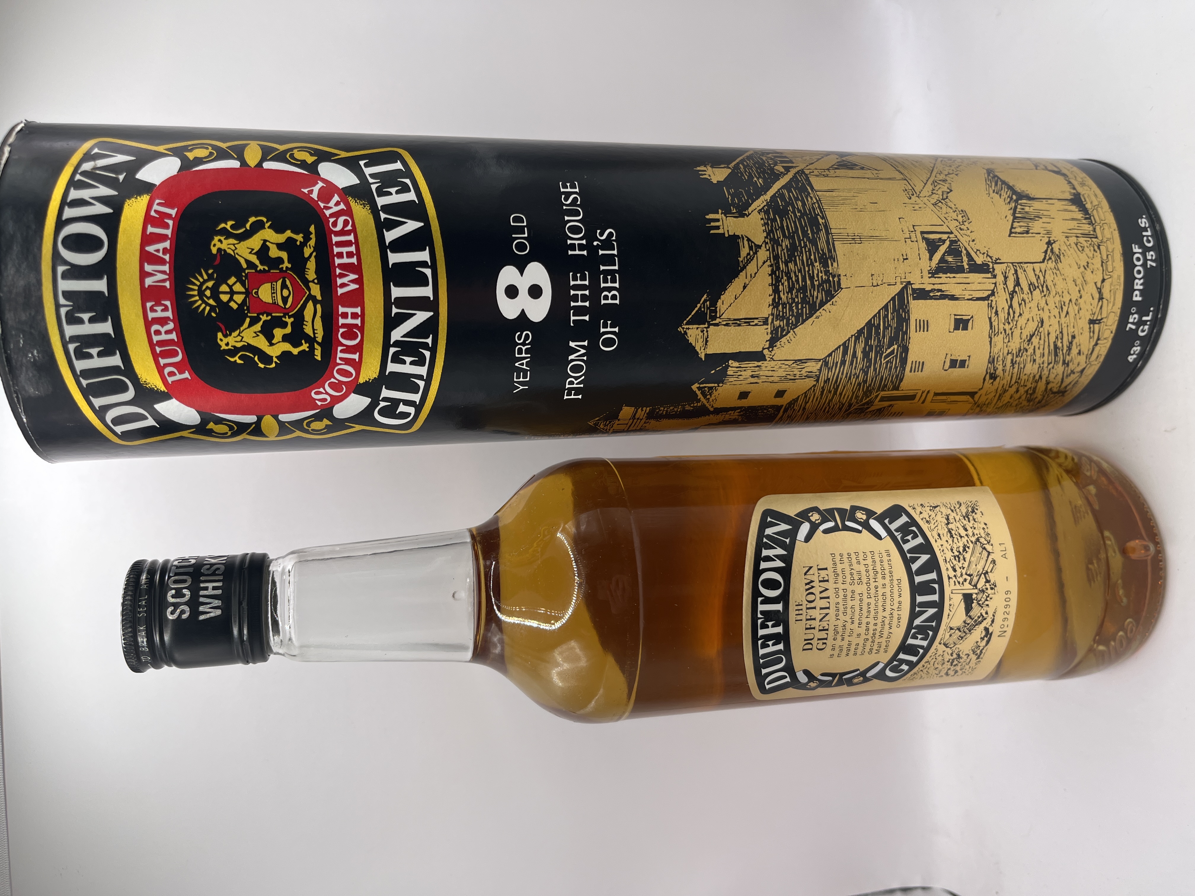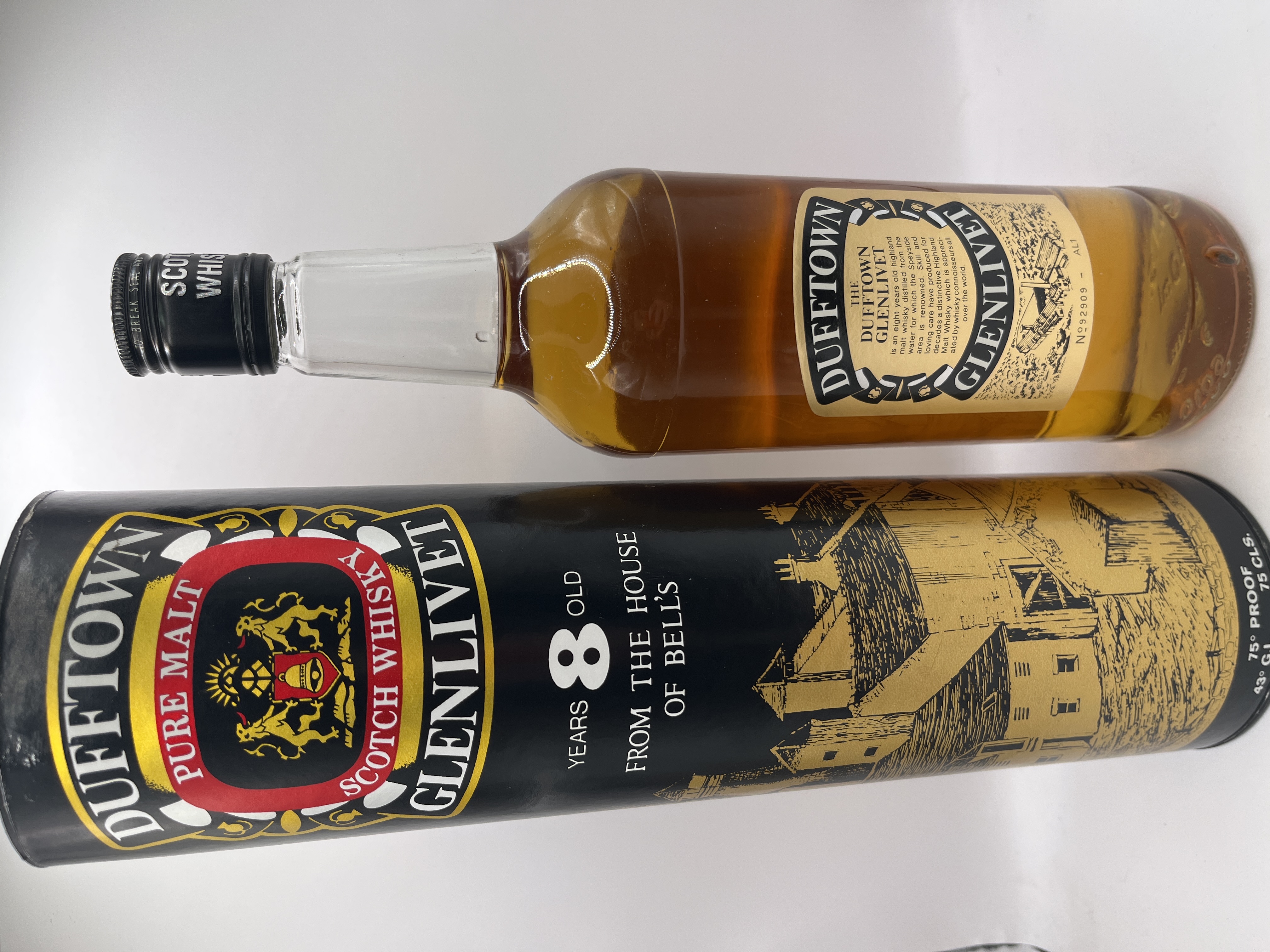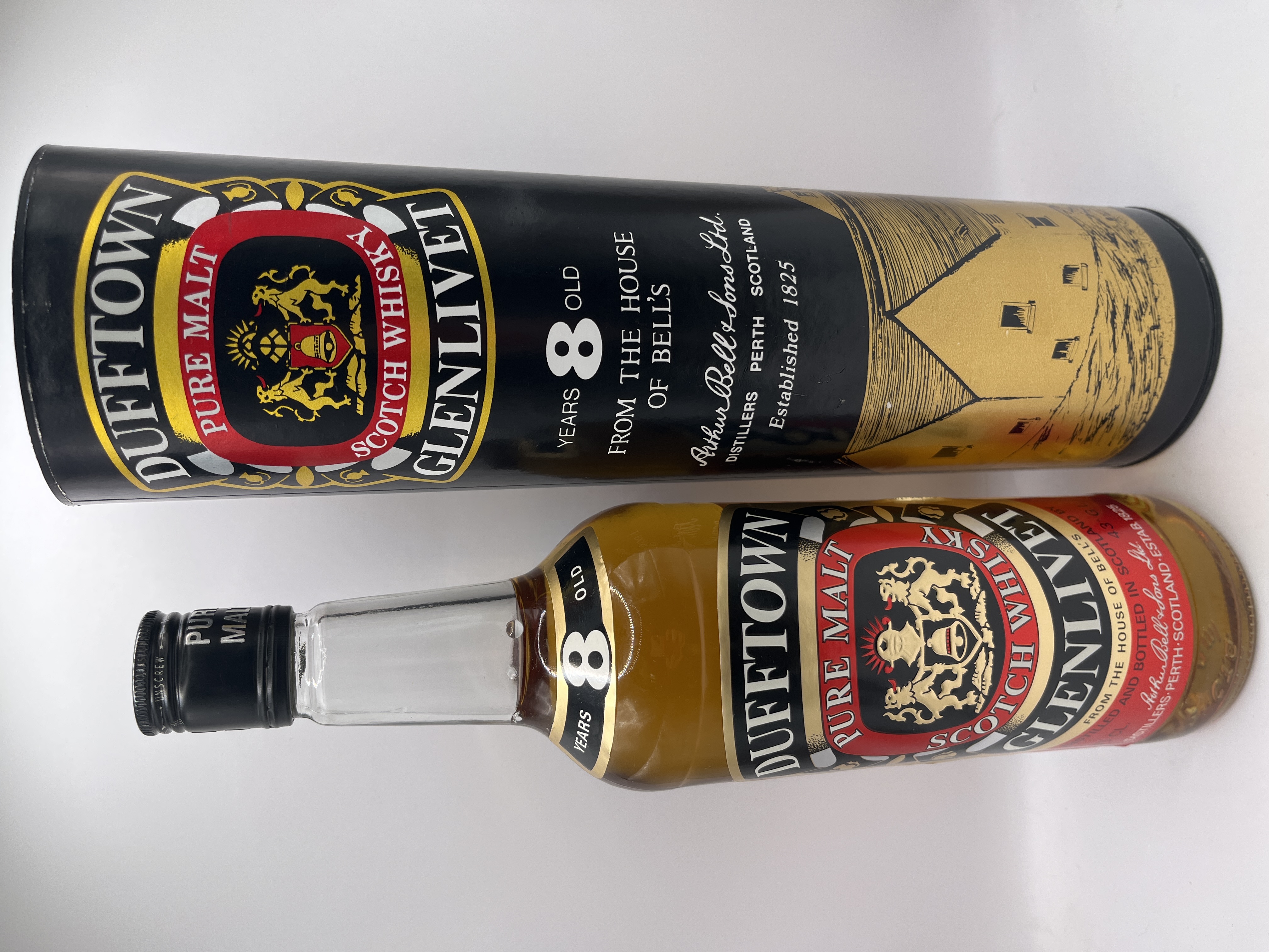 A bottle of Dufftown Glenlivet 8 Year Old Pure Malt Scotch Whisky, presented with its original cylindrical tube. The clear glass bottle contains an amber-colored liquid and features a sealed screw cap with “BREAK SEAL SCOTCH WHISKY” text. Its labels prominently display the brand, age statement, and producer “Arthur Bell & Sons Ltd. DISTILLERS PERTH SCOTLAND Established 1825,” alongside a crest with two lions, a bell, and a sunburst. The bottle indicates “43% ALC.” and “NºS2509,” with a back label offering descriptive text about the whisky’s origin in Speyside. The accompanying tube, likely made of printed metal or sturdy cardboard, replicates the bottle’s branding, crest, and includes an illustration of distillery buildings, specifying “43% 75º PROOF 75 CLS.”